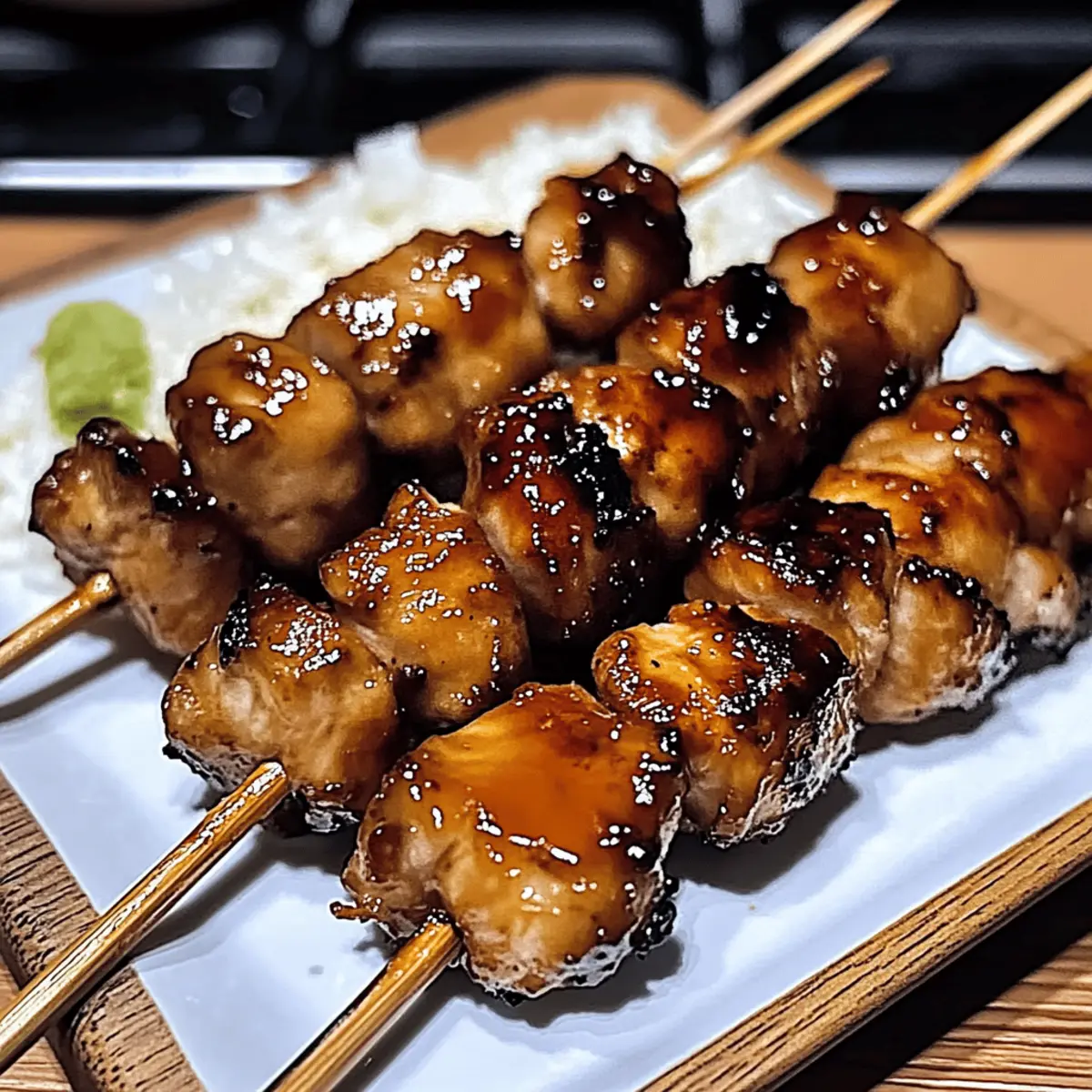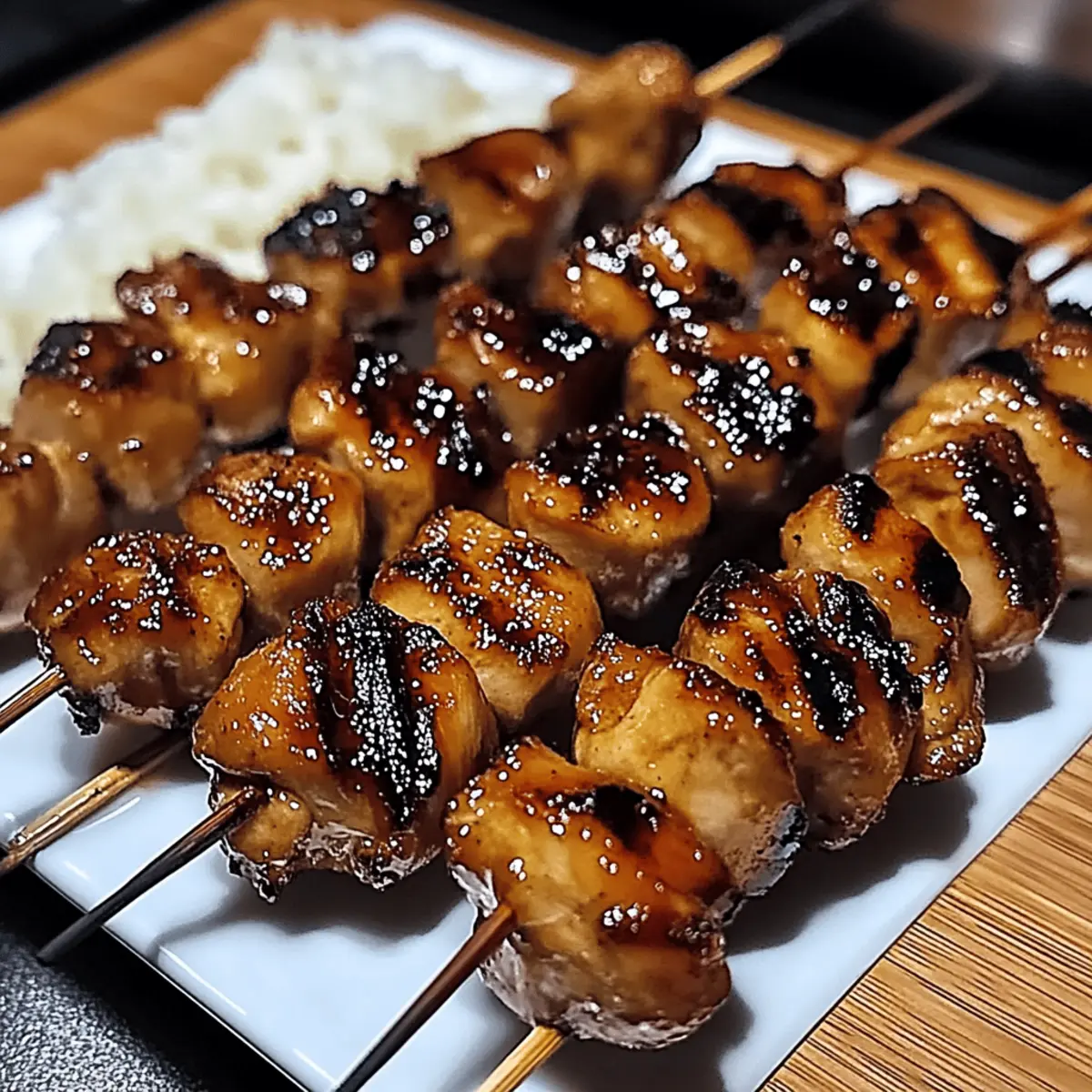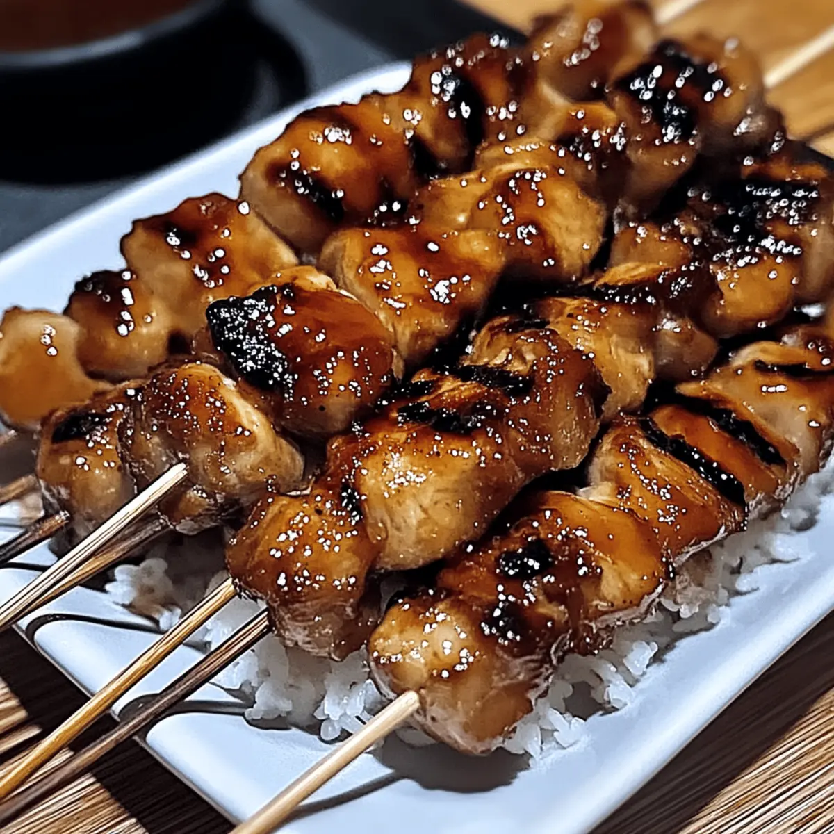 As I stood by the grill, the tantalizing aroma of smoky chicken skewers wafted through the air, reminding me of bustling izakayas in Tokyo. Japanese Chicken Yakitori is a cherished dish that brings the warmth of home cooking straight to your table, featuring tender, grilled chicken smothered in a luscious, sweet-savory sauce. This easy-to-make recipe not only shines at summer backyard barbecues but also transforms cozy family dinners into delightful culinary experiences. The best part? It’s a versatile dish that welcomes any modifications to fit your taste—whether you’re sticking with classic chicken or opting for a vegetarian twist with tofu or veggies. Ready to impress your guests and satisfy your cravings? Let’s dive into this delicious homemade journey! Why is Yakitori the Ultimate Comfort Food? Simplicity at Its Best: The straightforward grilling method allows anyone, from beginner cooks to expert chefs, to enjoy this dish with minimal fuss. Irresistible Flavor: The sweet-savory glaze, enhanced by garlic and ginger, creates a mouthwatering experience that transports you right to Japan. Versatile Options: Whether you choose chicken, tofu, or a medley of veggies, this recipe adapts to whatever you have on hand, making it a fantastic weeknight meal. Quick and Easy: With just a few steps, you can whip up this dish in under 30 minutes, making it perfect for last-minute gatherings or cozy family dinners. Crowd-Pleasing Delight: Impress your friends and family with these beautiful skewers that shine on every table, just like the Garlic Parmesan Chicken or Cream Cheese Chicken they’ll surely love! Japanese Chicken Yakitori Ingredients For the Sauce Soy Sauce – Provides saltiness and depth of flavor; substitute tamari for a gluten-free version. Water – Used to dilute the soy sauce and balance flavors; no substitutions needed. Red Wine/Mirin – Adds sweetness and complexity; substitute with sake or sherry for a similar taste. Brown Sugar – Contributes sweetness and caramelization; honey or maple syrup can work as alternatives. Vinegar – Adds acidity for balance; rice vinegar is ideal while apple cider vinegar can be a substitute. Minced Garlic – Enhances the sauce with aromatic depth; fresh garlic is preferred, but garlic powder can be used. Ginger – Adds warmth and zest; ground ginger can substitute fresh if needed. Ground Pepper – Provides a gentle heat; use white or black pepper based on preference. Cornstarch – Used to thicken the sauce; arrowroot or tapioca starch can be viable substitutes. For the Chicken Chicken – The main protein; select boneless thighs for juiciness, or firm tofu and vegetables for a vegetarian option. The heart of your Japanese Chicken Yakitori lies in these simple yet flavorful ingredients, setting the stage for a delightful grilling adventure! Step‑by‑Step Instructions for Japanese Chicken Yakitori Step 1: Soak Skewers Begin by soaking your wooden skewers in water for about 15–20 minutes. This vital step prevents them from catching fire on the grill. Make sure they’re fully submerged for even soaking. While the skewers soak, you can prepare your delicious sauce to enhance the flavor of your Japanese Chicken Yakitori. Step 2: Prepare Sauce In a medium bowl, combine ½ cup of soy sauce, ¼ cup of water, ¼ cup of red wine or mirin, 2 tablespoons of brown sugar, and 1 tablespoon of vinegar. Stir the mixture until the sugar is completely dissolved, creating a rich, sweet-savory sauce. Set aside a ¼ cup of this sauce for later, as it will add flavor during the chicken’s marination. Step 3: Marinate Chicken In a large mixing bowl, add minced garlic, grated ginger, and a pinch of ground pepper. Pour in the reserved ¼ cup of sauce and mix well to create a marinade. Cut 1 pound of boneless chicken thighs into bite-sized pieces and add them to the bowl, ensuring each piece is well-coated. Let the chicken marinate for at least 10 minutes while you heat up the grill, allowing the flavors to infuse. Step 4: Thicken Remaining Sauce Transfer any leftover sauce into a small saucepan and heat over medium-high heat. Bring it to a gentle boil, then mix 1 tablespoon of cornstarch with 2 tablespoons of water to create a slurry. Gradually add the slurry into the boiling sauce, stirring constantly until it thickens, which should take about 2–3 minutes. Once thickened, remove the sauce from heat and set aside to cool slightly. Step 5: Grill Chicken Carefully thread the marinated chicken pieces onto your soaked skewers, leaving a little space between them for even cooking. Preheat the grill to medium-high (around 400°F / 204°C). Place the skewers on the grill and cook for about 8–12 minutes, turning occasionally. Baste the chicken with the thickened sauce as it cooks to create a beautifully caramelized exterior, ensuring the chicken is fully cooked through (165°F / 74°C). Expert Tips for Japanese Chicken Yakitori Soak Skewers: Immerse wooden skewers for at least 20 minutes to prevent burning. This simple step ensures beautifully grilled chicken without charred sticks. Marination Matters: Extend the marination time if possible; flavors deepen with longer soaking. Aim for 30 minutes to 1 hour for a more pronounced taste in your Japanese Chicken Yakitori. Grill Temperature: Use medium-high heat to achieve juicy chicken while preventing overcooking. Keep a close eye on your skewers to catch that perfect golden-brown caramelization. Basting Technique: Baste the chicken with thickened sauce during grilling, but avoid cross-contamination. Set aside some sauce for basting to keep it safe from raw chicken. Vegetarian Substitutions: To adapt the recipe, try using firm tofu or hearty vegetables like mushrooms. Just cook them until tender and slightly charred for a delightful twist! What to Serve with Japanese Chicken Yakitori Elevate your meal with delicious accompaniments that complement the rich flavors of grilled chicken skewers. Steamed Jasmine Ri