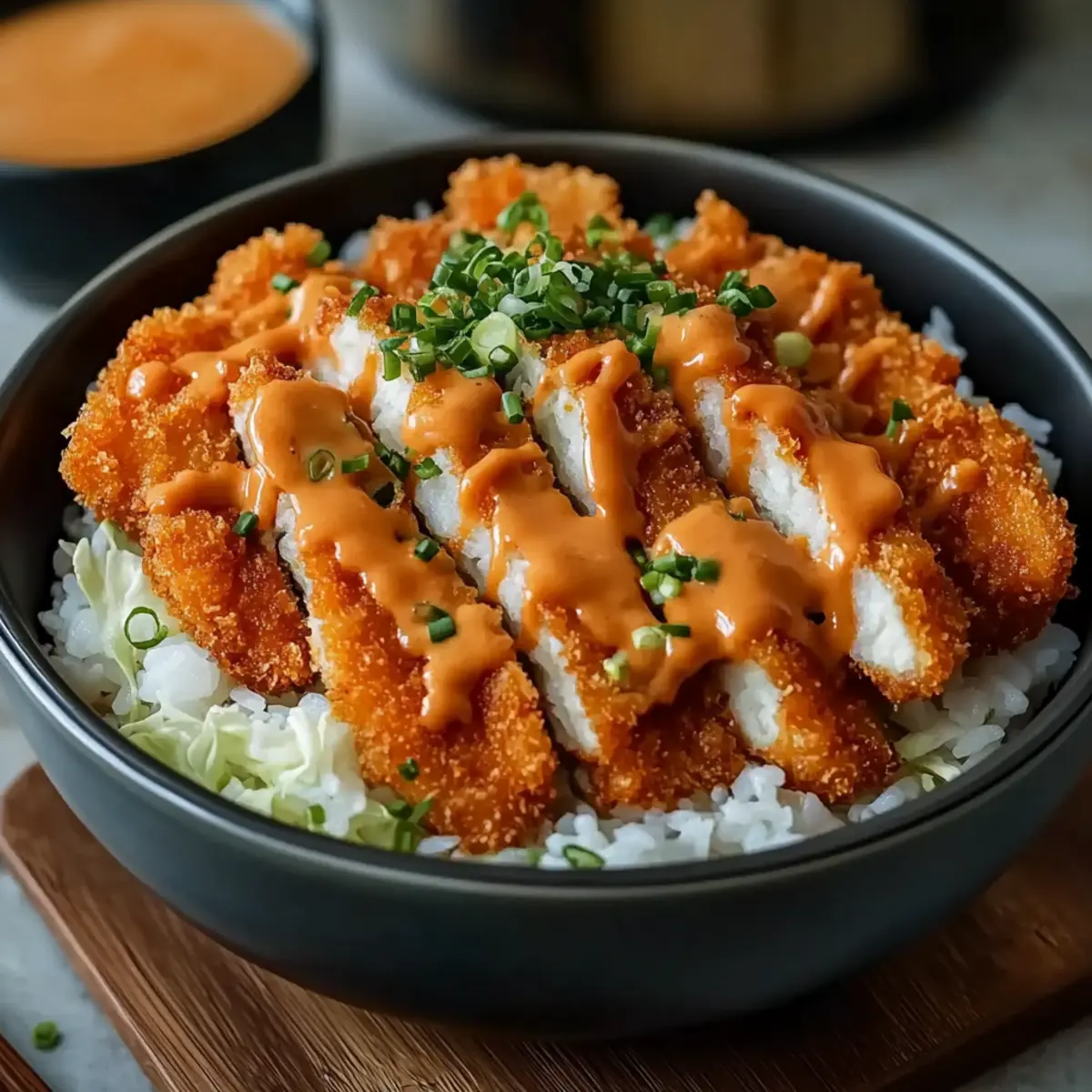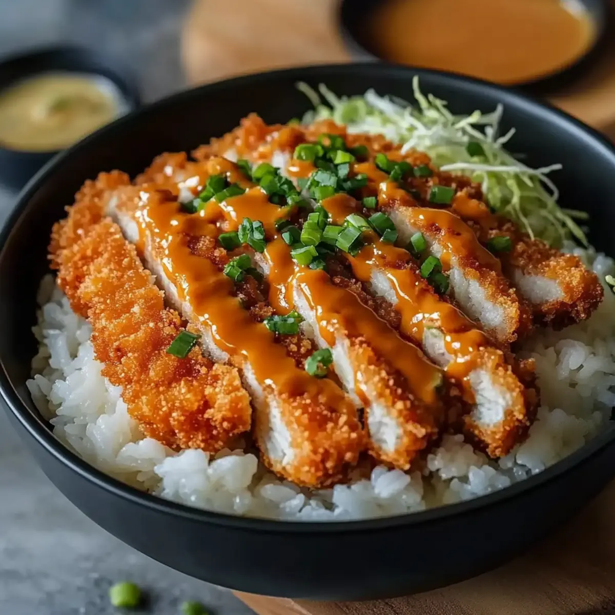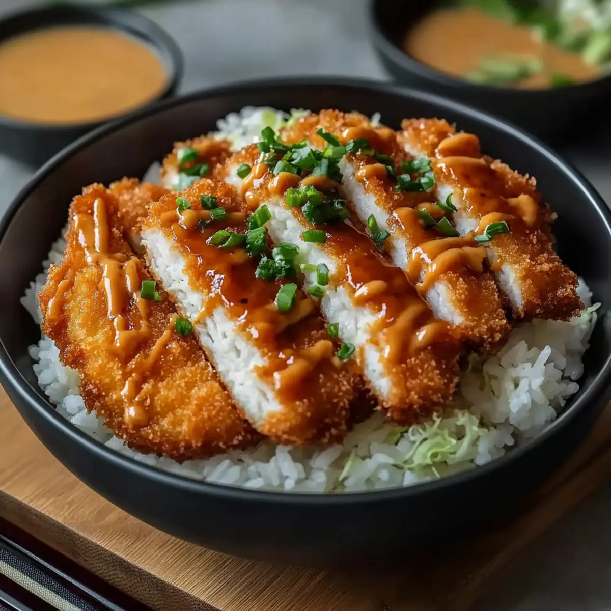 5. Assemble bowls with rice, sliced cutlets, and drizzle with tonkatsu and mayo sauces. Garnish with optional toppings.
