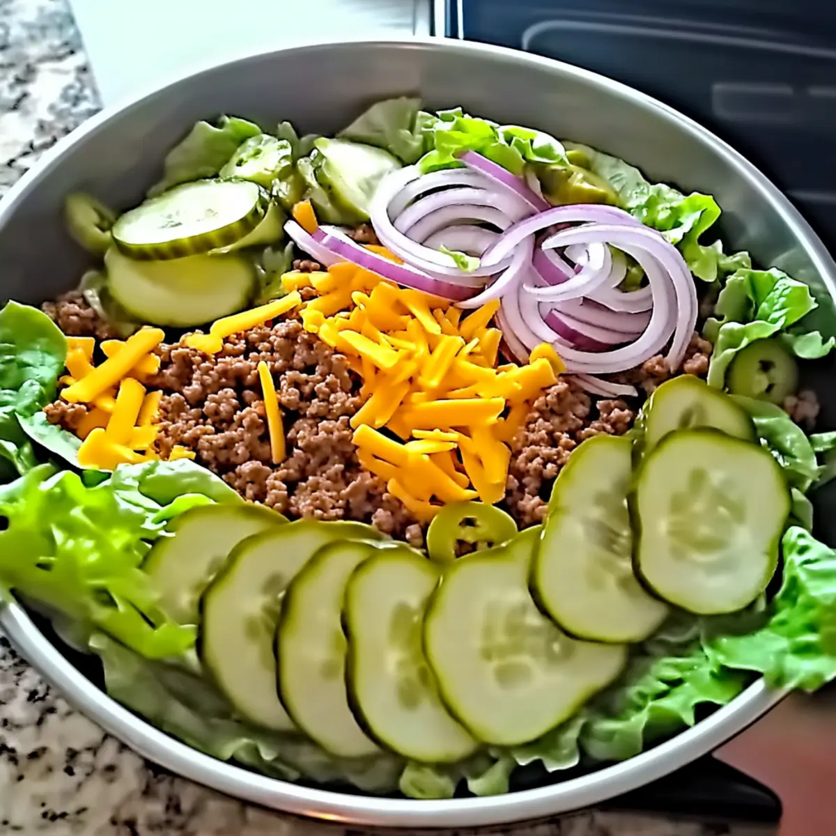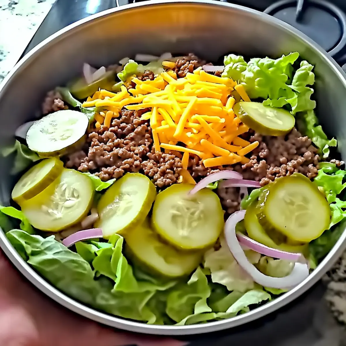 With every crunch of fresh lettuce and burst of flavor from tangy pickles, I found myself reminiscing about my favorite fast-food burger transformed into a wholesome dish. Enter the Keto Big Mac Salad—a vibrant and satisfying alternative that combines iconic Big Mac elements in a healthy, low-carb package. This recipe not only brings back those nostalgic flavors but also packs a protein punch, making it a fantastic choice for anyone looking to enjoy a guilt-free meal at home. What’s even better? It’s effortlessly customizable, allowing you to swap ingredients based on your preferences or what’s in your fridge. Ready to dive into a delicious bowl of nostalgia? Let’s turn that burger craving into a fresh salad experience! Why is This Keto Big Mac Salad a Winner? Nostalgic Flavors: This salad brilliantly captures the beloved taste of a Big Mac, making it a treat for your taste buds without the guilt. Endless Customization: Whether you want to swap ground beef for grilled chicken or add jalapeños for a spicy kick, the options are limitless. Guilt-Free Indulgence: With only 8g of carbs per serving, you can enjoy a hearty meal while staying true to your keto lifestyle. Quick to Prepare: In just a few simple steps, you can assemble this delicious salad, making it a perfect choice for busy nights or last-minute lunches. Crowd-Pleasing: Serve it at gatherings, and impress your friends with this fresh take on a classic burger that everyone will love! For more delightful meal ideas, don’t miss our Spring Confetti Salad or Quinoa Chickpea Salad. Keto Big Mac Salad Ingredients For the Salad Base Ground Beef – Provides richness and protein; substitute with ground turkey for a leaner option. Green Lettuce – Forms the crisp base; romaine or spinach can add variety. Onion – Adds sweetness and crunch; diced red onions offer a milder flavor. For the Dressing Mayonnaise – Acts as the creamy base for the dressing; Greek yogurt can lighten it up. Dill Relish – Complements the dressing with sweetness; chopped sweet pickles can work as a substitute. White Vinegar – Adds acidity and brightness; apple cider vinegar is an excellent alternative. Yellow Mustard – Offers tanginess in the dressing; Dijon mustard can elevate the flavor profile. Paprika – Enhances depth in the dressing; use smoked paprika for a bolder taste. Garlic Powder – Boosts the overall flavor; fresh minced garlic can be a delightful alternative. Onion Powder – Provides a moderate onion taste; fresh onion gives a stronger impact. Add-Ons for Flavor & Texture Pickles – Introduces tanginess reminiscent of the classic Big Mac; capers can also be an exciting twist. Cheddar Cheese – Enriches the salad with a creamy texture; switch to mozzarella or a dairy-free cheese if desired. This Keto Big Mac Salad keeps you satisfied and indulged, blending all the nostalgic flavors of the beloved burger into a healthy, low-carb meal you’ll crave again and again! Step‑by‑Step Instructions for Keto Big Mac Salad Step 1: Prepare Dressing In a medium mixing bowl, whisk together mayonnaise, paprika, garlic powder, onion powder, white vinegar, yellow mustard, and dill relish until you achieve a smooth, creamy consistency. This delicious dressing is the heart of your Keto Big Mac Salad, so make sure to blend it well. Set this aside while you focus on the salad components. Step 2: Cook Beef Heat a large skillet over medium heat and add the grounded beef. Cook for 5-7 minutes, breaking it apart with a spatula, until browned and fully cooked through. The meat should lose its pink color and start to sizzle, releasing a savory aroma. Once cooked, drain any excess grease to maintain a light salad texture. Step 3: Assemble Salad In a large serving bowl, create a vibrant salad base by layering the chopped green lettuce first, followed by the cooked beef. Then sprinkle on sliced pickles, diced onion, and shredded cheddar cheese. This hearty assembly of fresh ingredients mirrors the flavors of a Big Mac, making your Keto Big Mac Salad both visually appealing and mouthwateringly inviting. Step 4: Dress Salad Drizzle your prepared dressing generously over the salad mixture. Use a large spoon or salad tongs to gently toss everything together, ensuring each ingredient is coated with the creamy dressing. The combination of the salad ingredients and dressing will elevate those Big Mac flavors, making each bite a burst of nostalgia. Step 5: Serve Let the assembled Keto Big Mac Salad sit for about 5 minutes to allow the flavors to meld together. This brief rest enhances the taste, allowing the dressing to soak into the ingredients. For an extra touch, garnish with additional pickles or avocado slices before serving, and watch everyone enjoy this delectable dish! What to Serve with Keto Big Mac Salad Elevate your dining experience with these delightful pairings that will complement the fresh flavors and satisfying crunch of your salad. Garlic Breadsticks: Their warm, toasted crunch provides a delicious contrast to the salad, perfect for sopping up any extra dressing. Zucchini Fries: Crispy and low-carb, these fries add a delightful crunch and can be seasoned to match your salad’s flavors. Coleslaw: A tangy side of coleslaw brings refreshing crunch and brightness to your meal, making it a great palate cleanser. Sparkling Water with Lemon: Refreshing and fizzy, this drink enhances your meal without adding unnecessary carbs, keeping it light and enjoyable. Sliced Avocado: Creamy and rich, avocado adds a luxurious element that pairs well with the salad’s textures while providing healthy fats. Roasted Vegetables: A medley of roasted veggies like bell peppers and broccoli adds a warm touch, complementing the freshness of the salad beautifully. Cheddar Stuffed Jalapeños: For a spicy kick, these cheesy bites bring exciting heat that enhances the flavors of your Keto Big Mac Salad. Fruit Salad: A colorful fruit salad offers a sweet and juicy contrast,