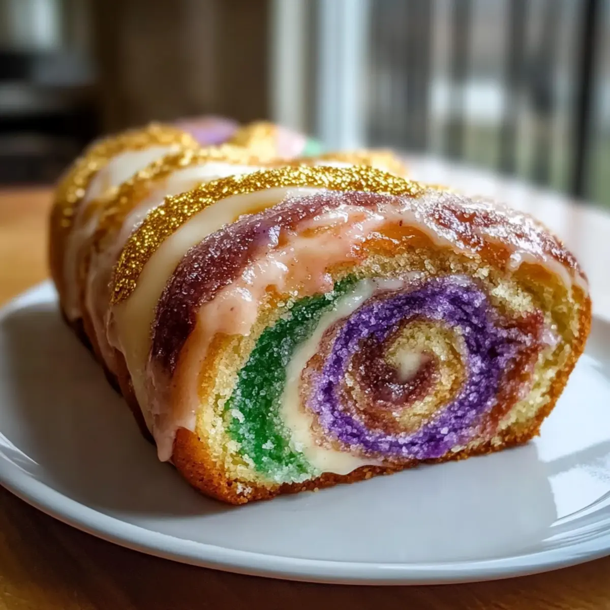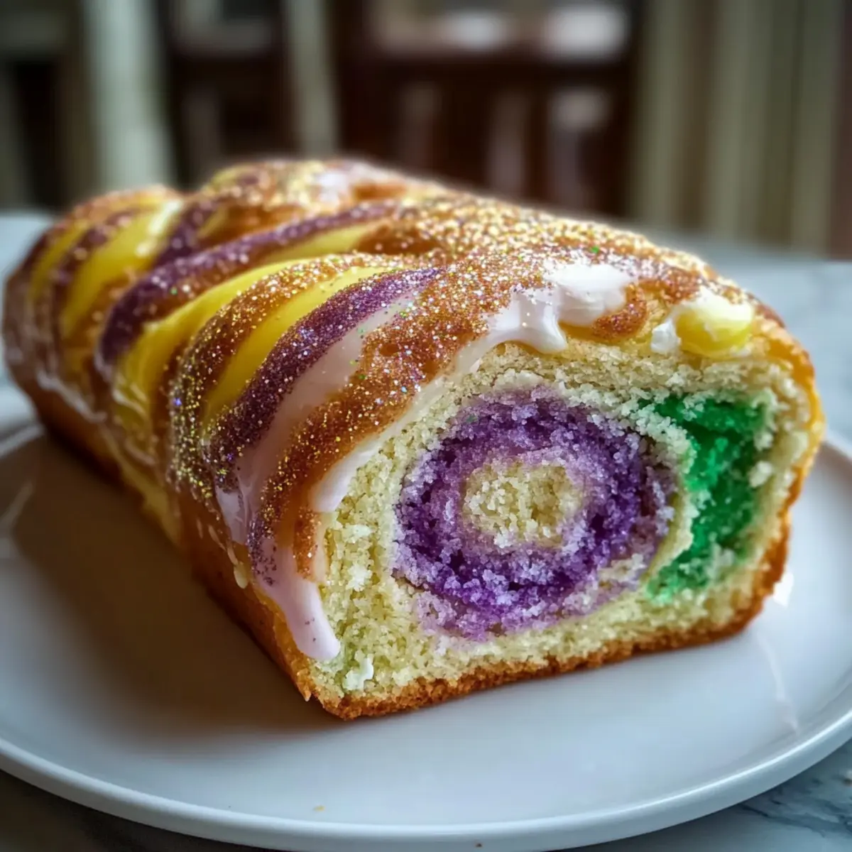 Festive Delight: This King Cake is a stunning centerpiece, perfect for Carnival celebrations or any gathering. Its vibrant colors and delightful flavors create an inviting atmosphere.