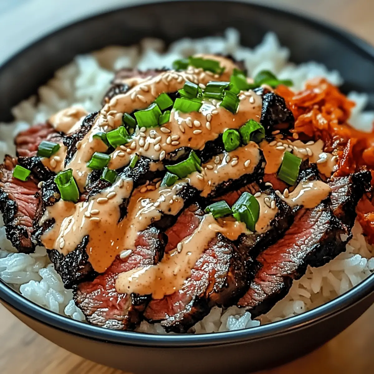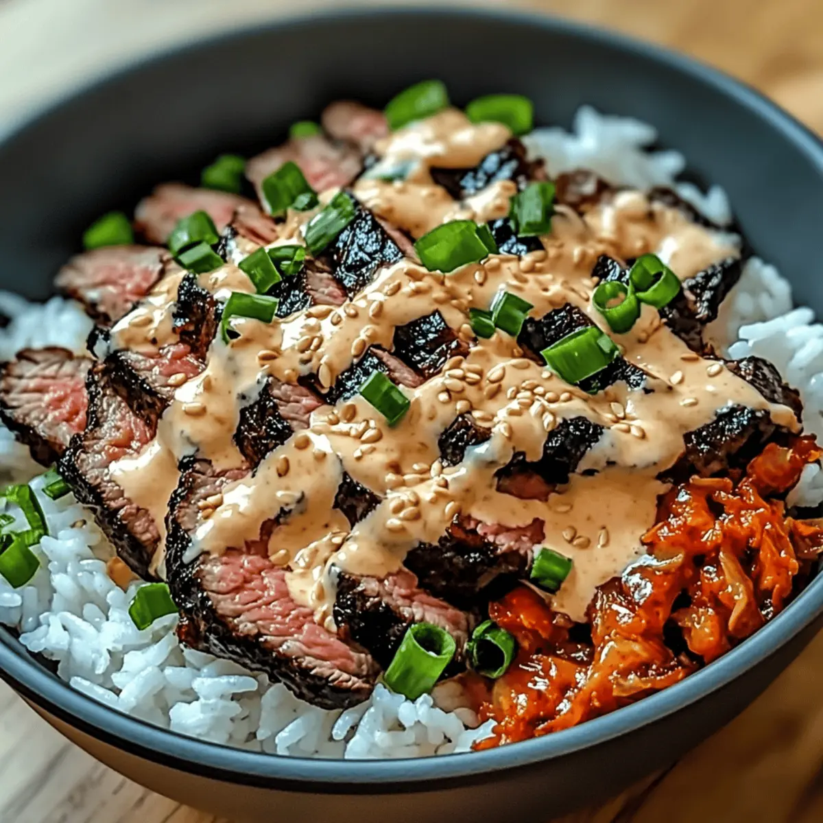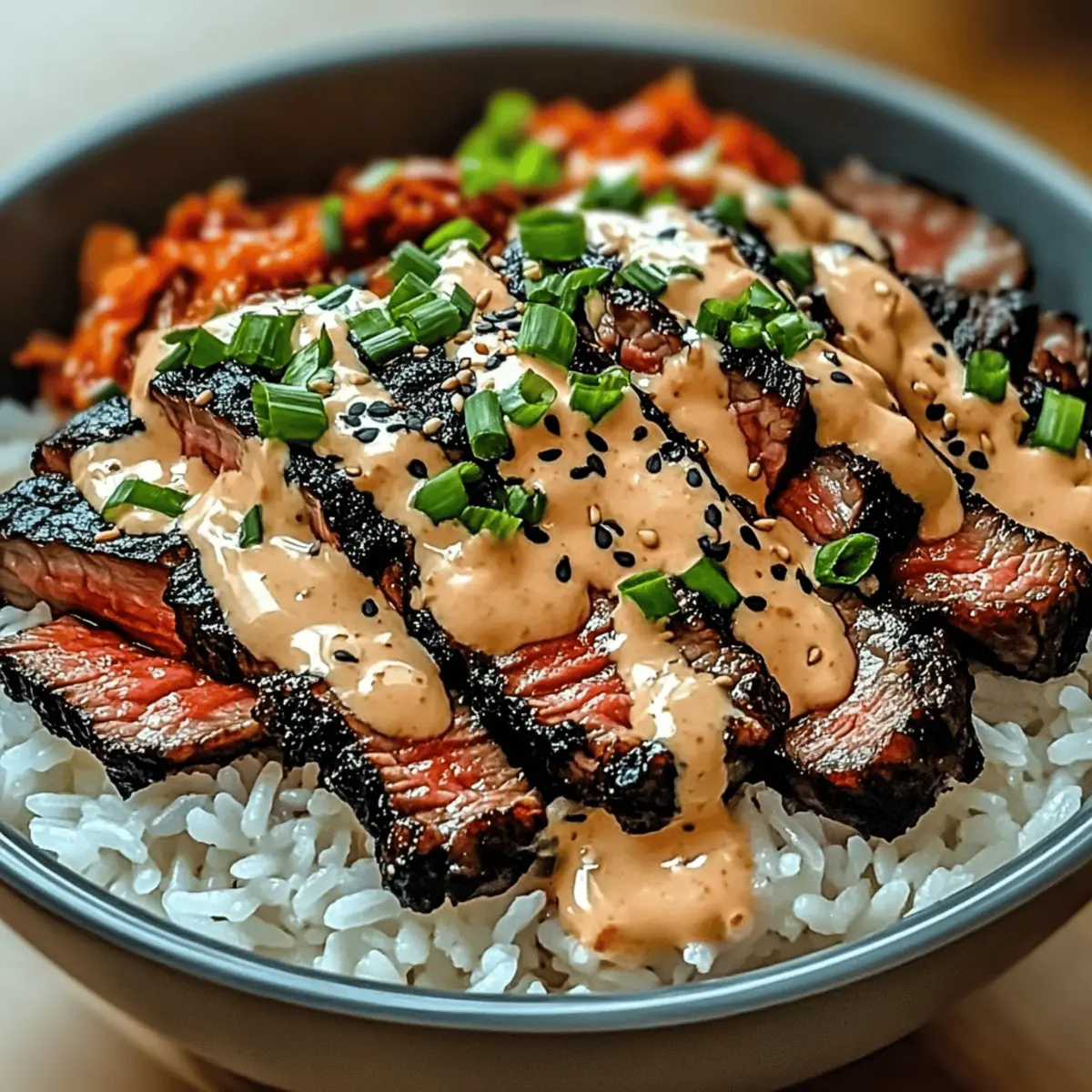 5. Assemble the Bowls: Divide the fluffy jasmine rice among serving bowls. Top with sliced steak and drizzle with the spicy cream sauce. Garnish with chopped green onions, sprinkle sesame seeds, and add toppings like kimchi or pickled vegetables.