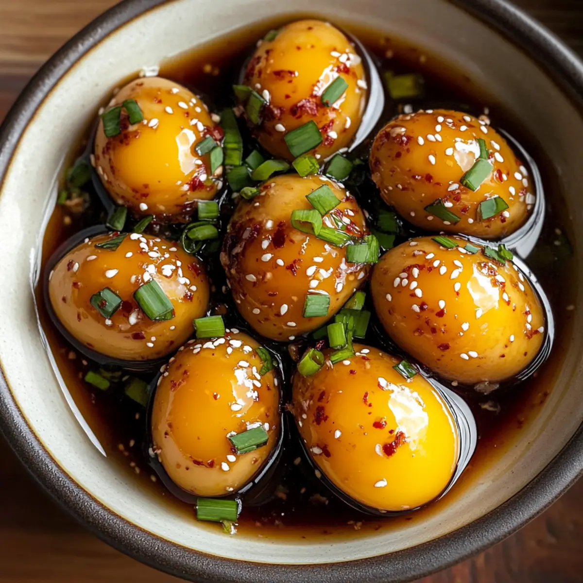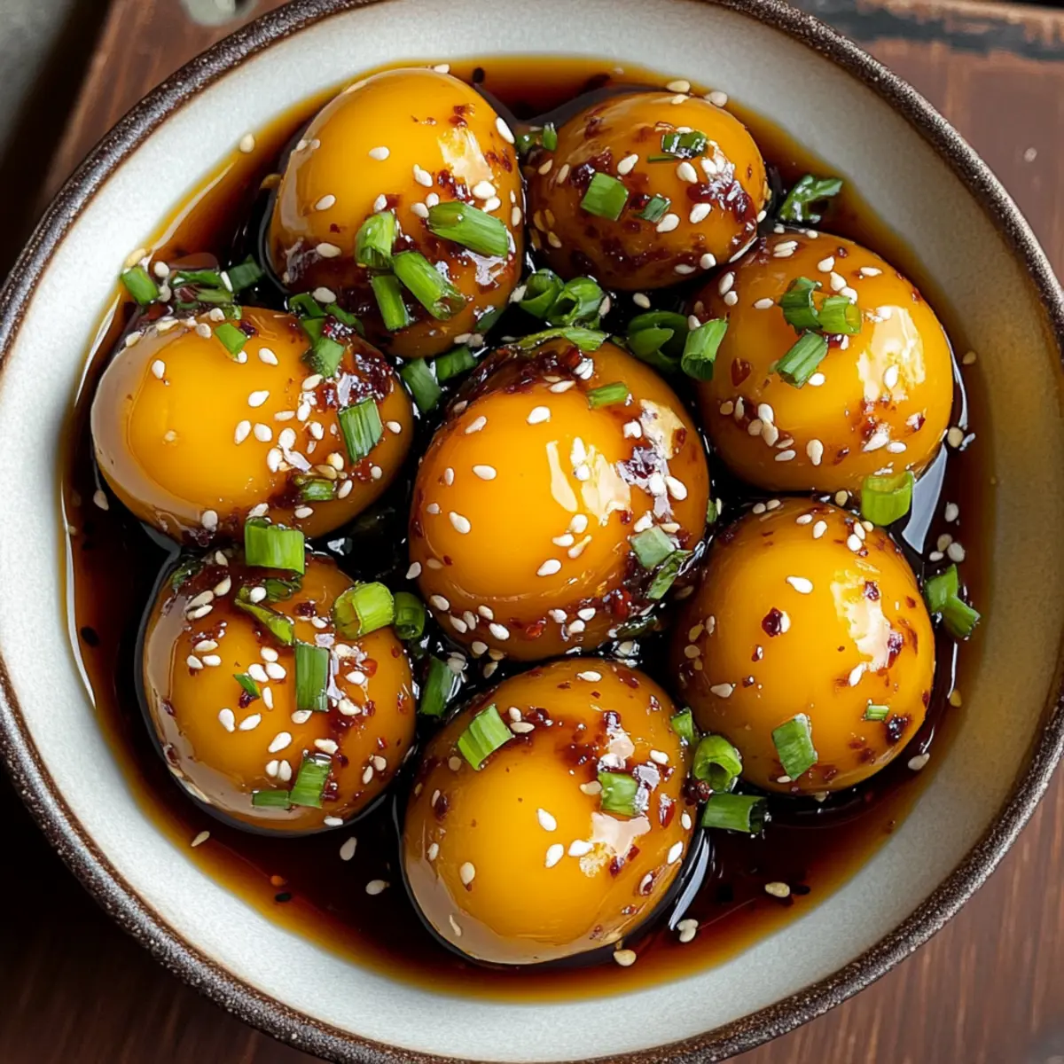 In a busy world overflowing with fast food options, I found an unexpected treasure in my kitchen: Korean Marinated Eggs, or “Mayak Gyeran.” These delightful little gems are not only quick to whip up but are also a budget-friendly way to elevate any meal. Soft-boiled eggs steeped in a savory soy marinade offer a harmonious fusion of flavors that transform simple ingredients into something irresistible. Whether you’re tossing them in a bowl of rice, adding them to a steaming bowl of ramen, or enjoying them as a nutritious snack, these marinated eggs promise to add a touch of excitement to your culinary repertoire. Ready to transform your meals effortlessly? Let’s dive in! Why are Korean Marinated Eggs irresistible? Addictive Flavor: Each bite of these marinated eggs bursts with a harmony of umami, sweetness, and a hint of spice, ensuring they become the star of any dish. Quick and Easy: With just a few simple ingredients and minimal prep time, you can whip up this delightful treat in no time, making it perfect for busy weeknights. Versatile Delight: Serve them over rice, mix them into ramen, or enjoy them as a stand-alone snack; the possibilities are endless! Meal Prep Champion: Their flavor improves with time, making them ideal for making ahead at the start of your week – a truly budget-friendly choice. Gluten-Free Adaptability: With simple substitutions like tamari, these eggs cater to various dietary needs, keeping everyone at the table happy. Crowd Pleaser: Whether entertaining guests or looking for a quick bite, these Korean Marinated Eggs are sure to impress, just like my beloved Korean Scallion Pancake does! Korean Marinated Eggs Ingredients • Discover the essentials for this delightful dish! For the Eggs Medium Eggs – Use fresh eggs for the best texture and flavor. For the Marinade Soy Sauce – Adds saltiness and umami flavor; substitute with tamari or coconut aminos for a gluten-free option. Garlic (minced) – Enhances flavor complexity; fresh garlic is ideal, but garlic powder can work in a pinch. Brown Sugar – Balances the saltiness; honey or maple syrup can be used for a different flavor twist. Chili Peppers (sliced) – Adds heat and spice; use red pepper flakes or sriracha for convenience. Sesame Oil – Provides a rich nutty flavor; quality sesame oil yields the best results. Green Onions (sliced) – Adds freshness and mild onion flavor; shallots or chives can be used as substitutes. Step‑by‑Step Instructions for Korean Marinated Eggs Step 1: Boil the Eggs In a medium saucepan, fill with water and bring it to a rolling boil over high heat. Once boiling, gently lower in the medium eggs using a slotted spoon. Allow them to simmer for 6 minutes for perfectly jammy yolks. Keep an eye on the clock to ensure the eggs achieve the desired doneness, then prepare for the next step. Step 2: Prepare Ice Bath While the eggs are simmering, fill a large bowl with ice and cold water—a crisp ice bath will stop the cooking process. Once the timer goes off, use a slotted spoon to transfer the hot eggs into the ice bath carefully. Allow them to sit for about 5 minutes until they are cool to the touch, which makes peeling much easier. Step 3: Peel the Eggs After chilling, gently tap the cooled eggs against a hard surface to crack the shells. Under running water, begin peeling each egg carefully; this helps avoid breakage and ensures a smooth surface. Aim to remove any tiny bits of shell that remain, revealing the beautiful soft-boiled texture of your authentic Korean Marinated Eggs. Step 4: Make the Marinade In a mixing bowl, whisk together the soy sauce, minced garlic, brown sugar, sliced chili peppers, and sesame oil. Continue whisking until the brown sugar has completely dissolved into the mixture, creating a glossy marinade. The combination will have a fragrant aroma, enticing you with the delightful flavors that are about to infuse your eggs. Step 5: Marinate the Eggs In an airtight container, arrange the peeled eggs in a single layer, ensuring they fit comfortably. Pour the marinade over the eggs, making sure each one is fully submerged for ideal flavor absorption. Cover the container tightly to keep the marinade intact, which is essential for achieving the delicious taste characteristic of Korean Marinated Eggs. Step 6: Chill Refrigerate the container of marinated eggs for at least 6 hours, though overnight is recommended for maximum flavor infusion. As they chill, the eggs will soak up the savory marinade, transforming into a delectable snack or an accompaniment to your meals. After this resting phase, you’ll be ready to enjoy your homemade Korean Marinated Eggs! Korean Marinated Eggs Variations & Substitutions Customize your Korean Marinated Eggs to suit your taste buds and dietary needs with these simple twists. Gluten-Free: Swap soy sauce for tamari or coconut aminos to enjoy the flavor without gluten. Sweet Twist: Use honey or maple syrup instead of brown sugar for a different hint of sweetness. Extra Spice: Add gochujang or more sliced chili peppers to the marinade for an exciting heat boost. The delightful spiciness will elevate the umami experience! Vegetarian Delight: Substitute eggs with tofu cubes to create a plant-based version; marinate just like the eggs for a delicious alternative. Flavor Infusion: Experiment with flavored oils, like garlic-infused olive oil instead of sesame oil, for a unique twist. Citrus Kick: Add a splash of lime juice to the marinade for a refreshing zest that brightens the rich flavors. Cross-Recipe Use: Serve these eggs as a topping for your favorite dish, like a delicious Korean Scallion Pancake, for an unforgettable meal addition. Herbal Notes: Incorporate fresh herbs, such as cilantro or basil, to bring a vibrant freshness that enhances every bite. Feel free to mix and match these ideas to create your perfect version of Korean Marinated Eggs! Storage Tips for Korean Marinated Eggs Fridge: Store Korean Marinated Eggs in a
