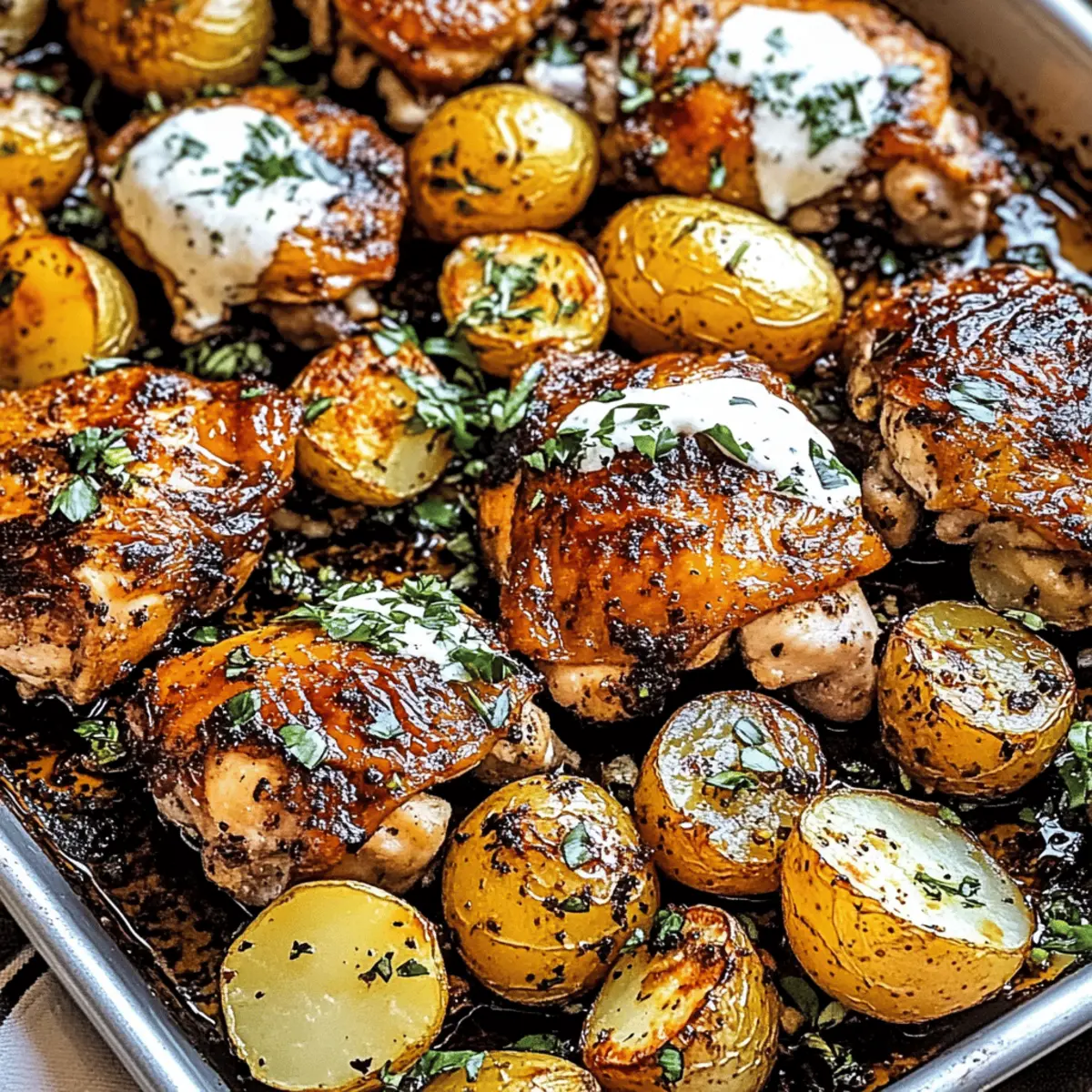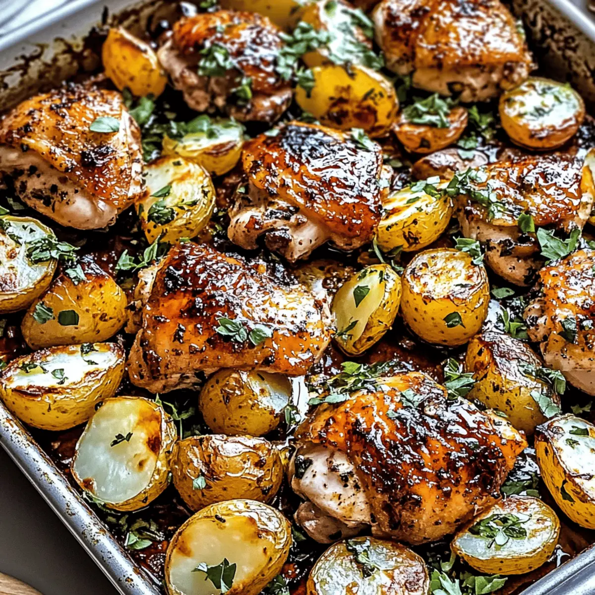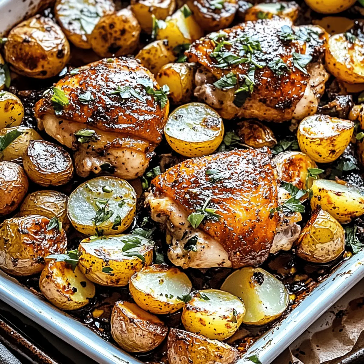 Finally, carefully remove the baking sheet from the oven. Arrange the succulent Lemon Balsamic Chicken & Potatoes on plates or serve directly from the sheet pan for a rustic feel. Drizzle any remaining marinade over the top for an extra punch of flavor. This dish is perfect for family gatherings or a cozy dinner, inviting everyone to share in the deliciousness.