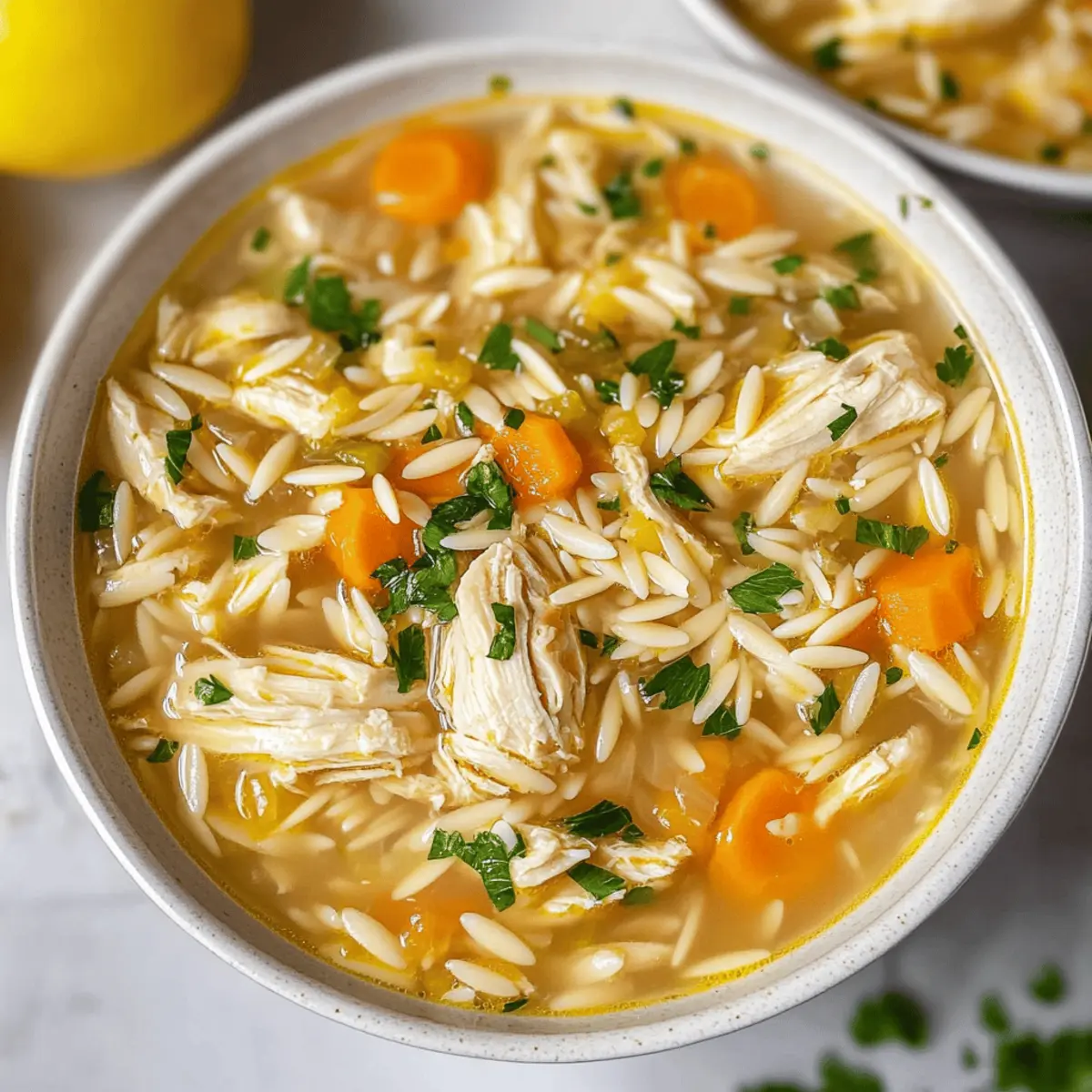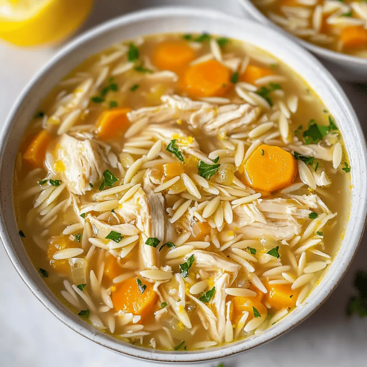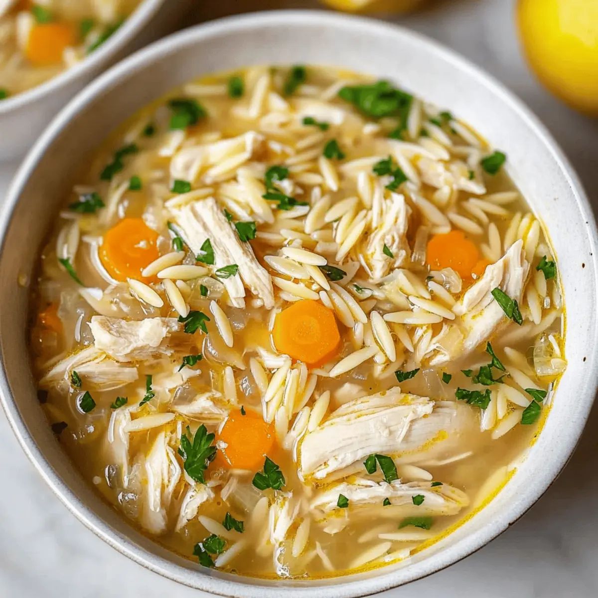 As the aroma of lemon wafts through my kitchen, it transports me to a sun-soaked Greek island, even if it’s just a Thursday evening at home. This Healthy Greek Lemon Chicken Soup is not just a dish; it’s a warm embrace on a chilly day—nourishing and comforting. With succulent chicken and vibrant, zesty lemon, it’s perfect for cozy family dinners or when you need a pick-me-up health boost. What’s more, this recipe is incredibly adaptable, offering gluten-free options with rice or quinoa, and even a vegetarian twist using beans. Whether you’re making it in an Instant Pot or on the stovetop, this Lemon Chicken Soup is quick to whip up and crowd-pleasing—all while being healthy. Ready to fill your bowl and awaken your taste buds with this simple yet satisfying recipe? Let’s dive right in! What Makes This Soup a Must-Try? Simplicity at its Core: With just a handful of ingredients, this Greek Lemon Chicken Soup can be whipped up in no time, making it perfect for busy weeknights. Versatile Options: Whether you prefer chicken, beans for a vegetarian approach, or gluten-free choices with rice or quinoa, this recipe has you covered! Comforting Flavor: The balance of zesty lemon and savory broth creates a wonderfully comforting experience that warms your soul, just like a cozy hug. Healthy & Nourishing: Packed with protein and veggies, it’s a wholesome meal that doesn’t compromise on flavor. Plus, check out our Cream Cheese Chicken for another healthy twist! Quick Cooking Method: Easily adaptable for the Instant Pot or stovetop, you can enjoy this delicious soup in less than 30 minutes. Crowd-Pleasing Delight: Serve it up at family dinners or gatherings, and watch as everyone lingers for seconds—just like with our Garlic Parmesan Chicken! Lemon Chicken Soup Ingredients For the Base • Olive Oil – Adds richness and helps sauté vegetables; you can substitute with avocado oil or melted butter. • Diced Carrots – Provides sweetness and texture; feel free to use fresh or frozen. • Finely Chopped Onion – Enhances flavor and aroma, making it an essential aromatic base. • Finely Chopped Celery – Adds crunch and depth, making each spoonful exciting. • Minced Garlic – Offers a sharp, savory kick; fresh garlic provides the best flavor. For Seasoning • Black Pepper – Adds warmth and depth; adjust to your taste preference. • Dried Parsley – Introduces herby freshness; can substitute with fresh herbs (double the amount). • Dried Thyme – Contributes earthy notes; consider rosemary or basil as good alternatives. • Salt – Essential for enhancing flavor; adjust according to your broth’s saltiness. • Bay Leaves – Infuses a subtle flavor during cooking; remember to remove before serving. For the Main Ingredients • Boneless, Skinless Chicken Breasts – The main protein source for the soup; feel free to use thighs for richer flavor or even rotisserie chicken for prep convenience. • Low Sodium Chicken Broth – Your soup foundation; can be replaced with vegetable stock or homemade broth for a more profound flavor. For the Add-ins • Dry Orzo Pasta – Adds body and texture; any short pasta or gluten-free pasta is suitable. • Fresh Squeezed Lemon Juice – Essential for creating that signature zesty lemon flavor in the soup; adjust to taste! This Lemon Chicken Soup is not only delightful to make but is also a comforting dish that will brighten any dreary day! Step‑by‑Step Instructions for Lemon Chicken Soup Step 1: Sauté Vegetables In a large pot, heat 2 tablespoons of olive oil over medium-high heat. Once the oil shimmers, add diced carrots, finely chopped onion, and finely chopped celery. Sauté the vegetables for about 5 minutes, stirring occasionally, until they soften and the onion becomes translucent. Add minced garlic during the last minute to infuse its flavor. Step 2: Add Ingredients Next, stir in black pepper, dried parsley, dried thyme, and salt. Add the bay leaves and the boneless, skinless chicken breasts to the pot, followed by 6 cups of low sodium chicken broth. Mix everything well to combine, ensuring the chicken is submerged, then bring the mixture to a boil. Step 3: Bring to Boil Once boiling, cover the pot with a lid and reduce the heat to low. Allow it to simmer for about 10 minutes, letting the flavors meld together while keeping the mixture bubbling gently. You’ll see steam escaping from the lid, indicating the soup is approaching optimal flavor. Step 4: Cook Chicken Remove the lid and let the soup simmer on low heat for an additional 15 minutes. During this time, the chicken will cook through, absorbing the aromatic broth. You can poke the chicken with a fork to check if it’s firm and no longer pink inside before removing it from the pot. Step 5: Prepare Pasta After cooking the chicken, remove it from the pot and let it cool briefly on a cutting board. Shred the chicken into bite-sized pieces using two forks. Meanwhile, add 1 cup of dry orzo pasta to the pot with the soup. Cook for about 5 minutes, stirring occasionally, until the orzo is al dente. Step 6: Add Lemon Once the orzo is partially cooked, stir in the freshly squeezed lemon juice, adjusting to your taste preference. Return the shredded chicken to the pot, mixing everything well to combine. Allow the soup to heat through for another minute or two, ensuring everything is warm and ready to serve. Make Ahead Options This Greek Lemon Chicken Soup is a fantastic choice for meal prep enthusiasts! You can chop the vegetables (carrots, onion, celery, and garlic) and store them in an airtight container in the refrigerator for up to 3 days. Additionally, the chicken can be shredded and pre-cooked; simply store it separately to maintain its texture. If you’re using dry orzo, it can be measured out and set aside as well. When ready to serve, just combine the prepped ingredients in a pot with broth, heat everything through, and stir in fresh lemon juice for that signature
