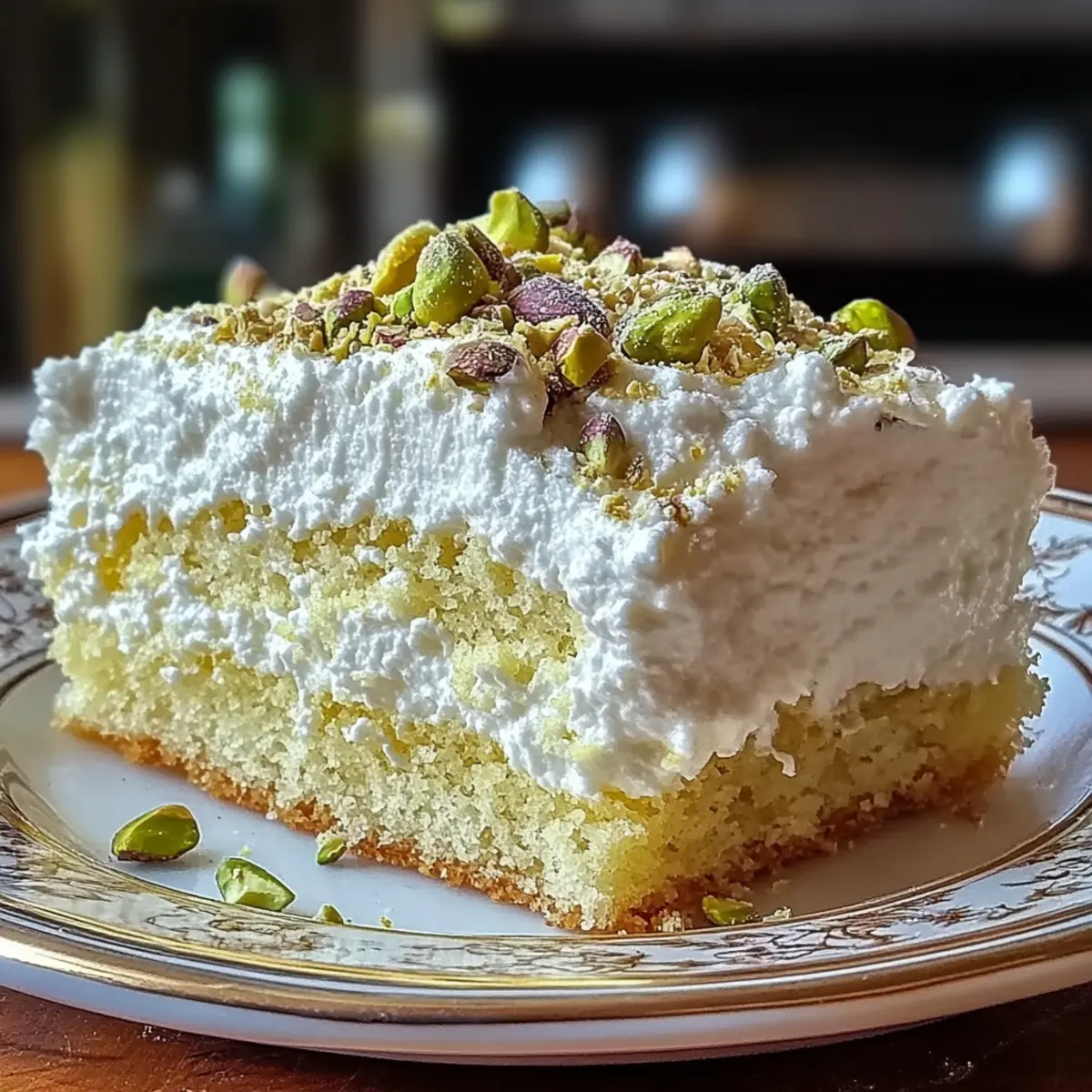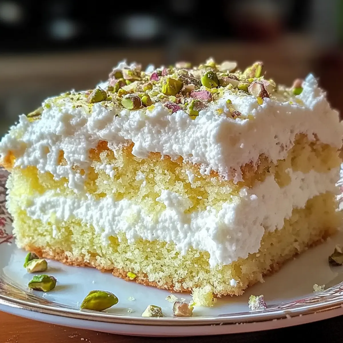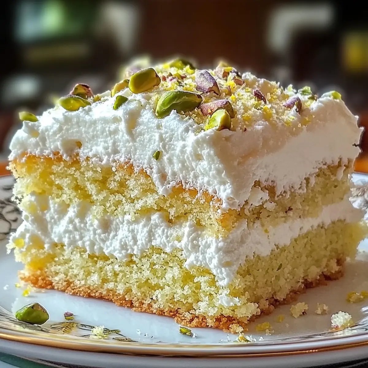 As the aroma of fresh lemons fills my kitchen, I can’t help but feel a wave of excitement—today, I’m whipping up a Lemon Pistachio Ricotta Cloud Cake! This recipe fuses the light and creamy texture of ricotta with zesty lemon for a dessert that feels like a culinary hug. Not only is this cake a showstopper for any brunch or tea party, but it also comes together in a flash, making it a perfect choice for those busy mornings or spontaneous gatherings. The delightful crunch of pistachios adds an unexpected twist that keeps everyone coming back for seconds. Are you ready to discover how easy it is to create this airy masterpiece? Let’s dive in! Why is This Cake So Light and Creamy? Uniquely Delicious: The combination of ricotta cheese and lemon creates a cake that’s both fluffy and moist, transcending traditional desserts. Versatile Ingredient Swaps: Don’t have pistachios? You can easily substitute them with almonds or walnuts for a nutty twist. Quick and Easy: This recipe is straightforward and perfect for baking novices, taking only minutes to prepare. A Showstopper Presentation: Dusting it with powdered sugar and garnishing with extra pistachios makes for an eye-catching centerpiece for any gathering, be it a brunch or a tea party. The flavors meld beautifully, inviting compliments from all. Lemon Pistachio Ricotta Cloud Cake Ingredients For the Cake Ricotta Cheese – Provides creaminess and moisture; can be substituted with cottage cheese for a lighter version. Granulated Sugar – Adds sweetness and contributes to the cake’s lift. Eggs – Essential for structure and moisture; beating them until pale yellow ensures greater leavening. All-Purpose Flour – Gives structure to the cake; for gluten-free options, use a gluten-free flour blend. Unsalted Butter – Adds richness and moistness; melt before use for easier mixing. Lemon Zest & Juice – Imparts a refreshing tang; you can substitute with lime or orange for varied flavors. Vanilla Extract – Enhances the overall flavor profile. Baking Powder – This leavening agent helps the cake rise beautifully. Salt – Balances the sweetness of the cake. Chopped Pistachios – Adds delightful crunch and a nutty flavor; swap with almonds or walnuts for a different twist. For Dusting Powdered Sugar – A touch of sweetness for dusting before serving, adds to the visual appeal of your Lemon Pistachio Ricotta Cloud Cake. Step‑by‑Step Instructions for Lemon Pistachio Ricotta Cloud Cake Step 1: Preheat and Prepare Preheat your oven to 350°F (175°C), and while it’s warming up, grease and line a 9-inch cake pan with parchment paper. This ensures easy release later. Visualize the butter smoothly coating the pan, as a well-prepared cake is the first step to success. Step 2: Beat the Ricotta In a large mixing bowl, add the ricotta cheese and granulated sugar. Use an electric mixer to beat them together until the mixture is smooth and fluffy, about 3-5 minutes. You should see the mixture turn lighter in color, signaling it’s ready for the next ingredients. Step 3: Add Eggs Gradually Next, add the eggs, one at a time, to the ricotta mixture. Mix well after each addition until it’s creamy and pale yellow, which usually takes about 30 seconds per egg. This gradual incorporation helps maintain the airy texture that makes the Lemon Pistachio Ricotta Cloud Cake so delightful. Step 4: Incorporate Wet Ingredients Stir in the melted butter, lemon zest, lemon juice, and vanilla extract until everything is well combined. You’ll notice a fragrant citrus scent wafting from the bowl—this is a good sign! Make sure no lumps remain in the batter before moving on to the dry ingredients. Step 5: Combine Dry Ingredients In a separate bowl, whisk together all-purpose flour, baking powder, and salt until thoroughly mixed. This step is crucial for ensuring even distribution of the leavening agent. Gradually stir the dry mixture into the wet ingredients until just combined; you want to keep the batter light and fluffy. Step 6: Fold in Pistachios Gently fold in the chopped pistachios, being careful not to overmix. You should see small bits of green peeking through the batter—this adds a beautiful contrast. Folding helps maintain that cloud-like texture essential for the Lemon Pistachio Ricotta Cloud Cake. Step 7: Bake the Cake Pour the batter into your prepared cake pan, smoothing the top with a spatula. Place it in the preheated oven to bake for 30 to 35 minutes. The cake should turn a lovely golden brown color, and a toothpick inserted into the center should come out clean when it’s ready. Step 8: Cool the Cake Once baked, remove the pan from the oven and let it cool for about 10 minutes. This resting period allows the cake to settle and makes it easier to transfer. After that, carefully invert the pan and place the cake on a wire rack to cool completely. Step 9: Dust and Serve Once cooled, dust the top of your Lemon Pistachio Ricotta Cloud Cake with powdered sugar for added sweetness and aesthetic appeal. You can also garnish with extra pistachios for texture. This final touch will elevate the presentation and invite everyone to enjoy your delicious creation! What to Serve with Lemon Pistachio Ricotta Cloud Cake? As you celebrate the vibrant flavors of this airy, lemony delight, consider pairing it with options that elevate the experience even further. Whipped Cream: This light and airy topping perfectly complements the cake’s fluffiness, providing a rich creaminess that enhances each bite. Fresh Berries: Mixed berries bring bright colors and a tartness that contrasts beautifully with the sweetness of the cake, adding a refreshing element to your dessert plate. Lemon Curd: A dollop of tangy lemon curd intensifies the citrus notes, creating a burst of flavor that enriches this luscious cake. Pistachio Ice Cream: Enjoy a scoop of creamy pistachio ice cream for a delightful nutty flavor that pairs harmoniously with the cake’s own crunch. Sp
