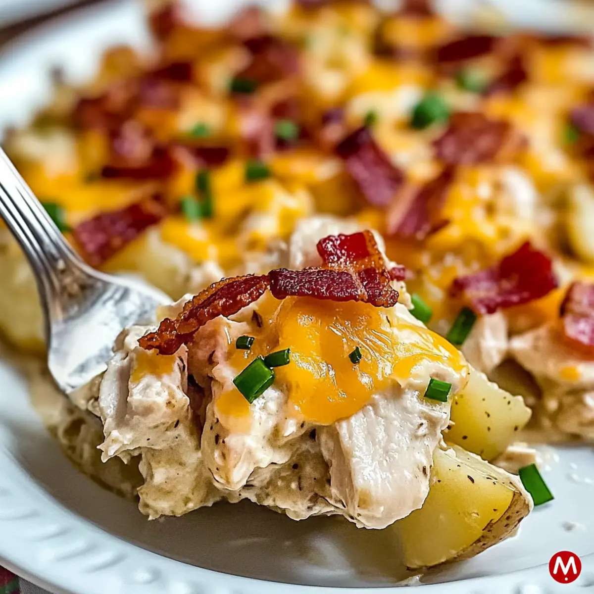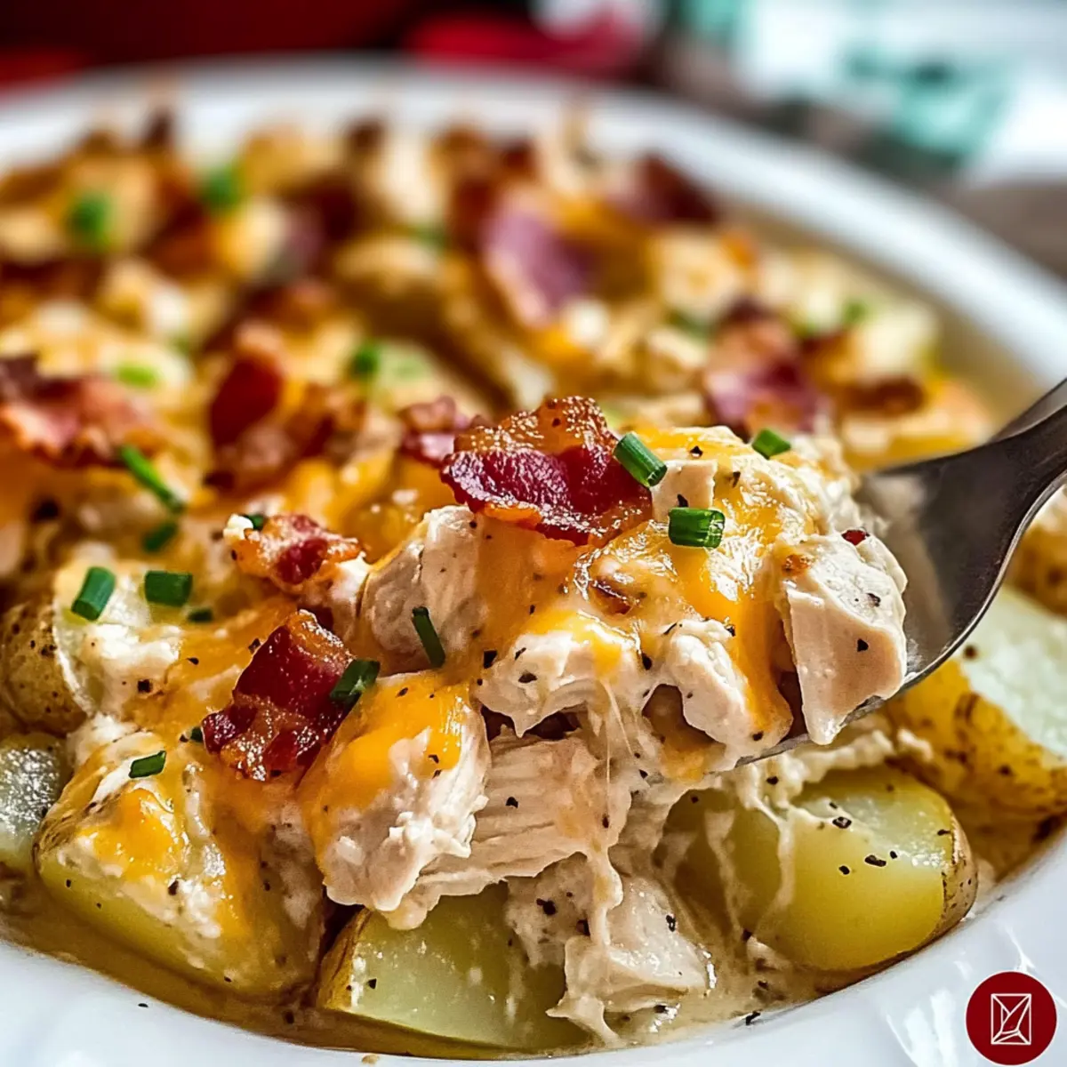 As I pulled the Loaded Potato Ranch Chicken Casserole from the oven, the warm, inviting aroma immediately filled my kitchen, transporting me back to cozy family gatherings. This comforting dish, rich with creamy cheese, savory bacon, and tender chicken, is designed for busy weeknights when you need something hearty yet simple. Not only does it deliver on flavor, but it’s also customizable—satisfying even the fussiest of eaters with ease. Plus, it allows you to whip up a meal in advance, ensuring you’re free to savor those delightful moments around the dinner table. Ready to discover how to make this family favorite? Let’s dive into the recipe! Why is this casserole a must-try? Comforting and Satisfying: This Loaded Potato Ranch Chicken Casserole brings warmth and joy to your dinner table, enveloping everyone in an indulgent flavor hug. Customizable to Taste: Feel free to tailor the ingredients with your favorite veggies or substitute proteins, making it suitable for any dietary preference. Easy to Prepare: You only need a few straightforward steps and basic ingredients to create a dish that looks and tastes gourmet. Perfect for Leftovers: Make-ahead convenience means you can prepare it in advance, saving time on busy weeknights and giving you more moments to enjoy with family. Crowd-Pleasing Appeal: Whether it’s a cozy family night or a gathering with friends, this casserole is sure to impress everyone’s palate and leave them asking for seconds. If you’re looking for more delightful chicken dishes, check out our Cream Cheese Chicken Taquitos for another easy recipe! Loaded Potato Ranch Chicken Casserole Ingredients For the Casserole Yukon Gold Potatoes – Provides a creamy texture, perfect for the casserole. Substitution: Red or russet potatoes can be used for a different flavor and texture. Boneless, Skinless Chicken – Offers lean protein; breasts yield a lighter dish, while thighs provide richer flavor. Note: Ensure uniform size for even cooking. Ranch Dressing – Adds tangy flavor; you may select your preferred brand for personal taste. Substitution: Experiment with different flavors like garlic or buttermilk. Dried Parsley – Adds mild herbal notes. Note: Fresh parsley can enhance the flavor further. Dried Oregano – Imparts aromatic depth, complementing the creamy elements. Paprika – Sweet or smoked varieties add warmth and color to the dish. Bacon – Crumbled for a crunchy, smoky richness that enhances each bite. Alternative: Use pre-cooked bacon bits to save time. Mexican Cheese Blend – Melts beautifully, creating a gooey texture that feels indulgent. Consider sharp cheddar or pepper jack for added flavor. Green Onions – Freshly chopped for a pop of color and crunch. This Loaded Potato Ranch Chicken Casserole is not just a dish; it’s an experience waiting to unfold around your dinner table! Step‑by‑Step Instructions for Loaded Potato Ranch Chicken Casserole Step 1: Preheat Oven Begin by preheating your oven to 450°F (232°C). This initial high temperature will help to achieve a nice, crispy texture on the potatoes. While the oven heats, gather your casserole dish—preferably a 9×13-inch one—to make the assembly even smoother. Step 2: Prepare Potatoes Wash and dice your Yukon Gold potatoes into evenly sized pieces for uniform cooking. In a mixing bowl, toss the potatoes with ⅓ cup of ranch dressing, dried parsley, oregano, salt, and pepper. Spread the coated potatoes in your baking dish and bake them uncovered for 30 minutes, stirring every 10 minutes, until they are tender and slightly golden. Step 3: Mix Chicken While the potatoes bake, take boneless, skinless chicken breasts or thighs and dice them into bite-sized pieces. In a separate bowl, combine the diced chicken with the remaining ranch dressing, seasoning it well with salt and pepper to enhance the flavors. This chicken mixture will be layered over the potatoes later, infusing the casserole with deliciousness. Step 4: Layer Chicken Once the potatoes are tender, remove them from the oven and layer the seasoned chicken evenly on top of the potatoes. Cover the dish tightly with foil to lock in moisture, and then reduce the oven temperature to 400°F (204°C). Bake for an additional 20 minutes, or until the chicken reaches an internal temperature of 165°F (74°C), ensuring it is fully cooked. Step 5: Add Toppings After the chicken is heated through, carefully remove the foil from the casserole. Sprinkle crumbled bacon and a generous amount of Mexican cheese blend over the top, creating a deliciously melted layer. Return the dish to the oven for another 10 minutes, allowing the cheese to melt and bubble beautifully, giving the casserole a tempting look. Step 6: Garnish and Serve Once out of the oven, let your Loaded Potato Ranch Chicken Casserole cool slightly before serving. Garnish with freshly chopped green onions for a burst of color and a fresh crunch. This final touch elevates the dish—making it not only a delight to eat but visually inviting to share at the dinner table. Make Ahead Options These Loaded Potato Ranch Chicken Casserole is perfect for meal prep enthusiasts! You can prepare the potato base up to 24 hours in advance—just wash and dice the Yukon Gold potatoes, toss them with ⅓ cup of ranch dressing and seasonings, then store them in an airtight container in the refrigerator. The chicken mixture can be prepped up to 3 days ahead, simply mix diced chicken with remaining ranch dressing and refrigerate it until you’re ready to assemble. When it’s time to cook the casserole, layer the chicken on top of the potatoes and follow the baking instructions as directed. This way, you’ll enjoy a comforting and delicious meal without the last-minute rush! Storage Tips for Loaded Potato Ranch Chicken Casserole Fridge: Store leftovers in an airtight container for up to 4 days. This ensures your Loaded Potato Ranch Chicken Casserole stays fresh and ready to enjoy anytime. Free