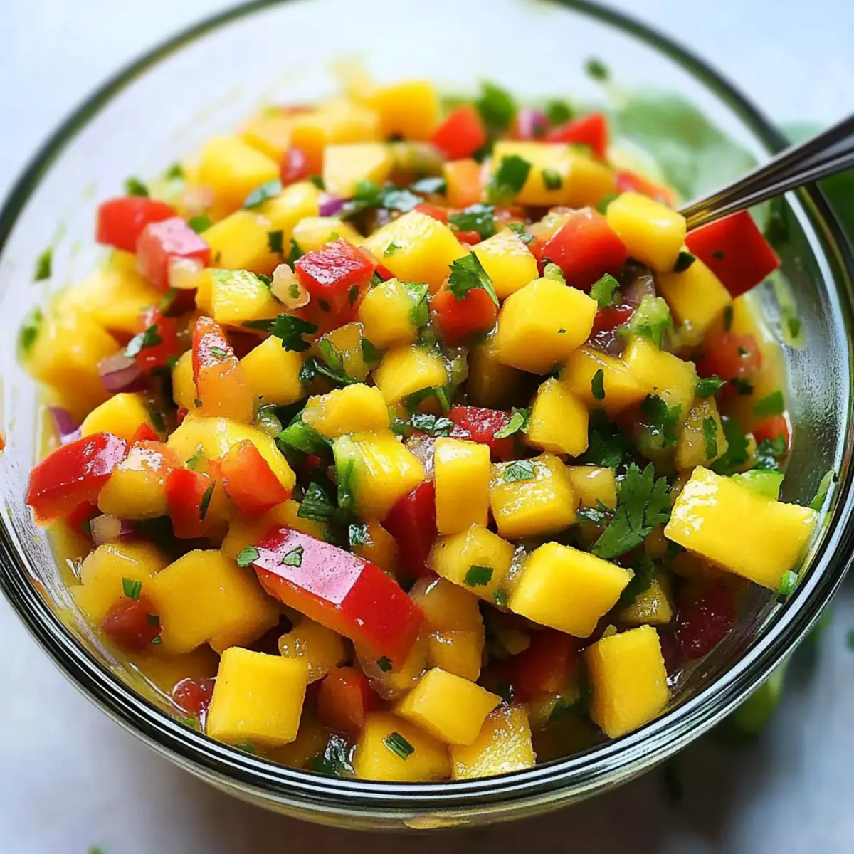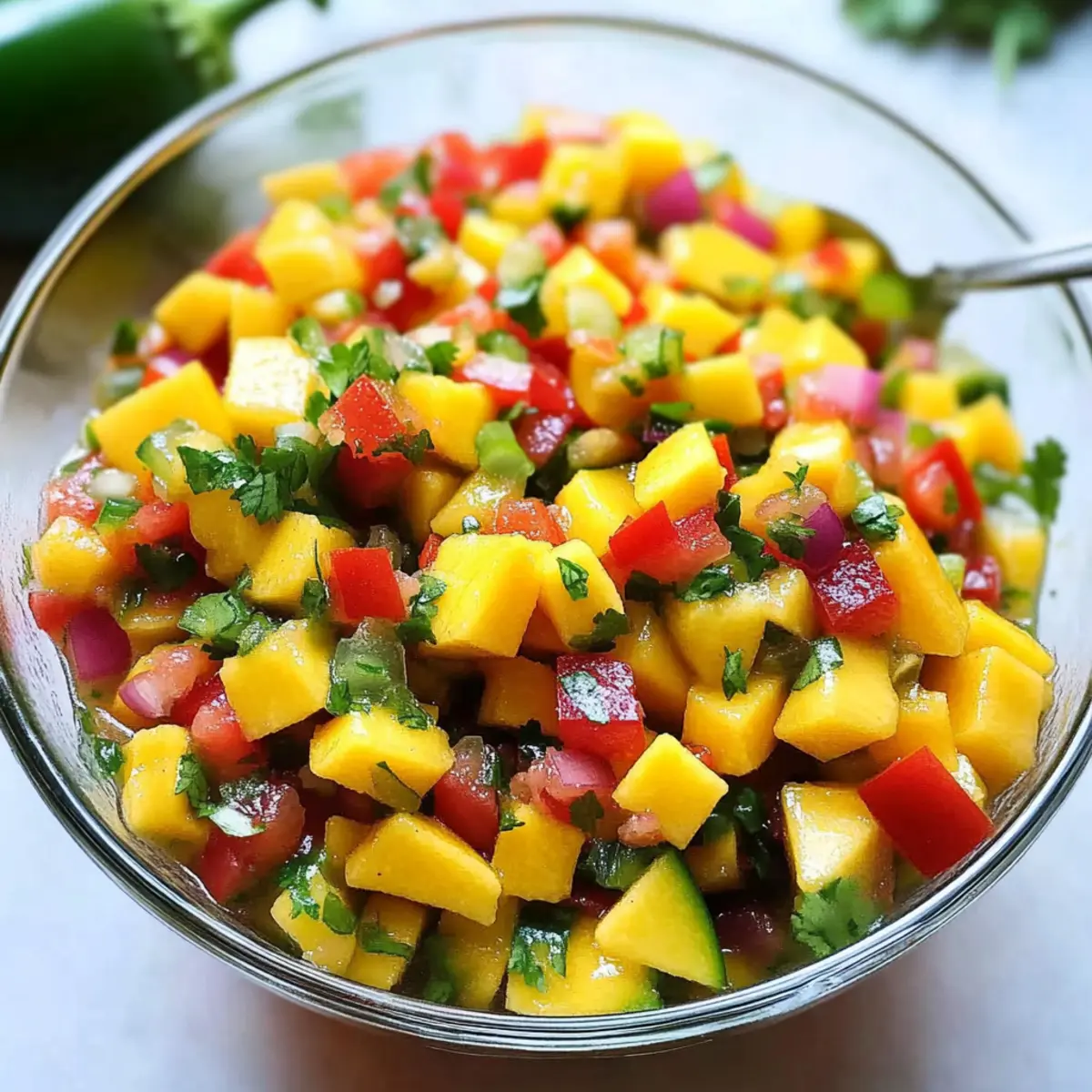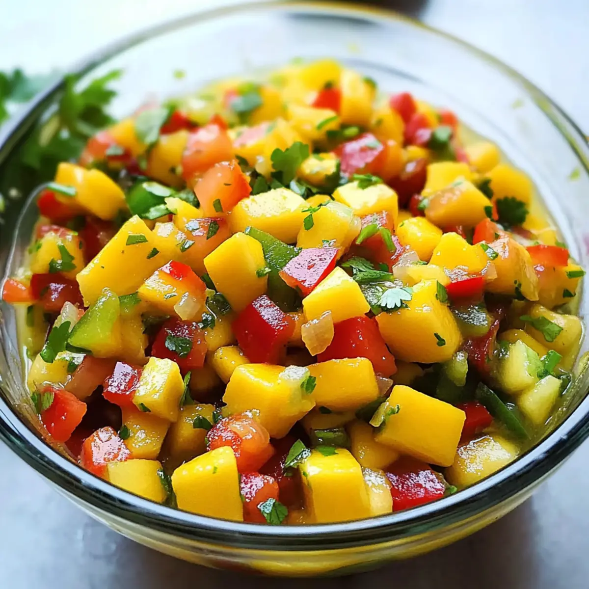 Vibrant Colors: The striking hues of ripe mangos, red bell peppers, and fresh cilantro make this salsa a feast for the eyes.