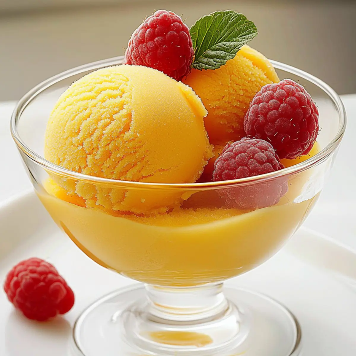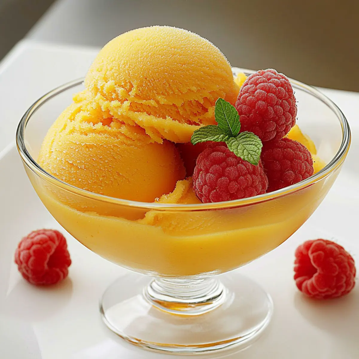 To serve, dish up generous scoops of the chilled mango sorbet into bowls. If desired, top with fresh raspberries for a vibrant color contrast and a hint of tartness. This delightful garnish not only makes the presentation pop but also adds a burst of freshness to your mango sorbet experience.