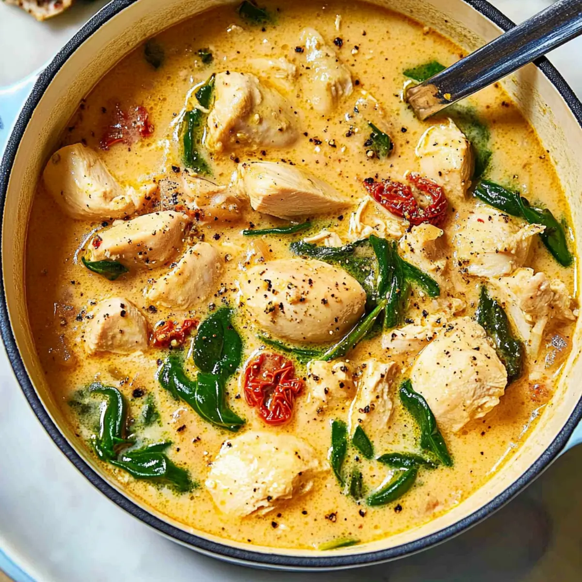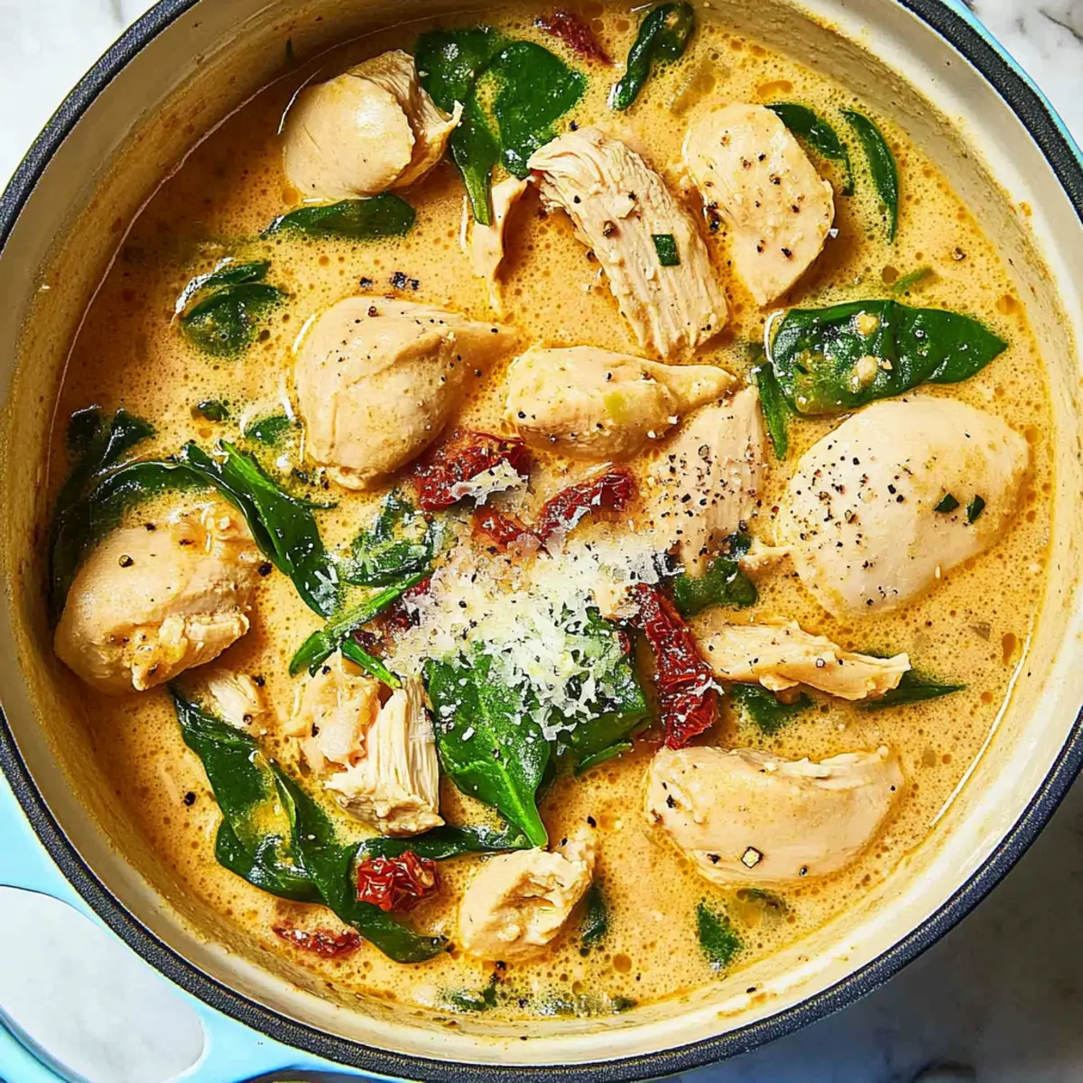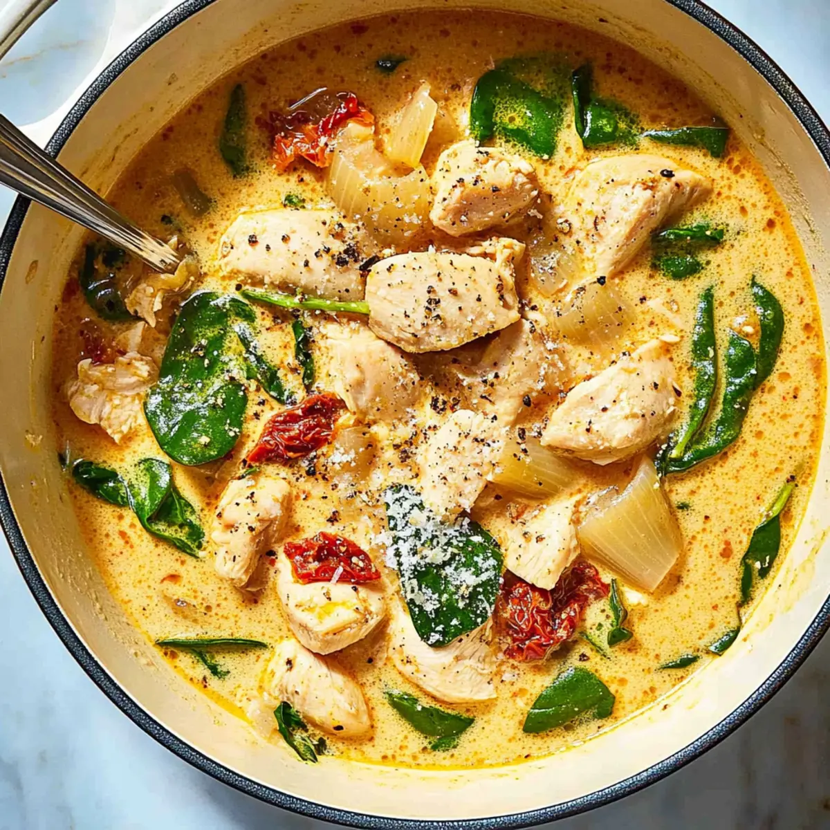 As I stirred the pot of Marry Me Chicken Soup, a wave of cozy nostalgia enveloped me, much like a warm blanket on chilly nights. This creamy comfort food is not just a dish; it’s an invitation to gather family around the table and share laughter and love. Inspired by the viral Marry Me Chicken recipe, this one-pot wonder combines tender chicken, flavorful pasta, and a delightful creamy broth spiced with sun-dried tomatoes and Parmesan—perfect for a quick yet heartwarming meal. In just 55 minutes, you can whip up this delicious soup that’s bound to become a family favorite. With its rich flavors and ease of preparation, you’ll find yourself reaching for this recipe time and again. So, are you ready to bring a taste of comfort to your next dinner? Why is This Soup a Must-Try? Comforting, Creamy Delight: This Marry Me Chicken Soup wraps you in warmth with its rich, velvety texture, making it the ultimate comfort food. Family-Friendly: Designed to please everyone at the table, it’s a dish that invites sharing and joy, perfect for busy weeknights. One-Pot Wonder: Less cleanup means more time enjoying laughter and great conversation with loved ones, especially when paired with crusty bread or a fresh salad. Quick and Easy: In just 55 minutes, you can create a heartwarming meal that feels like it took all day—perfect for those who crave homemade goodness without the fuss. Versatile Flavors: Feel free to swap in seasonal vegetables or use turkey for a delicious twist. This soup adapts to your tastes, keeping meals exciting! Embrace the love and warmth of this recipe that draws inspiration from the beloved Marry Me Chicken. It’s not just a meal; it’s a memorable experience! Marry Me Chicken Soup Ingredients For the Soup Base Boneless, skinless chicken breasts or thighs (1 ½ pounds) – Provides the protein base; substitute with cooked shredded chicken to save time. Kosher salt (2 teaspoons) – Enhances flavor throughout the dish; alter salt amount to taste based on dietary needs. Unsalted butter (2 tablespoons) – Adds richness to the dish; can use olive oil for a lighter alternative. Medium yellow onion, diced (1 ½ cups) – Offers a sweet and aromatic base; shallots can be used for a milder flavor. Garlic, minced (3 cloves) – Provides a pungent, fragrant note; garlic powder can substitute in a pinch. Freshly ground black pepper – Adds heat and depth; adjust to preference. For the Soup Flavors Sun-dried tomatoes, julienned (2 ½ ounces) – Provides a tangy sweetness; use fresh tomatoes for a fresher flavor. Tomato paste (3 tablespoons) – Deepens the tomato flavor of the broth; can omit for a milder soup. Low-sodium chicken broth (6 cups) – Serves as the soup base; vegetable broth can be used for a vegetarian option. Dried thyme (1 teaspoon) – Adds earthy notes; other dried herbs like oregano or basil can work as substitutes. Red pepper flakes (optional) – Introduces heat; omit for a non-spicy version. For the Soup Heaviness Dried medium pasta shells (8 ounces) – Adds heartiness to the soup; substitute with any small pasta. Baby spinach (5 ounces) – Provides color and nutrition; kale or other greens can be used as alternatives. Heavy cream (¾ cup) – Delivers a rich and creamy texture; coconut cream or a fat-free alternative can be used. Grated Parmesan cheese (½ ounce for the soup + more for serving) – Unifies flavors with a salty richness; nutritional yeast can substitute for a dairy-free option. Get ready to savor every sip of this Marry Me Chicken Soup! Step‑by‑Step Instructions for Marry Me Chicken Soup Step 1: Prepare the Chicken Begin by cutting the boneless, skinless chicken into bite-sized pieces and seasoning generously with kosher salt. This crucial step elevates the flavor of your Marry Me Chicken Soup right from the start. Set the seasoned chicken aside while you prepare to cook it for the perfect golden-brown color. Step 2: Brown the Chicken In a large pot, melt 2 tablespoons of unsalted butter over medium-high heat. Once the butter is bubbling, add the seasoned chicken in batches; brown each batch for about 5-7 minutes until it’s golden all over. This step ensures a rich flavor base. Remove browned chicken and set it aside in a bowl while you move on. Step 3: Sauté Aromatics Using the same pot, add the diced onion and minced garlic. Sauté for 3-5 minutes over medium heat until the onion turns translucent and fragrant. This aromatic blend forms the flavorful foundation of your Marry Me Chicken Soup and will infuse the broth with warmth. Step 4: Stir in the Flavor Boosters Next, stir in the julienned sun-dried tomatoes and 3 tablespoons of tomato paste. Cook for about 2-3 minutes, stirring occasionally, until the tomato paste darkens slightly, deepening the flavors. This step adds a wonderful tangy sweetness that contrasts beautifully with the savory chicken. Step 5: Combine with Broth Add 6 cups of low-sodium chicken broth to the pot, along with 1 teaspoon of dried thyme and a pinch of red pepper flakes for a hint of heat. Increase the heat and bring this mixture to a gentle boil, allowing the flavors to meld—this should take about 5 minutes. Step 6: Cook the Pasta Once boiling, stir in 8 ounces of dried medium pasta shells. Reduce the heat to a simmer, cooking uncovered for 10-12 minutes or until the pasta is al dente. Keep an eye on the pot as the pasta cooks; it will absorb some of the rich broth flavor while adding heartiness to your Marry Me Chicken Soup. Step 7: Bring Everything Together Return the browned chicken to the pot, along with 5 ounces of baby spinach. Stir in ¾ cup of heavy cream and ½ ounce of grated Parmesan cheese until the spinach wilts and the soup becomes velvety and creamy. You’ll see the colors come alive in this comforting dish, signaling it’s almost ready to serve! How to Store and Freeze Marry Me Chicken Soup Fridge: Store leftovers in an airtight container for up to 4 days. Reheat gently on the st