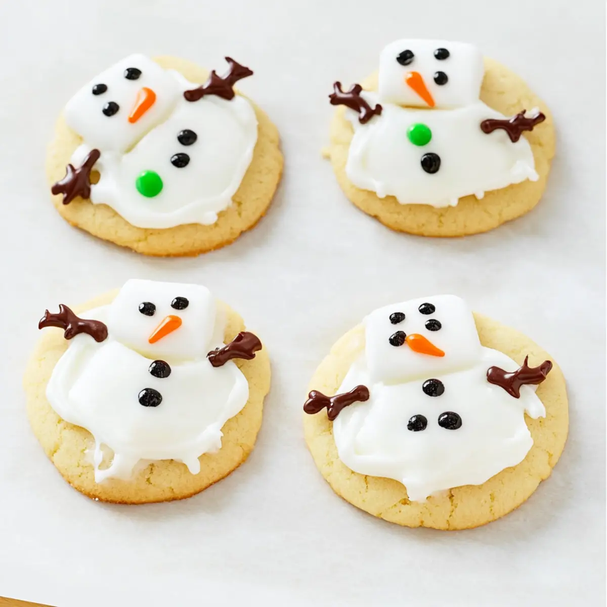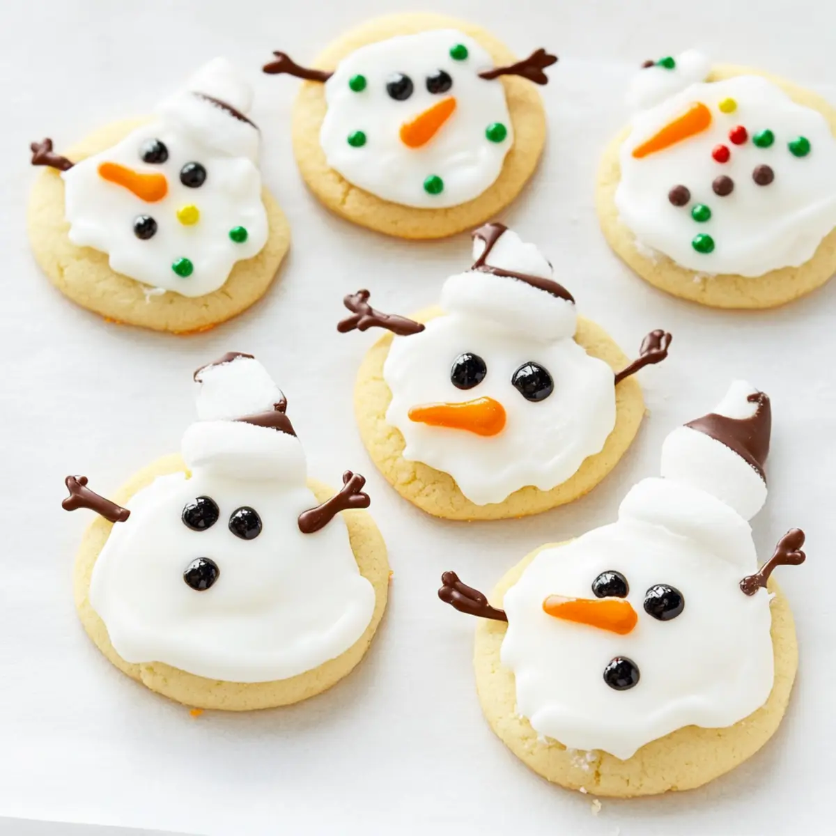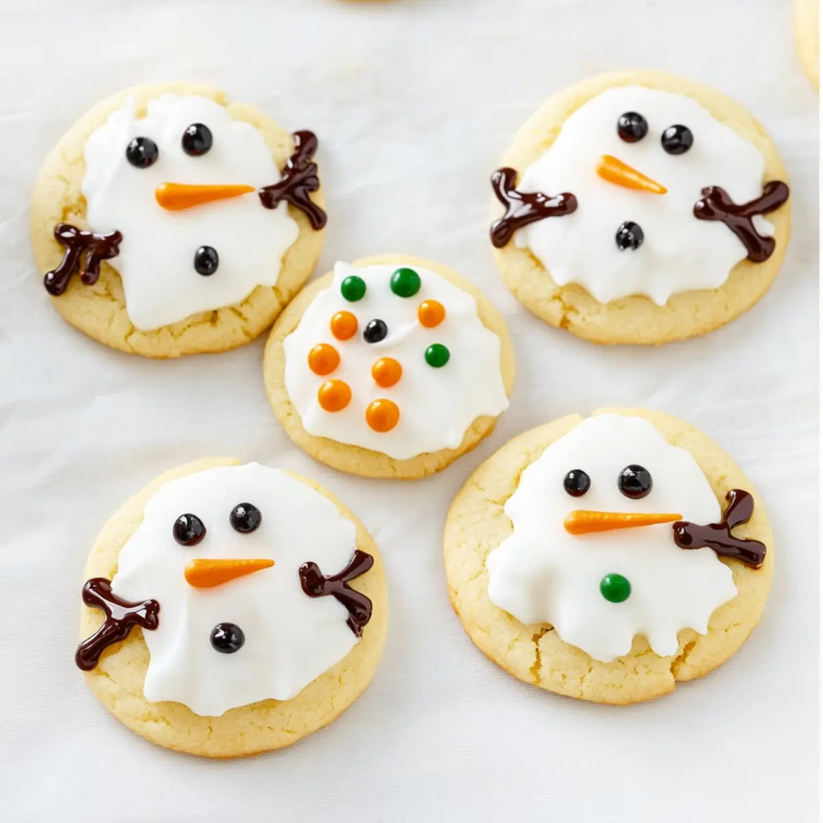 The kitchen is a whirlwind of excitement as the holiday season rolls in, but who says you can’t have a little fun while baking? These Melted Snowman Cookies are the epitome of festive joy, perfectly combining simplicity and creativity for a delightful sugar cookie treat. With the tender sweetness of the cookie base and whimsical marshmallow decorations, they’re not just a feast for the eyes—each bite is a reminder of childhood wonder. These cookies are quick to whip up and make for a fantastic family project, inviting everyone—from toddlers to grandparents—to join in on the decorating fun. Plus, they’re a crowd-pleaser at any holiday gathering, bringing smiles and sweet memories to the table. Ready to transform your holiday baking into a playful masterpiece? Let’s dive into making these enchanting Melted Snowman Cookies! Why Are Melted Snowman Cookies So Special? Fun for All: Everyone will love crafting their own unique snowman, making these cookies a perfect family activity during the holidays. Quick and Easy: With just a few simple ingredients, these cookies come together in no time, eliminating the stress often associated with festive baking. Endless Creativity: Use colorful icing and candy for endless decorating possibilities, ensuring no two snowmen look alike! Delightful Presentation: Their adorable appearance guarantees they’ll be the highlight of any dessert table. Sweet Flavor: The combination of tender sugar cookies and fluffy marshmallows offers a delightful sweetness that everyone will enjoy. Baking these Melted Snowman Cookies truly adds a sprinkle of holiday magic to your celebrations! Melted Snowman Cookies Ingredients For the Sugar Cookies Baked Sugar Cookies – The essential base that provides a tender sweetness; store-bought cookies work great for convenience. For the Decorations Marshmallows (6, halved at an angle) – They form the body of the snowmen, adding a fun chewy texture; larger marshmallows create more pronounced shapes. White Cookie Icing – This adds a snowy touch and sweetness; royal icing can be used for a sturdier finish if desired. Black Cookie Icing or Melted Chocolate – Perfect for creating eyes and buttons, adding delightful contrast; chocolate chips offer a rustic twist if you’re feeling creative. Orange Jimmies (12) – These cute little pieces serve as noses for the snowmen; candy corn or other small orange candies are great alternatives. Mini M&Ms (24) – Use these as buttons to enhance the overall appeal; feel free to swap with any small candies you prefer. Chocolate Jimmies – Represent arms, adding finishing touches; they can be omitted if you want to simplify the design. Baking and decorating these Melted Snowman Cookies is not just about the deliciousness; it’s about creating lasting memories during the holiday season! Step‑by‑Step Instructions for Melted Snowman Cookies Step 1: Prepare Cookie Base Begin by ensuring your sugar cookies are fully baked and cooled. If using store-bought cookies, arrange them on a baking sheet lined with parchment paper for easy decorating. Having the cookies at room temperature helps the icing adhere better, so set them aside while you gather your decorating tools like small spatulas and piping bags. Step 2: Decorate with Icing Using white cookie icing, generously spread a layer on the tops of each cooled sugar cookie. The icing acts like snow, so don’t be shy! Next, halve the marshmallows at an angle, and gently press them into the icing-covered cookies to form the snowman bodies. Allow the icing to set for about 5-10 minutes until it becomes slightly tacky. Step 3: Add Details Now for the fun part! With your black icing, carefully pipe out little eyes and buttons onto each marshmallow. Use a simple piping bag or a squeeze bottle for control. Then, add an orange jimmy for each snowman’s nose, placing it right on the edge of the marshmallow. The contrast of colors will make these Melted Snowman Cookies truly cheerful! Step 4: Finish with Arms For a whimsical touch, take the chocolate jimmies and insert them gently into the sides of each marshmallow to create arms. Try to angle them slightly outward for a more dynamic look. This step adds personality to each snowman, making every cookie unique. Let the cookies sit for an additional 5 minutes for everything to secure. Step 5: Set and Serve Once decorated, allow the Melted Snowman Cookies to rest at room temperature for about 10-15 minutes so the icing can set completely. This not only helps the decorations stay in place but also gives the icing a lovely sheen. Finally, carefully transfer them to a serving platter to showcase your delightful creations at your holiday gathering! Expert Tips for Melted Snowman Cookies Cool Completely: Ensure your sugar cookies are fully cooled before decorating; warm cookies can melt the marshmallows and ruin the design. Use Piping Bags: For detailed decorating, opt for piping bags with small tips for icing; this gives you precise control over placement and design. Let Icing Set: Allow the white icing to set slightly before adding marshmallows; this helps the snowmen hold their shape better and look tidy. Fun Variations: Don’t hesitate to swap candies for the facial features; using different colors can create unique snowmen and keep the decorating engaging for everyone. Storage Savvy: Store your decorated Melted Snowman Cookies in an airtight container to keep them fresh, layering them with parchment to prevent sticking. With these expert tips, you’re all set to create stunning and delicious Melted Snowman Cookies that will steal the show this holiday season! Make Ahead Options These Melted Snowman Cookies are fantastic for busy home cooks looking to save time during the festive season! You can prepare the sugar cookie base up to 3 days in advance. Simply bake the cookies, allow them to cool completely, and store them in an airtight container at room temperature. For the icing and decorations, y