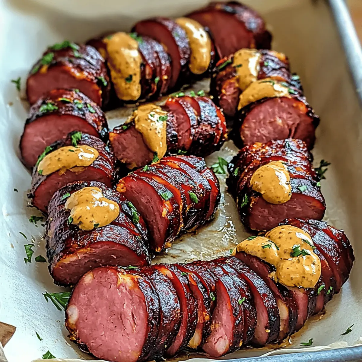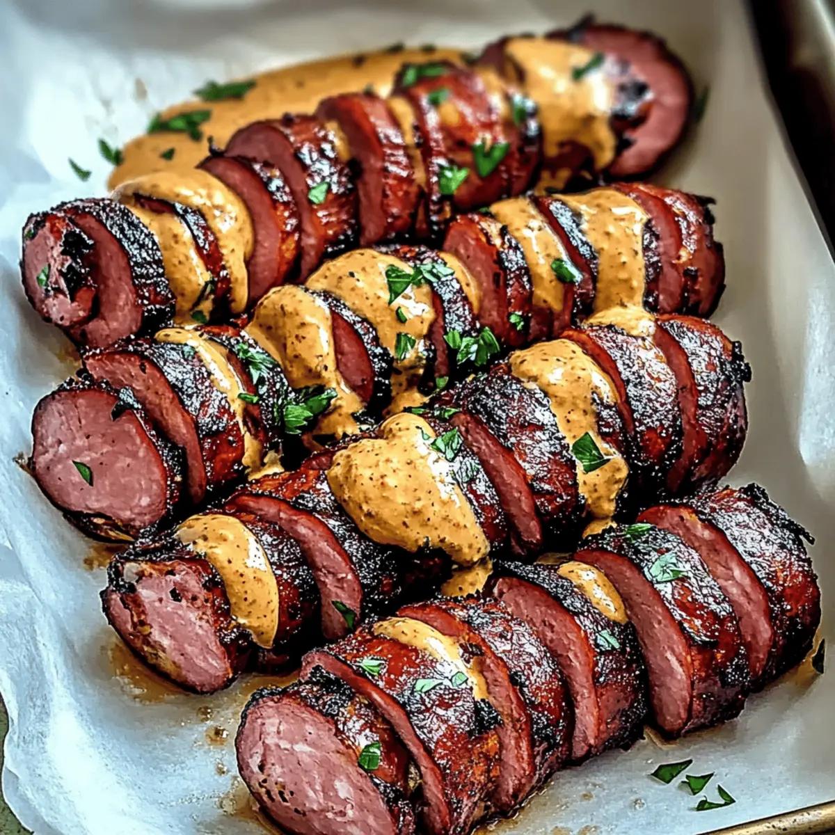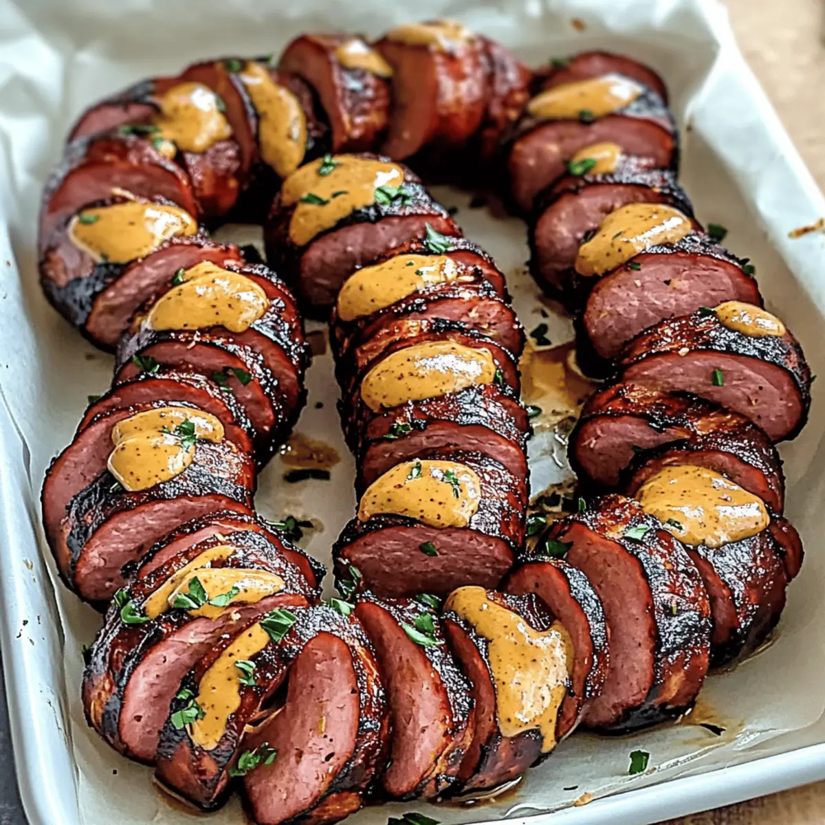 As I stood in my kitchen, the tantalizing aroma of mustard and sizzling sausage danced in the air, instantly transporting me to summer barbecues with friends. That’s exactly the feeling I wanted to capture with these Mustard Hasselback Kielbasa Bites. This easy-to-make appetizer offers a delightful and crispy exterior while keeping the juicy flavors locked inside. Perfect for those relaxed weekend get-togethers or any evening in need of a comfort-food boost, this dish requires minimal prep time, allowing you to spend more moments making memories. Plus, they’re incredibly customizable, so feel free to swap out mustards or add your own zesty twist. Are you ready to elevate your snacking game and impress your guests? Keep scrolling to find out how to make this simple yet irresistible delight! Why are you going to love these bites? Irresistible flavors: The combination of crispy kielbasa and tangy mustard creates a savory sensation that will tantalize your taste buds. Easy preparation: With minimal prep time, you can whip these up quickly, giving you more time to enjoy with your guests. Customizable options: Choose from various mustard types to match your personal preference, whether it’s spicy, sweet, or tangy! Party perfection: These bites are crowd-pleasers that disappear fast at gatherings. Pair them with dipping sauces for extra fun. Cultural flair: Enjoy a taste of tradition with these delicious kielbasa bites, inspired by Polish culinary heritage! Get ready for a flavor explosion that’s sure to impress everyone at your next event! Mustard Hasselback Kielbasa Bites Ingredients For the Kielbasa Bites • Kielbasa – The star ingredient; juicy, flavorful, and perfect for grilling or baking. For a different twist, feel free to substitute it with smoked sausage! • Yellow Mustard – The tangy base of the glaze; it adds that zing! You can switch it up with Dijon or spicy brown mustard if you’re looking for a bit of heat. • Brown Sugar – Adds a touch of sweetness to balance the mustard’s tang; you can omit this for a low-sugar option or use honey for a natural sweetness. • Garlic Powder – This provides a lovely depth of flavor; for a more robust taste, opt for fresh minced garlic instead. • Paprika – Infuses a mild smoky flavor and adds a pop of color; if you fancy a stronger smoky taste, use smoked paprika instead. For Enhancements • Jalapeños – If you want some heat, slide slices between the kielbasa for a spicy surprise! • Shredded Cheese – For added richness and creaminess, sprinkle some on top before baking. • Fresh Herbs – Scatter chopped herbs like parsley or chives for a fresh finish! Your Mustard Hasselback Kielbasa Bites are just a few ingredients away—let’s get cooking! Step‑by‑Step Instructions for Mustard Hasselback Kielbasa Bites Step 1: Preheat the Oven Begin by preheating your oven to 400°F (200°C). While the oven heats up, prepare a baking dish by lightly spraying it with nonstick cooking spray to ensure the kielbasa bites don’t stick. This will help achieve that perfect golden-brown finish once they’re done baking. Step 2: Slice the Kielbasa Take your kielbasa and place it on a cutting board. Carefully slice it into bite-sized pieces in a Hasselback style, making cuts about ¾ of the way through the sausage, but leave the bottom intact so the pieces remain connected. This technique allows the flavors of the mustard glaze to seep into every delicious slice. Step 3: Prepare the Mustard Mixture In a small bowl, whisk together yellow mustard, brown sugar, garlic powder, and paprika until the mixture is smooth and well combined. This homemade glaze will coat the kielbasa bites, infusing them with a delightful balance of tangy, sweet, and savory flavors. Set the bowl aside once mixed. Step 4: Coat the Kielbasa Using a brush or spoon, generously apply the mustard mixture over the sliced kielbasa, ensuring that some of the glaze seeps into the cuts. This step is crucial for achieving the flavorful crust you’ll savor in your Mustard Hasselback Kielbasa Bites when they bake. Step 5: Bake the Kielbasa Bites Place the prepared kielbasa on the sprayed baking dish and transfer it to the preheated oven. Bake for 20-25 minutes, or until the kielbasa bites are golden brown and sizzling. Keep an eye on them to prevent burning; this is where you’ll create that irresistible crispy exterior that pairs perfectly with the juicy interior. Step 6: Serve and Enjoy Once baked to perfection, remove your Mustard Hasselback Kielbasa Bites from the oven. Let them cool slightly before serving, and garnish with toothpicks for easy enjoyment. These tasty bites are best served hot, paired with your favorite dipping sauces, making them the perfect appetizer or snack for any occasion. Expert Tips for Mustard Hasselback Kielbasa Bites • Timing is Key: Keep an eye on baking time, as ovens can vary. Aim for golden brown but not burnt to maintain the delicious crispy texture. • Stay Juicy: Avoid cutting all the way through the kielbasa. It should remain connected at the bottom to lock in moisture and flavor, ensuring juicy Mustard Hasselback Kielbasa Bites. • Customize Flavors: Feel free to experiment with different mustard types! Each variety can create a unique flavor profile, so switch it up based on your mood or guests’ preferences. • Don’t Skip the Spray: Be generous with nonstick spray on your baking dish. This small step prevents sticking and creates that perfect crispy finish everyone loves! • Serve with Dips: Pair these bites with an array of dipping sauces to elevate your snacking experience. Think outside the box—sriracha, barbecue, or ranch can add extra zing! How to Store and Freeze Mustard Hasselback Kielbasa Bites Fridge: Store leftovers in an airtight container in the refrigerator for up to 3 days, ensuring they stay fresh and flavorful for your next snack. Freezer: For longer storage, freeze the baked bites in a single layer