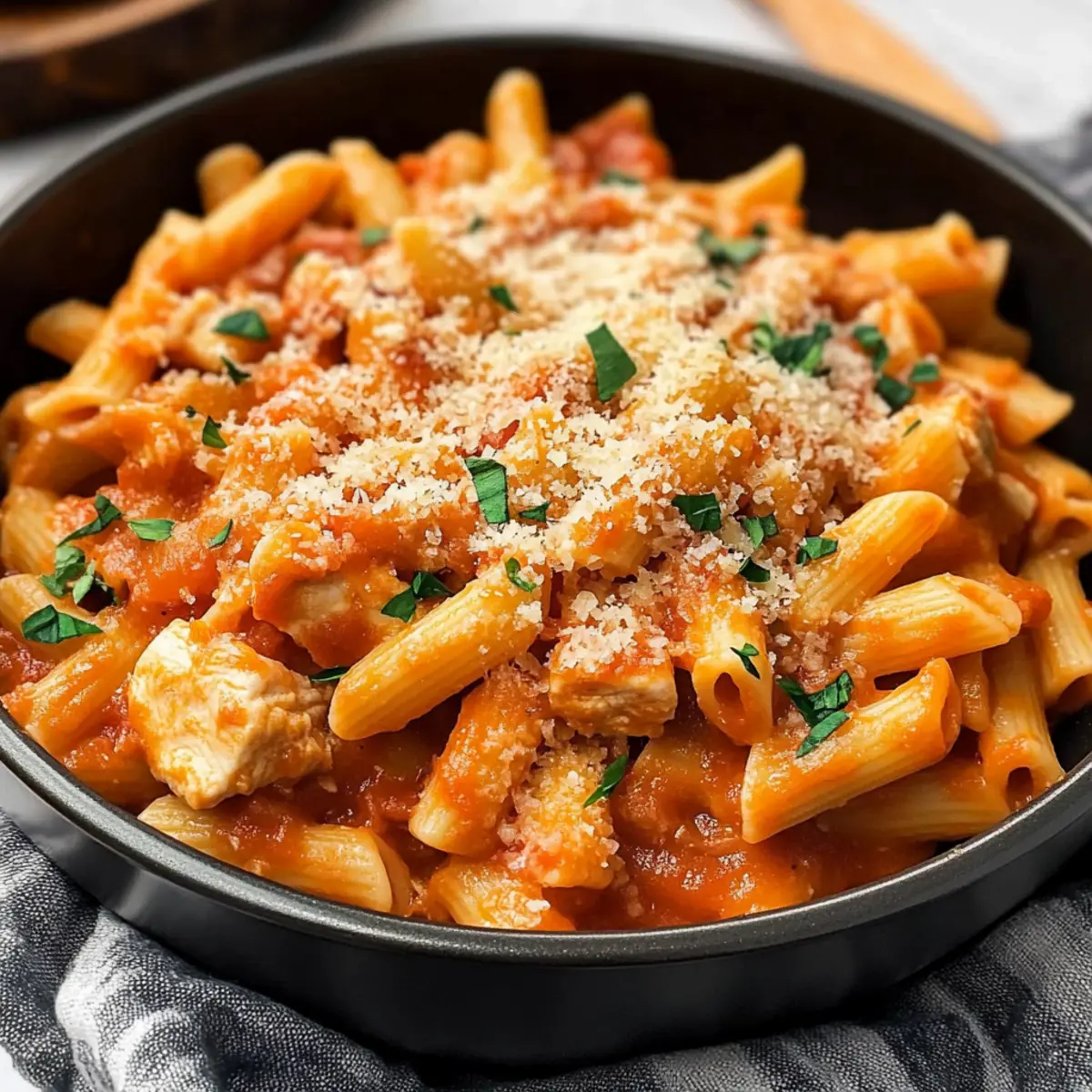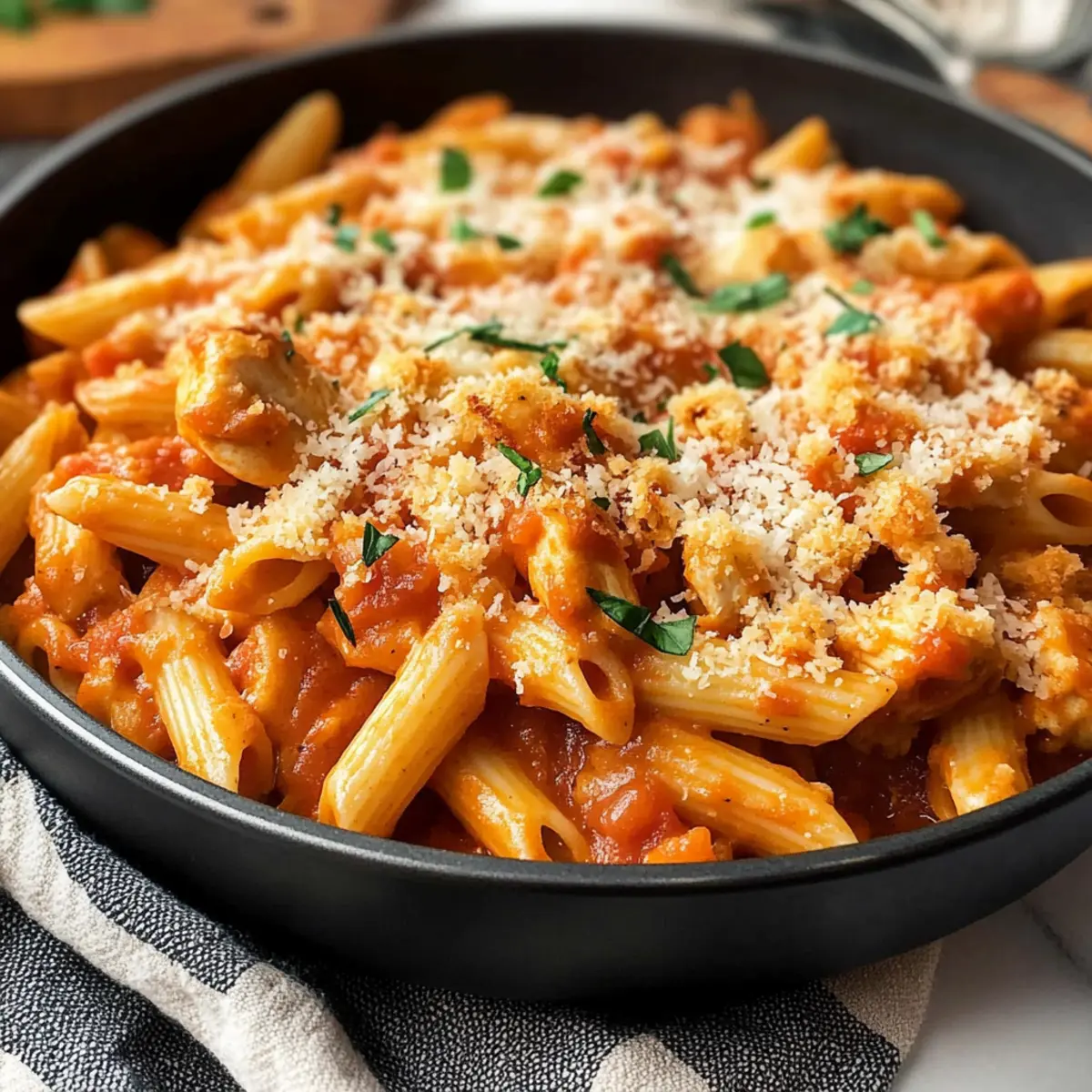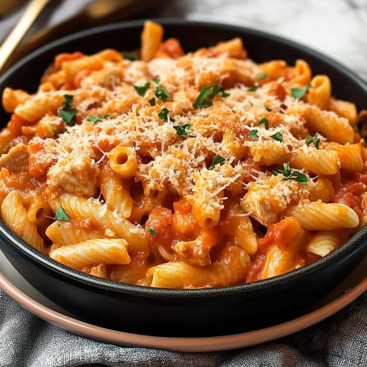 As the aroma of garlic and bubbling marinara sauce fills the kitchen, I can’t help but feel a flutter of excitement. My family is always on the go, and finding recipes that deliver both taste and ease can be a challenge. That’s why I love this Easy One Pot Chicken Parmesan Pasta—it’s the ultimate solution for busy weeknights! Not only does it capture the hearty essence of traditional Chicken Parmesan, but it also cooks up in under an hour, minimizing cleanup while keeping the delicious flavors intact. Best of all, with this recipe, you’ll not only treat your taste buds but also ensure a wholesome, healthy dinner that the whole family will adore. Curious about how to create this delightful dish? Let’s dive in! Why is this One Pot Wonder a Must-Try? Simplicity Made Delicious: All the flavors of Chicken Parmesan come together in a single pot, saving you time and effort in the kitchen. Healthy Twist: Enjoy a wholesome meal that’s balanced and nourishing—perfect for anyone looking to switch up their weeknight dinners. Quick Cooking: With just a few steps, you can whip up this flavorful dish in under an hour, which is ideal for busy schedules. Crowd-Pleasing Flavor: The cheesy, savory goodness will have everyone coming back for seconds, guaranteeing it becomes a family favorite. Minimal Cleanup: Less time washing dishes means more time enjoying dinner with loved ones. Pair it with a side of roasted vegetables for an extra boost of nutrition! One Pot Chicken Parmesan Pasta Ingredients Discover the magic behind your next family favorite! For the Pasta Dish Butter – Adds richness and flavor; substitute with 1 tablespoon olive oil if preferred. Olive Oil – Used for sautéing chicken; can substitute with avocado oil or ghee for a unique taste. Boneless Skinless Chicken Breasts – Main protein source, cut into 1” chunks; feel free to swap with thighs or tenders if desired. Yellow Onion – Adds an aromatic base that enhances every bite. Garlic – Fresh minced garlic offers fantastic flavor; alternatively, use garlic powder for a more intense taste. Dried Basil & Oregano – Infuse classic Italian flavors; you can substitute with 1½ teaspoons Italian seasoning for convenience. Red Pepper Flakes – Optional spice for a mild kick; add more for heat lovers! Dried Medium Pasta (Farfalle, Campanelle, Rigatoni) – Forms the bulk of the dish; avoid gluten-free varieties as they cook differently. Marinara Sauce – Your dish’s base for moisture and flavor; homemade or store-bought both work well. Water – Used for cooking pasta; substitute with low-sodium chicken broth for enhanced flavor. Mozzarella Cheese – Creates a deliciously creamy texture; freshly grated aids in better melting. Grated Parmesan Cheese – Adds a salty depth to your dish; be generous for even more flavor! Panko Breadcrumbs – For that beloved crunch; regular breadcrumbs or gluten-free options can also be used. Fresh Basil – Optional garnish for a vibrant finish! Whip up this One Pot Chicken Parmesan Pasta and bring warmth to your dinner table! Step‑by‑Step Instructions for One Pot Chicken Parmesan Pasta Step 1: Melt Butter and Toast Breadcrumbs Start by adding 2 tablespoons of butter to a large Dutch oven over medium heat. Once the butter is melted and bubbling, stir in minced garlic and ½ cup of panko breadcrumbs. Sauté the mixture for about 3 minutes until the breadcrumbs turn golden brown and fragrant. Remove the toasted breadcrumbs from the pot and set them aside, allowing the delicious aroma of garlic to linger. Step 2: Sauté Chicken Wipe down the pot to remove any residue from the breadcrumbs, then increase the heat to medium-high and add 1 tablespoon of olive oil. Pat 1 pound of boneless skinless chicken breasts dry and add them to the hot oil, cooking for about 5 minutes until lightly browned. Then, introduce 1 chopped yellow onion, minced garlic, 1 teaspoon dried basil, 1 teaspoon dried oregano, and a pinch of red pepper flakes, sautéing everything for an additional 3 minutes until the onion softens. Step 3: Add Pasta and Sauce Pour in 12 ounces of dried medium pasta, 24 ounces of marinara sauce, and 2 ½ cups of water into the mix. Stir everything together until well combined, ensuring the pasta is evenly distributed throughout the sauce and chicken. Once combined, cover the pot with a lid and bring the mixture to a vigorous boil, which should take about 5 minutes. Step 4: Cook Pasta After bringing it to a boil, reduce the heat to low and let the pot simmer, still covered, for about 6 minutes—half the recommended cooking time for the pasta. Stir occasionally during this time to prevent the pasta from sticking to the bottom. The pasta should be just al dente when you uncover the lid. Step 5: Incorporate Cheeses and Let Rest Remove the pot from heat and let it sit, covered, for 5 minutes to allow the residual heat to finish cooking the pasta. Once resting, sprinkle in 1 ½ cups of freshly grated mozzarella cheese, ½ cup of grated Parmesan cheese, and a handful of chopped fresh basil. Stir the mixture gently until the cheeses melt and integrate into the creamy sauce. Step 6: Serve with Crunch To finish, dish out the delicious One Pot Chicken Parmesan Pasta into bowls or plates. Generously sprinkle the reserved toasted garlic panko on top for that irresistible crunch that mimics the beloved Chicken Parmesan texture. Serve immediately and relish in the delightful flavors, ensuring every bite is as comforting as it is satisfying. How to Store and Freeze One Pot Chicken Parmesan Pasta Fridge: Store leftovers in an airtight container for up to 3 days. Reheat on the stovetop over low heat, adding a splash of water or broth to restore creaminess. Freezer: For longer storage, freeze in portions in freezer-safe containers for up to 2 months. Thaw overnight in the fridge before reheating for best results. Reheating: Reheat on the stovetop or in the microwave until heated through. Add extra chee