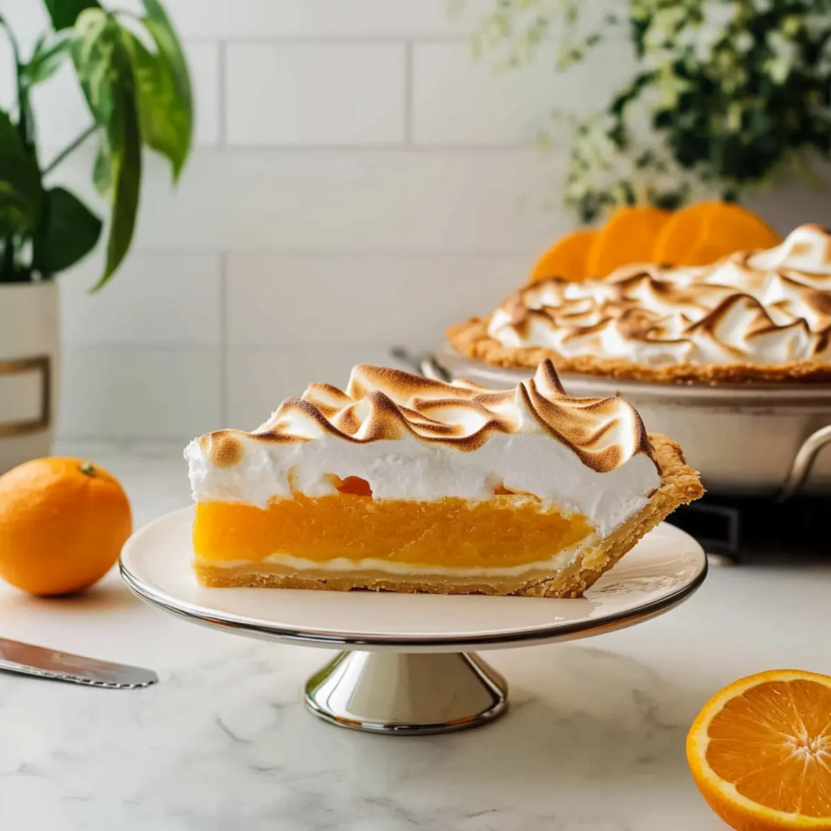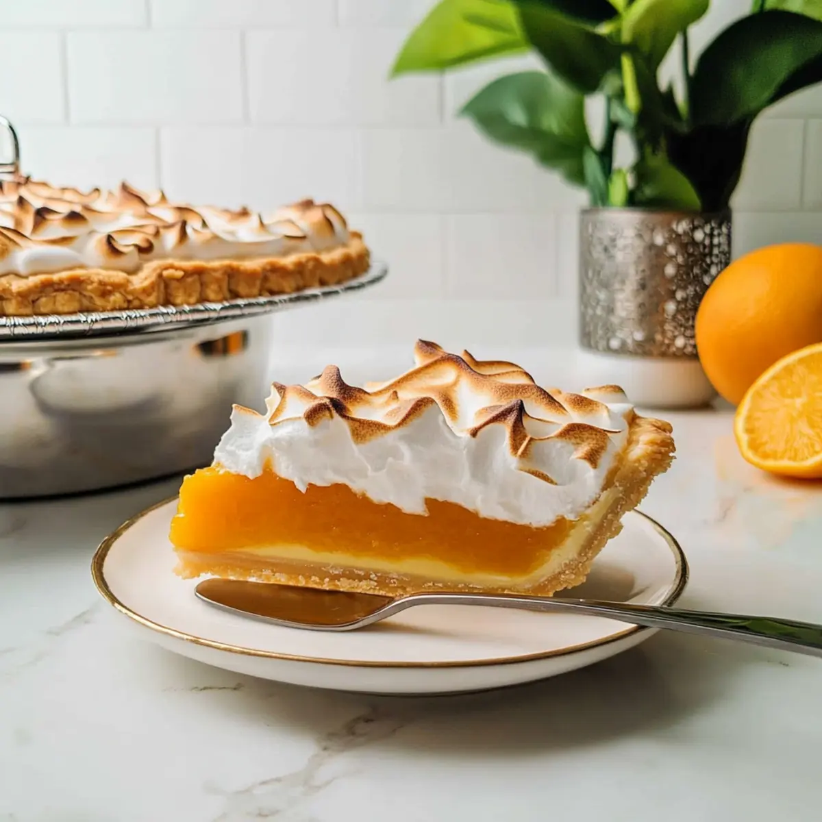 Stand in your kitchen as the sweet scent of freshly squeezed oranges fills the air. There’s something undeniably cozy about creating a dessert that brings warmth and joy to the table—like this vibrant Orange Meringue Pie. This delightful twist on the classic lemon meringue features a buttery, flaky crust embracing a luscious orange curd that’s not just a feast for the palate but also a visual treat. The best part? It’s quick to prepare, making it ideal for both seasoned bakers and those who are just starting their culinary adventures. Each bite delivers a burst of citrusy goodness topped with a fluffy Swiss meringue, promising to charm every guest at your gathering or brighten up a quiet evening at home. Ready to indulge your senses and impress your loved ones? Let’s dive into the recipe! Why is Orange Meringue Pie a Must-Try? Vibrant Flavor: The sweet, tangy orange curd infuses every slice with an explosion of citrus delight, making it a refreshing choice for dessert lovers. Flaky Perfection: With a buttery crust as the foundation, this pie offers a satisfying crunch that beautifully contrasts the smooth filling. Impressive Presentation: Topped with fluffy Swiss meringue, this dessert doesn’t just taste good; it looks stunning on any table, impressing guests at gatherings. Quick and Easy: Beginners will find the straightforward process welcoming, ensuring that even novice bakers can achieve perfect results, just like with the Chinese Orange Chicken. Versatile Delight: Feel free to experiment with different citrus flavors or toppings, making it a versatile addition to your dessert repertoire, just like the delightful Cheddar Bay Pie. Crowd-Pleasing: Whether for a family dinner or a festive occasion, this pie is sure to be a hit, bringing smiles and compliments all around! Orange Meringue Pie Ingredients For the Pie Crust • Pie Crust Dough – Homemade or store-bought makes it convenient for everyone. For the Orange Curd • Granulated Sugar (3/4 cup, 150 g) – The key to sweetness in both the filling and the meringue; no substitutes recommended. • Cornstarch (3 tablespoons, 24 g) – Thickens the orange curd perfectly; flour can be used but may alter texture. • Table Salt (1/4 teaspoon) – Enhances the overall flavor; use kosher salt if preferred, adjusting the amount slightly. • Orange Juice (1 ½ cups, 360 ml) – Freshly squeezed is best to amplify that zesty orange flavor you crave. • Large Egg Yolks (3) – Imparts richness and deepens color; no substitutes work well in meringue recipes. • Unsalted Butter (1 tablespoon, 15 g) – Adds a buttery richness to the curd; margarine serves as a dairy-free alternative. • Orange Zest (1 teaspoon) – Intensifies the orange flavor; ensure to avoid the bitter white pith for optimal taste. For the Meringue • Large Egg Whites (4) – The secret to fluffy, airy meringue that elevates your Orange Meringue Pie. • Granulated Sugar for Meringue (1/2 cup, 100 g) – Stabilizes and sweetens your meringue; substitutes aren’t recommended for best results. Step‑by‑Step Instructions for Orange Meringue Pie Step 1: Preheat the Oven Begin by preheating your oven to 350°F (175°C). This temperature is essential for achieving that perfectly flaky pie crust. While the oven warms up, prepare to roll out your pie crust dough, whether it’s homemade or store-bought, to ensure it’s ready for baking. Step 2: Prepare the Pie Crust Roll out the pie crust onto a floured surface until it’s approximately 1/8 inch thick. Carefully transfer the crust into a 9-inch pie pan, allowing it to drape over the edges. Blind-bake the crust by covering it with foil and adding weights or dried beans. Bake for 15 minutes, then remove the weights and foil, baking for another 15-20 minutes until it turns golden brown. Step 3: Make the Orange Curd In a medium saucepan, whisk together the granulated sugar, cornstarch, salt, and orange juice. Cook over medium heat, stirring continuously until the mixture is thick and bubbling, about 7-10 minutes. Once thickened, temper the egg yolks by gradually adding a small amount of the hot mixture, then mix them back into the saucepan along with the butter and orange zest. Stir until the butter is melted and incorporated. Step 4: Create the Swiss Meringue For the meringue, combine the egg whites and 1/2 cup of granulated sugar in a heatproof bowl placed over a pot of simmering water. Whisk continuously until the mixture reaches 160°F (70°C) and the sugar is fully dissolved, about 4-5 minutes. Remove from heat and use an electric mixer to whip the egg whites until stiff peaks form, which should take about 5-7 minutes. Step 5: Assemble the Pie Pour the hot orange curd into the pre-baked pie crust, ensuring it spreads evenly. Immediately dollop the whipped Swiss meringue on top, spreading it to seal the edges and prevent it from shrinking. Use the back of a spoon to create peaks and swirls in the meringue, adding visual appeal to your Orange Meringue Pie. Step 6: Brown the Meringue To achieve a beautiful golden-brown meringue, use a kitchen torch to carefully toast the peaks of the meringue until they are lightly browned. If you don’t have a torch, switch your oven to the broil setting and place the pie on the top rack, watching closely for about 2-3 minutes to avoid burning. Step 7: Cool and Serve Allow your Orange Meringue Pie to cool on a wire rack at room temperature for 1-2 hours. This cooling step lets the curd set properly, making slicing easier. Once cool, slice and serve your delightful dessert to family and friends, reveling in the citrusy goodness that brightens any occasion! Make Ahead Options These Orange Meringue Pies are perfect for busy home cooks who need to save time without sacrificing flavor! You can prepare the orange curd and pie crust up to 24 hours in advance. Simply make the orange curd and let it cool completely before storing it in an airtight container in the refrigerator. The cru