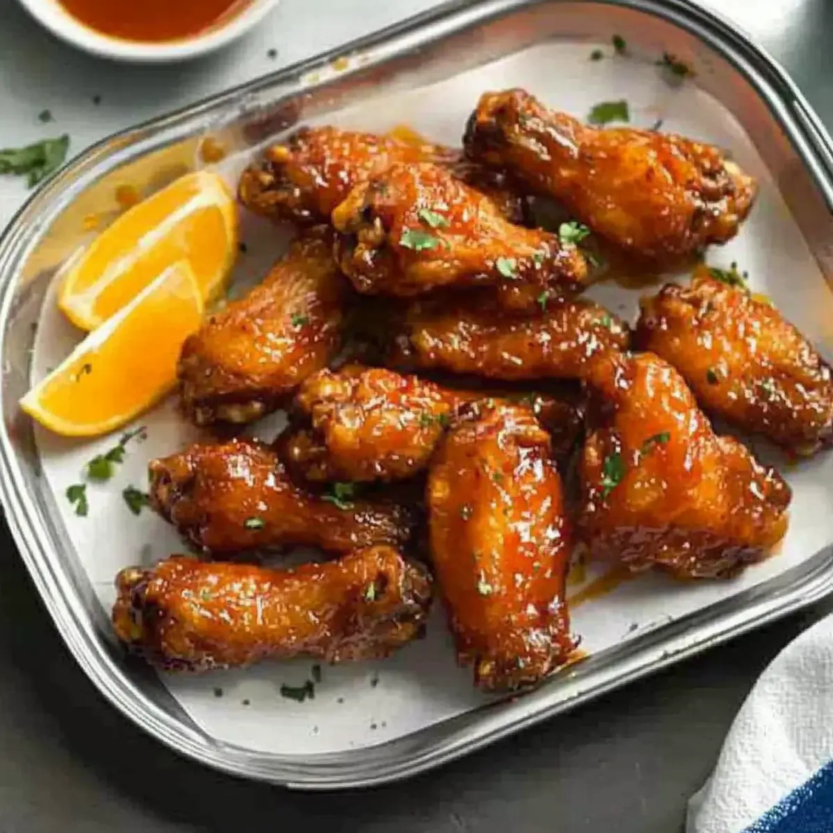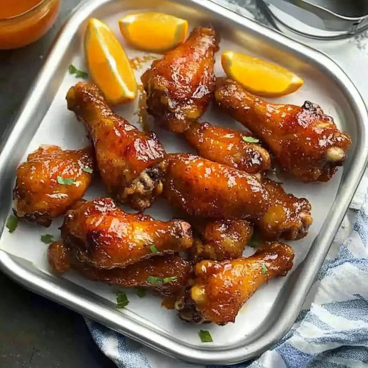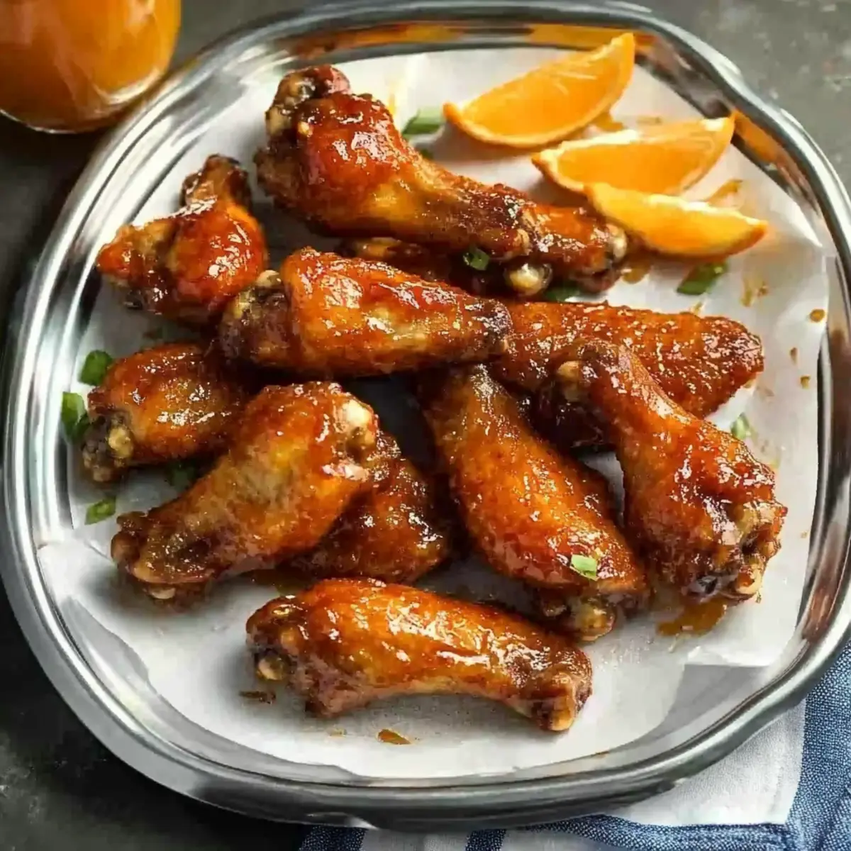 The air is filled with the tantalizing aroma of citrus and spice, igniting memories of lively gatherings filled with laughter and delicious bites. Today, I’m excited to share my go-to recipe for crispy Orange-Glazed Chicken Wings—perfectly golden and sticky, they’re an irresistible centerpiece for any get-together. With an easy preparation that suits both the oven and air fryer, you’ll be savoring these zesty wings in no time. Not only are they a crowd-pleaser, but they also come with delightful variations, allowing you to customize them with lemon if you’re after a new twist. Ready to elevate your weeknight dinners or game day snacks? Let’s dive into making these mouthwatering wings that will have everyone asking for seconds! Why Are These Chicken Wings So Special? Crispy Outside: Each wing is expertly coated to achieve a perfectly crunchy exterior that locks in juicy goodness. Flavor Explosion: The vibrant orange glaze is a delightful blend of sweetness and spice, tantalizing your taste buds with every bite. Versatile Cooking Methods: Whether you prefer air-frying for a quicker option or roasting for a more traditional approach, this recipe has you covered. Crowd-Pleasing Appeal: Perfect for game day or casual gatherings, these wings are sure to be a hit, much like my Crispy Fried Chicken Street Tacos. Easy Preparation: With minimal ingredients and straightforward instructions, you’ll have these wings ready faster than you can say “game on!” Transform your next meal with these zesty, flavorful wings that everyone will love! Orange Pepper Chicken Wings Ingredients Get ready to whip up some delicious Orange Pepper Chicken Wings with these essentials! For the Wings Chicken Wings – The star of the show; ensure they’re patted dry for maximum crispiness. Baking Powder – Key for achieving the ultimate crunchy skin. Salt – Essential for boosting flavor. Black Pepper – Adds warmth; fresh ground is best for a punchy kick. For the Glaze Unsalted Butter – Provides a rich base for your glaze; helps meld flavors beautifully. Honey – Offers a touch of sweetness and helps in caramelization. Crushed Red Pepper Flakes – Infuses the wings with spice; adjust according to your heat preference. Soy Sauce – Brings savory umami flavor; opt for low-sodium if desired. Orange Zest and Juice – Delivers that vibrant citrus taste; go ahead and substitute with lemon if you want a twist. For Serving Orange Wedges – Brightens up the dish as a garnish and adds a zesty touch on the side. Enjoy crafting these irresistible Orange Pepper Chicken Wings that are sure to be a hit at any gathering! Step‑by‑Step Instructions for Crispy Orange Pepper Chicken Wings Step 1: Prepare the Wings Begin by ensuring your chicken wings are patted dry to maximize crispiness. In a mixing bowl, combine baking powder, salt, and freshly ground black pepper, then toss the wings in the seasoning until evenly coated. For an extra-crispy texture, refrigerate the wings uncovered for up to 2 days, allowing the skin to dry out. Step 2: Roast the Wings Preheat your oven to 450ºF (232ºC) while you arrange a wire rack on top of a parchment-lined baking sheet, lightly sprayed with cooking spray. Place the seasoned wings on the rack in a single layer and roast them for about 40 to 50 minutes. Flip the wings halfway through to achieve a delightful golden brown color and ensure they cook evenly. Step 3: Air-Fry the Wings If you prefer cooking your wings faster, preheat your air fryer to 400ºF (200ºC). Spray the air fryer basket with cooking spray and arrange the wings in a single layer, ensuring they aren’t overcrowded. Air fry the wings for approximately 30 minutes, turning them halfway through to maintain crispiness and achieve that irresistible golden finish. Step 4: Make the Sauce While the wings are cooking, prepare the glaze by melting unsalted butter in a saucepan over medium heat. Add honey, crushed red pepper flakes, and soy sauce, stirring continuously. Allow the mixture to simmer for 2-3 minutes until it thickens slightly. Remove from heat and then mix in the aromatic orange zest and juice to create a deliciously tangy sauce for your Orange Pepper Chicken Wings. Step 5: Sauce the Wings Once the wings are cooked to perfection, transfer them to a large mixing bowl. Pour the tangy glaze over the crispy wings, tossing gently until all the wings are well-coated. For an appealing presentation, serve the wings on a platter garnished with fresh orange wedges, and drizzle any remaining sauce on top for an extra burst of flavor. Make Ahead Options These Crispy Orange-Glazed Chicken Wings are perfect for meal prep enthusiasts looking to save time on busy weeknights! You can prepare the wings by coating them with the baking powder, salt, and pepper mixture, and refrigerate them uncovered for up to 2 days. This drying process helps achieve an extra-crispy texture. Additionally, you can make the orange glaze in advance and store it in an airtight container for up to 3 days in the refrigerator. When you’re ready to serve, simply roast or air-fry the wings as directed and toss them in the prepared sauce right before serving, ensuring that every bite is just as delicious and fresh! Expert Tips for Crispy Orange Pepper Chicken Wings • Dry Wings: Ensure chicken wings are patted completely dry before seasoning; this step is crucial for achieving maximum crispiness in your orange pepper chicken wings. • Watch the Butter: When making the glaze, monitor the melted butter closely. It should go from melting to a light golden without burning to maintain a rich flavor. • Use a Wire Rack: Cooking the wings on a wire rack allows for even airflow around the wings, promoting a lovely brown, crispy texture. • Flavor Adjustments: Don’t hesitate to tweak the spice level of your glaze! Add more crushed red pepper flakes for heat or extra honey for sweetness—perfect for personalizing your dish. • Serving Style: For a