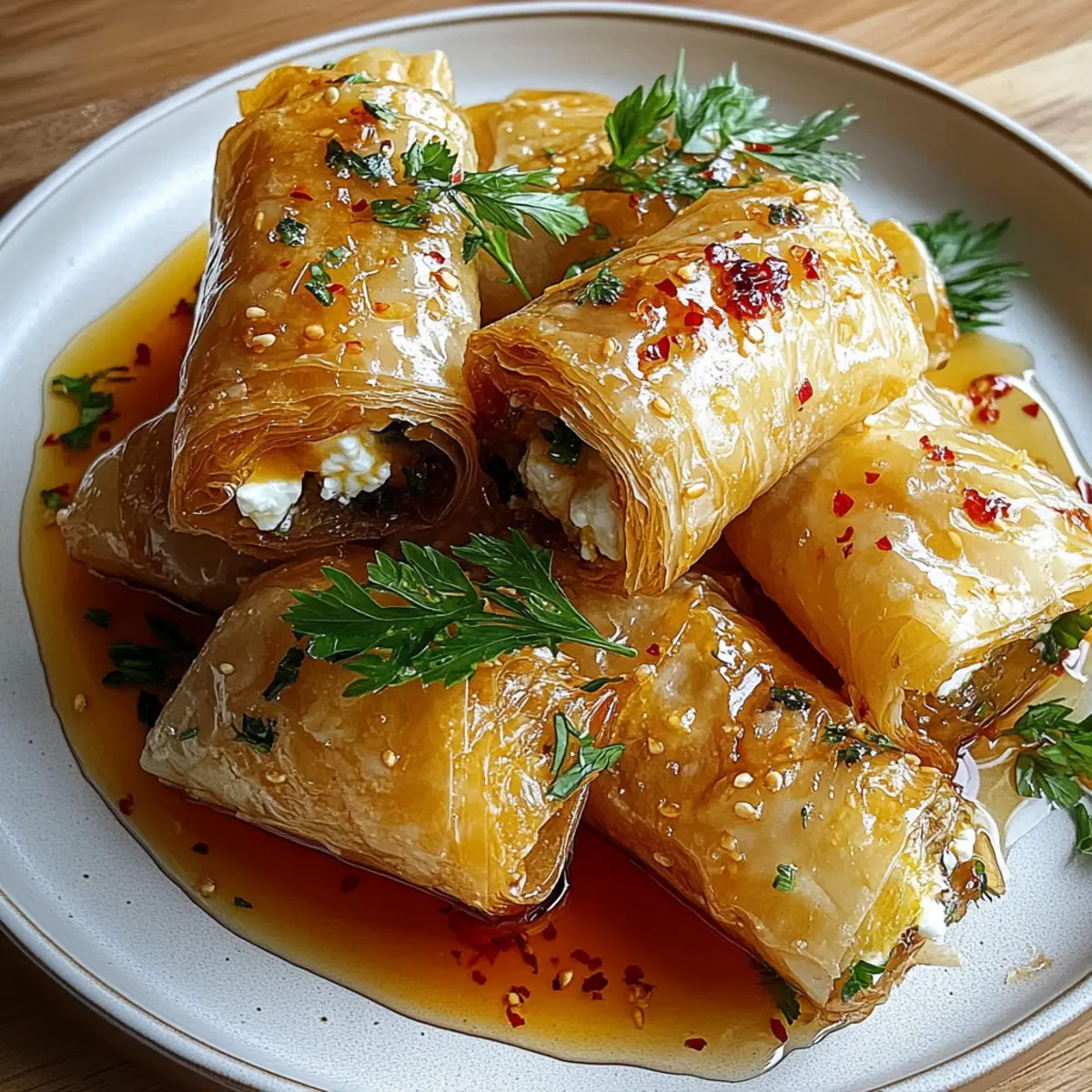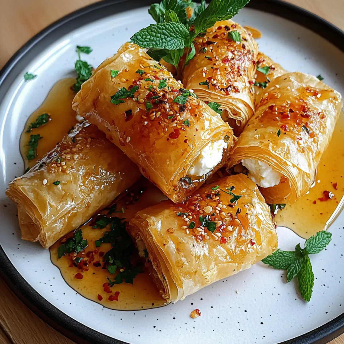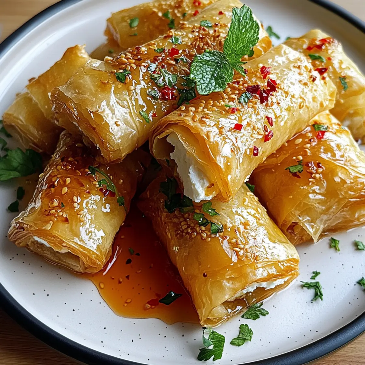 On a particularly chilly evening, I was rummaging through my fridge, looking for inspiration. That’s when I stumbled upon some phyllo dough and a chunk of creamy feta, begging to be paired. This magical combination turned into a culinary triumph: Oven Fried Feta Rolls with Chili Honey. These delightful rolls not only feature a crispy, golden exterior and a luscious, tangy filling but also bring a unique twist with a sweet kick of heat. Perfect for impressing guests at gatherings or for a cozy night in, they’re both easy to make and thankfully vegetarian. Just the thought of that savory blend, coupled with a drizzle of warm chili honey, is enough to make anyone stop in their tracks. Are you ready to create your own mouthwatering masterpiece? Let’s dive in! Why Are These Rolls So Irresistible? Irresistible Combination: The contrast of crispy phyllo and creamy feta offers a delightful bite that’s hard to resist. Easy Preparation: With simple steps and readily available ingredients, you can whip these up without hassle, perfect for any cooking level! Versatile Flavors: Feel free to customize by using honey cookies or switching the cheese for halloumi or goat cheese to suit your taste. Crowd-Pleasing Appeal: Whether for a family gathering or a potluck, these oven-fried feta rolls win over everyone with their unique flavors, making them the ultimate appetizer. Quick Cooking Time: In just 30 minutes, you can serve a gourmet appetizer that looks and tastes fancy, without spending hours in the kitchen. Oven Fried Feta Rolls Ingredients For the Rolls • Phyllo Pastry – Provides a delicate, crispy exterior; consider using spring roll wrappers for a different texture. • Feta Cheese – Gives a tangy, creamy filling; can be swapped for halloumi or goat cheese for varied flavors. • Fresh Dill – Adds a burst of fresh garden flavor; dried dill can substitute but use one-third less. • Fresh Mint – Increases aroma and freshness in the filling; opt for dried mint if fresh is unavailable, using less. • Lemon Zest – Brightens the dish, enhancing creaminess; substitute with fresh lemon juice if zest isn’t available. • Black Pepper – Provides subtle heat; freshly ground enhances flavor depth. • Olive Oil – Ensures phyllo crisps evenly for richness; canola oil can be used in a pinch. For the Chili Honey Drizzle • Honey – The base for the sweet drizzle; maple syrup can serve as a flavorful alternative. • Chili Flakes – Adds a spicy kick; reduce the amount for a milder flavor. • Lemon Juice – Balances the sweetness of honey, enhancing acidity for a well-rounded flavor. Step‑by‑Step Instructions for Oven Fried Feta Rolls with Chili Honey Step 1: Preheat the Oven Begin by preheating your oven to 375°F (190°C). As it warms up, take a moment to line a baking sheet with parchment paper to prevent any sticking. This will create the perfect base for your Oven Fried Feta Rolls, allowing them to crisp beautifully without any mess. Step 2: Prepare the Filling In a mixing bowl, combine the crumbled feta cheese, fresh dill, mint, lemon zest, and black pepper. Use a fork to blend these ingredients well until thoroughly mixed, creating a creamy and flavorful filling. This delicious combination will elevate the taste of your rolls and set the stage for the perfect savory bite. Step 3: Layer the Phyllo Pastry Lay one sheet of phyllo pastry on a clean, flat surface. Brush it lightly with olive oil, and then stack a second sheet on top, brushing it again with oil. This layering will create a flaky, crispy texture you’ll love in your Oven Fried Feta Rolls. Remember, the oil is key to achieving that golden finish! Step 4: Cut the Phyllo Using a sharp knife, cut the layered phyllo into four equal strips lengthwise. Ensure your cuts are clean as this will help in rolling the pastry neatly. This simple step lays out the foundation for filling each strip with the creamy feta mixture, leading to the mouthwatering anticipation of the rolls. Step 5: Fill and Roll Take about 1 tablespoon of the feta filling and place it at one end of each strip. Gently fold the sides in, then roll the phyllo tightly to enclose the filling. Continue this process for each strip, ensuring each roll is tightly sealed to avoid bursting during baking. This hands-on part is incredibly satisfying and brings your Oven Fried Feta Rolls to life. Step 6: Arrange on Baking Sheet Position the filled rolls seam-side down on the prepared baking sheet. Make sure to place them with a little space between each roll, allowing hot air to circulate for even cooking. Brush the tops with any remaining olive oil to enhance the browning, promising a crispy exterior that beckons with flavor. Step 7: Bake to Perfection Place the baking sheet in the preheated oven and bake for 18 to 20 minutes. Keep an eye on them as they cook; you’ll know they’re done when they turn golden brown and crispy. The delightful aroma of the baking Oven Fried Feta Rolls will fill your kitchen, setting the mood for a delicious treat! Step 8: Make the Chili Honey Drizzle While the rolls bake, prepare the chili honey drizzle. In a small saucepan, combine honey, chili flakes, and lemon juice. Heat this mixture over low heat until it becomes runny, stirring occasionally. This sweet and spicy drizzle will complement your rolls perfectly, adding a touch of heat with every bite. Step 9: Serve and Enjoy Once the rolls are golden and crispy, remove them from the oven and let them cool slightly. Drizzle the warm chili honey over the Oven Fried Feta Rolls or serve it in a small bowl for dipping. This elegant touch elevates your appetizer, making it a delectable choice for gatherings or cozy evenings at home. Expert Tips for Oven Fried Feta Rolls Gentle Handling: Phyllo can tear easily. Be gentle when layering and rolling, using overlapping pieces if necessary to avoid breaks. Sealing Technique: Ensure that each roll is tightly sealed to prevent them from unrolli