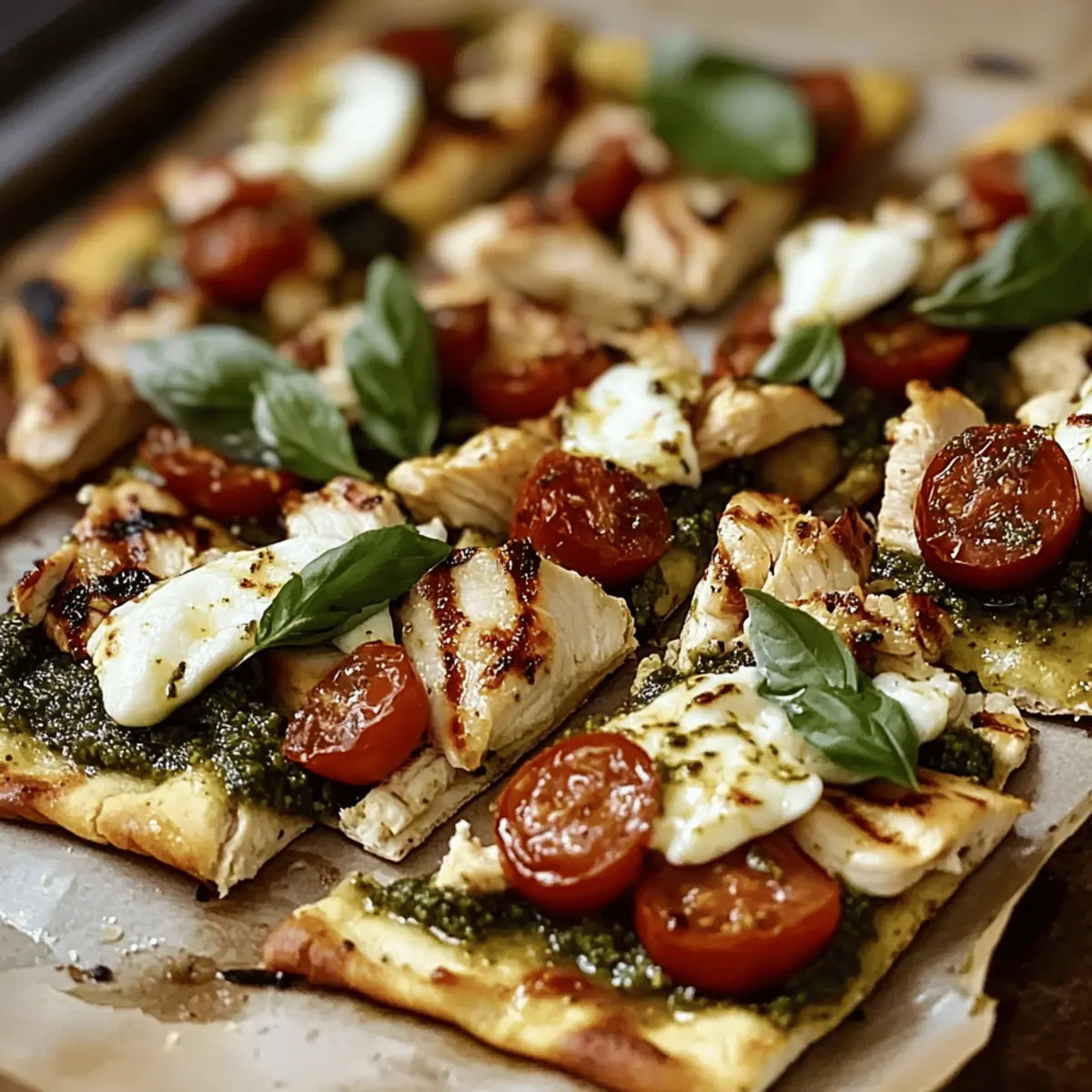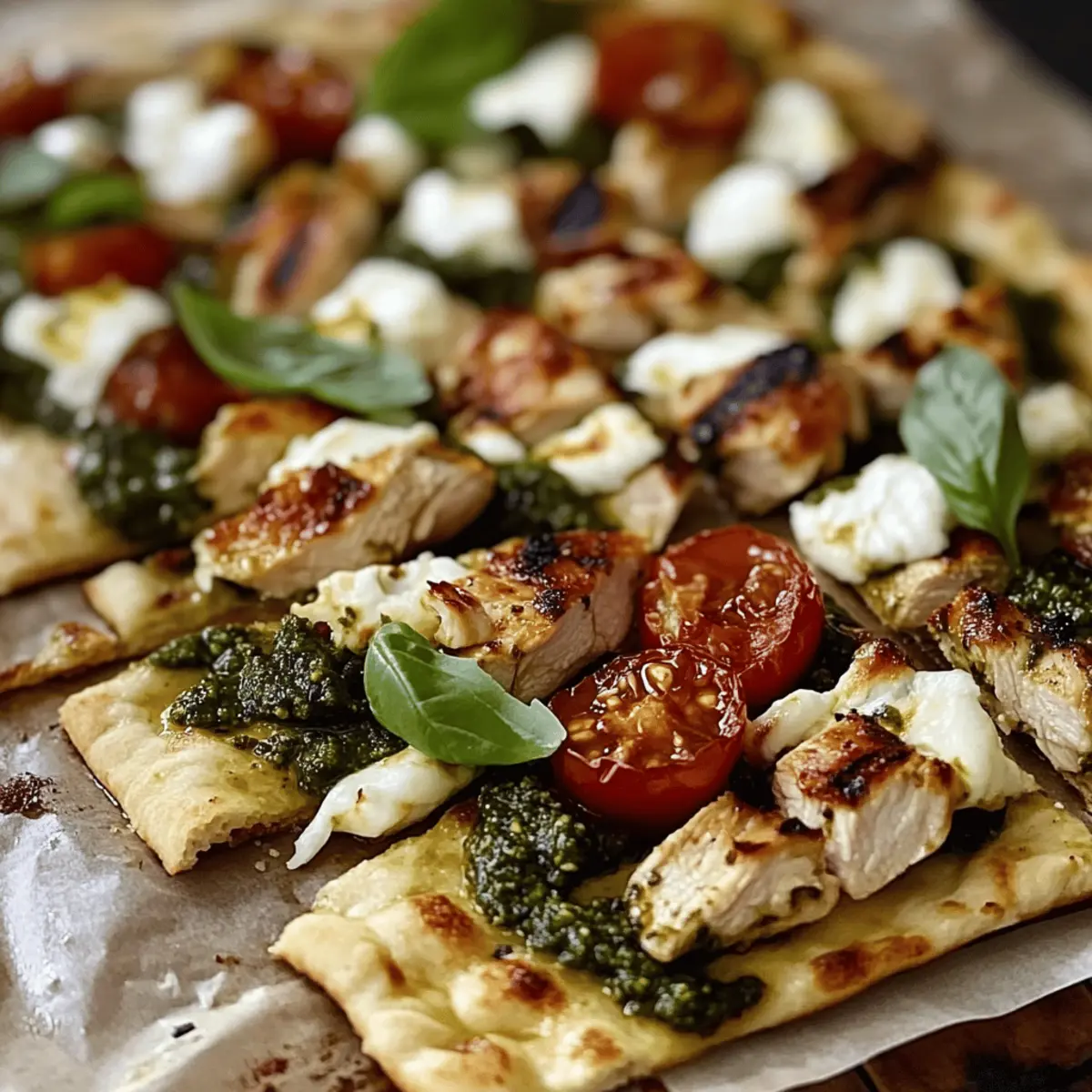Quick and Easy: This recipe is designed for busy nights with minimal prep and cook time. Flavor Explosion: Fresh basil pesto combined with chicken creates a mouthwatering, savory delight. Versatile Base: Use any flatbread type you like—homemade or store-bought—to suit your pantry. Crowd-Pleasing Dish: Ideal for family dinners or casual gatherings, everyone will love it! Healthful Ingredients: Packed with protein and vibrant veggies, this flatbread makes eating well a breeze. Pair it with a fresh side salad or vegetable crudités for a complete meal experience!