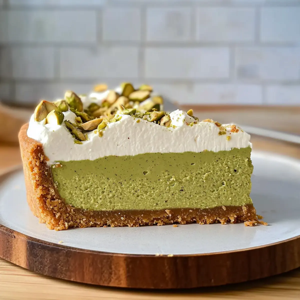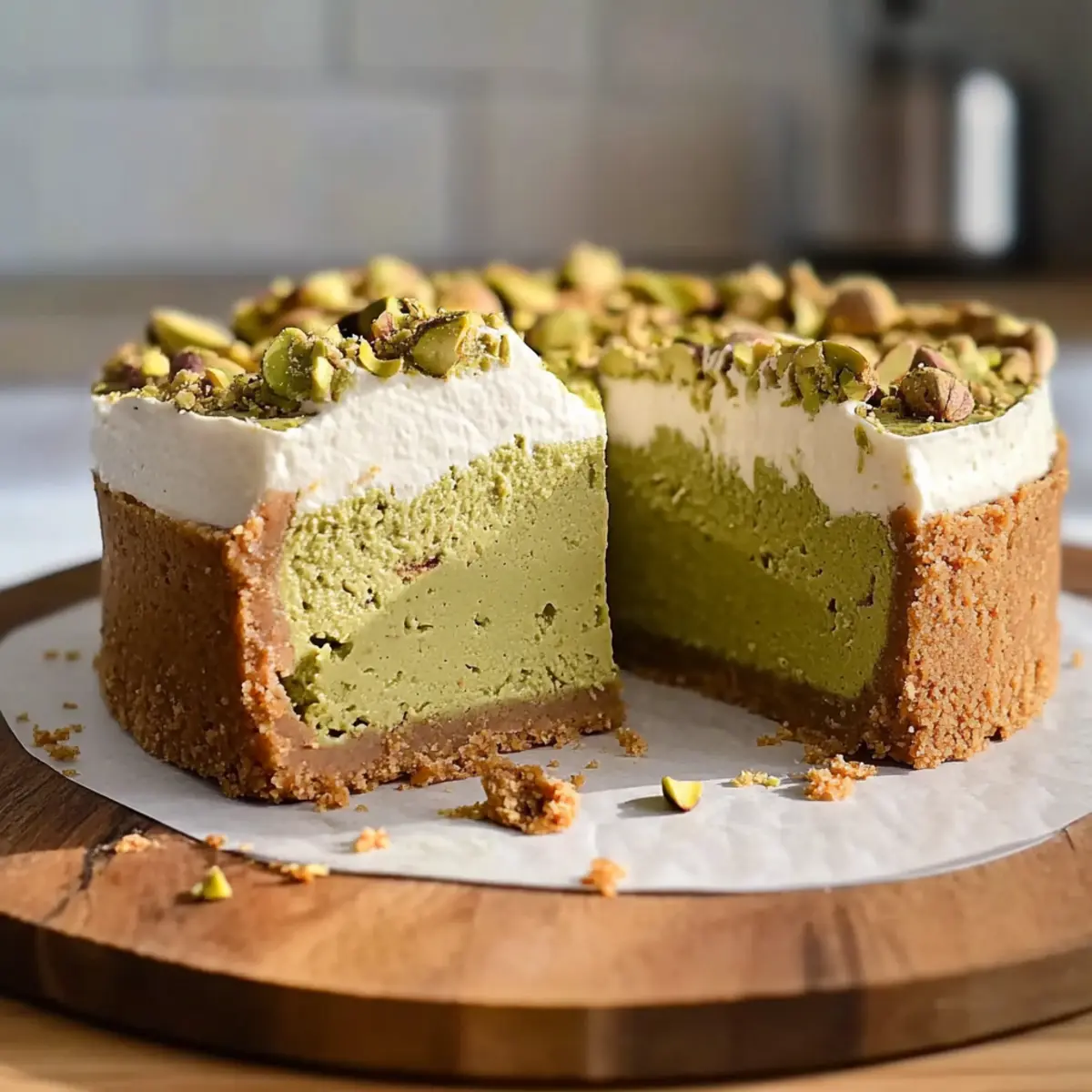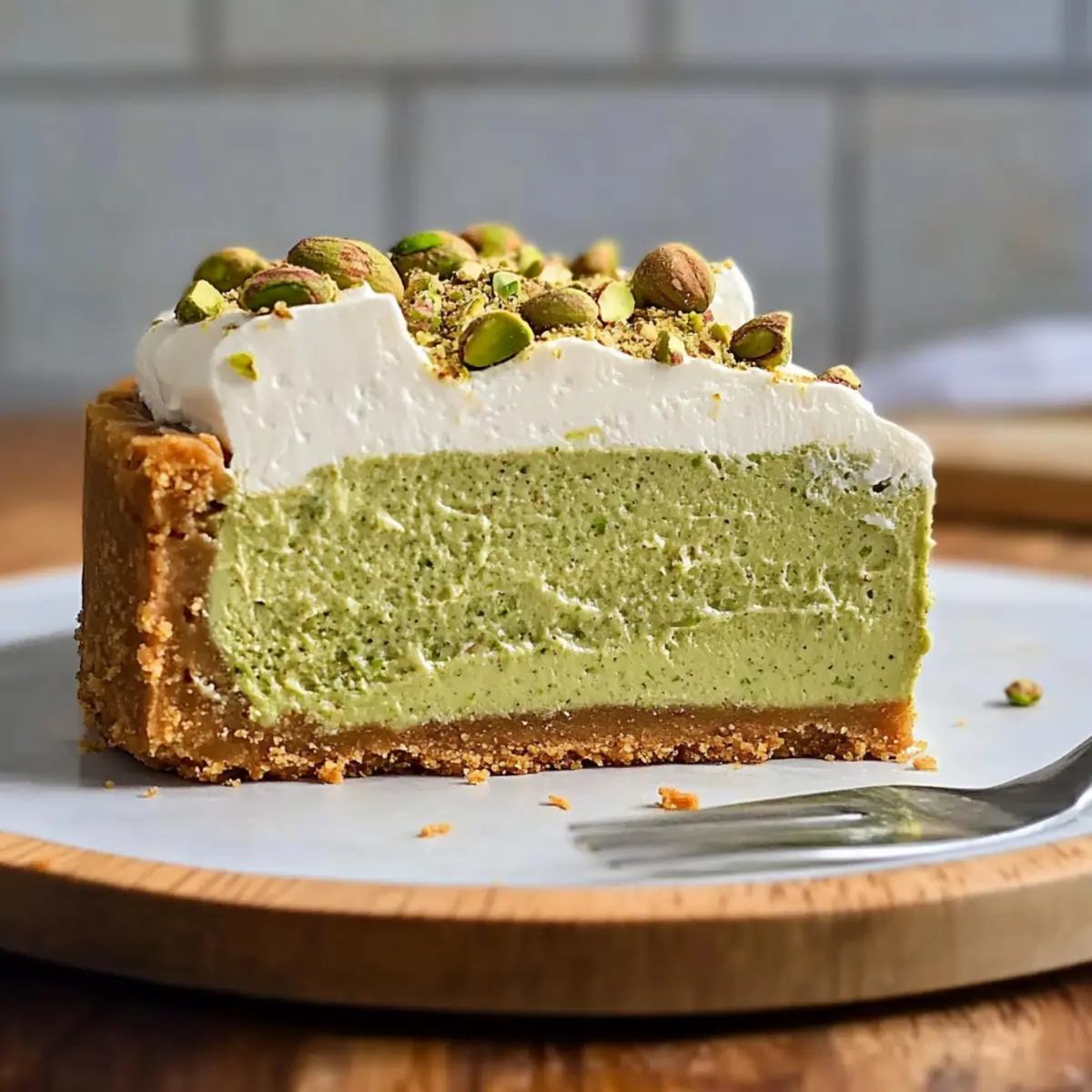 Stepping into my kitchen, I was greeted by the enticing scent of toasted pistachios, evoking memories of sun-soaked days spent under the Mediterranean sun. This Creamy Pistachio Cheesecake is my latest obsession and a true showstopper for any occasion. Not only is it quick to whip up, but it also elevates the dessert game with its rich, nutty flavor that leaves everyone wanting more. With a deliciously creamy texture and a delightful homemade nut butter twist, this cheesecake strikes the perfect balance between indulgence and simplicity. Whether you’re hosting a festive gathering or simply celebrating a quiet moment at home, this recipe promises to transform any day into a special occasion. Are you ready to treat yourself and your loved ones to this creamy delight? Let’s dive in! Why is this cheesecake unforgettable? Indulgent flavors abound: This creamy pistachio cheesecake beautifully blends rich cream cheese with nutty homemade pistachio butter, ensuring a luxurious dessert that tantalizes your taste buds. Crowd-pleaser: It’s the perfect centerpiece for any celebration, from dinner parties to casual gatherings, leaving your guests in awe. Simple process: With straightforward steps, even novice bakers can achieve impressive results. Just mix, bake, and chill! Elevated presentation: Its lush green hue and elegant height make it visually stunning—perfect for Instagram moments. For more delightful cheesecake options, don’t miss my take on Carrot Cake Cheesecake or the refreshing Peach Cobbler Cheesecake. You’ll be inspired to whip up a variety of delicious flavors! Creamy Pistachio Cheesecake Ingredients • Discover the delightful ingredients for a creamy dream! For the Crust 300g cookie crumbs – Use graham crackers or digestive cookies for a delicious base. 113g (1/2 cup) unsalted butter, melted – Binds the crust and gives it richness; coconut oil offers a dairy-free option. Pinch fine sea salt – Enhances the flavor of the crust beautifully. 1 tablespoon powdered sugar – Adds just the right touch of sweetness. For the Filling 453g cream cheese – At room temperature for smoothness and richness, mascarpone can create a different flavor. 200g (1 cup) granulated sugar – The perfect amount of sweetness to balance the creaminess. ½ teaspoon fine sea salt – Balances sweetness and enhances the overall flavor profile. 2 teaspoons pure vanilla extract – Introduces an aromatic depth that elevates the cheesecake. 200g (scant cup) pistachio butter – The primary flavor agent that infuses the filling with nutty goodness; homemade is best! 240g (1 cup) sour cream – Adds a creamy texture and slight tang; Greek yogurt can be a lighter alternative. 2 large eggs – Essential for stability and richness; consider using 3 small eggs for a lighter texture. Zest of 1 lemon (optional) – Brightens the cheesecake’s flavor profile if you desire a citrus note. With these ingredients at hand, you’re on your way to creating a stunning Creamy Pistachio Cheesecake that will impress friends and family alike! Step‑by‑Step Instructions for Creamy Pistachio Cheesecake Step 1: Prepare the Crust In a food processor, combine 300g of cookie crumbs, 113g of melted unsalted butter, a pinch of fine sea salt, and 1 tablespoon of powdered sugar. Pulse until the mixture is fully moistened and resembles wet sand. Transfer the crust mixture into an 8-inch cake pan lined with parchment paper, pressing it firmly into the bottom and up the sides. Bake at 350°F (175°C) for 10 minutes until lightly golden, then chill to set. Step 2: Prepare the Filling Lower the oven temperature to 325°F (160°C) while you prepare the pistachio filling. Blend 453g of softened cream cheese, 200g of granulated sugar, and ½ teaspoon of fine sea salt in your food processor until smooth and free of lumps. Add 2 teaspoons of pure vanilla extract and blend again. Incorporate 200g of pistachio butter, followed by 240g of sour cream, blending until everything is well combined. Step 3: Incorporate the Eggs To finish the filling for your creamy pistachio cheesecake, add 2 large eggs to the mixture. Pulse gently until just incorporated, being careful not to overmix, as this can affect the cheesecake’s texture. If desired, add the zest of 1 lemon for a bright note, pulsing briefly to combine. Set aside the filling while you prepare for baking. Step 4: Bake the Cheesecake Pour the creamy filling into your chilled crust. To create a moist baking environment, place your cake pan inside a larger pan filled halfway with water. Bake for approximately 50 minutes, or until the edges are set but the center remains slightly jiggly—this ensures a creamy texture. Keep an eye on the cheesecake to avoid overbaking. Step 5: Cool and Chill After baking, turn off the oven and crack the door open to let the cheesecake cool for 30 minutes. This gradual cooling helps prevent cracks. Once cool, transfer the cheesecake to the counter to cool completely before refrigerating. Chill for at least 8 hours, allowing the flavors to meld and the texture to firm up for the perfect creamy pistachio cheesecake. How to Store and Freeze Creamy Pistachio Cheesecake Fridge: Store your creamy pistachio cheesecake in an airtight container for up to 1 week. Make sure it’s well covered to prevent it from drying out or absorbing other odors in the fridge. Freezer: You can freeze your cheesecake for up to 3 months. Wrap it tightly in plastic wrap followed by aluminum foil to protect it from freezer burn. Thaw it in the refrigerator overnight when ready to enjoy. Serving: For the best texture, bring your cheesecake back to room temperature before serving. You can indulge in that luxurious creamy flavor just as it was intended! What to Serve with Creamy Pistachio Cheesecake? Create a delightful spread that perfectly complements the nutty richness of this creamy dessert. Whipped Cream: A dollop of fresh whipped cream adds lightness, boosting the cheesecake’s l