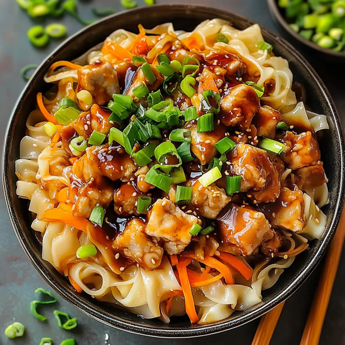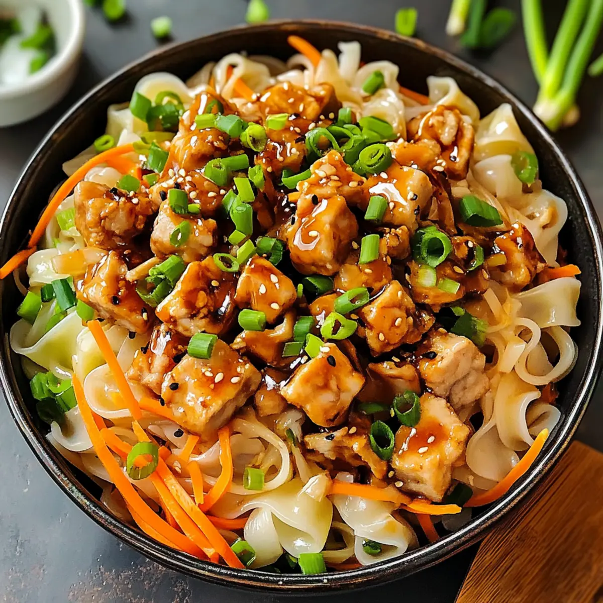As I sat down to enjoy a meal that felt like a comforting hug, I couldn’t help but smile at the twist I had put on a classic favorite: Potsticker In A Bowl. This dish brings together the heartiness of dumplings without the fuss of folding and pinching. In just under 30 minutes, you’ll create a delicious, easy dinner that boasts tender noodles, savory ground pork, and vibrant veggies all drizzled with a punchy sauce. The best part? It’s fully adaptable to cater to everyone at your table, whether they’re craving a vegetarian option or prefer a low-carb twist. Ready to experience this flavor-packed delight on busy weeknights? Dive in, and let’s make your new favorite meal! Why Will You Love Potsticker In A Bowl? Easy preparation: This dish comes together in under 30 minutes, perfect for busy weeknights when time is of the essence. Customizable options: With the ability to swap proteins and noodle types, you can easily cater to dietary preferences, whether it’s vegetarian, low-carb, or something hearty! Bold flavors: The combination of ginger, garlic, and savory sauces creates a punchy taste that’s sure to impress even the pickiest eaters. Comforting goodness: Enjoy the hearty textures of tender noodles and crunchy vegetables, offering a delightful contrast that makes every bite satisfying. Family-friendly appeal: Potsticker In A Bowl is a crowd-pleaser, reminiscent of fun dumplings but presented in a quick and easy format everyone can enjoy. If you love the flavors of this recipe, you might also enjoy our Chicken Rice Bowls or a refreshing Mediterranean Salmon Bowl alongside! Potsticker In A Bowl Ingredients • The perfect blend for a delicious, cozy meal! For the Base Ground Pork – Provides protein and savory flavor; substitute with ground chicken for a lighter option. Rice Noodles or Lo Mein Noodles – Serves as the hearty base; alternative options include ramen noodles or zucchini noodles for a low-carb twist. For the Sauce Soy Sauce – Adds saltiness and umami; opt for low-sodium soy sauce for a healthier choice. Hoisin Sauce – Offers sweetness and a hint of spiciness; can be replaced with a mix of soy sauce and honey if desired. Rice Vinegar – Cuts through richness with acidity; white vinegar or lemon juice can work as substitutes. Sesame Oil – Adds depth and richness; olive oil can be used for a milder flavor. For the Aromatics Minced Garlic – Enhances flavor with a pungent aroma; fresh garlic is preferred, but garlic powder can be a quick substitute. Fresh Grated Ginger – Offers a warm spice note; ground ginger can be used in a pinch, but will have less intensity. Sriracha/Chili Paste – Delivers heat; adjust based on your spice preference and omit for a milder dish. For the Vegetables Shredded Cabbage or Coleslaw Mix – Provides crunch and nutrition; any leafy greens like bok choy or kale can be great alternatives. Shredded Carrots – Incorporates sweetness and color; consider using zucchini or bell peppers for variety. Green Onions – Finishes the dish with freshness; shallots or chives can serve as great substitutes. Step‑by‑Step Instructions for Potsticker In A Bowl Step 1: Cook Noodles Begin by cooking the rice or lo mein noodles according to package instructions, usually boiling for about 4-6 minutes until al dente. Once cooked, drain the noodles well, and set them aside in a bowl, as they will soon become a comforting base for your Potsticker In A Bowl. Step 2: Cook Pork In a large skillet, heat 1 tablespoon of sesame oil over medium-high heat. Add the ground pork and cook for about 5-7 minutes, breaking it apart with a spatula until it’s fully browned and cooked through. Use a slotted spoon to transfer the pork to a plate, leaving any excess fat in the skillet. Step 3: Integrate Aromatics and Sauce To the same skillet, add more sesame oil if needed, then stir in 3 cloves of minced garlic and a tablespoon of fresh grated ginger. Sauté for about 1-2 minutes until fragrant, then add ¼ cup of soy sauce, 2 tablespoons of hoisin sauce (if using), 1 tablespoon of rice vinegar, and a splash of sriracha. Cook for another 2-3 minutes to allow the sauce to thicken slightly. Step 4: Add Vegetables Toss in 2 cups of shredded cabbage and 1 cup of shredded carrots to the skillet, stirring well. Sauté the mixture for approximately 3-4 minutes until the vegetables are tender but still crisp, flashing bright colors in the skillet. Finally, stir in a handful of chopped green onions for that fresh, crisp finish. Step 5: Combine Carefully add the cooked noodles back into the skillet, turning everything together gently. Toss for about 1-2 minutes to ensure that every noodle is coated with the delicious sauce and mixed with the savory pork and vibrant vegetables, creating a warm and inviting Potsticker In A Bowl. Step 6: Garnish and Serve To elevate your dish, sprinkle some sesame seeds and extra green onions on top just before serving. Dish out the Potsticker In A Bowl while it’s hot, and enjoy this hearty, comforting meal that’s reminiscent of traditional potstickers but is simpler and quicker to prepare. Potsticker In A Bowl Variations Feel free to get creative with this recipe, turning it into a delightful meal that meets your unique cravings! Vegetarian: Use crumbled tofu or tempeh instead of ground pork for a hearty vegetarian option. This substitution allows you to enjoy the same comforting textures while still savoring bold flavors. Low-Carb: Swap rice noodles for zucchini noodles (zoodles) or spaghetti squash to keep it light and fresh. Your dish will retain its delightful essence while offering a healthier twist. Different Proteins: Try ground chicken, turkey, or even beef for diverse protein profiles. Each option brings its own distinct flavor and adds a unique spin to your Potsticker in a Bowl experience. Flavor Boosts: Add a splash of sesame oil or chili oil for an extra punch of flavor. The added richness or heat will elevate your dish and