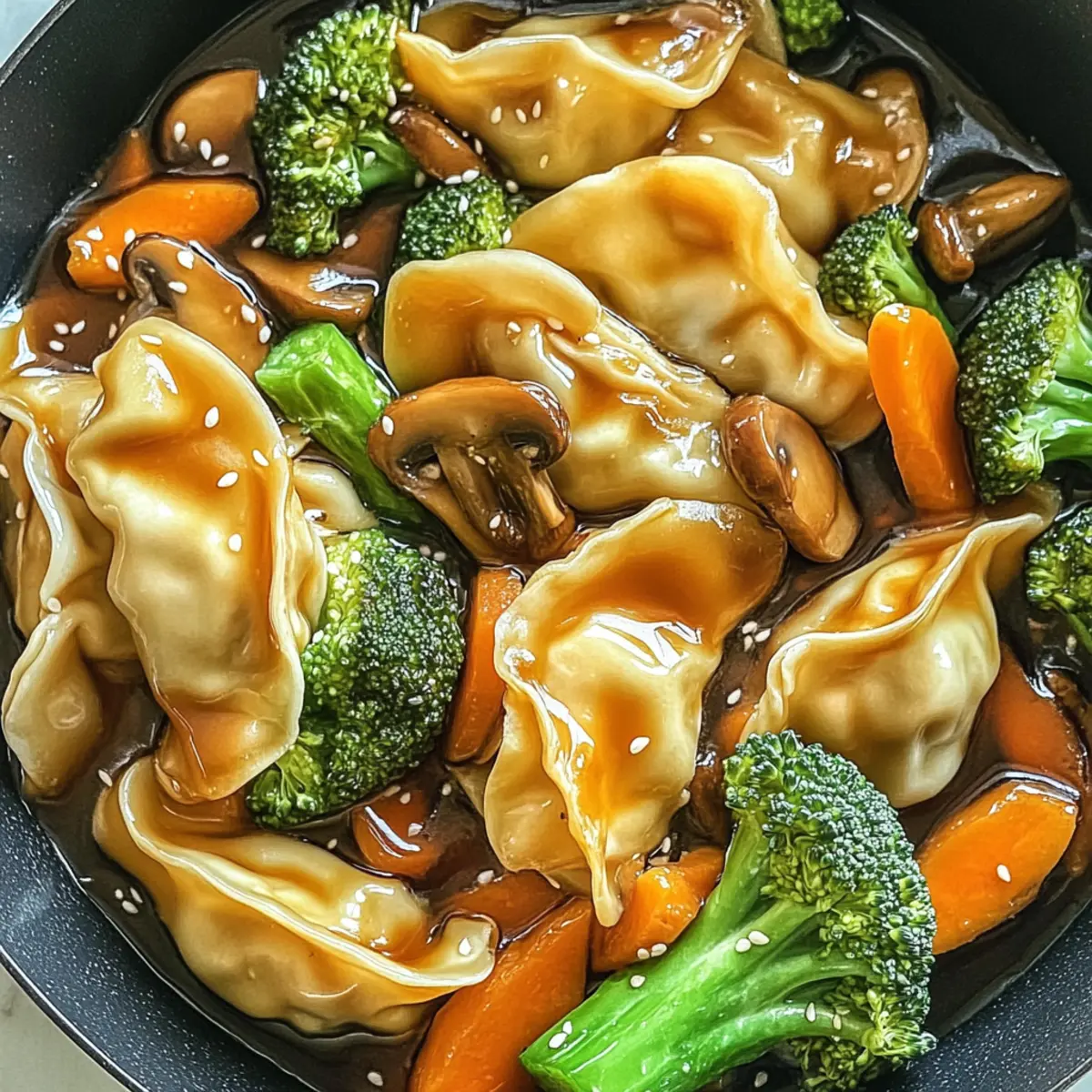 5. Return the cooked potstickers to the skillet with sautéed vegetables. Drizzle the sauce over the mix and gently stir for 2–3 minutes to thicken and coat all ingredients.