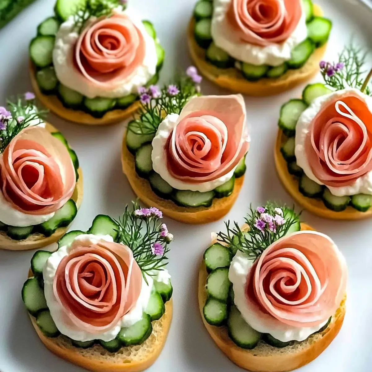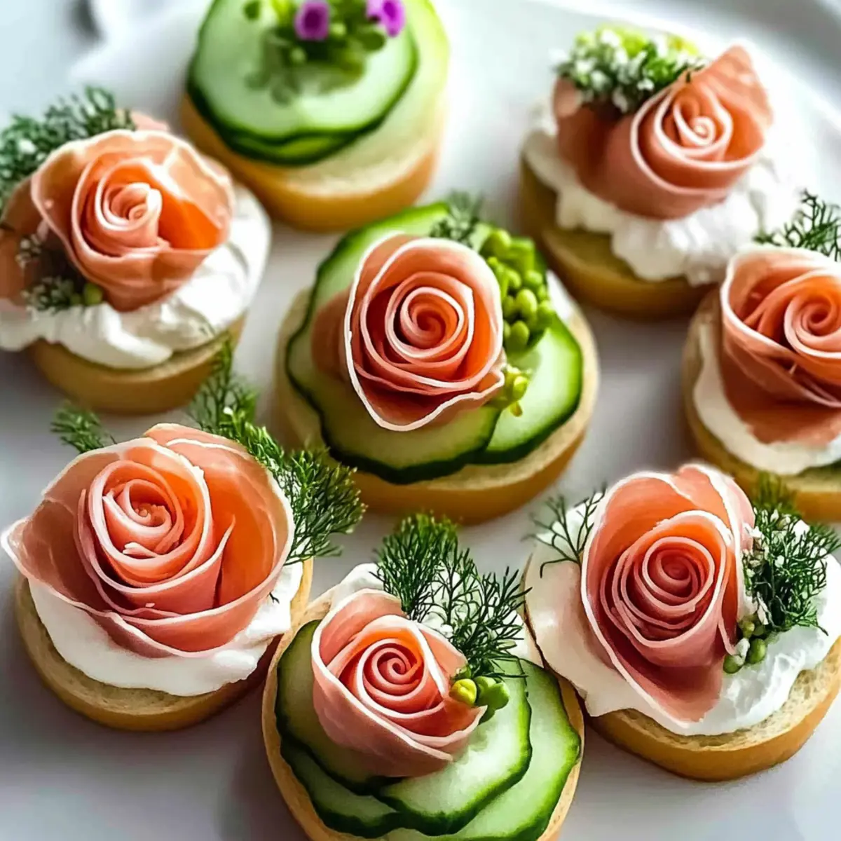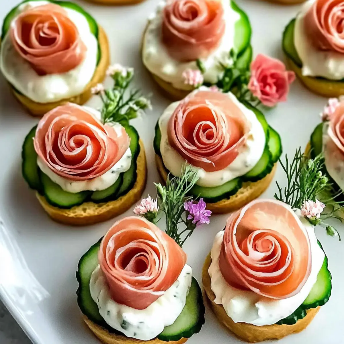 Begin by gathering all your ingredients for the Prosciutto Rose Appetizers. Ensure that the cream cheese is at room temperature for easy blending. Slice the cucumber into thin rounds (about 1/8 inch) using a sharp knife, and have the fresh herbs, capers, and any additional toppings ready to go. This initial setup will make your assembly process smooth and enjoyable.