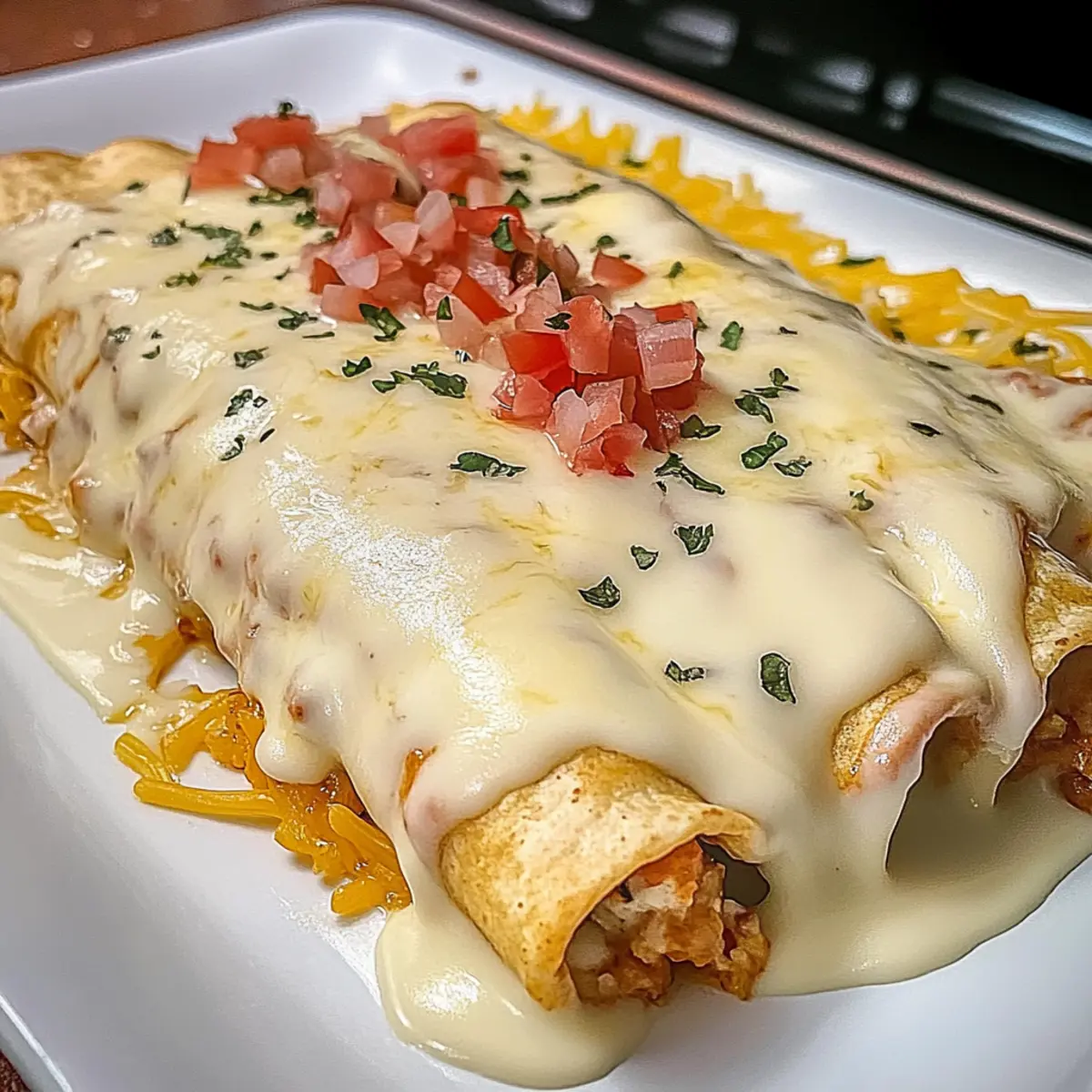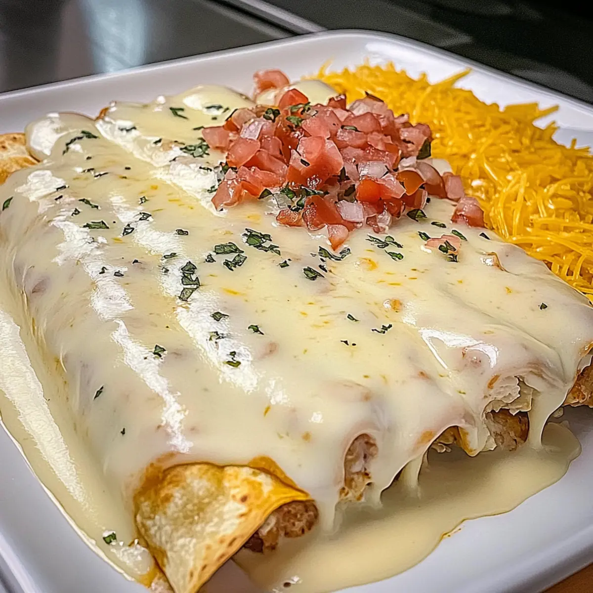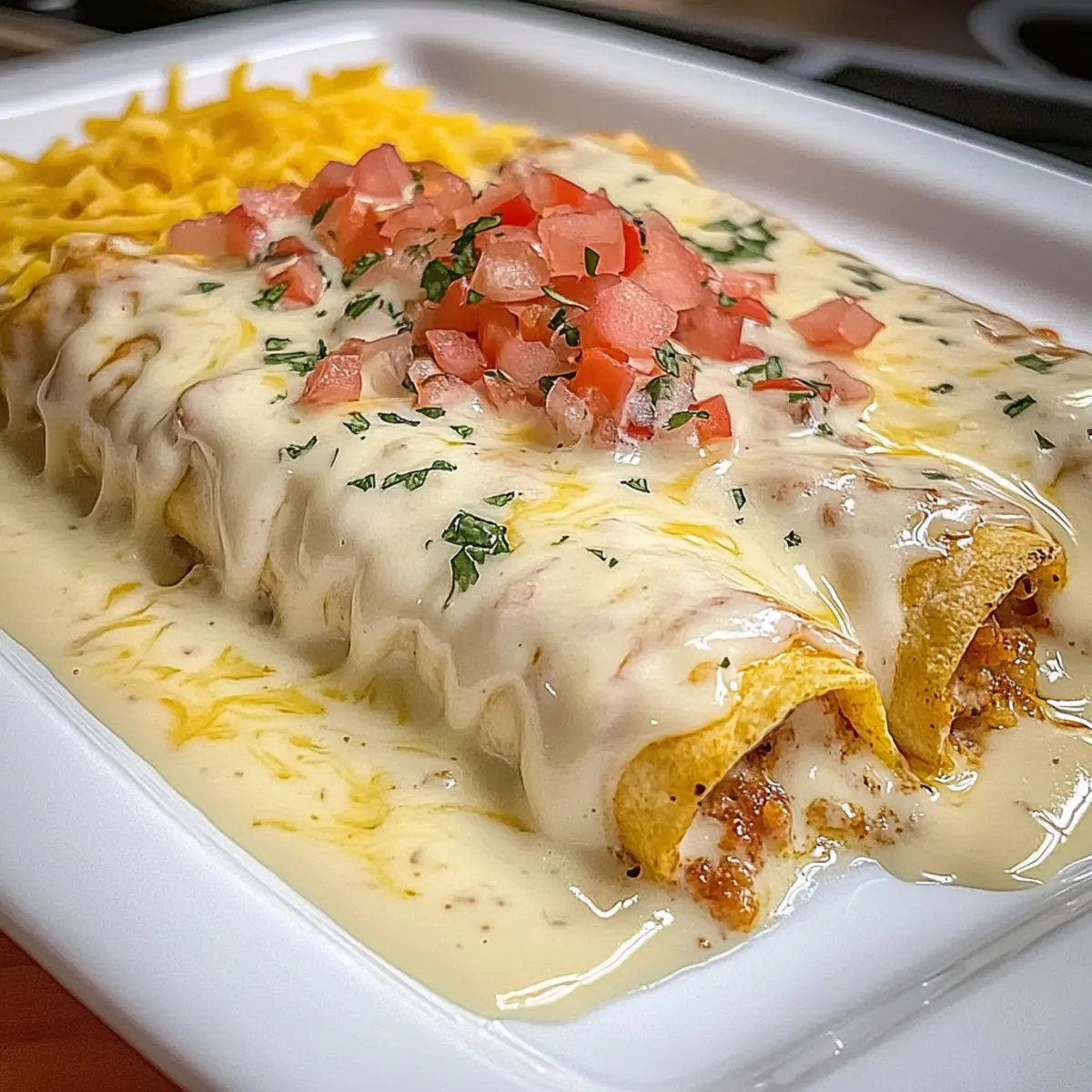 Amid the chaos of a busy weeknight, you might find yourself longing for a comforting meal that doesn’t require hours in the kitchen. Enter my Quick and Cheesy Queso Chicken Enchiladas—a delightful dish that perfectly marries creamy goodness with effortless prep! In just 30 minutes, you’ll have a plateful of vibrant flavors that the whole family will adore, making it a fantastic alternative to takeout. Not only are these enchiladas customizable to fit any taste, but they also promise to transform your approach to dinner with gluten-free options available. Are you ready to whip up a dish that’s as fun to make as it is to eat? Let’s dive into this cheesy adventure together! Why Are Queso Chicken Enchiladas Amazing? Quick Prep: In just 30 minutes, you can have a tasty meal on the table, perfect for busy weeknights! Customization Galore: Tailor your filling with options like black beans or extra veggies for added nutrition. Crowd-Pleaser: These enchiladas unite family members with their creamy, cheesy flavor, ensuring everyone will ask for seconds. Gluten-Free Choice: Easily adapt the base with corn tortillas, making it a go-to for guests with dietary preferences. Whether you pair them with Spanish rice or chips and salsa, these Quick and Cheesy Queso Chicken Enchiladas are sure to become a family favorite! Queso Chicken Enchiladas Ingredients For the Enchiladas • Burrito Size Flour Tortillas – Essential base for enchiladas; corn tortillas can be used—just warm them first for easy rolling. • Shredded Chicken – Main protein for the filling; using rotisserie chicken speeds up your prep time. • Taco Seasoning – Provides a savory kick; make your own to control the spice level, or grab a store-bought mix. • Sour Cream – Adds creaminess to the filling; substitute Greek yogurt for a lighter option. For the Cheesy Sauce • Cheddar Cheese (shredded) – Contributes a sharp flavor; combining with Monterey Jack enhances creaminess. • Chopped Green Chilies – Provides mild heat; adjust based on your spice preference. • Diced Tomatoes with Green Chilies (undrained) – Keeps the filling moist and flavorful; don’t drain them for added taste. • Queso Blanco Velveeta – Melts beautifully for a creamy sauce; swapping it out may alter the sauce’s consistency. Feel free to let your creativity shine as you build your Queso Chicken Enchiladas with these delightful ingredients! Step‑by‑Step Instructions for Queso Chicken Enchiladas Step 1: Prepare the Filling In a large mixing bowl, combine the shredded chicken, taco seasoning, sour cream, and cheddar cheese. Stir in the chopped green chilies until everything is well incorporated and the mixture is creamy. This filling can be made in about 10 minutes, ensuring it’s ready before you start rolling the enchiladas. Step 2: Make the Queso Sauce In a medium saucepan, melt the Queso Blanco Velveeta with the undrained diced tomatoes over medium-high heat. Stir constantly for 5-7 minutes until the sauce becomes smooth and bubbly. This creamy sauce will act as the perfect topping for your queso chicken enchiladas, so keep an eye on it to prevent sticking. Step 3: Assemble the Enchiladas Preheat your oven to 350°F (175°C) while you assemble the enchiladas. Take a flour tortilla and spoon about ½ to ¾ cup of the chicken filling into the center. Roll the tortilla tightly and place it seam-side down in a greased baking dish. Repeat until all tortillas are filled, creating a delightful array of enchiladas that are ready for the oven. Step 4: Pour the Sauce Once all the enchiladas are in the baking dish, take the warm queso sauce and evenly pour it over the top. Make sure to cover each enchilada with the delicious sauce to ensure they stay moist during baking. This layer of cheesy goodness is what makes your queso chicken enchiladas extra special! Step 5: Bake Place the baking dish in the preheated oven and bake for 20-25 minutes. Keep an eye out for the cheese to become bubbly and slightly golden on the edges, indicating that your queso chicken enchiladas are perfectly cooked and ready to serve. Step 6: Serve Once baked, remove the enchiladas from the oven and let them cool for a few minutes. This resting time helps the sauce set slightly. Serve them hot alongside sides like Spanish rice or a fresh salad for a comforting meal that the whole family will love! Expert Tips for Queso Chicken Enchiladas • Tortilla Tricks: Make sure your tortillas are pliable. If using corn tortillas, warm them first to prevent cracking when rolling. • Filling Flexibility: Don’t hesitate to customize your filling! Add black beans or colorful veggies to boost nutrition and flavor without compromising deliciousness. • Cheese Consistency: For the perfect creamy queso sauce, stick with Velveeta. Using different cheeses can yield unexpected textures and flavors, so experiment cautiously! • Storage Savvy: Leftover Queso Chicken Enchiladas can be stored in an airtight container for up to 3 days. Perfect for quick reheats on busy days! • Freezer Friendly: Want to prepare ahead? Wrap baked enchiladas tightly and freeze them for up to 2 months—an effortless way to enjoy homemade comfort later! Make Ahead Options These Quick and Cheesy Queso Chicken Enchiladas are perfect for meal prep enthusiasts! You can prepare the filling and the queso sauce up to 24 hours in advance, simply refrigerating them in separate airtight containers. Just combine the shredded chicken, taco seasoning, sour cream, and cheese for the filling, and melt the Velveeta queso with diced tomatoes for the sauce. When you’re ready to enjoy your enchiladas, simply assemble them by rolling the filling in the tortillas, pouring the sauce over, and baking at 350°F (175°C) for 20-25 minutes until bubbly and golden. This strategy not only saves time but ensures your enchiladas remain just as delicious! What to Serve with Quick and Cheesy Queso Chicken Enchiladas Elevate your Queso C