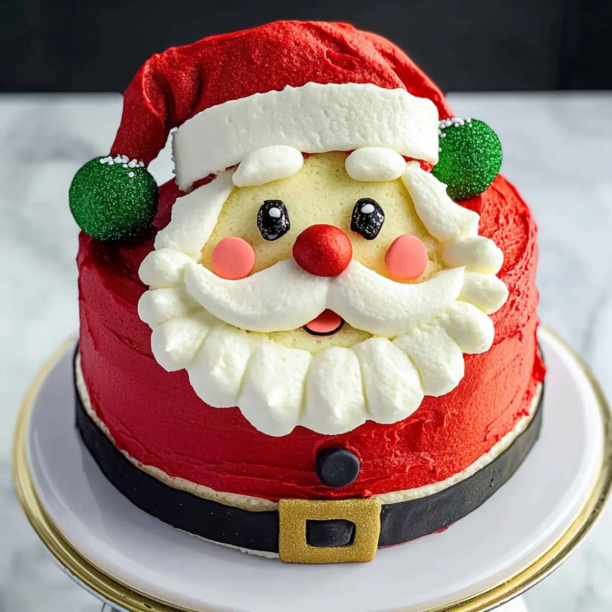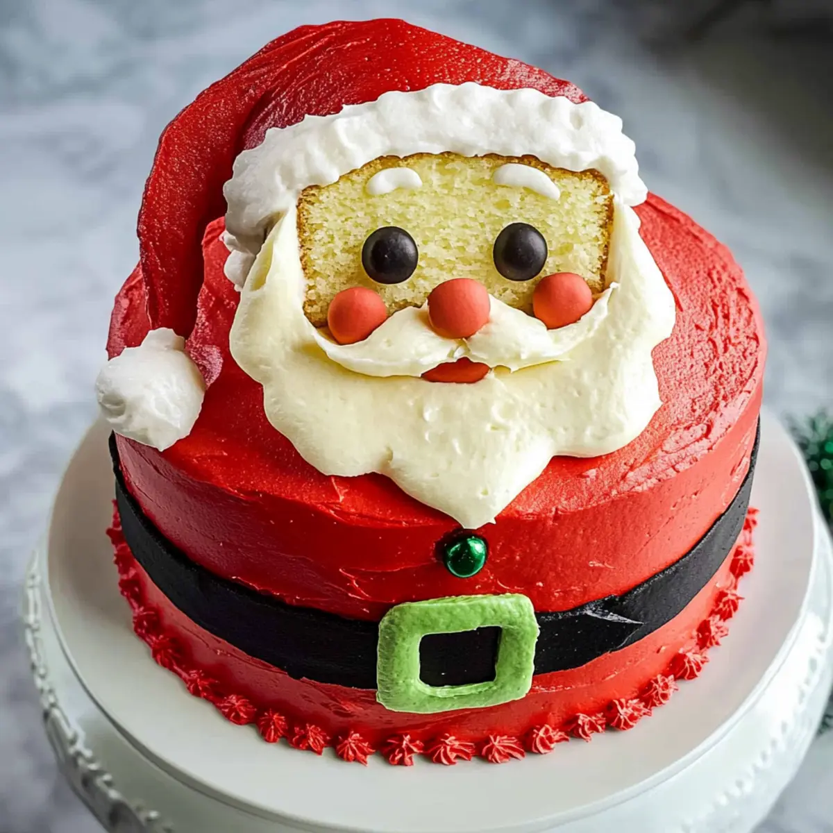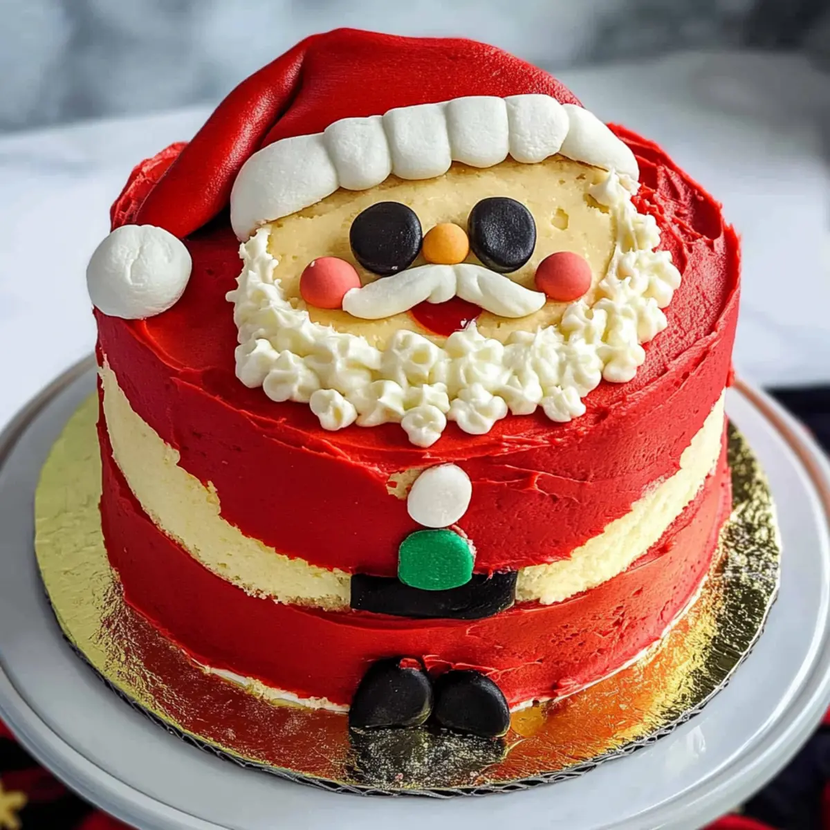 As I sifted through my pantry, I stumbled upon a bottle of almond extract that instantly transported me to childhood holiday gatherings filled with laughter and warmth. It’s amazing how one ingredient can unlock a treasure trove of memories, and that’s exactly what inspired me to create this delightful Festive Santa Cake. With its fluffy almond-flavored layers and playful buttercream decorations, this stunning cake is destined to be the centerpiece of your holiday celebrations. Not only is it a fun, show-stopping dessert that will have your guests oohing and aahing, but it can also be made ahead of time—perfect for those busy holiday schedules! Are you ready to dive into the festive spirit and create a cake that will spread joy and sweetness in every slice? Why Is This Santa Cake Special? Festive Charm: This cake brings holiday cheer to your table, offering a delightful twist on traditional flavors with its almond essence. Easy Assembly: With simple steps to follow, even novice bakers can create this showstopper effortlessly. Crowd Favorite: Its striking design and rich taste make it perfect for holiday parties or family gatherings, sure to impress your guests. Make-Ahead Convenience: Prepare layers in advance, freeing up time on the big day—great for stress-free celebrations! Customizable Options: Feel free to swap flavors or colors to match your theme. Check out our other festive recipes like Tres Leches Cake or Coconut Cake Cheese for more inspiration! Santa Cake Ingredients • Prepare to bake a festive delight! For the Cake Layers All-Purpose Flour – Provides structure and stability in the cake layers. Substitution: Can use gluten-free all-purpose flour for a gluten-free version. Granulated Sugar – Adds sweetness and moisture. Prep Note: Granulated sugar helps achieve a fine crumb. Baking Powder – Acts as a leavening agent for fluffy texture. Ensure it’s fresh for maximum rise. Fine Salt – Balances sweetness and enhances flavor. Do not omit for flavor balance. Unsalted Butter – Adds richness and moisture. Substitution: Can use margarine for a dairy-free option. Egg Whites – Provide structure without heavy yolk flavor. Substitution: Aquafaba (chickpea water) can be used for a vegan cake. Sour Cream – Adds moisture and tenderness to the cake. Vegetable or Canola Oil – Enhances moisture and softness. Almond Extract – Defines the flavor profile for the cake. Substitution: Vanilla extract can be used as a substitute. For the Buttercream Frosting Powdered Sugar – Delivers sweetness and the right texture for the frosting. Use fresh for best results. Heavy Whipping Cream – Enhances buttercream consistency and texture. Gel Food Coloring (Red and Green) – Necessary for festive decoration. Note: Use gel for vibrant color without altering the batter’s consistency. This Santa Cake is sure to bring joy and warmth to your holiday gatherings! Step‑by‑Step Instructions for Santa Cake Step 1: Preheat and Prepare Preheat your oven to 350°F (175°C). While the oven heats, prepare three or four 8-inch round cake pans by lining the bottoms with parchment paper and greasing the sides. This ensures a smooth release once the Santa Cake layers are baked. Step 2: Mix Dry Ingredients In a mixing bowl, combine the all-purpose flour, granulated sugar, baking powder, and fine salt. Whisk together until well blended, ensuring there are no lumps. This dry mixture forms the foundation of our festive cake, providing both structure and sweetness. Step 3: Cream the Butter Add the unsalted butter to the dry mixture and beat on medium speed until the mixture is light and fluffy, about 3-4 minutes. Scraping down the sides of the bowl occasionally helps achieve an even consistency. You’ll know it’s ready when it resembles soft, creamy butter. Step 4: Incorporate Wet Ingredients Next, add in the egg whites, sour cream, vegetable oil, almond extract, and vanilla extract. Mix on low speed until just incorporated, then increase to medium speed and beat for one more minute to combine thoroughly. The batter should be smooth and glossy, signaling that it’s mixed well. Step 5: Divide and Color Batter Divide the batter equally among sequential bowls for coloring. Add red gel food coloring to one bowl until you achieve your desired shade, and repeat the process with green for another bowl. This fun step gives your Santa Cake vibrant layers that will pop in presentation. Step 6: Bake the Layers Pour the colored batters into the prepared cake pans. Bake in the preheated oven for 33–36 minutes, or until a toothpick inserted in the center comes out clean. The cakes will have risen beautifully, and the edges should pull slightly away from the pans when done. Step 7: Cool Cake Layers Remove the cakes from the oven and allow them to cool in the pans for about 10 minutes. Afterward, carefully turn them out onto wire racks to cool completely. This cooling period is crucial as it allows the layers to stabilize before frosting. Step 8: Make the Buttercream Frosting In a mixing bowl, beat the unsalted butter until light and fluffy, about 3 minutes. Gradually add powdered sugar, extracts, salt, and heavy whipping cream, mixing until you reach a smooth and spreadable consistency. The buttercream should be rich yet easy to pipe. Step 9: Crumb Coat the Cakes To prepare for decorating, apply a thin layer of buttercream to each cooled cake layer to seal in crumbs. This crumb coat helps create a clean finish later on. After coating, refrigerate the cake layers for at least 30 minutes until set. Step 10: Decorate Your Santa Cake With your cooled cake layers crumb-coated, it’s time to get creative! Using colored buttercream, pipe Santa’s suit in red, his belt in black, and any other festive details. Use various piping techniques to create playful decorations for your Santa Cake. Step 11: Add Facial Features Finish your festive masterpiece by adding Santa’s face. Use additional buttercream and perhap