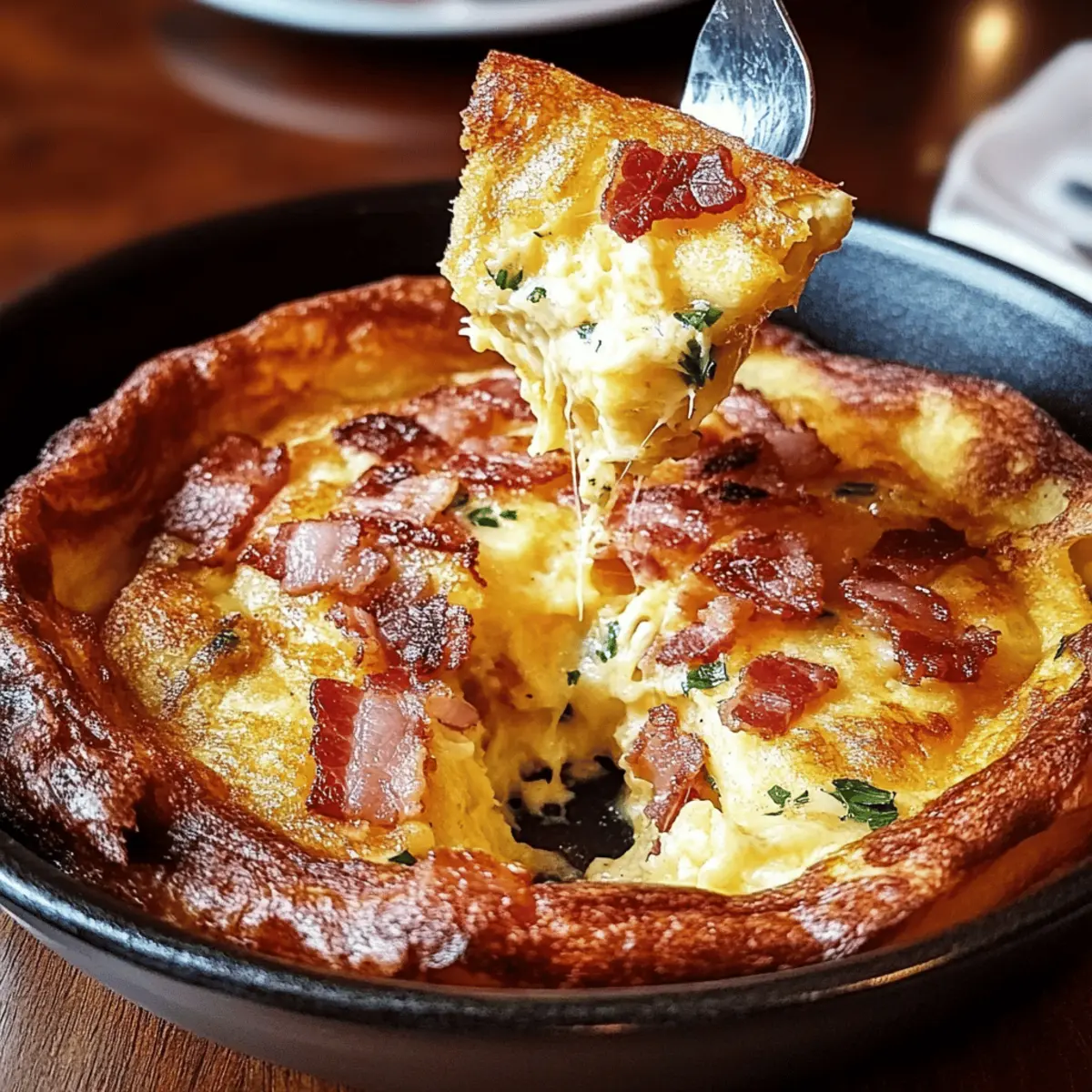 Discover the irresistible Savory Cheddar & Bacon Dutch Baby, a delectable breakfast that combines melted cheese and crispy bacon in a fluffy pancake.
