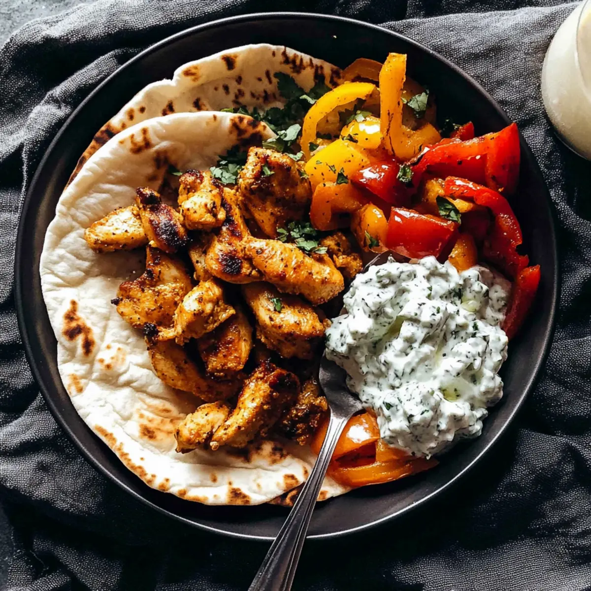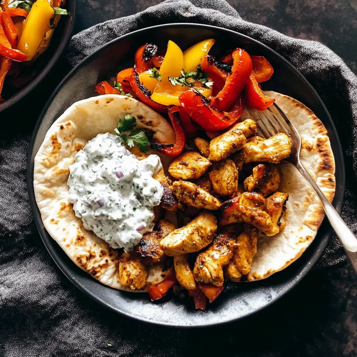 While the chicken and peppers are roasting, prepare your tzatziki sauce. In a bowl, combine yogurt, grated cucumber, minced garlic, lemon juice, salt, and a sprinkle of dill. Stir until well blended; the tzatziki should be creamy and refreshing, complementing the warm chicken pitas nicely.