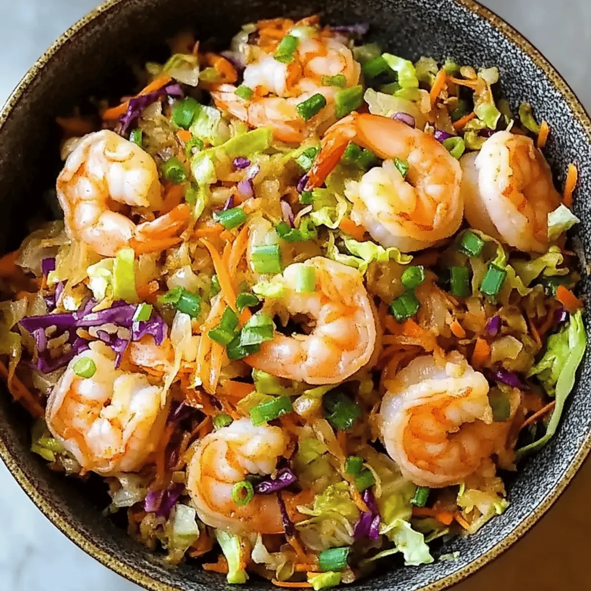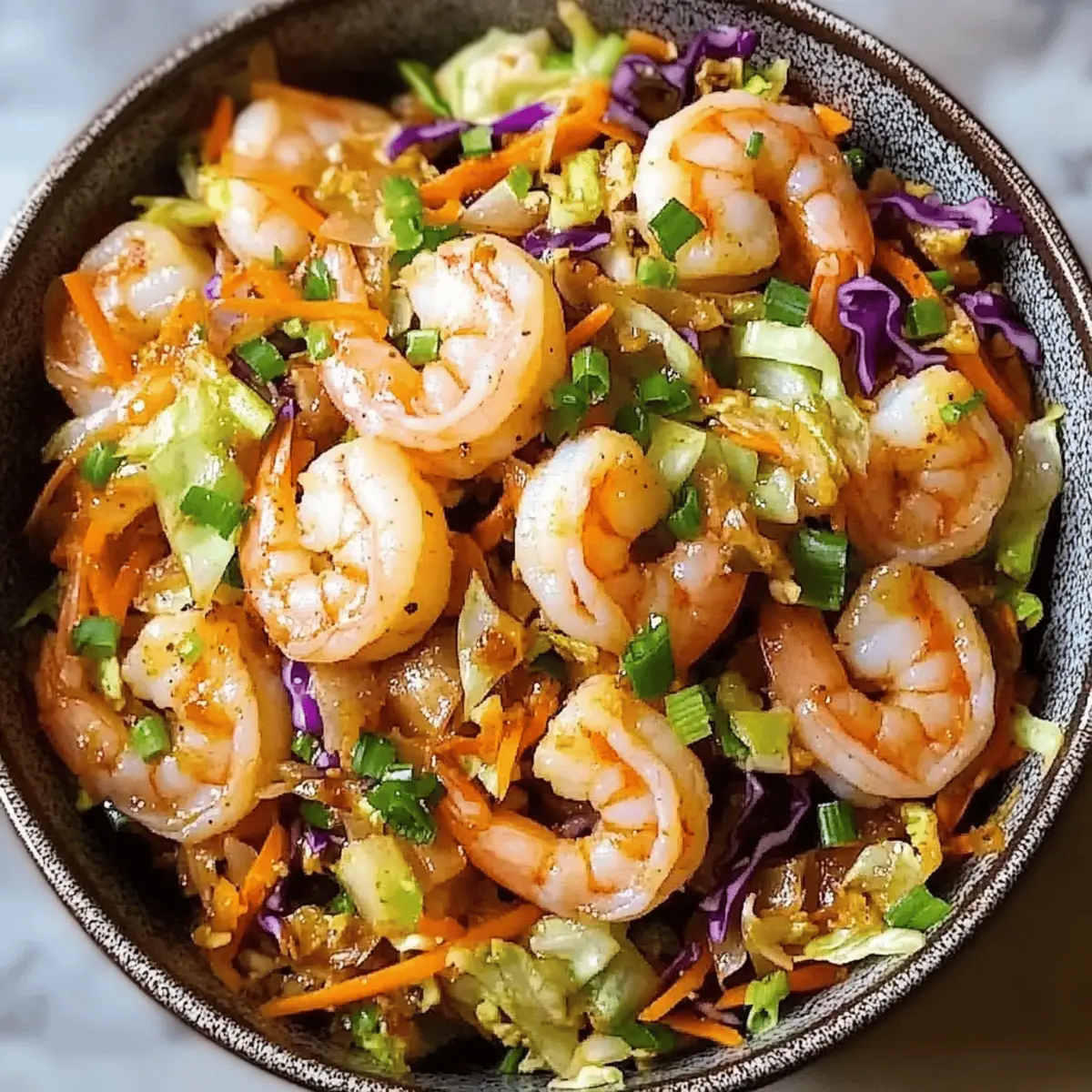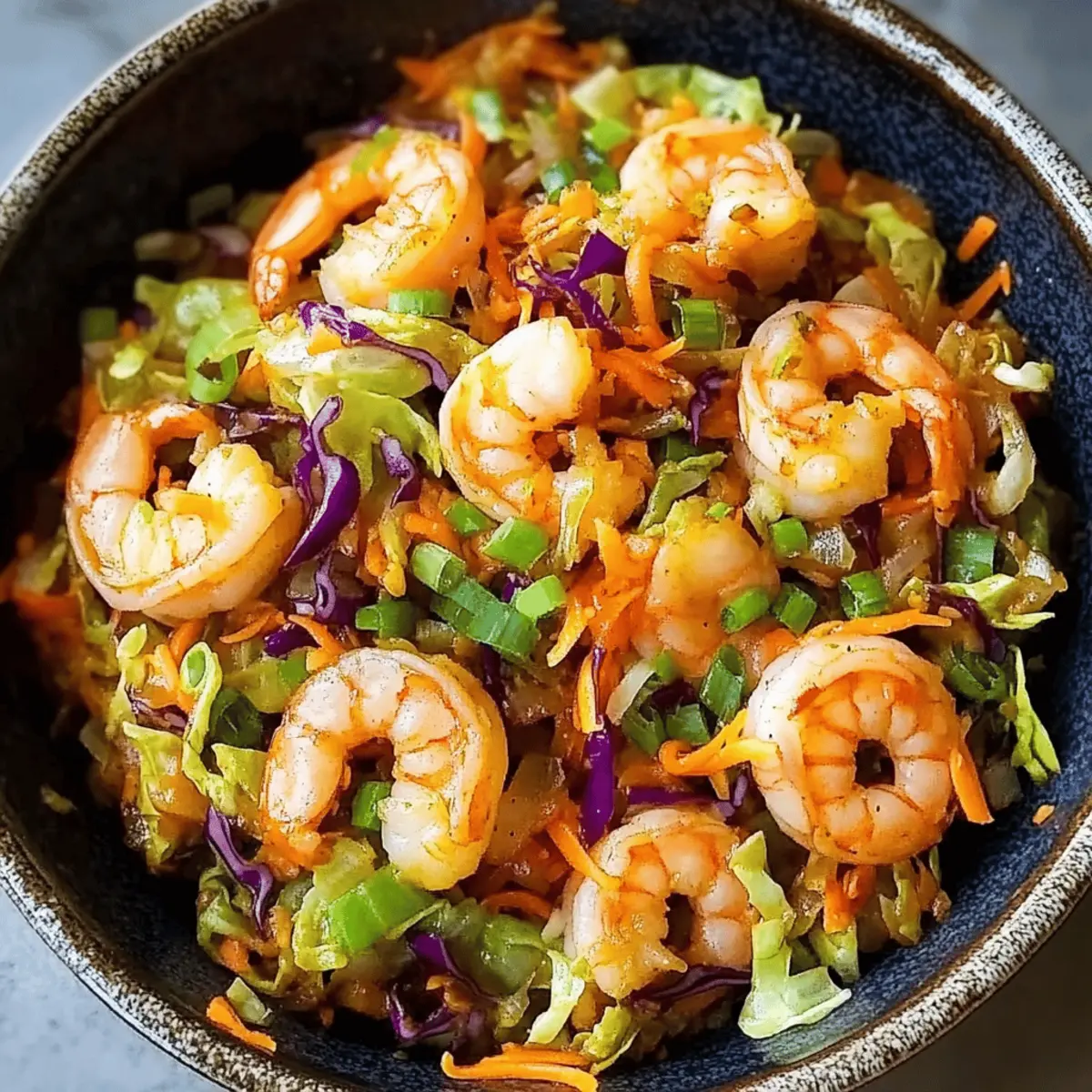 As I stirred my skillet, the enticing aroma of sizzling garlic and fresh vegetables filled my kitchen, reminding me that weeknight dinners don’t have to be dull. Enter my Quick & Easy Shrimp Egg Roll in a Bowl, a vibrant dish that captures all the savory flavor of traditional egg rolls without the hassle of frying. This recipe is a lifesaver for busy evenings, taking just minutes to whip up while delivering a healthy, satisfying meal packed with protein and colorful veggies. It’s easily customizable—feel free to swap shrimp for chicken or tofu and toss in your favorite produce. Are you ready to discover a delightful twist on a classic? Let’s dive in! Why is this dish a game-changer? Quick Preparation: You can whip this up in under 30 minutes, making it the perfect solution for busy weeknights. Healthy Alternative: Packed with fresh vegetables and shrimp, this dish provides a nutritious punch without sacrificing flavor. Versatile Ingredients: Feel free to switch out shrimp for chicken or tofu, and customize the vegetables to your liking—broccoli slaw or bell peppers can work beautifully! Satisfying Texture: Enjoy a delightful contrast of tender shrimp and crunchy cabbage, making each bite a flavorful experience. Crowd-Pleaser: Whether for family or friends, this meal is sure to impress with its vibrant presentation and delicious taste, fitting right into any homemade feast! To explore more creative preparations, be sure to check out my Spicy Shrimp Tacos or try a comforting bowl of Cajun Pasta with Shrimp. Shrimp Egg Roll Ingredients For the Bowl • 1 lb medium shrimp – The star of the dish; you can substitute with chicken or tofu for variation. • 1 tablespoon olive oil – Great for cooking; enhances flavor and prevents sticking. • 4 cups shredded green cabbage – Provides a crunchy base; napa cabbage or broccoli slaw makes a good replacement. • 1 cup shredded carrots – Adds sweetness and bright color; feel free to use bell peppers for a twist. • ½ cup sliced green onions – Offers fresh flavor; save some for a lovely garnish. • 3 cloves garlic, minced – A must-have for aromatic goodness that boosts overall flavor. For the Sauce • 2 tablespoons low sodium soy sauce – Adds delicious umami; switch to coconut aminos for a shrimp egg roll that’s gluten-free. • 1 tablespoon rice vinegar – Brings out tangy goodness. • 1 teaspoon sesame oil – Infuses nuttiness; optional based on your taste preferences. • ½ teaspoon ground ginger – Lends warmth and spice; fresh ginger is also a fantastic choice. • Salt and black pepper, to taste – Essential for enhancing flavor depth. For Garnish • 1 tablespoon sesame seeds (optional) – Adds texture and visual appeal; a delightful sprinkle on top! This Shrimp Egg Roll in a Bowl perfectly combines flavors and textures that’ll make your weeknights easier and far more delicious! Step‑by‑Step Instructions for Shrimp Egg Roll in a Bowl Step 1: Cook the Shrimp Heat 1 tablespoon of olive oil in a large skillet or wok over medium-high heat. Once the oil is shimmering, add 1 pound of medium shrimp. Sauté for 2-3 minutes per side until the shrimp turn pink and opaque. Remove the shrimp from the skillet and set them aside on a plate while you prepare the vegetables. Step 2: Sauté the Aromatics In the same skillet, add 3 cloves of minced garlic and ½ cup of sliced green onions (reserving some for garnish). Stir and cook for about 1-2 minutes until fragrant, ensuring not to let the garlic burn. This step enhances the flavor of your Shrimp Egg Roll in a Bowl, providing a delicious base for the rest of the ingredients. Step 3: Stir-Fry the Vegetables Add 4 cups of shredded green cabbage and 1 cup of shredded carrots to the skillet. Stir-fry these vibrant vegetables for about 4-5 minutes until they are tender yet still crisp. Keep the heat at medium-high to ensure they retain their bright colors. This step creates the crunchy texture that complements the shrimp beautifully. Step 4: Combine Shrimp and Sauce Return the cooked shrimp to the skillet with the vegetables. Toss in 2 tablespoons of low sodium soy sauce, 1 tablespoon of rice vinegar, 1 teaspoon of sesame oil, ½ teaspoon of ground ginger, and adjust with salt and black pepper to taste. Stir well and cook for an additional 2-3 minutes until everything is heated through and combined. Step 5: Garnish and Serve Once heated, remove the skillet from the heat and adjust the seasoning if needed. Transfer your Shrimp Egg Roll in a Bowl to serving dishes and garnish with reserved green onions and a sprinkle of sesame seeds if desired. Serve immediately for a delightful weeknight dinner that’s both healthy and satisfying. What to Serve with Shrimp Egg Roll in a Bowl Set the stage for a delightful dining experience with these irresistible pairings that elevate your meal. Jasmine Rice: Fluffy and fragrant, jasmine rice absorbs the sauce beautifully, adding a comforting element that balances the dish. Pairing it makes every bite a savory delight! Cauliflower Rice: For a low-carb option, cauliflower rice provides a light base that perfectly complements the vibrant flavors of your shrimp egg roll. It’s an excellent way to sneak in more vegetables! Edamame: Steamed edamame brings a bright, green pop of color and a protein boost to your meal. They’re a great finger food to enjoy along with the bowl. Asian Slaw: A crunchy slaw made of cabbage and veggies dressed in sesame vinaigrette adds an extra layer of texture and freshness. The coolness contrasts beautifully with the warm shrimp egg roll. Spring Rolls: Light and crispy, these can serve as a delightful appetizer or side, maintaining that classic Asian flair while offering a chewy, satisfying texture to munch on. Crispy Tofu: For a plant-forward twist, serve alongside crispy tofu bites. They add a wonderful crunch and soak up the flavors of the dish, making them a perfect pairing. Iced Green Tea: Refreshing and lig