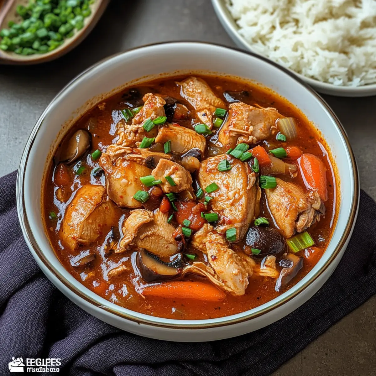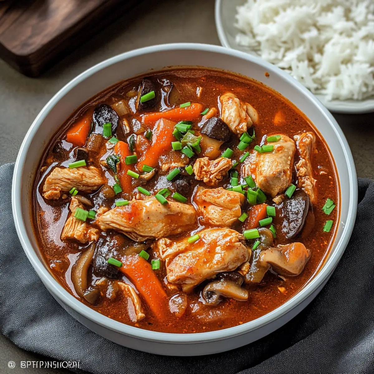As I strolled through the bustling streets of Seoul, the enticing aroma of simmering stews wafted through the air, sparking my culinary curiosity. Today, I’m excited to bring a taste of that vibrant street food culture right into your kitchen with my Slow Cooker Korean Chicken Stew. This dish is more than just a recipe; it’s a delightful way to savor comforting flavors without the fuss. Perfect for those hectic weeknights, it’s a set-it-and-forget-it wonder that requires minimal prep while still delivering a seriously satisfying meal. Plus, it’s gluten-free and freezer-friendly—ideal for enjoying later! Ready to dive into a bowl of rich, savory warmth? Let’s get cooking! Why is this stew a must-try? Effortless Preparation: With just a few minutes of prep, put everything in your slow cooker and let it do the work for you! Flavor Explosion: The combination of gochujang and sesame oil creates a unique depth of flavor, bringing an authentic taste of Korea to your home. Healthy Comfort: This stew offers a hearty meal that’s gluten-free and low-calorie, perfect for anyone seeking nutritious yet delicious options. Freezer-Friendly: Make a big batch and store leftovers for a rainy day. It freezes really well, so you’ll always have a cozy meal ready to go! Versatile Variations: Feel free to swap in your favorite veggies or try a vegetarian version with beans or tofu to mix it up! Enjoy other easy recipes like Cream Cheese Chicken or Garlic Parmesan Chicken for more comforting dishes that keep your kitchen buzzing! Slow Cooker Korean Chicken Stew Ingredients For the Stew • 750g boneless skinless chicken thighs – The juiciest choice for a flavorful stew; thighs provide more moisture than breasts. • 1 onion (chopped) – Adds sweetness and depth, enhancing the savory profile of the stew. • 1 large carrot (chopped) – Provides natural sweetness and a nice crunch for texture. • 150g mushrooms (halved) – Boosts umami flavor and adds a hearty aspect to the dish. • 1 tablespoon minced garlic – Elevates the overall flavor profile with its aromatic kick. • 2 tablespoons gochujang – This key ingredient for the Slow Cooker Korean Chicken Stew introduces spice and depth; opt for authentic Korean paste for best results. • 2 tablespoons soy sauce – Delivers saltiness and umami; use tamari for a gluten-free option. • 2 level tablespoons brown sugar – Balances the heat from gochujang, creating a harmonious flavor. • 1 tablespoon sesame oil – Contributes a nutty aroma and richness that complements the dish beautifully. • 2 cups (480ml) chicken stock – Acts as the base liquid for the stew, ensuring it remains moist; swap for vegetable stock in a vegetarian version. • 4 spring onions (chopped, green part only) – Fresh garnish that adds a pop of color and flavor at serving. • 1.5 tablespoons cornstarch – Used as a thickening agent; be sure to create a slurry before adding for best results. • Salt and black pepper – Essential for seasoning to taste, enhancing all the delicious flavors. For Garnish • Fresh cilantro or parsley (optional) – Adds a fresh touch and a pop of color to the final dish. Step‑by‑Step Instructions for Slow Cooker Korean Chicken Stew Step 1: Prepare the Ingredients Start by gathering all your ingredients for the Slow Cooker Korean Chicken Stew. Chop the onion, carrot, and mushrooms into bite-sized pieces, and mince the garlic. This prep will ensure a smooth cooking process! Once everything is ready, you can easily combine the ingredients. Step 2: Combine in the Slow Cooker In your slow cooker, add the chicken thighs followed by the chopped onion, carrot, and mushrooms. Then, toss in the minced garlic, gochujang, soy sauce, brown sugar, sesame oil, and chicken stock. It’s key to layer the flavors as they blend beautifully during cooking, so get everything in and ready for the next step! Step 3: Mix Together Using a large spoon, gently stir all the ingredients together until they are thoroughly combined. This ensures that the flavors meld and the chicken is coated with the delicious spicy sauce. Now that everything is evenly mixed, it’s time to set your slow cooker. Step 4: Start Cooking Cover your slow cooker and set it to cook on high for 2-3 hours or low for 4-5 hours. During this time, the chicken will become tender and the vegetables will soften. You’ll know it’s ready when the chicken easily shreds with a fork, revealing its flavorful goodness. Step 5: Thicken the Stew In the last hour of cooking on high, or the last two hours on low, prepare a cornstarch slurry. Combine 1.5 tablespoons of cornstarch with an equal amount of water until smooth. Add this mixture to the stew, stirring well to thicken the sauce as it continues to cook. Step 6: Season and Serve Once the cooking time is complete, taste the Slow Cooker Korean Chicken Stew and adjust the seasoning with salt and black pepper according to your preference. When ready to serve, ladle the stew into bowls and garnish with chopped spring onions for a fresh touch. How to Store and Freeze Slow Cooker Korean Chicken Stew Fridge: Store leftover Slow Cooker Korean Chicken Stew in an airtight container for up to 3 days. This helps to maintain the rich flavors while keeping the dish fresh. Freezer: For longer storage, freeze the stew in portions for up to 3 months. Allow it to cool completely before transferring into freezer-safe bags or containers. Reheating: Thaw in the refrigerator overnight before reheating. Gently warm it on the stovetop or in the microwave, adding a splash of chicken stock if needed to restore moisture. Reversible: You can safely refreeze any leftovers, but it’s best consumed fresh for optimal taste and texture. Expert Tips for Slow Cooker Korean Chicken Stew Combine Ingredients Well: Ensure all ingredients are thoroughly mixed before cooking to achieve the best flavor profile for your Slow Cooker Korean Chicken Stew. Choose Thighs for Moisture
