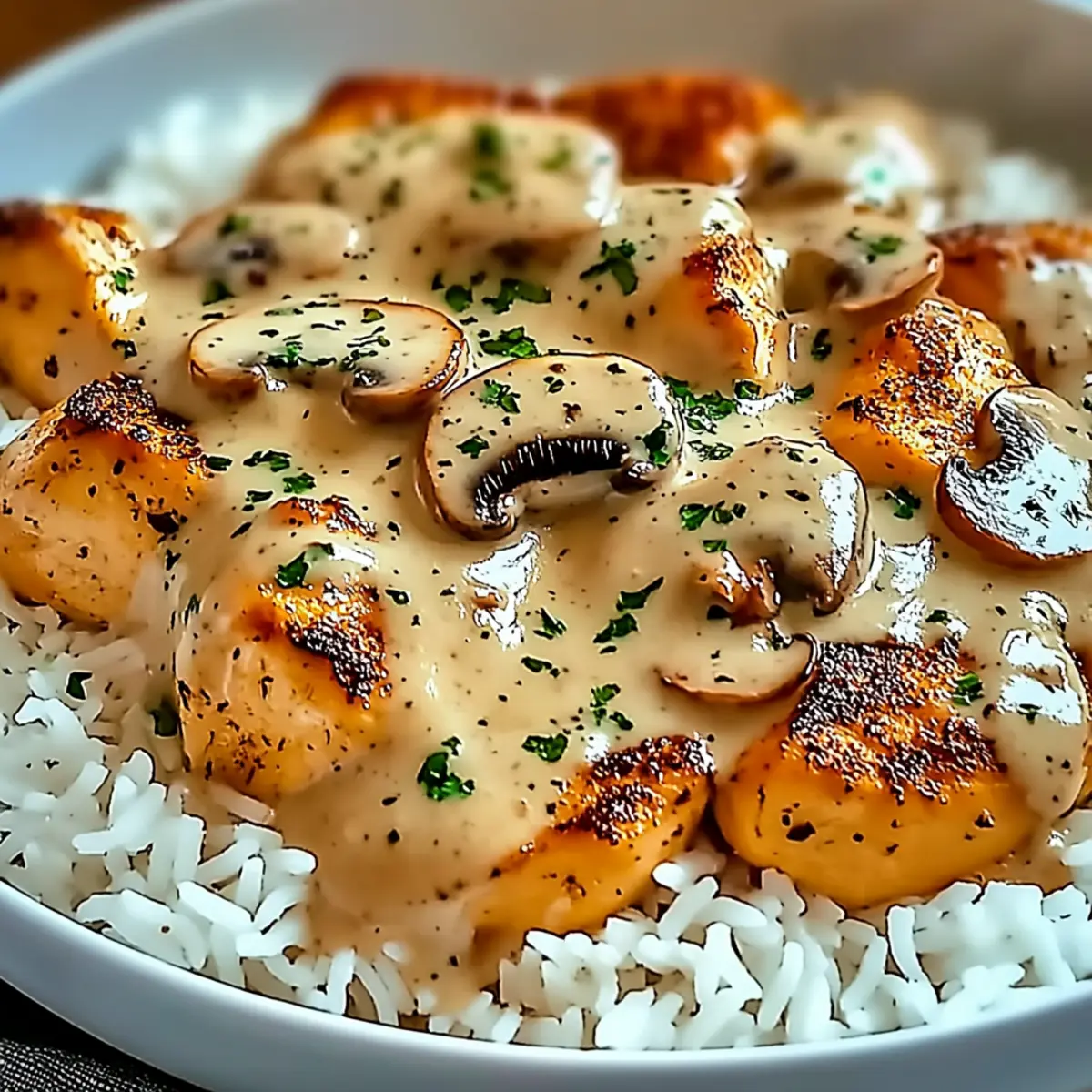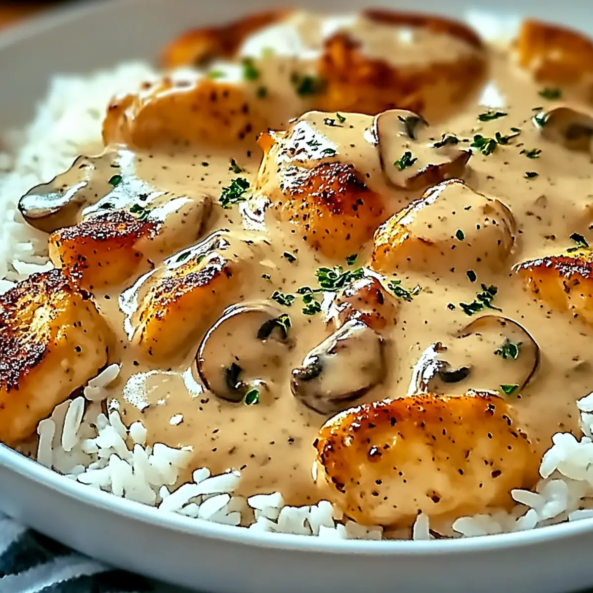 As I stood in my kitchen the other evening, the scent of sautéed garlic and onions danced in the air, instantly whisking me back to childhood dinners. That heartwarming feeling inspired me to whip up a batch of Smothered Chicken and Rice, a captivating dish that has become a go-to for busy weeknights. This recipe is not just about convenience; it’s also incredibly customizable, allowing you to swap in your favorite chicken type or toss in seasonal vegetables. With a creamy mushroom sauce embracing juicy chicken, all served over a bed of fluffy rice, it delivers the comfort food satisfaction we all crave. Whether you’re feeding a hungry family or treating yourself to a cozy dinner, this dish promises a flavorful experience without the fuss. What twists will you add to make it your own? Why is Smothered Chicken and Rice a Must-Try? Comforting warmth: This dish envelops you in a rich, creamy sauce, reminding you of home-cooked meals that warm the heart. Customizable options: Whether you prefer chicken thighs for a bolder taste or want to throw in seasonal veggies like bell peppers, the possibilities are endless! Quick and easy: Perfect for busy weeknights, you can have this delightful meal on the table in no time, allowing for more quality family moments. Hearty satisfaction: A generous serving of fluffy rice ensures you’re filled and happy after your meal. Crowd-pleaser: Whether it’s a family dinner or a cozy evening solo, this dish is sure to impress everyone at the table, just like my Garlic Parmesan Chicken! Smothered Chicken and Rice Ingredients For the Chicken Boneless Skinless Chicken Breasts – This is the main protein source; you can substitute with chicken thighs for added flavor and juiciness. Salt – Enhances the overall flavor; feel free to adjust according to personal taste. Black Pepper – Adds warmth and depth; freshly cracked is preferred for better flavor. For the Sauce Garlic – Provides aromatic flavor; freshly minced is recommended for the best taste. Onion – Forms the base of the sauce with a sweet, savory note; can substitute with shallots for a milder flavor. Low-Sodium Chicken Broth – Adds moisture and flavor; use vegetable broth for a vegetarian version. Cream of Mushroom Soup – Creates the creamy sauce base; can substitute with cream of celery or a homemade cream sauce. Soy Sauce – Adds umami depth; use low sodium or tamari for a gluten-free option. Paprika – Provides color and mild flavor; smoked paprika can enhance richness. Dried Thyme – Adds earthy flavor; fresh thyme can be substituted if available. For the Base Cooked Rice – Serves as the base for this comforting dish; options include white, brown, quinoa, or cauliflower rice. Feel free to mix and match any of these ingredients to craft your perfect rendition of Smothered Chicken and Rice! Step‑by‑Step Instructions for Smothered Chicken and Rice Step 1: Preheat the Oven Begin by preheating your oven to 375°F (190°C). While it warms, take a 9×13-inch baking dish and spray it generously with nonstick cooking spray. This simple step ensures that your delicious Smothered Chicken and Rice won’t stick, making it easy to serve and clean up later. Step 2: Season and Sear Chicken Season your boneless skinless chicken breasts with salt and freshly cracked black pepper. Heat a drizzle of oil in a large skillet over medium-high heat, and once it’s shimmering, add the chicken. Sear the chicken for about 5 minutes on each side, or until it develops a beautiful golden-brown crust. This step locks in flavor, preparing your chicken for the oven. Step 3: Sauté Aromatics After the chicken is seared, set it aside and use the same skillet to enhance the flavor of your dish. Add chopped onion and minced garlic, sautéing them for about 3 minutes until the onion becomes translucent and fragrant. This aromatic base will add depth to the creamy sauce that envelops your Smothered Chicken and Rice. Step 4: Mix the Sauce In a mixing bowl, combine the cream of mushroom soup, low-sodium chicken broth, soy sauce, paprika, and dried thyme. Whisk these ingredients together until well blended, creating a rich, velvety sauce that will smother the chicken. This mix will bring all the comforting flavors together for your upcoming dish. Step 5: Assemble the Dish Place the seared chicken breasts in the prepared baking dish, ensuring they are spaced out evenly. Pour the creamy sauce mixture over the chicken, covering it generously. This step is crucial for achieving that luscious, smothered effect that makes this dish truly comforting and satisfying. Step 6: Bake Cover the baking dish with aluminum foil to keep the moisture in, and carefully place it in the preheated oven. Bake for 30 to 35 minutes, or until the chicken reaches an internal temperature of 165°F (74°C). You’ll know it’s done when the chicken is tender and the sauce is bubbling, infusing your kitchen with mouthwatering aromas. Step 7: Serve Once baked, let the dish rest for a few minutes before serving. Prepare a bowl of fluffy cooked rice, and then ladle the smothered chicken and sauce generously over the rice. This finishing touch not only elevates the dish but also ensures a hearty serving of comfort in every bite of your Smothered Chicken and Rice. Expert Tips for Smothered Chicken and Rice • Perfectly Cooked Chicken: Ensure the chicken reaches an internal temperature of 165°F (74°C) to guarantee safe consumption and optimal tenderness. • Searing Tips: Don’t overcrowd the skillet when searing chicken; it will create steam instead of a nice crust, affecting the flavor. • Creamy Sauce Balance: If the sauce is too thick, add a splash more chicken broth to reach your desired creamy consistency without sacrificing flavor. • Veggie Variations: Experiment with vegetables like bell peppers or spinach for a nutritional boost; just add them to the sauté step for the best results. • Make Ahead: For busy nights, assemble the Smother