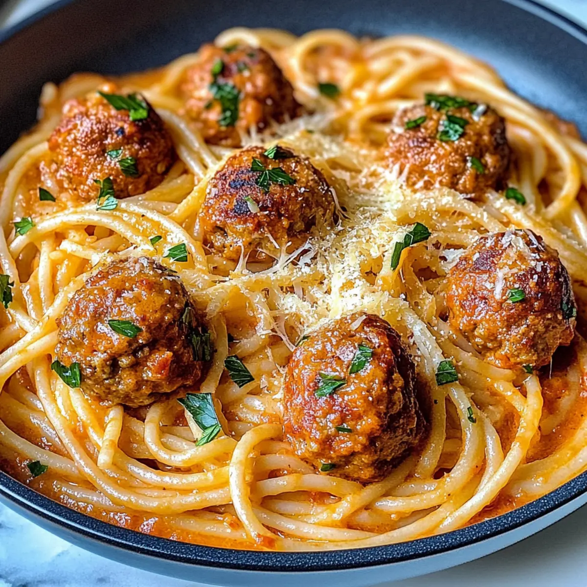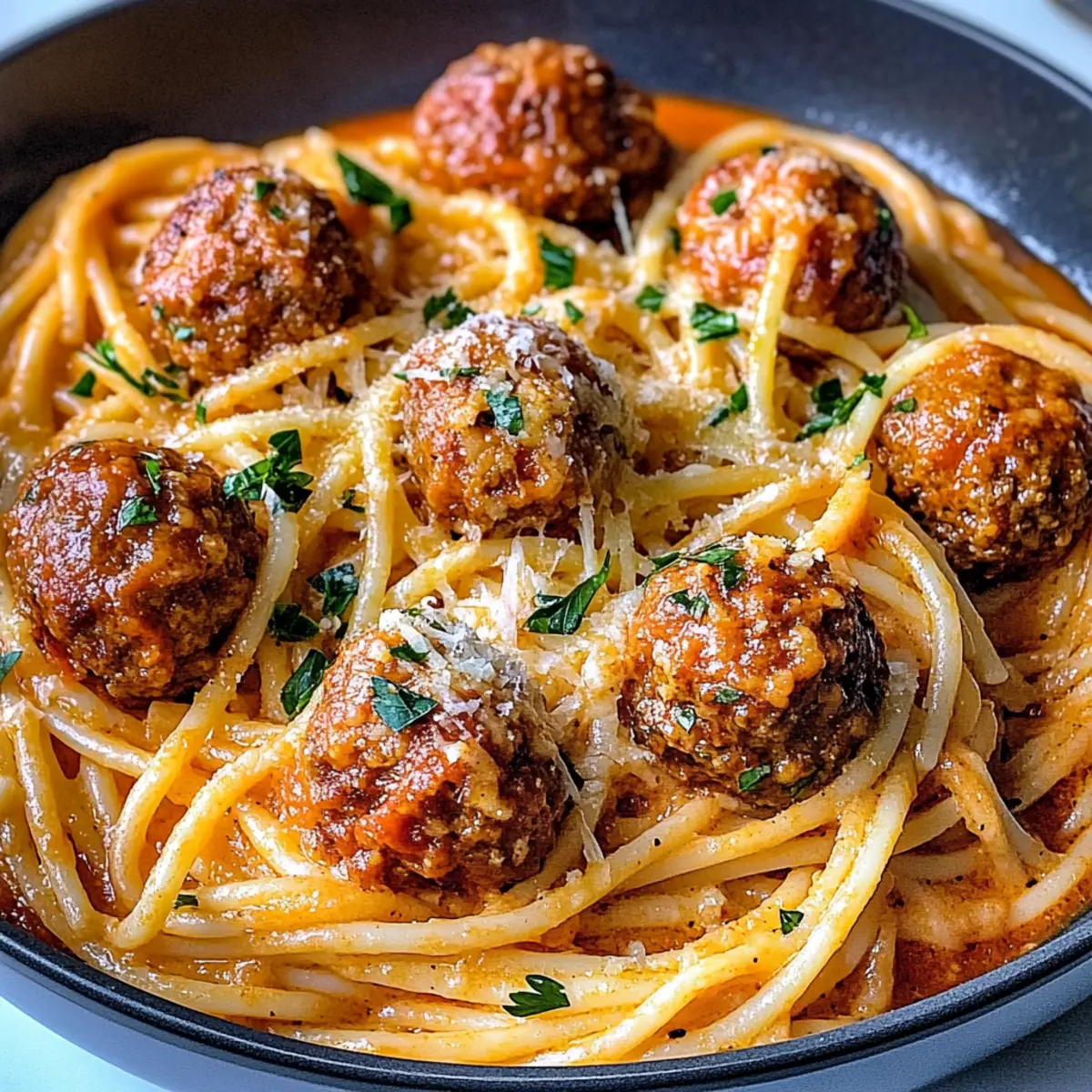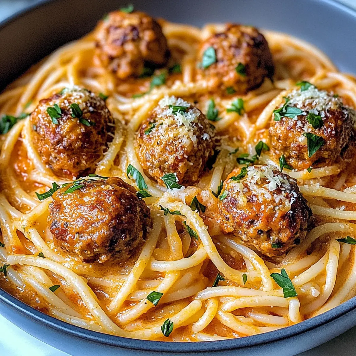 The aroma of sautéed garlic and marinara sauce wafts through the kitchen, transporting me back to cozy family dinners. Today, I’m excited to share my go-to recipe for Creamy Spaghetti and Meatballs, a comforting twist on the classic dish that never fails to impress. What I love most about this recipe is its versatility; it easily transforms into gluten-free or dairy-free variations without sacrificing taste, making it a crowd-pleaser for all. Whether you’re facing a busy weeknight or simply looking to indulge in some homemade splendor, this dish promises to bring warmth and satisfaction to your table. So, are you ready to whip up a bowl of creamy goodness that’s sure to delight? Why is this dish so comforting? Ultimate Comfort Food: This Creamy Spaghetti and Meatballs recipe will cozy up your kitchen and your heart! Versatile Adaptations: With options for gluten-free and dairy-free versions, everyone can enjoy this dish without missing out. Quick and Easy: Perfect for busy weeknights, you can whip up this meal in under 30 minutes, ensuring less time in the kitchen and more time with loved ones. Irresistible Flavor: The rich marinara sauce combined with juicy meatballs creates a symphony of flavors that feels both indulgent and satisfying. Crowd-Pleaser: Whether you’re hosting a dinner party or feeding your family, this recipe is sure to impress! For a more exciting accompaniment, try pairing it with Cajun Pasta Shrimp or enjoy a Parmesan Chicken Potatoes to elevate your meal. Spaghetti and Meatballs Ingredients For the Meatballs • Large Egg – Binds the meatball mixture; swap with flaxseed meal for a vegan option. • Fresh Parsley – Adds freshness and flavor; substitute with basil for a twist. • Dried Oregano – Provides classic Italian flavor; thyme can work well instead. • Salt & Black Pepper – Enhances overall flavor; adjust to your personal taste. • Garlic (10 cloves total) – Develops aromatic depth; use garlic powder in a pinch (1 tsp = 1 clove). • Water – Keeps the meat mixture moist; essential for texture, so don’t reduce. • Tomato Paste – Adds richness to meatballs; omit if desired, but adjust seasoning. • Ground Beef (1 lb) & Ground Pork (1 lb) – Create flavorful meatballs; substitute with ground turkey for a leaner version. • Italian-style Breadcrumbs (1 cup) – Provides structure for meatballs; use gluten-free breadcrumbs if necessary. • Parmigiano-Reggiano (½ cup + extra) – Adds savory depth; try Pecorino Romano as an alternative. For the Sauce • Butter (3 tbsp) – For sautéing onions; olive oil works for a dairy-free option. • Yellow Onion – Adds sweetness and depth; shallots are a suitable substitute. • High-quality Marinara Sauce (3 cups) – The base of the creamy sauce; Rao’s is recommended for best flavor. • Sugar (½ tsp) – Balances the acidity; omit if using a sweet marinara. • Heavy Cream (1½ cups) – Enriches the sauce; swap with half-and-half or coconut cream for a dairy-free option. For the Pasta • Spaghetti (12 oz) – The main component; substitute with gluten-free or vegetable noodles like zucchini. Optional Flavor Boosters • Garlic Powder & Sweet Paprika (1 tsp each) – Optional but highly recommended for extra flavor enhancement. Indulge in this delightful Spaghetti and Meatballs recipe, where creamy sauce meets tender meatballs, making for an unforgettable dining experience! Step‑by‑Step Instructions for Creamy Spaghetti and Meatballs Step 1: Prepare Meatballs Preheat your oven to 350°F (175°C). In a large mixing bowl, combine the egg, chopped parsley, dried oregano, minced garlic, salt, pepper, ground beef, ground pork, breadcrumbs, and grated Parmigiano-Reggiano. Mix gently until just combined, then shape the mixture into golf ball-sized meatballs. Place them on a baking sheet and bake for about 20 minutes, or until they are golden brown and cooked through. Step 2: Make Sauce While the meatballs are baking, melt 3 tablespoons of butter in a large skillet over medium heat. Add finely chopped yellow onion and minced garlic, sautéing for about 5 minutes, or until the onion becomes translucent and fragrant. Pour in 3 cups of high-quality marinara sauce and sprinkle in ½ teaspoon of sugar, letting the sauce simmer for another 5 minutes to enhance the flavors. Step 3: Incorporate Heavy Cream Once the sauce has simmered, reduce the heat to low and stir in 1½ cups of heavy cream. Continue stirring until the cream is fully incorporated, creating a luscious, creamy texture. You’ll know it’s ready when the sauce has turned a beautiful shade of orange and all the ingredients are well mixed. Keep this on low heat while you prepare the spaghetti. Step 4: Cook Pasta In a large pot, bring salted water to a boil over high heat, then cook 12 oz of spaghetti following package instructions until al dente, about 8 to 10 minutes. Once cooked, drain the pasta in a colander, but reserve about a cup of the starchy pasta cooking water. This will help to adjust the sauce consistency later. Step 5: Combine Pasta and Sauce Add the drained spaghetti directly into your creamy marinara sauce. Toss gently to coat the pasta evenly, and use the reserved cooking water as needed to achieve your desired sauce consistency. This helps bind the spaghetti with the sauce beautifully, creating a delightful creamy coating around every strand. Step 6: Incorporate Meatballs Carefully add the baked meatballs into the pasta and sauce mixture. Gently toss everything together to combine, ensuring each meatball and strand of spaghetti is well coated. Allow this to heat through on low for about 2-3 minutes, ensuring the meatballs absorb the delicious flavors of the sauce. Step 7: Serve and Garnish Once everything is heated, serve your Creamy Spaghetti and Meatballs in warm bowls. For an extra touch, garnish with additional grated Parmigiano-Reggiano and a sprinkle of fresh parsley. The dish is best enjoyed hot, with the com