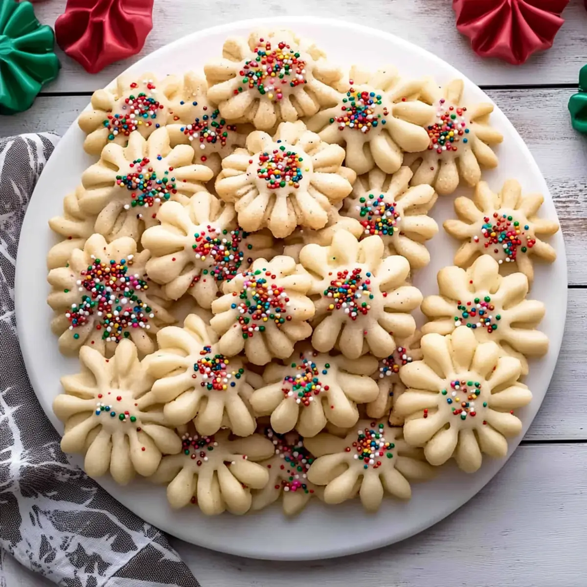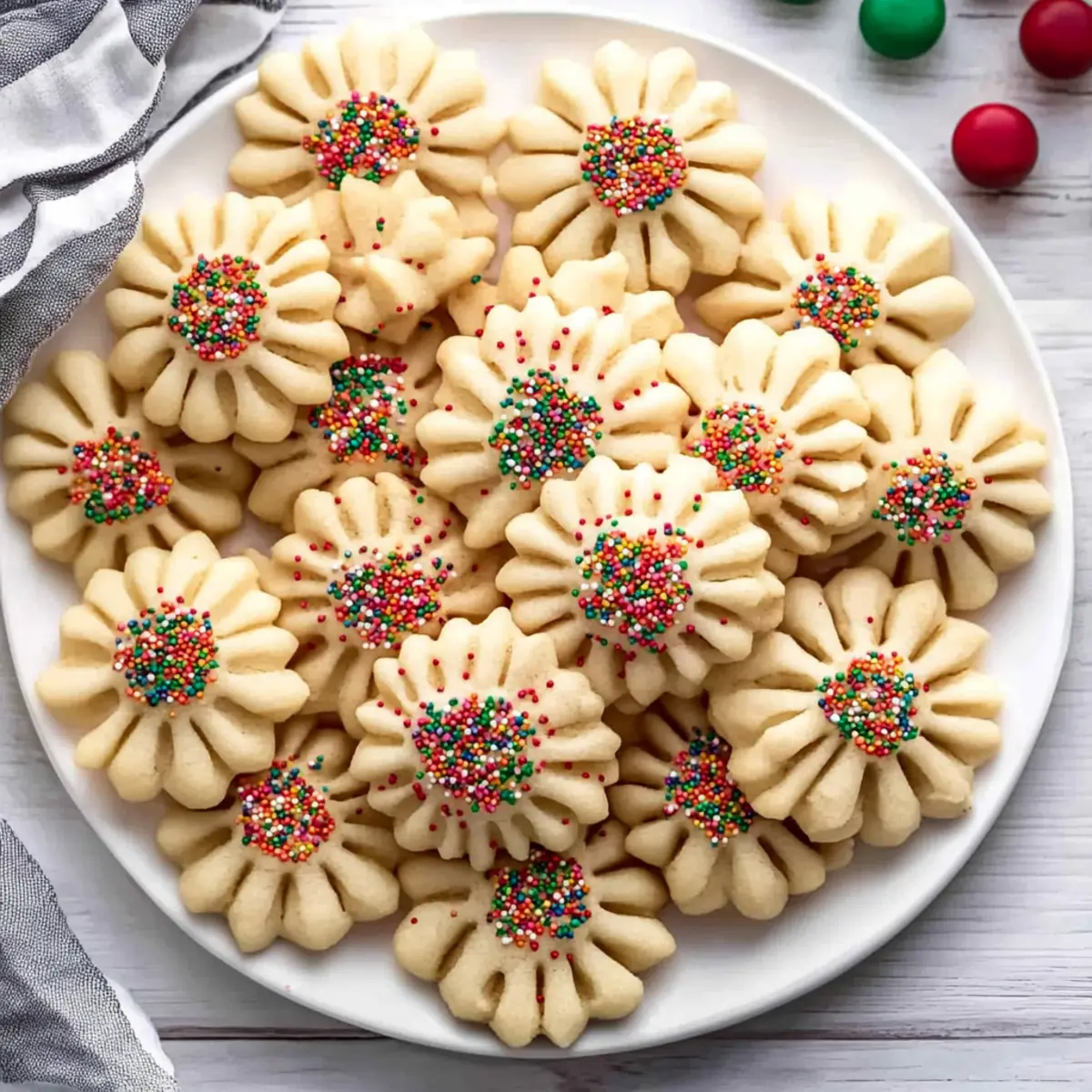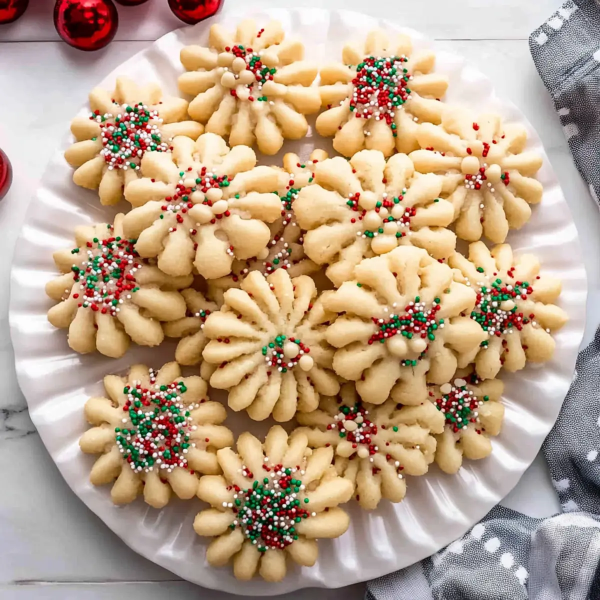 As the aroma of freshly baked cookies wafts through the kitchen, I can’t help but feel a wave of nostalgia wash over me. These classic spritz cookies have a way of bringing back memories of holiday gatherings and cheerful laughter. Made with just a handful of simple pantry ingredients, this buttery treat is as easy to whip up as it is delightful to share. The beauty of spritz cookies lies in their versatility; with a cookie press, you can create festive shapes that stand out on any dessert platter, making them a perfect addition to celebrations. Not only are they quick to make, but they also offer a melt-in-your-mouth experience that will have your loved ones coming back for seconds. Ready to transport your taste buds to a happier place? Let’s dive into this delightful cookie adventure! Why Are Spritz Cookies So Irresistible? Easy to Make: With just a few simple ingredients, you’ll have these delightful cookies ready in no time! Perfect for bakers of all skills. Melt-in-Your-Mouth Texture: Enjoy the satisfying contrast of a slightly crisp edge and a buttery center that simply melts in your mouth. Festively Fun: The cookie press allows you to create beautiful shapes that are great for any season, especially around the holidays. Versatile Options: Feel free to change up the flavors with extracts or dress them up with sprinkles or chocolate drizzle for that extra touch of joy. Crowd-Pleasing Treat: These cookies are perfect for gatherings! They’ll charm guests alongside a warm cup of tea or coffee, just like my Honey Cookies Chewy or Brown Butter Cookies. Dive into your holiday baking and discover why spritz cookies are always a hit! Spritz Cookies Ingredients • Here’s everything you need to create deliciously buttery spritz cookies. For the Dough Unsalted Butter – This should be softened to create a smooth, creamy texture that ensures richness. Granulated Sugar – Sweetens the cookies while contributing to a tender texture. Egg – Binds the ingredients and adds essential moisture for that perfect cookie consistency. Vanilla Extract – Infuses a warm, aromatic flavor; feel free to swap it with almond extract for variety. Almond Extract – Adds a delightful nutty note; optional but highly recommended for classic taste. All-Purpose Flour – The foundation for the cookie structure; use the spoon and level method for accuracy. Salt – Balances sweetness and enhances overall flavor, making every bite memorable. For Decoration (Optional) Sprinkles – A fun festive touch! Add these before baking to brighten up your cookies. Melted Chocolate – Drizzling or dipping in chocolate adds richness and a lovely finish that enhances the cookie’s appeal. Feel free to get creative and make these spritz cookies uniquely yours! Step‑by‑Step Instructions for Spritz Cookies Step 1: Preheat Your Oven Begin by preheating your oven to 350°F (175°C). This ensures a perfectly even baking temperature when it’s time to bake your spritz cookies. Preheating is crucial for achieving that lovely, slightly crisp edge while maintaining a soft, melt-in-your-mouth center. An even oven temperature will enhance the overall texture of your cookies. Step 2: Cream Butter and Sugar In a large mixing bowl, combine the softened unsalted butter and granulated sugar. Using a hand mixer or stand mixer, beat the mixture on medium speed for about 1-2 minutes until it becomes light and fluffy. This process incorporates air into the dough, which adds to the loveliness of the spritz cookies. Make sure to scrape down the sides of the bowl for an even mix. Step 3: Add Wet Ingredients Next, crack in the egg and pour in the vanilla and almond extracts. Beat the mixture on medium speed until it becomes pale and fluffy, which should take another minute or so. The egg contributes moisture and helps bind the ingredients, while the extracts infuse delightful flavor into your spritz cookies, making them irresistible. Step 4: Combine Dry Ingredients Gradually sift the all-purpose flour and salt into the butter mixture. Use a spatula to gently fold the dry ingredients in until just combined, ensuring you don’t overmix. Overmixing can lead to tough cookies, so stop as soon as the flour is incorporated. The dough should be soft and slightly sticky, perfect for the cookie press. Step 5: Prepare Cookie Press Transfer the cookie dough into your cookie press fitted with a decorative disc of your choice. This is where the fun begins! Make sure the press is securely assembled and ready to create beautiful shapes that will make your spritz cookies both delicious and visually appealing. Step 6: Pipe Cookies onto Baking Sheet On an ungreased cookie sheet, carefully press out the dough, spacing each cookie about 1 inch apart. You’ll want to create lovely shapes—like stars or wreaths—that showcase the festive spirit of spritz cookies. Consult your cookie press instructions for best results, and remember to enjoy the creative process! Step 7: Add Optional Toppings If you’re feeling festive, sprinkle your uncooked cookies with colorful sprinkles for a touch of flair before baking. This step adds an extra layer of joy and visual appeal to your spritz cookies. The sprinkles will adhere beautifully to the dough as they bake, creating a cheerful finish. Step 8: Bake to Perfection Place the baking sheet in your preheated oven and bake for about 7-9 minutes, or until the edges of the cookies are lightly golden. Keep a close eye on them to avoid overbaking; you want that lovely, soft center. Let the aroma fill your kitchen as you anticipate the deliciousness to come! Step 9: Cool and Drizzle Once baked, remove the cookies from the oven and let them cool on the baking sheet for a few minutes until they’re firm enough to handle. Then, transfer them to a cooling rack. If desired, drizzle melted chocolate over the cooled cookies for an additional indulgent touch that perfectly complements the buttery flavors of the spritz cookies. Stora