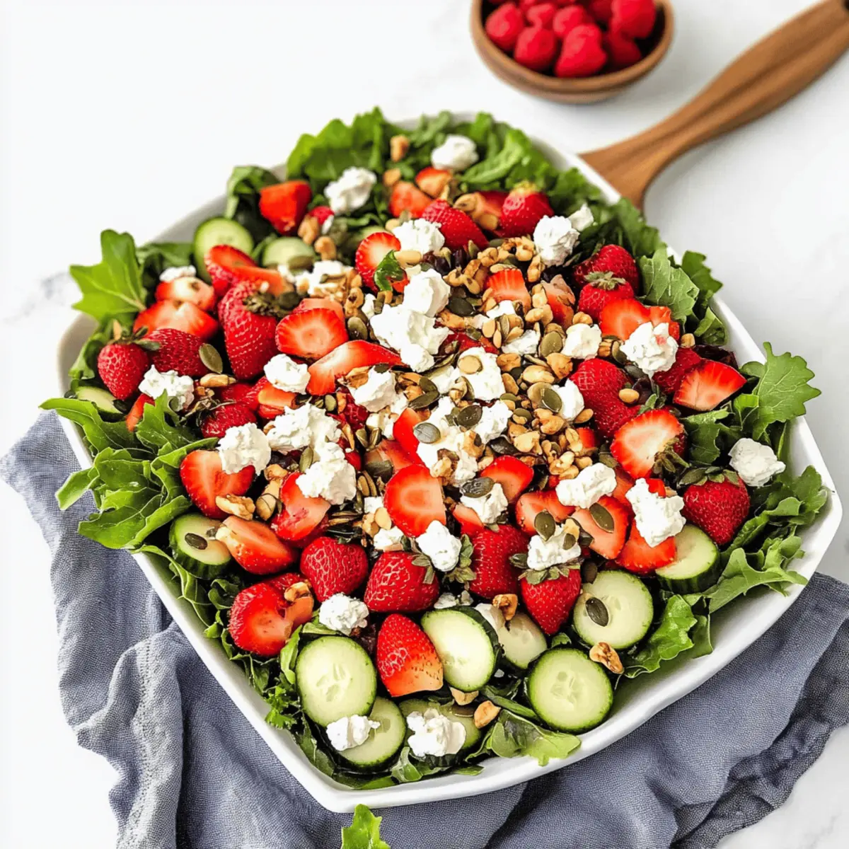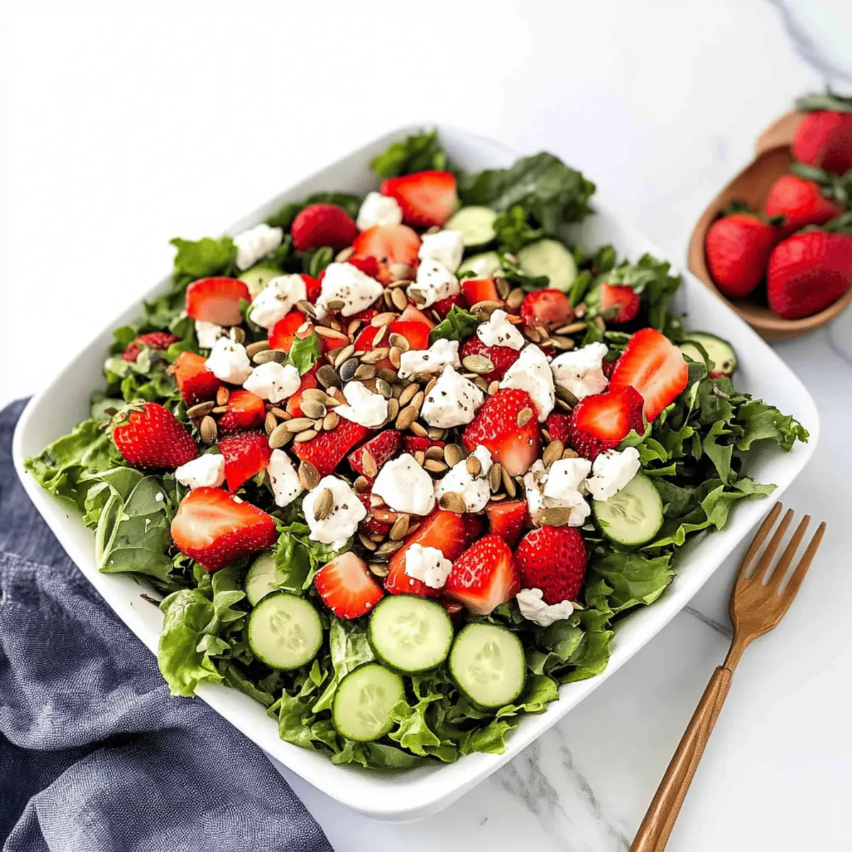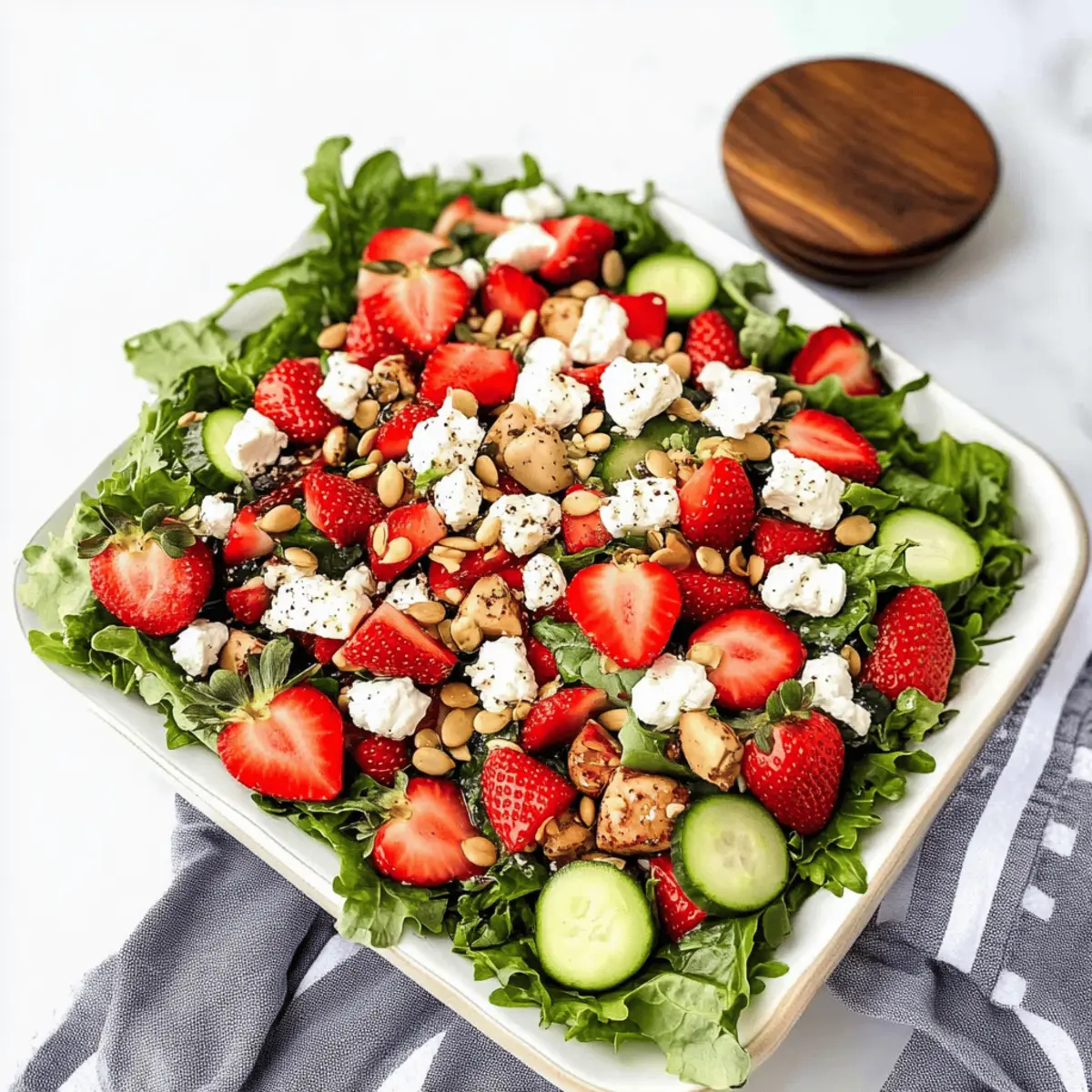 Summer afternoons have a magical way of enticing me back into the kitchen, especially when I whip up a vibrant Strawberry Goat Cheese Salad. In just 20 minutes, you can enjoy this healthy delight that celebrates the juiciness of ripe strawberries paired with creamy goat cheese. It’s incredibly versatile; whether you’re adding grilled chicken for a protein boost or keeping it light and vegetarian, it’s sure to impress. This salad is not only a feast for the eyes with its colorful ingredients, but also a perfect choice for a quick lunch, light dinner, or meal prep on those busy days. Ready to dive into a salad that’s as refreshing as it is nutritious? Let’s get started! What Makes This Salad So Special? Vibrant Flavors: This Strawberry Goat Cheese Salad bursts with freshness, combining sweet strawberries and tangy goat cheese for a delightful experience. Quick to Prepare: In just 20 minutes, you can create a mouthwatering dish, perfect for busy weekdays or spontaneous gatherings. Versatile Options: Whether topped with grilled chicken, shrimp, or kept vegetarian, the protein variations cater to everyone’s taste. Nutrient-Packed: Featuring wholesome ingredients like pumpkin seeds and hemp hearts, this salad is a nutritional powerhouse. Visual Appeal: The colorful display of ingredients makes it an attractive centerpiece for any table, ensuring it stands out even at a potluck. Dive deeper into deliciousness with similar ideas, like our Cottage Cheese Banana Pudding or brighten up your meal plan with Fruit Salad Refreshing. Strawberry Goat Cheese Salad Ingredients Discover the tasty elements behind this delightful dish! For the Dressing Mayonnaise – Adds creaminess and flavor; substitute Greek yogurt for a lighter option. Extra Virgin Olive Oil – Richness that helps emulsify the dressing; any neutral oil can also work. Dijon Mustard – Provides a tangy balance; honey mustard makes for a sweeter alternative. White Wine Vinegar – Introduces acidity to balance flavors; apple cider vinegar is a great substitute. Maple Syrup – Natural sweetness for the dressing; honey works as a similar flavor enhancer. Salt and Pepper – Boosts overall flavor; coarse sea salt adds a different saltiness profile. For the Salad Chicken Breasts – Your protein hero; grill shrimp or tofu for a delightful swap. Spring Mix Lettuce – The fresh base of the salad; any seasonal greens like arugula can work too. Fresh Strawberries – Brings sweetness and freshness; blueberries or raspberries are tasty alternatives. Goat Cheese – Creamy and tangy; feta cheese offers an excellent substitution. Cucumber – Adds crunch and hydration; replace with bell peppers for a unique texture. Red Onion – Provides zesty crunch; shallots can be used for a milder flavor. Pumpkin Seeds – Crunchy nutrition; sunflower seeds make a great replacement. Hemp Hearts – Offer a nutritional boost with omega fatty acids; chia seeds are a lovely alternative. Create your own delectable Strawberry Goat Cheese Salad, filled with vibrant flavors and healthy ingredients! Step‑by‑Step Instructions for Strawberry Goat Cheese Salad Step 1: Prepare the Dressing In a jar, combine 1/4 cup mayonnaise, 2 tablespoons extra virgin olive oil, 1 tablespoon Dijon mustard, 1 tablespoon white wine vinegar, 1 tablespoon maple syrup, and a pinch of salt and pepper. Secure the lid tightly and shake vigorously for about 30 seconds until the dressing is creamy and smooth. Set aside and admire your Strawberry Goat Cheese Salad dressing! Step 2: Cook the Chicken Take two seasoned chicken breasts, sprinkling with salt and pepper for flavor. In a skillet, heat 2 tablespoons of olive oil over medium heat. Once hot, add the chicken breasts and cook for 15-20 minutes, flipping occasionally until they reach an internal temperature of 165℉. Remove from heat, let cool slightly, and then dice into bite-sized pieces. Step 3: Assemble the Salad Grab a large mixing bowl or a beautiful salad platter. Start by layering 4 cups of spring mix lettuce as the fresh base. Then, artfully top it with the diced chicken, sliced strawberries, crumbled goat cheese, diced cucumber, thinly sliced red onion, and a sprinkle of pumpkin seeds and hemp hearts for added crunch and nutrition. Step 4: Final Touch To finish off your vibrant Strawberry Goat Cheese Salad, drizzle the creamy Dijon dressing over the top, or serve it on the side for guests to add as they like. This step allows the salad to maintain its fresh and crisp textures while offering a delightful burst of flavor when enjoyed together. Make Ahead Options These Strawberry Goat Cheese Salad preparations are perfect for busy home cooks looking to save time during hectic weekdays! You can wash and chop the vegetables—as well as prepare the creamy dressing—up to 24 hours in advance. Store the vegetables and dressing separately in airtight containers in the refrigerator to maintain freshness. The cooked chicken can also be diced and refrigerated for up to 3 days. When ready to serve, simply assemble the salad by layering the spring mix, chicken, strawberries, goat cheese, cucumber, and other ingredients. Drizzle with the dressing just before enjoying for a salad that’s just as delicious as if it were made fresh! Tips for the Best Strawberry Goat Cheese Salad Dressing Storage: Always store the dressing separately to prevent the salad from becoming soggy if meal prepping this Strawberry Goat Cheese Salad. Chicken Cooking: Ensure chicken is cooked to an internal temperature of 165℉. Undercooked chicken can lead to food safety issues, so use a meat thermometer for accuracy. Ingredient Freshness: Use the freshest ingredients possible. Ripe strawberries, crisp greens, and creamy goat cheese will elevate the flavors dramatically. Vary Your Proteins: If you’re looking for variety, try grilled shrimp or chickpeas instead of chicken. This keeps the salad exciting and versatile for everyone! Adjust to Taste: Feel free
