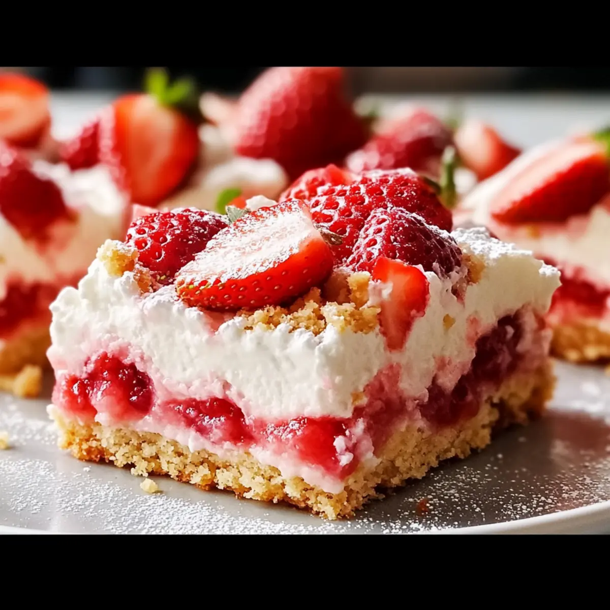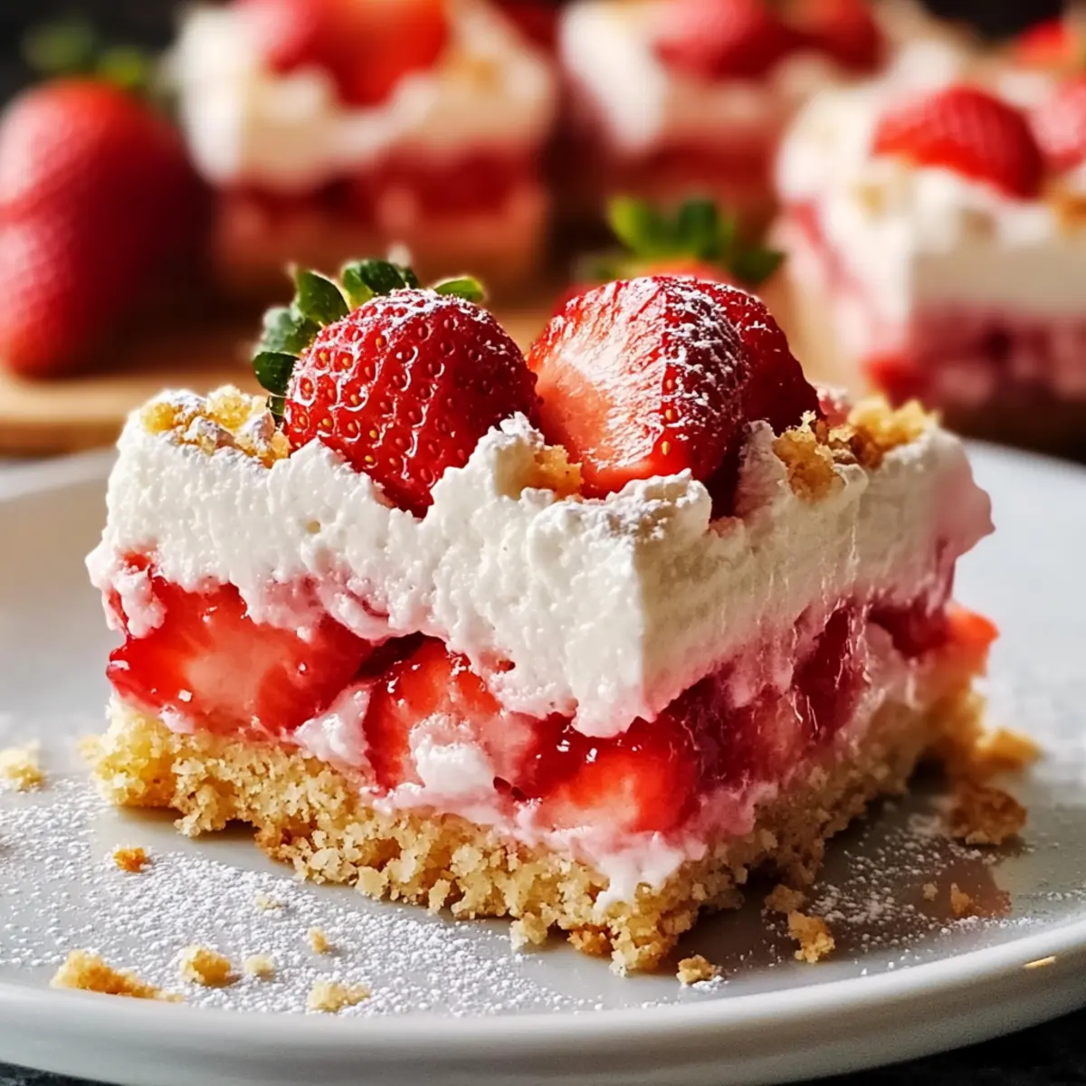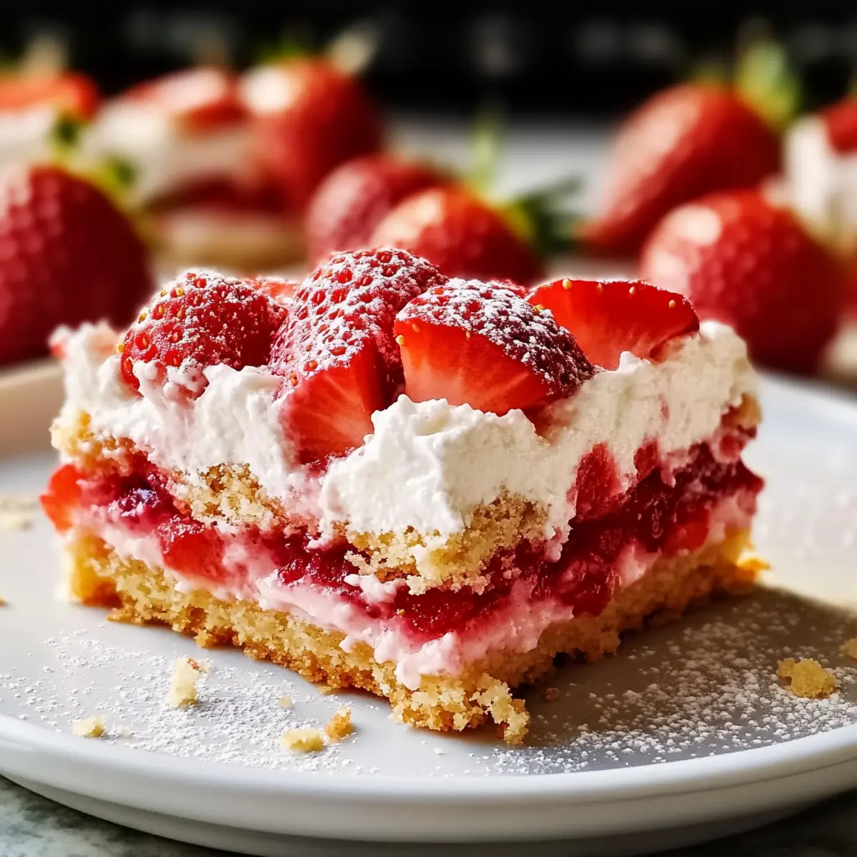 The sun is shining, and the sweet aroma of strawberries fills the air—summer is here, bringing with it the perfect time for a light and airy dessert! These Strawberry Shortcake Bars are my go-to recipe for gatherings, transforming the classic treat into an easy-to-slice version that’s made for sharing. Not only are they a great crowd-pleaser, but prepping these bars is a breeze, allowing you to spend more time enjoying the company of friends and family. With the option to make them gluten-free, everyone can indulge! Trust me, each bite is a delightful mix of soft shortcake layered with juicy strawberries, creating a taste of summer you won’t want to miss. Ready to discover how simple and satisfying this treat can be? Let’s dive into the delicious details! What Makes This Dessert Unforgettable? Irresistible summer flavors: The combination of juicy strawberries and buttery shortcake brings a refreshing taste to warm days. Easy-to-prepare: With simple ingredients and straightforward steps, you can whip up these Strawberry Shortcake Bars in no time! Versatile options: Experiment with different fruits like blueberries or raspberries for a unique twist, or add a layer of lemon curd for extra zing. Gluten-free friendly: You can easily substitute all-purpose flour with a gluten-free blend, ensuring everyone can enjoy this delicious dessert. Perfect for sharing: Slice these bars for gatherings, picnics, or a cozy family dessert—everyone will love them! For more delightful treats, check out my Nutella Cheesecake Bars or Oatmeal Crumble Bars for a sweet variety. Strawberry Shortcake Bars Ingredients For the Shortcake Base Butter – Provides richness and moisture; use room temperature for better incorporation. Sugar – Sweetens both the base and filling; can substitute with alternatives to meet dietary needs. Eggs – Binds ingredients and adds structure; make sure they are at room temperature for optimum mixing. All-Purpose Flour – Forms the base structure; for gluten-free Strawberry Shortcake Bars, use a 1:1 gluten-free flour blend. Baking Powder – Acts as a leavening agent, ensuring lightness; check its freshness for best results. For the Strawberry Filling Strawberries – Fresh fruit adds flavor and moisture; you can substitute with jam or frozen strawberries, ensuring to drain well after thawing. For the Optional Topping Whipped Cream – Provides a creamy finish; ideal to add fresh just before serving, as it doesn’t freeze well. Step‑by‑Step Instructions for Strawberry Shortcake Bars Step 1: Prep Dough Begin by creaming together ½ cup of softened butter and 1 cup of sugar in a large mixing bowl until the mixture is light and fluffy, about 2–3 minutes. Add 2 room-temperature eggs, one at a time, ensuring each is fully incorporated before adding the next. Gradually mix in 2 cups of all-purpose flour, 2 teaspoons of baking powder, and a pinch of salt until just combined; be careful not to overmix. Step 2: Bake Base Preheat your oven to 350°F (175°C). Grease and line an 8×8-inch baking pan with parchment paper, allowing some overhang for easy removal later. Spread the prepared dough evenly into the pan, smoothing the top with a spatula. Bake in the preheated oven for 30-35 minutes or until the top is golden and a toothpick inserted in the center comes out clean. Let it cool. Step 3: Prepare Filling Once the shortcake base has cooled completely, rinse and slice about 2 cups of fresh strawberries, removing the green tops. Layer the sliced strawberries evenly over the cooled shortcake base, ensuring they’re spread out to avoid sogginess. This fresh strawberry filling adds a delightful burst of flavor to your Strawberry Shortcake Bars. Step 4: Add Topping (optional) If you’d like to elevate your Strawberry Shortcake Bars, consider adding a layer of homemade whipped cream. In a mixing bowl, whip 1 cup of heavy cream with 2 tablespoons of powdered sugar until soft peaks form. Gently spread the whipped cream over the strawberries, creating a luscious topping. Serve immediately for the best texture. Step 5: Slice & Serve Allow the Strawberry Shortcake Bars to chill in the refrigerator for about an hour if you’ve added whipped cream. This cooling step helps the layers set up nicely. Using the parchment paper overhang, lift the bars out of the pan and cut them into squares or rectangles. Serve chilled, but keep any leftovers stored in an airtight container for up to 5 days. Strawberry Shortcake Bars Variations Feel free to get creative and personalize your Strawberry Shortcake Bars with these fun twists! Berry Medley: Swap strawberries for a mix of blueberries and raspberries for an exciting flavor combination. The vibrant colors will make your bars even more appealing! Zesty Lemon Layer: Add a layer of lemon curd between the shortcake and strawberries for a refreshing citrus kick. This twist brightens the flavor profile wonderfully! Cream Cheese Frosting: Replace the whipped cream with a rich cream cheese frosting for a decadent touch. The tangy frosting complements the sweetness of the strawberries perfectly! Chocolate Drizzle: Melt some dark chocolate and drizzle it over the top for a touch of indulgence. This added flavor creates a delightful contrast with the fresh fruit. Nutty Addition: Sprinkle chopped nuts like slivered almonds or pecans in the shortcake batter for an extra crunch. This twist adds unique texture and flavor, making each bite exciting! Coconut Twist: Incorporate shredded coconut into the shortcake base for a tropical vibe. Each bite will remind you of sun-filled days at the beach! Gluten-Free Delight: Use a gluten-free flour blend to keep the same wonderful texture while accommodating dietary preferences. Your loved ones will never know the difference! For more ways to enjoy sweets, don’t miss out on my delightful Red Velvet Strawberry or the rich and comforting Salted Caramel Bars. Let your imagination soar in the kitchen! Make Ahead Options These