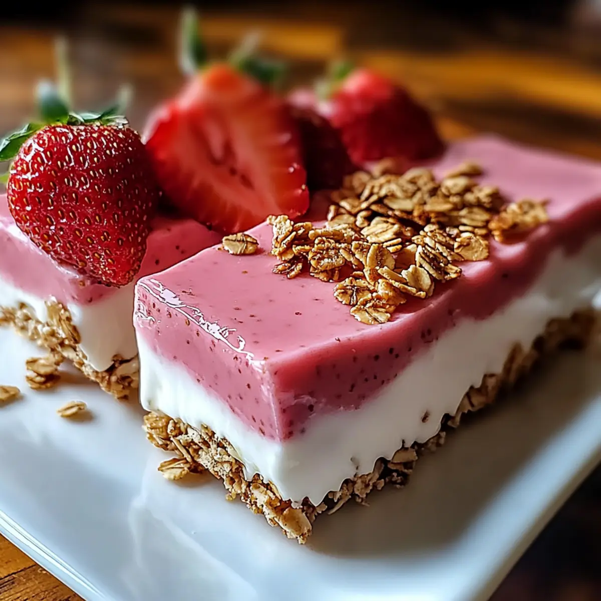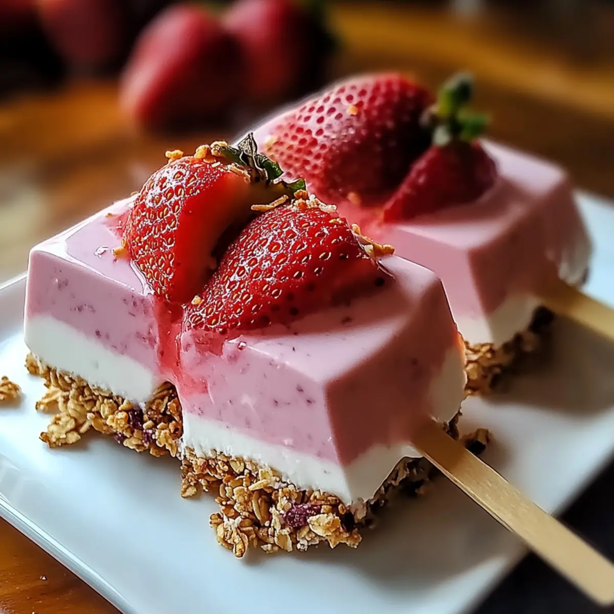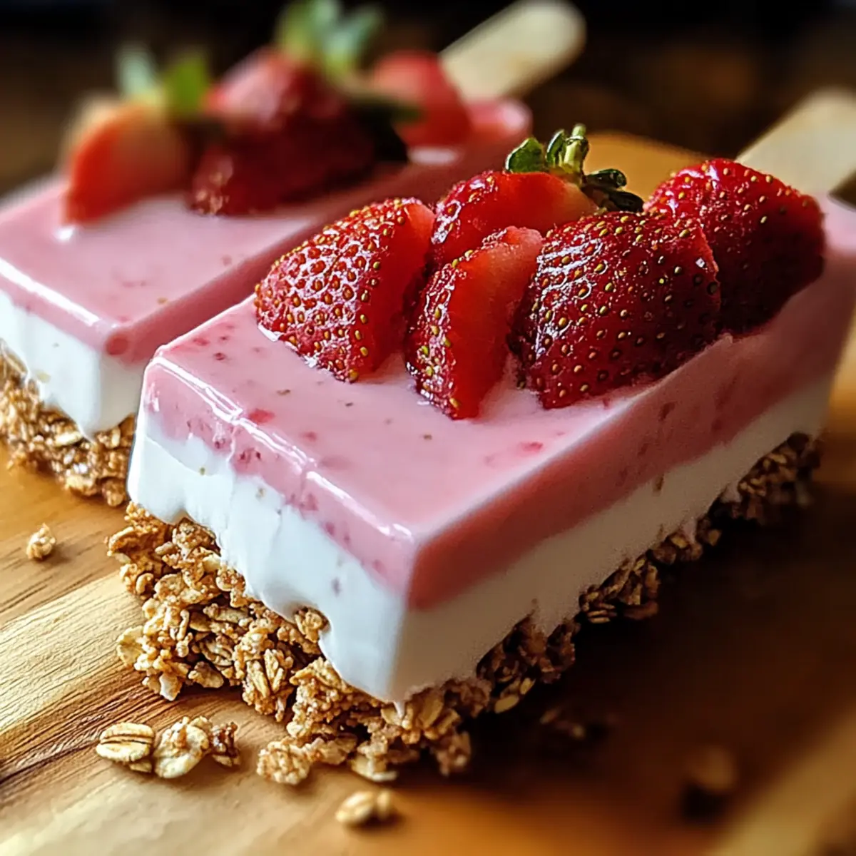 As I unpacked the summer picnic basket, I discovered a comforting surprise: I had tucked away a batch of Layered Strawberry Yogurt Bars, each slice a treasure of creamy yogurt and crunchy granola. These bars aren’t just a feast for the eyes; they’re a healthy, no-bake treat that effortlessly combines nature’s sweetness with a rich, satisfying texture. Perfect for those busy afternoons or family gatherings, they come together quickly and are endlessly customizable. Whether you prefer a burst of fresh strawberries or a playful twist with tropical fruits, these bars are your ticket to a refreshing indulgence. Want to learn how to make them and explore some fun variations? Let’s dive in! Why Make Strawberry Yogurt Bars? Quick and Easy: These no-bake Strawberry Yogurt Bars come together in no time, making them perfect for busy summer days. Healthy Treat: Packed with protein and fresh fruit, they are a guilt-free indulgence that you can feel good about serving. Customizable Flavors: Whether you want to try a berry medley or a tropical delight, the recipe is flexible to suit your taste. Family-Friendly: Kids and adults alike will adore the colorful layers and crunchy granola base, making them a hit at any gathering. Make-Ahead Convenience: Prepare these bars in advance for effortless summer snacking, just like with my popular Nutella Cheesecake Bars or Oatmeal Crumble Bars. Experience the joy of bringing together fresh flavors and delightful textures in this refreshing treat! Strawberry Yogurt Bars Ingredients Here’s everything you need to create these delightful Strawberry Yogurt Bars! For the Granola Base Granola – Provides texture and crunch; feel free to swap in gluten-free granola for a gluten-free option. Melted Coconut Oil – Binds the granola mixture together; substitute with melted butter or another oil if needed. Honey – Acts as a natural sweetener; for a vegan alternative, use maple syrup instead. White Chocolate Chips – Adds sweetness and creamy flavor; omit for a dairy-free version or replace with dark chocolate. For the Yogurt Layers Plain Greek Yogurt – Offers a smooth, creamy texture and is packed with protein; can be replaced with plant-based yogurt for a dairy-free option. Vanilla Greek Yogurt – Introduces extra sweetness and flavor; feel free to use your favorite flavored yogurt to mix things up. Fresh Strawberries – Infuses vibrant color and natural sweetness; frozen strawberries work as a good substitute if fresh aren’t available. Lemon Juice – Brightens the flavor beautifully; fresh lime juice can be used as an alternative for a zesty twist. Vanilla Extract – Enhances the overall flavor of your bars; swap it with lemon extract for a refreshing touch. Enjoy making these Strawberry Yogurt Bars and bring a burst of summer goodness to your table! Step‑by‑Step Instructions for Layered Strawberry Yogurt Bars Step 1: Prepare Strawberry Puree Start by blending 1½ cups of fresh strawberries with a tablespoon of honey and a squeeze of lemon juice in a blender until smooth. This vibrant puree should achieve a lovely, bright color. Set it aside in a bowl while you move on to the yogurt layers, allowing the flavors to meld together. Step 2: Mix Yogurt Layers In a mixing bowl, combine 1 cup of vanilla Greek yogurt with an additional tablespoon of honey and a splash of vanilla extract. Stir until smooth and creamy. In another bowl, take your prepared strawberry puree and fold in 1 cup of plain Greek yogurt along with a handful of diced strawberries. The mixture should have a lovely marbled appearance. Step 3: Combine Granola Base In a separate bowl, mix together your granola, melted coconut oil, and the remaining honey until thoroughly combined. If using white chocolate chips, melt them gently and mix in to enhance the sweetness. The granola mixture should hold together when you press it with your fingers, creating a sturdy base for your Strawberry Yogurt Bars. Step 4: Assemble Popsicles Take your popsicle molds and firmly press the granola mixture into the bottom, about halfway up each mold. Pour in the vanilla yogurt layer, filling it to the top, then tap the molds gently on the counter to release any air bubbles. Lastly, spoon in the strawberry yogurt mixture, leaving a little space at the top for expansion as they freeze. Step 5: Freeze Insert popsicle sticks into the molds and place them in the freezer. Allow the Layered Strawberry Yogurt Bars to freeze for at least 4 hours, or ideally overnight, until solid. You want them to be firm to the touch and easy to unmold for serving later on. Step 6: Unmold Popsicles To remove your Strawberry Yogurt Bars, run warm water over the outside of the molds for a few seconds to loosen them. Gently pull on the sticks to release the bars, taking care not to squeeze too hard. Serve your refreshing bars immediately, or keep them in an airtight container in the freezer until you’re ready to enjoy! Storage Tips for Strawberry Yogurt Bars Fridge: Keep your Strawberry Yogurt Bars in an airtight container in the refrigerator for up to 3 days to maintain freshness and flavor. Freezer: For longer storage, freeze the bars in an airtight container for up to 2 weeks. Thaw them in the refrigerator before serving for the best texture. Serving: To enjoy the bars at their best, allow them to sit at room temperature for a few minutes after thawing, ensuring a creamy texture that’s easy to bite into. Reheating: There’s no need to reheat these delicious bars; simply thaw and enjoy as a refreshing cold treat! What to Serve with Layered Strawberry Yogurt Bars These delightful treats are best enjoyed alongside complementary flavors and textures that elevate your summer snacking experience. Light Lemon Shortbread Cookies: Their buttery texture balances the creamy yogurt bars beautifully. A refreshing, zesty bite will enhance the fruity flavors. Sparkling Lemonade: The effervescent fizz of this drink cuts through the creaminess, pro