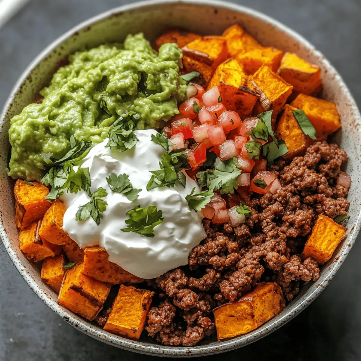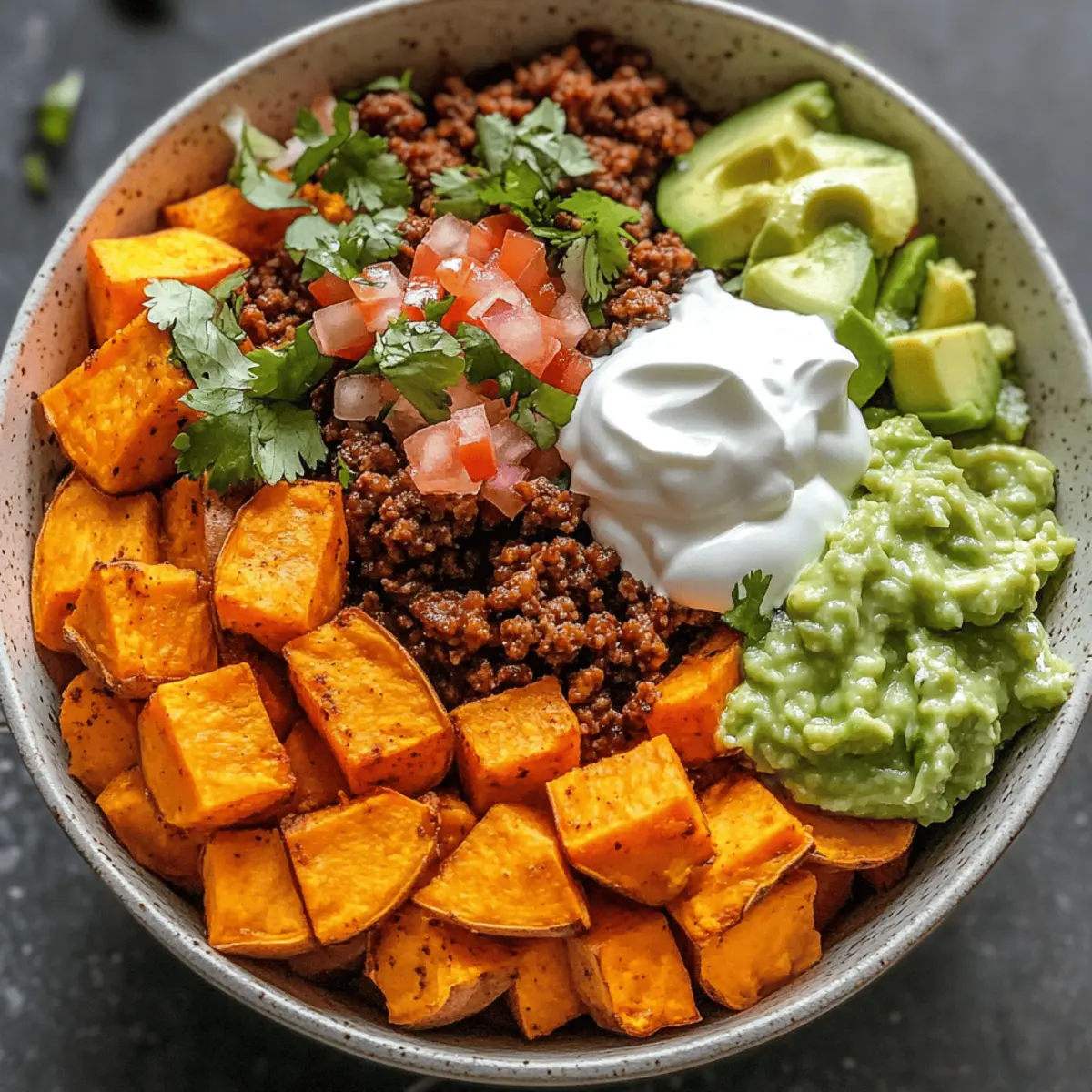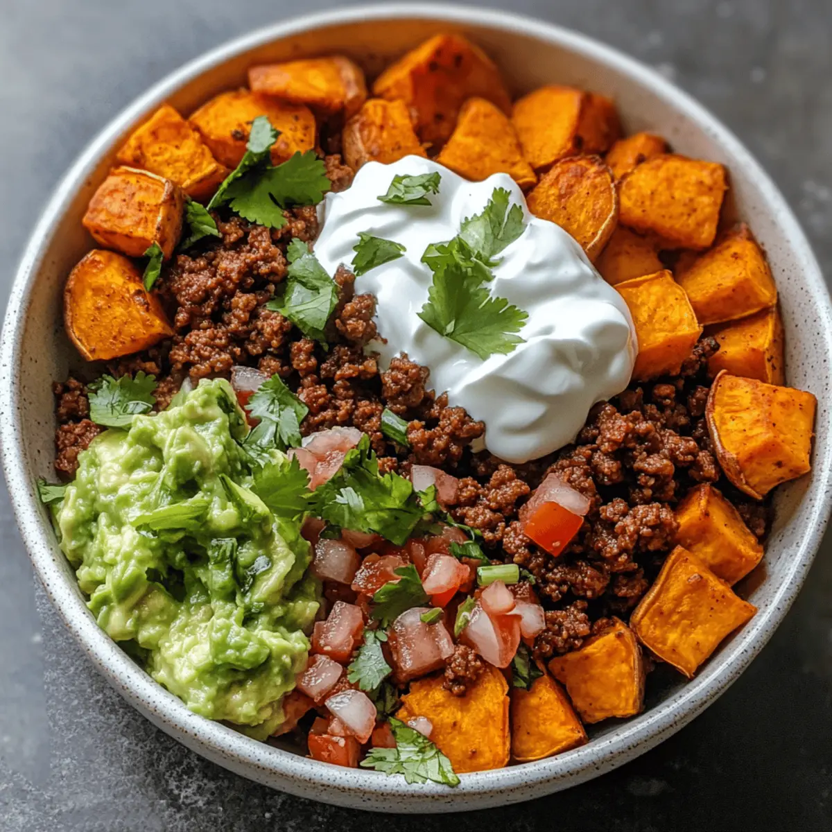 The aroma of roasted sweet potatoes dancing in the oven reminds me of cozy family dinners filled with laughter and good food. Enter the Sweet Potato Taco Bowl—a colorful, nutrient-packed dish that’s not only visually stunning but incredibly adaptable. This recipe is a celebration of flavors and textures, showcasing tender sweet potatoes, seasoned protein options, and zesty toppings that make it a perfect fit for meal prep or weekday indulgence. With its ability to cater to different dietary needs, including vegetarian and vegan swaps, it’s a healthy comfort food that doesn’t compromise on taste. Ready to transform your weeknight meals into something sensational? Let’s dive into making this delightful bowl! Why choose the Sweet Potato Taco Bowl? Customization Galore: Your taste buds will rejoice with the endless options! Whether you prefer beef, turkey, or lentils, each swap adds its own twist. Meal Prep Friendly: Prepare components ahead of time, making busy weeknights a breeze. Just assemble and enjoy whenever hunger strikes! Healthy Comfort Food: Indulge guilt-free with this nourishing dish packed with vitamins, fiber, and healthy fats. It’s comfort food that fuels your body! Vibrant Flavors: From smoky paprika to zesty lime, each bite bursts with freshness, ensuring your dinner is anything but boring. Kid-Friendly: The colorful ingredients and appealing textures make it a hit for the whole family—perfect for inviting your kids to help assemble! For more delicious dinners, consider trying this Mediterranean Salmon Bowl for a satisfying twist or enjoy the bold flavors of Spicy Shrimp Tacos for something extra special on taco night! Sweet Potato Taco Bowl Ingredients Dive into the vibrant world of the Sweet Potato Taco Bowl with these essential ingredients! For the Sweet Potatoes • Sweet Potato – The star ingredient providing natural sweetness and fiber. Substitution: Try butternut squash for a fall twist. • Olive Oil – Essential for roasting, enhancing flavor. Substitution: Use avocado oil for a high smoke point. • Smoked Paprika – Gives the sweet potatoes a delicious smoky depth. Note: Regular paprika is a milder option. For the Protein • Ground Beef – A hearty base; perfect for traditionalists. Substitution: Swap with ground turkey or lentils for a veggie-friendly dish. • Taco Seasoning – Provides that classic taco flavor; can easily be homemade. Note: Add chili powder and cumin for a quick blend. For the Toppings • Pico de Gallo – Fresh and zesty, adding a crunchy element. Note: Use store-bought salsa if you’re short on time. • Guacamole – Creamy and balanced, it enriches every bite. Note: A simple avocado mash with lime can work wonders. • Sour Cream – A tangy element to complement the flavors. Substitution: Use cashew cream for a dairy-free alternative. • Cilantro – A fresh garnish that brightens up the dish. For Serving • Lime Wedges – Adds a necessary brightness and elevates all flavors. • Tortilla Chips – Optional but fun for scooping up your delicious bowl! Step‑by‑Step Instructions for Sweet Potato Taco Bowl Step 1: Roast Sweet Potatoes Preheat your oven to 425°F (220°C). In a large bowl, toss the cubed sweet potatoes with olive oil, smoked paprika, salt, and pepper until evenly coated. Spread the sweet potatoes in a single layer on a baking sheet. Roast for 15 minutes, then flip the cubes and roast for an additional 10-15 minutes, or until they are golden brown and tender when pierced with a fork. Step 2: Cook Beef While the sweet potatoes are roasting, heat a skillet over medium heat. Add the ground beef to the hot pan and cook, breaking it up with a spoon, until browned and fully cooked, about 5-7 minutes. Once the beef is browned, drain any excess fat if necessary. Stir in the taco seasoning and 2 tablespoons of water, allowing it to simmer for 2-3 minutes until the flavors meld together beautifully. Step 3: Prepare Toppings As the beef cooks, prepare your fresh toppings for the Sweet Potato Taco Bowl. Chop your pico de gallo ingredients finely and mix them in a bowl. Next, mash ripe avocados with lime juice and salt to create a creamy guacamole. If you’re using sour cream, have that ready as well. This assembly of vibrant toppings will elevate the flavors in your taco bowl. Step 4: Assemble Bowls Once the sweet potatoes are roasted and the beef is seasoned, it’s time to assemble your Sweet Potato Taco Bowl! Start with a generous layer of the roasted sweet potatoes in each bowl, followed by the spiced ground beef. Add dollops of pico de gallo, guacamole, and sour cream on top as colorful garnishes. Step 5: Garnish and Serve Finish your Sweet Potato Taco Bowl with a sprinkle of fresh cilantro for an aromatic touch and serve with lime wedges on the side. If you like a little crunch, include tortilla chips for dipping. Enjoy the burst of flavors and textures in each bite, celebrating a wholesome and delightful meal! Sweet Potato Taco Bowl Variations Feel free to mix and match these variations to create your perfect Sweet Potato Taco Bowl! Protein Swaps: Substitute ground beef with ground turkey or lentils for a hearty twist. Each protein provides unique flavors and textures! Plant-Based Delight: Opt for black beans or chickpeas instead of meat for a satisfying vegetarian option. Add in some spices for an extra flavor boost! Exotic Twist: Try using seasoned pork or chorizo for a more decadent experience. You’ll savor the rich, zesty flavor that will excite your taste buds. Different Bases: Swap sweet potatoes for vibrant quinoa or fresh greens for a lighter bowl. This change brings a refreshing take to your meal prep routine! Creamy Avocado Swap: If you want to mix it up, use a delicious tahini sauce instead of guacamole. It adds a nutty richness that pairs beautifully with the bowl. Extra Cheesy: Add shredded cheese on top before serving for a gooey, melty touch. Cheese lovers will rejoice at the added la