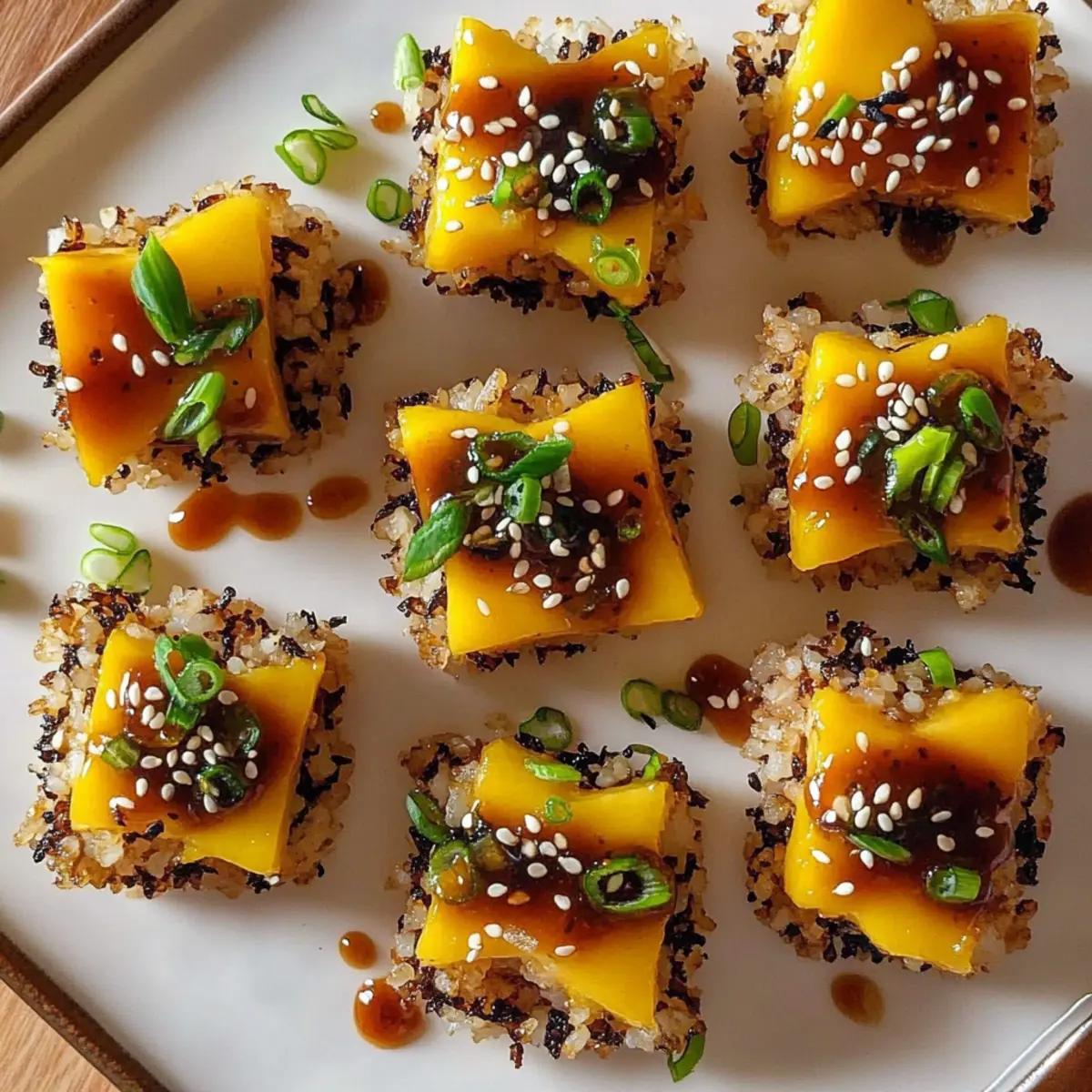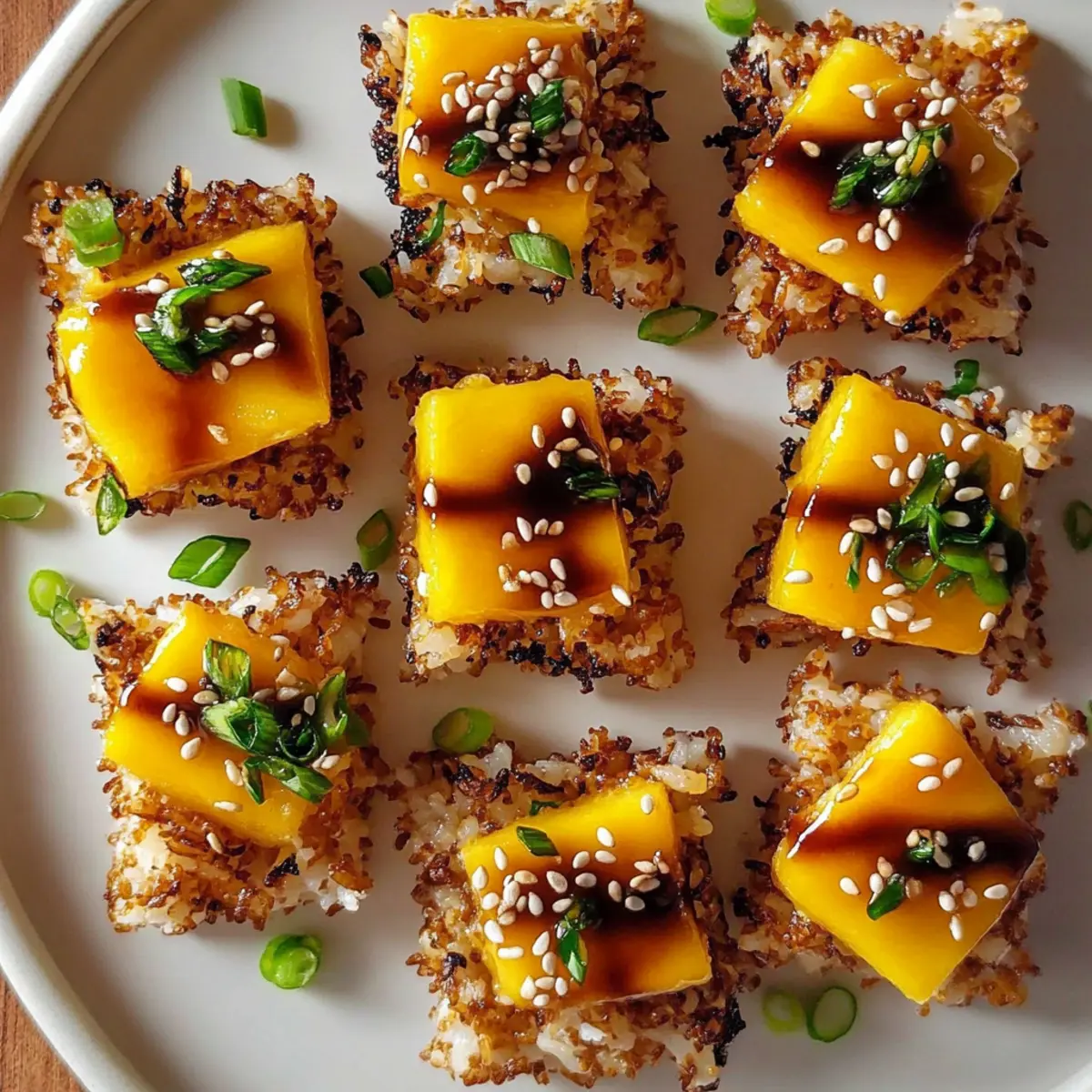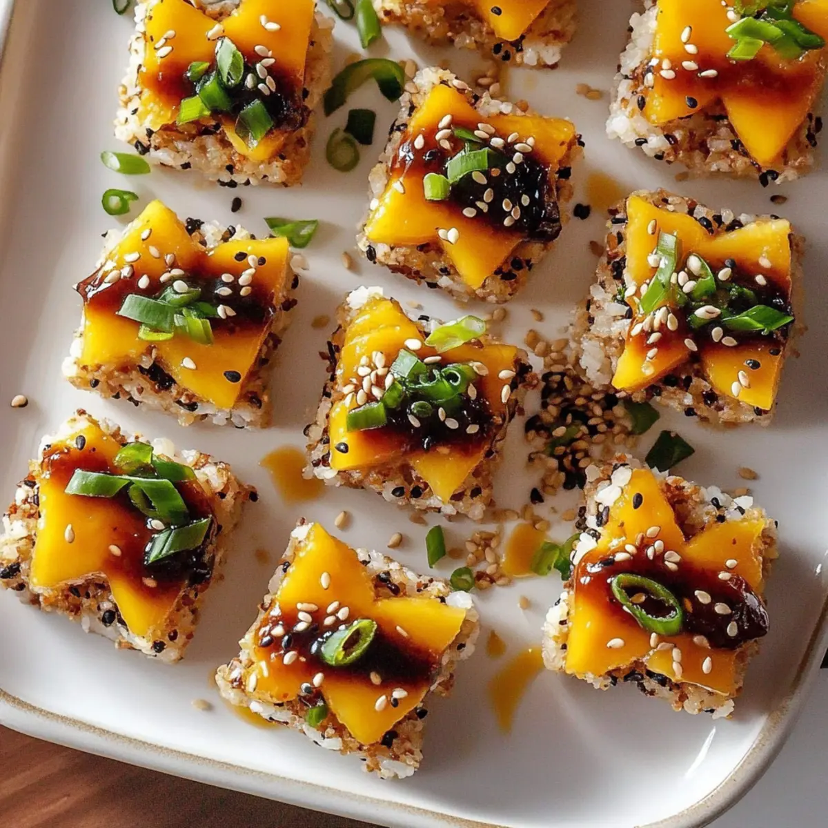 As I stood in my kitchen, the aroma of toasted sesame filled the air, drawing me closer to a colorful mound of crispy rice sushi. This creation, my Swicy Mango Crispy Rice Sushi, is a joyful blend of sweetness and spice that’s perfect for any occasion. Whether you’re aiming to impress at a gathering or looking for a quick yet delightful lunch, these bites are not just visually stunning but also vegetarian and dairy-free. The magic lies in the contrast of crispy, air-fried sushi rice and the brilliant, sweet mango tartare, enhanced by a drizzle of creamy gochujang mayo. Plus, with easy ingredient substitutions like avocado or pineapple, you can customize the flavors to match your cravings. Are you ready to take a delicious leap into this fun fusion dish? Why Will You Crave This Dish? Flavor Explosion: Each bite combines sweet mango and spicy gochujang mayo, creating an irresistible taste sensation that lingers delightfully on your palate. Crispy & Fresh: The air-fried sushi rice provides a golden crunch, perfectly complementing the fresh, juicy mango tartare and crunchy cucumbers. Quick & Easy: With simple steps and minimal prep, this recipe is perfect for busy weeknights or last-minute gatherings. Versatile Variations: Feel free to swap mango for avocado or pineapple to cater to your mood or dietary needs, ensuring everyone can indulge! Perfect Presentation: These vibrant bites make an eye-catching appetizer that is sure to impress your guests, much like my Shrimp Tacos Mango or a delightful pairing with a Sticky Chicken Rice. Crowd-Pleaser: This dish will quickly become a favorite at any gathering, satisfying the cravings of both vegetarian and non-vegetarian guests alike! Swicy Mango Crispy Rice Sushi Ingredients For the Sushi Rice • Sushi Rice – Essential for structure; rinse thoroughly for optimal texture. • Water – Necessary to cook the rice correctly, creating the ideal consistency. • Rice Vinegar – Adds tanginess and enhances the overall flavor profile. • Sugar – Balances the acidity of the rice vinegar beautifully. • Salt – Essential for elevating all the flavors in this dish. For Air-Frying • Neutral Oil Spray – Ensures a golden crispness when air-frying the rice squares. For the Tartare • Mango – The star ingredient that adds sweetness; avocado or pineapple can be great substitutes! • Cucumber – Adds a refreshing crunch to each bite. • Red Onion – Offers a sharp contrast to the sweetness of the mango. • Lime Juice – Brightens the flavor and adds a touch of acidity. • Soy Sauce (or Tamari for gluten-free) – Delivers umami and depth. • Sesame Oil – Introduces a pleasant nutty aroma. • Sesame Seeds – Enhances texture and garnishes the dish beautifully. • Chili Flakes – Adds a hint of heat to ignite your taste buds. • Salt – For seasoning the tartare to perfection. For the Gochujang Mayo • Mayonnaise (or vegan mayo) – Creates a creamy base for the sauce. • Gochujang – A Korean chili paste that provides heat and robust flavor to the mayo. • Honey or Maple Syrup – Adds sweetness balancing the mayo’s richness. For Garnish • Nori – Enhances presentation, giving that classic sushi touch. • Extra Sesame Seeds and Scallions – Fresh garnishes for texture and a burst of flavor. Dive into this delightful Swicy Mango Crispy Rice Sushi and invite your taste buds for an unforgettable journey! Step‑by‑Step Instructions for Swicy Mango Crispy Rice Sushi Step 1: Prepare Sushi Rice Begin by rinsing the sushi rice under cool water until the water runs clear, which helps achieve the perfect texture. Combine the rinsed rice with water in a pot, bringing it to a boil. Once boiling, reduce the heat to low, cover, and simmer for 15 minutes. After cooking, remove from heat and let it sit for 10 minutes to steam and soften further. Step 2: Season Rice In a small bowl, whisk together rice vinegar, sugar, and salt until dissolved. Once the sushi rice is slightly cooled, gently fold the vinegar mixture into the rice using a spatula, ensuring all grains are coated for beautifully balanced flavor. Set the seasoned rice aside to cool completely, allowing the flavors to meld together. Step 3: Shape Rice Line a small baking dish with parchment paper and evenly press the cooled sushi rice into the bottom to create a compact layer, about 1 inch thick. Make sure to pack it tightly for optimal crispiness in the next steps. Cover the dish with plastic wrap and refrigerate for at least 30 minutes, allowing the rice to firm up. Step 4: Air-Fry Rice Preheat your air fryer to 400°F (200°C). Remove the chilled rice from the fridge and cut it into rectangles or squares. Lightly spray each piece with neutral oil, using just enough to achieve a golden crust. Place the rice squares in the air fryer basket in a single layer and cook for 12-15 minutes, flipping halfway through until they turn golden and crispy. Step 5: Prepare Mango Tartare While the rice is air-frying, dice the fresh mango, cucumber, and red onion. In a mixing bowl, combine these ingredients with lime juice, soy sauce (or tamari for a gluten-free option), sesame oil, sesame seeds, chili flakes, and a pinch of salt. Gently mix until incorporated, adjusting the seasoning to your taste for the vibrant mango tartare. Step 6: Make Gochujang Mayo In another bowl, whisk together mayonnaise (or vegan mayo), gochujang, lime juice, and honey or maple syrup until smooth and creamy. Taste the mixture to balance the sweetness and heat to your liking—this sauce will elevate your Swicy Mango Crispy Rice Sushi with a delightful kick. Step 7: Assemble Bites Carefully take the crispy rice squares out of the air fryer and start building your sushi bites. Top each square generously with the mango tartare and drizzle with the creamy gochujang mayo. For a final touch, garnish with nori strips, extra sesame seeds, and finely sliced scallions to enhance texture and flavor. Serve these colorful