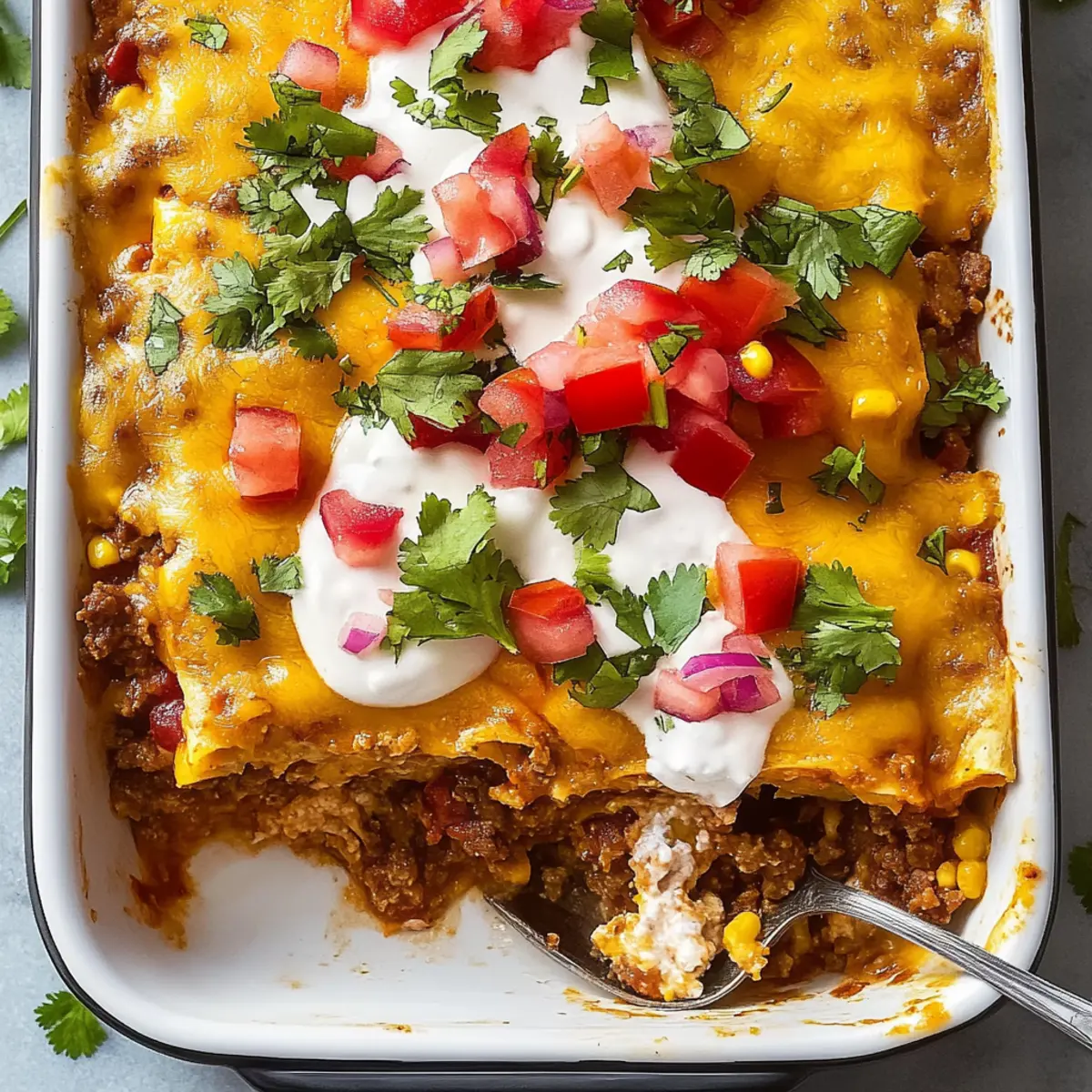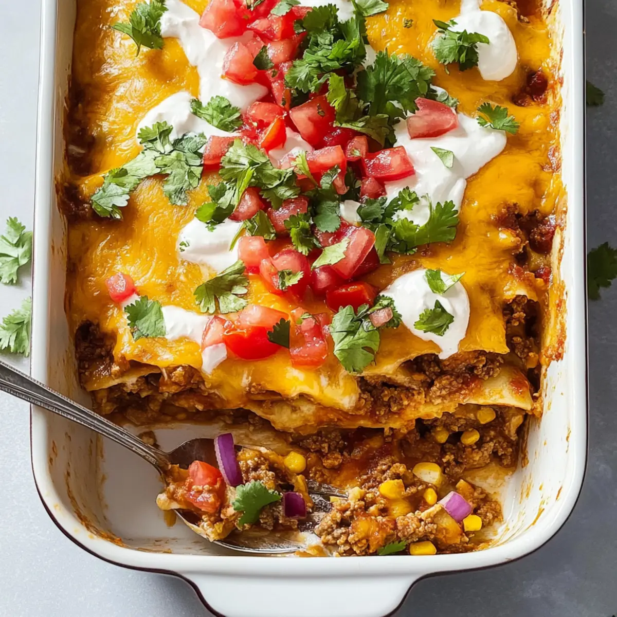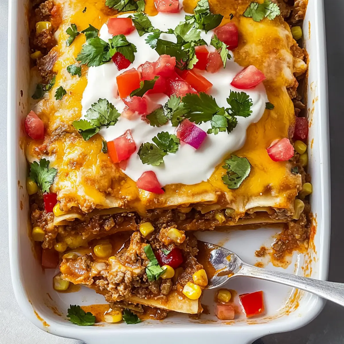 The sizzling sound of a tortilla hitting a hot skillet always takes me back to my childhood kitchen, where family dinners were the heart of our home. This Hearty Taco Lasagna brilliantly marries the zesty flavors of Tex-Mex with the comforting nostalgia of a cheesy casserole. Packed with layers of seasoned beef, creamy corn, and gooey cheese, this dish is not just a meal—it’s a culinary hug. Perfect for busy weeknights, it comes together in under 1.5 hours, making it a quick win for those of us juggling work and family. Plus, this recipe offers fantastic flexibility, accommodating dietary preferences with gluten-free options and vegetarian alternatives. Who’s ready to dive into this delicious twist on taco night? Why is Taco Lasagna a Must-Try? Flavor Explosion: The rich combination of seasoned beef, spicy salsa, and creamy corn creates a vibrant taste sensation that excites the palate. Family-Friendly: This recipe is designed for all ages, ensuring everyone around the table leaves happy and satisfied. Quick Preparation: Ready in under 1.5 hours, it’s perfect for busy weeknights when time is of the essence. Adaptable Options: Create a version with gluten-free tortillas or substitute meat for veggie crumbles, making it flexible for dietary needs. Comforting Layers: Each slice of lasagna reveals gooey cheese and tender tortillas, offering a cozy, satisfying meal everyone craves. Bring this Hearty Taco Lasagna to your next dinner, and watch it become a favorite, just like our Chicken Rolled Tacos! Taco Lasagna Ingredients Here’s everything you’ll need to create this comforting dish: For the Filling Vegetable Oil – Ideal for greasing the pan and sautéing vegetables; olive oil is a great substitute if desired. Medium Yellow Onion – Adds sweetness and depth of flavor; red onion can be used for a sharper bite. Bell Pepper – Brings color and crunch; try any sweet pepper variety as an alternative. Garlic – Elevates the aroma and flavor; use fresh for the best results or garlic powder in a pinch. Ground Beef (85% lean) – Provides a hearty protein base; substitute with ground turkey, chicken, or veggie crumbles for a leaner option. Kosher Salt & Freshly Ground Black Pepper – Essential for seasoning; taste and adjust to your preference. Chili Powder – Imparts the main flavor profile; taco seasoning is an easy and quick substitute. All-Purpose Flour – Thickens the sauce and adds structure; skip it for a gluten-free version. Ground Cumin – Infuses earthiness; omit only if you don’t have it on hand. Black Beans (15-oz can) – Boosts fiber and protein content; pinto beans or omitting them altogether are good alternatives. Medium Salsa (15-oz jar) – Adds moisture and a flavor punch; choose based on your spice preference (mild, medium, or hot). For the Layers Flour Tortillas (8-inch) – Forms the delicious layers in the lasagna; corn tortillas work well for a gluten-free option. Sharp Cheddar Cheese – Delivers that classic cheesy flavor; feel free to substitute with Monterey Jack or mozzarella. Pepper Jack Cheese – Imparts a bit of spice and creaminess; omit or use a milder cheese if you prefer. Creamed Corn (14.75-oz can) – Sweetens and adds moisture; sweet corn is a lower sugar alternative. For Garnishing Sour Cream – Adds creaminess; Greek yogurt could be a healthier substitute. Chopped Tomatoes – Provides freshness and visual appeal. Chopped Fresh Cilantro – Adds a bright, herbal note to finish off your dish. With these ingredients, you’ll be ready to dive into making your delicious Taco Lasagna that is sure to be a hit at your dinner table! Step‑by‑Step Instructions for Taco Lasagna Step 1: Preheat and Prepare Preheat your oven to 400°F (200°C). While the oven heats, grease a 13″x9″ baking dish with vegetable oil to prevent sticking. This step is essential to ensure easy serving later on, so don’t skip it! Also, gather your ingredients to streamline the cooking process. Step 2: Sauté the Vegetables In a large skillet, heat a drizzle of vegetable oil over medium heat. Add the chopped onion and bell pepper, stirring occasionally for about 5–7 minutes or until they become tender and aromatic. You’re aiming for a soft texture and a lightly golden color, which will help develop a rich flavor base for your Taco Lasagna. Step 3: Cook the Meat Next, add minced garlic and ground beef to the skillet, breaking up the meat as it cooks. Stir and cook for about 8–10 minutes until the beef is browned and any excess fat is drained away. This step is crucial as proper browning will enhance the overall flavor of your Taco Lasagna, creating a hearty filling. Step 4: Add Spices and Flour Once the beef is browned, sprinkle in chili powder, ground cumin, and all-purpose flour. Stir the mixture for an additional minute over heat, allowing the spices to bloom and the flour to absorb the juices. This will create a thick mixture that forms the flavorful heart of your lasagna. Step 5: Mix in Beans and Salsa Incorporate the black beans, salsa, and a splash of water into the skillet, scraping up any browned bits from the bottom as you mix. Allow this concoction to simmer for about 5 minutes, ensuring the flavors meld together. The richness will enhance your Taco Lasagna, making each layer deliciously savory. Step 6: Layer the Lasagna In the greased baking dish, spoon a layer of the meat mixture evenly across the bottom, followed by a layer of flour tortillas. Sprinkle a generous handful of sharp cheddar and pepper jack cheese over the tortillas, then add a layer of creamed corn. Repeat these layers, finishing with tortillas and the remaining cheese on the top. Step 7: Bake to Perfection Place the assembled Taco Lasagna in your preheated oven and bake for 30 minutes. Keep an eye out for bubbling edges and a golden, cheesy top; these are your visual cues to confirm it’s cooked through and ready to delight your family. Step 8: Garnish and Serve Once baked, remo