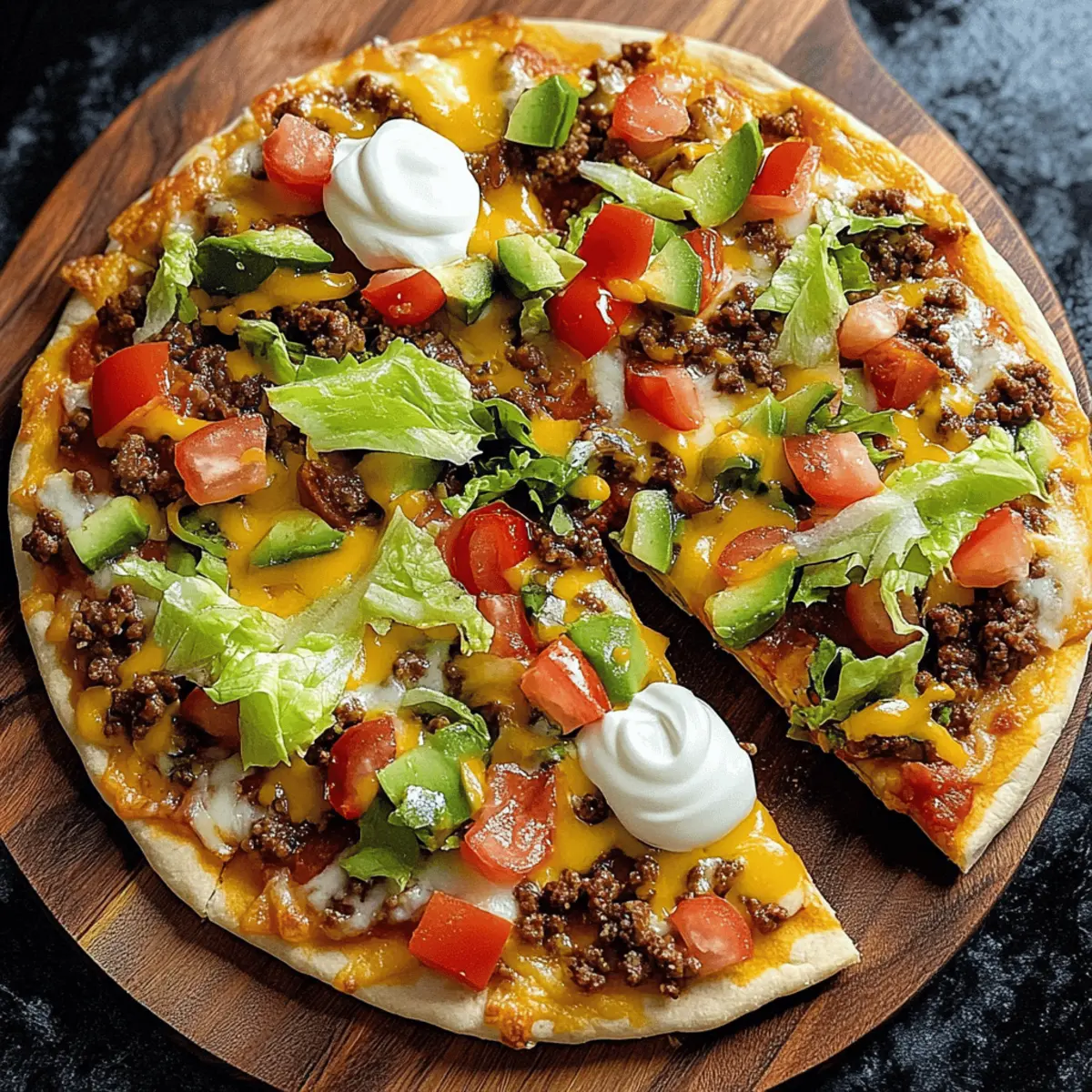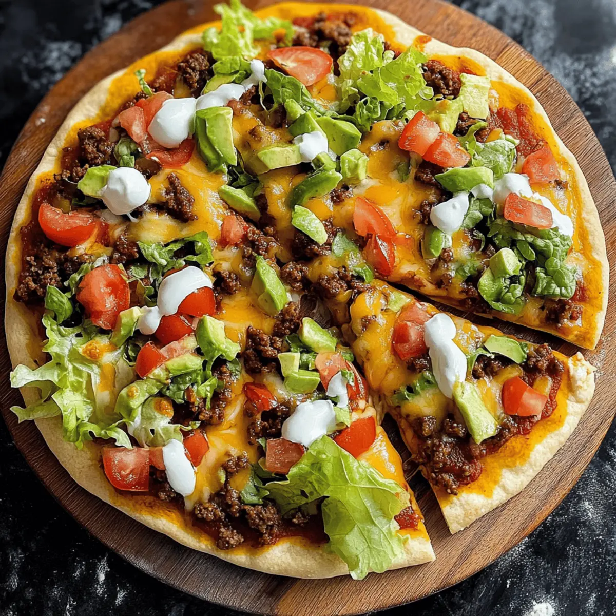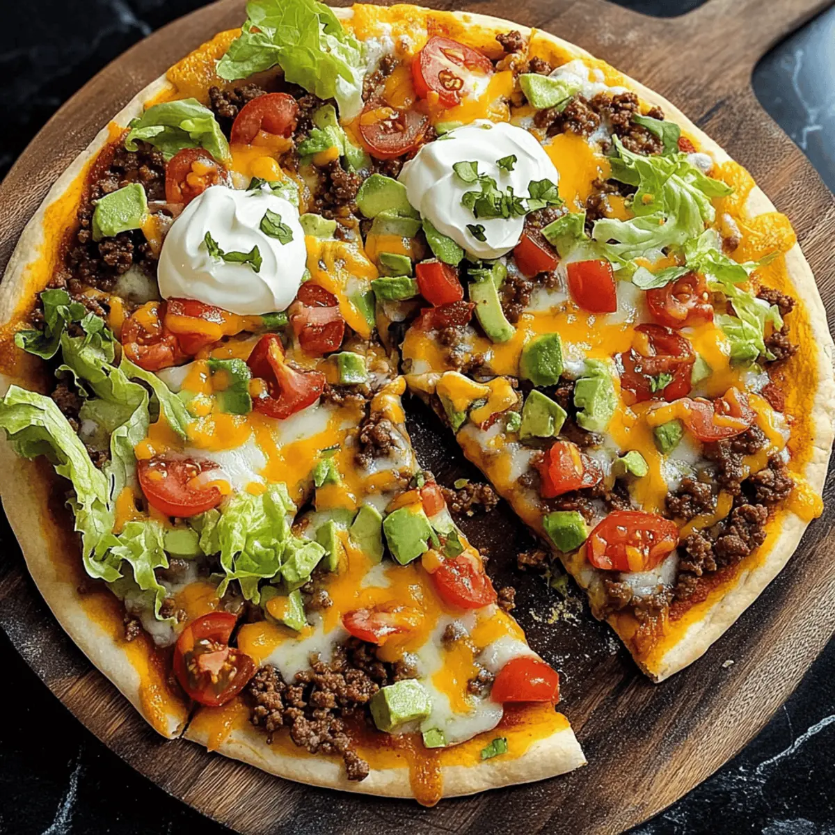 There’s nothing quite like that moment when the delicious aroma of Taco Pizza fills your kitchen, instantly turning ordinary weeknight dinners into a flavor-packed fiesta! As someone who loves to whip up homemade meals, I can assure you that this easy taco pizza recipe is a game-changer. With customizable toppings and a simple prep process, it’s the perfect solution for busy families craving something satisfying without the chaos of traditional taco night. Plus, with a crispy, cheesy crust, this dish is sure to become a centerpiece at your table. What unique toppings will you choose to create your own taco pizza masterpiece? What Makes Taco Pizza So Special? Simplicity: This recipe is incredibly easy to follow, perfect for even the busiest weeknights. Customizable: You can mix and match toppings to suit your family’s preferences—everyone gets their favorite! Flavor Fusion: Experience the delightful blend of taco spices with gooey cheese on a crispy pizza crust. Crowd-Pleaser: It’s a guaranteed hit for family dinners or casual get-togethers, always leaving everyone asking for more. Quick Prep: With a straightforward assembly process, you can have this delicious meal ready in under 30 minutes. Get ready to elevate your pizza night, and why not check out more ways to customize dinner with options like Taco Stuffed Avocados or a hearty Muffin Breakfast Pizza? Taco Pizza Ingredients For the Meat Ground Beef – Provides protein and flavor; easily substitute with ground turkey, chicken, or a vegetarian option. Taco Seasoning Packet – Adds essential spices for an authentic taco taste; homemade taco seasoning can also be a great choice. Water – Used to activate the taco seasoning; no substitutes are needed. For the Base Pizza Dough – Acts as the foundation; you can use homemade or store-bought, or swap it for flour tortillas for a crispier alternative. Refried Beans – Adds creaminess and helps toppings adhere; mixing with cream cheese enhances richness. Salsa or Taco Sauce – Imparts moisture and flavor; adjust based on your spice preference. For the Cheese Layer Shredded Cheddar – Gives a sharp, melty layer; mix with other cheese varieties for extra flavor. Shredded Mexican Blend – Brings in a flavorful cheese component; feel free to experiment with different cheese mixes. Mozzarella Cheese – Optional for added stretch and creaminess. For the Toppings Shredded Lettuce – Adds freshness and crunch for garnish. Diced Tomatoes – Brings juiciness and color; cherry tomatoes offer a sweeter option. Sour Cream – Contributes creaminess and tang; Greek yogurt is a healthier substitute. Black Olives – Slices add a briny flavor; you can omit them for a simpler pizza. Optional Toppings – Consider jalapeños, avocado, cilantro, or hot sauce for versatile and flavorful finishing touches. With these Taco Pizza ingredients, you’re just a few steps away from a delightful and flavorful meal that the whole family will love! Step‑by‑Step Instructions for Taco Pizza Step 1: Prep the Meat Begin by browning 1 pound of ground beef in a large skillet over medium heat for about 5-7 minutes, breaking it up as it cooks until no longer pink. Once browned, drain any excess grease, then stir in 1 packet of taco seasoning and 1/2 cup of water. Let it simmer for an additional 5 minutes until the mixture thickens, releasing that delightful taco aroma. Step 2: Prepare Dough While the meat is simmering, preheat your oven to 425°F (220°C). Roll out or stretch your pizza dough onto a pizza stone or a baking sheet lined with parchment paper. For extra flavor, brush the crust with olive oil or garlic butter. Pre-bake the crust for about 5 minutes until it’s just starting to set but not browned yet, ensuring a perfectly crisp base for your taco pizza. Step 3: Build Pizza Once the crust is pre-baked, spread a generous layer of refried beans over the surface to create a creamy base. Next, drizzle some salsa or taco sauce on top, then evenly distribute the cooked ground beef mixture across the pizza. Don’t forget to sprinkle a combination of shredded cheddar, mozzarella, and Mexican blend cheeses, covering the toppings to create a melty delicious layer. Step 4: Bake Carefully place the assembled taco pizza in the preheated oven, and bake for 12-15 minutes. Keep an eye on it; you want the cheese to bubble enticingly and the crust to turn a beautiful golden brown. When it’s ready, the kitchen will be filled with mouthwatering aromas, signaling it’s time to take your taco pizza out of the oven. Step 5: Add Fresh Toppings After allowing the taco pizza to cool for about 5 minutes, it’s time to elevate your creation with fresh toppings. Sprinkle shredded lettuce, diced tomatoes, and your favorite garnishes like sliced black olives and dollops of sour cream or Greek yogurt. This colorful addition not only enhances flavor but also adds a delightful crunch and freshness to your scrumptious taco pizza. What to Serve with Taco Pizza? Transform your delicious taco pizza into a complete meal with these perfect pairings that complement its bold flavors and textures. Creamy Guacamole: This luscious dip adds a buttery texture and fresh flavor, making it a fantastic companion to scoop alongside your pizza slices. Tangy Mexican Slaw: A crunchy, zesty slaw made with cabbage, lime, and cilantro brings brightness and contrast, balancing the richness of the pizza. Spicy Black Beans: Seasoned black beans enhance the meal’s protein content while providing a smoky, savory element that complements each bite of taco pizza. Crispy Tortilla Chips: Perfect for dipping into salsas or guacamole, these chips add a satisfying crunch to your meal and a fun, casual vibe. Chilled Mexican Street Corn: The sweet, grilled corn, slathered with cheese and spices, adds a delightful sweetness that pairs well with the savory taco flavors. Sweet Pineapple Salsa: This fresh, fruity topping layered over each slice adds a tropical t