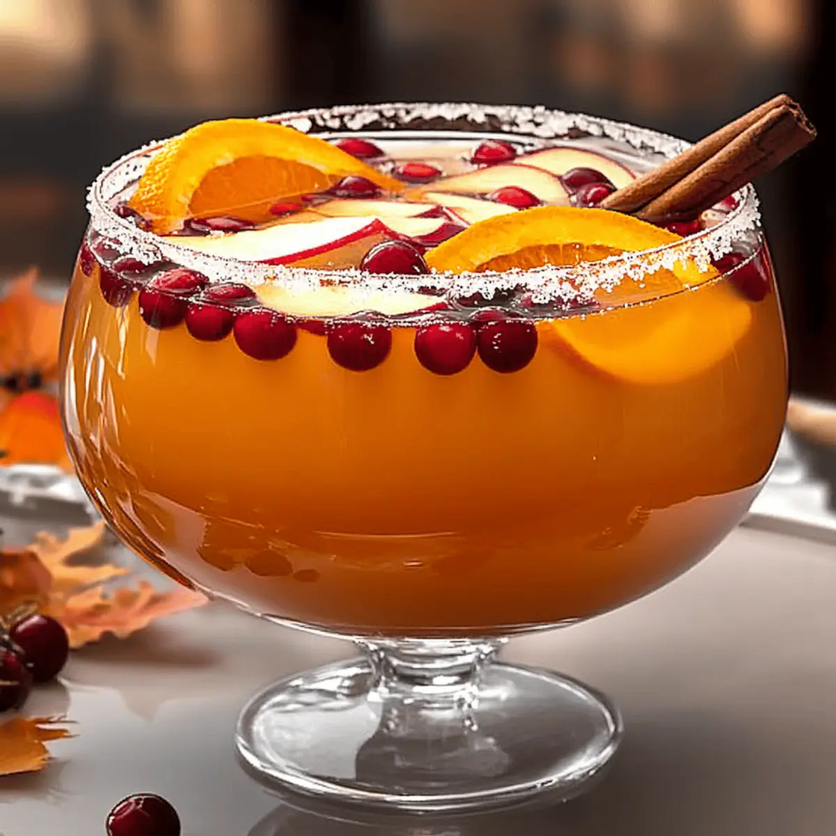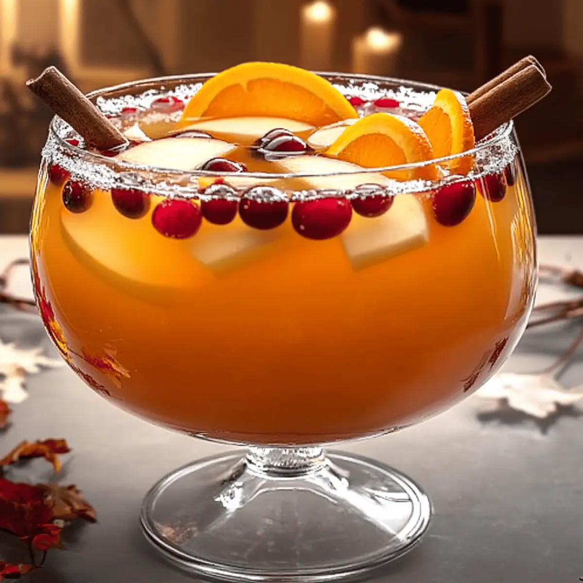 As the leaves turn and a crisp chill fills the air, thoughts of comforting gatherings dance in my mind. This Thanksgiving, elevate your holiday celebration with my delightful Thanksgiving Punch cocktail, a drink that truly captures the spirit of the season. With a perfect blend of sweet apple cider, tart cranberry juice, and a splash of spiced rum, it’s a festive libation that fits right in—whether served hot for warmth or chilled for refreshment. This cocktail not only pleases the crowd but also infuses your festivities with the cozy flavors of autumn. Ready to warm up your Thanksgiving table? Let’s mix up this seasonal punch and toast to cherished moments with family and friends! Why is Thanksgiving Punch a Must-Try? Festive Flavors: This punch is a celebration in a glass, combining the rich flavors of apple cider and cranberry juice for a quintessential autumn taste. Crowd-Pleaser: Perfect for gatherings, this drink caters to every palate—whether served hot to warm hearts or chilled for a refreshing sip. Versatile: Easily adaptable, you can swap in bourbon for an extra kick or ginger beer for a non-alcoholic twist, ensuring everyone can join in the fun. Easy Preparation: With just a few simple steps, this delightful punch can be whipped up in no time, making it a hassle-free addition to your holiday menu. Garnish Appeal: Adding orange slices and cinnamon sticks not only enhances the flavor but also creates an inviting presentation that will impress your guests. Thanksgiving Punch Ingredients For the Base Apple Cider – Provides sweetness and embodies autumn flavors; fresh cider is ideal, but apple juice works too. Cranberry Juice – Adds tartness and vibrant color; choose 100% juice for a healthier option. Spiced Rum – Introduces warmth and depth to the punch; substitute with spiced apple cider or ginger ale for a non-alcoholic version. For the Garnish Orange Slices – Enhance the presentation and add a citrusy brightness; fresh fruits make the drink pop. Cinnamon Sticks – Not only serve as a stirrer but infuse additional warmth and spice to each sip. Enjoy this Thanksgiving Punch as a cozy addition to your holiday celebrations! Step‑by‑Step Instructions for Thanksgiving Punch Step 1: Combine Ingredients In a large punch bowl, pour in 4 cups of fresh apple cider, followed by 2 cups of cranberry juice and 1 cup of spiced rum. Use a wooden spoon to mix these ingredients gently, ensuring that all the flavors blend harmoniously. This combination creates the delicious base for your Thanksgiving Punch that captures the essence of autumn. Step 2: Heat or Chill Decide how you’d like to serve your Thanksgiving Punch. To serve it hot, transfer the mixture to a saucepan, heating over low heat for about 10–15 minutes. Stir occasionally, making sure the punch doesn’t reach a boil, as this can dull the flavors. For a refreshing chilled option, place the punch bowl in the refrigerator and chill for at least 1 hour. Step 3: Prepare Garnishes While your Thanksgiving Punch is heating or chilling, slice fresh oranges into thin rounds and gather some cinnamon sticks. These garnishes not only enhance the drink’s appearance but also infuse additional flavors. The vibrant slices will add a festive touch and the aromatic cinnamon will complement the rich spices in the punch. Step 4: Serve the Punch Once your Thanksgiving Punch is warmed or chilled to your preference, it’s time to serve. Pour the punch into glasses, ensuring each one gets an even share of the vibrant, spiced liquid. Add a slice of orange and a cinnamon stick to each glass for that extra festive flair, inviting your guests to savor the cozy flavors of the season. Step 5: Enjoy and Celebrate As your guests take their first sip of this delightful Thanksgiving Punch, watch their faces light up with joy. This drink not only warms the body but also evokes the comforting feelings of the holiday season. Encourage everyone to raise their glasses and toast to cherished moments together, making this punch the perfect centerpiece for your Thanksgiving celebration. Thanksgiving Punch Variations & Substitutions Ready to take your Thanksgiving Punch to the next level? Here are some exciting ideas to customize your festive drink! Bourbon Swap: Replace spiced rum with bourbon for a richer, bold flavor that pairs beautifully with the apple and cranberry notes. Ginger Beer Kick: Use ginger beer instead of spiced rum for a non-alcoholic, zesty twist that adds a refreshing spice to your punch. Seasonal Fruit Additions: Toss in seasonal fruits like pomegranate seeds or sliced pears for a colorful and flavorful boost that celebrates autumn’s bounty. Citrus Zing: Squeeze in a splash of fresh lemon or lime juice for tangy brightness, creating a delightful balance with the sweetness. Sugar-Free Option: Substitute apple cider with a sugar-free variant to lower the sweetness while still enjoying that cozy autumn flavor. Herbal Infusion: Experiment with fresh herbs like rosemary or thyme to add an aromatic touch, elevating the punch to a gourmet level. Spicy Heat: Add a dash of cayenne pepper or jalapeño slices for those who love a bit of heat to warm up their holiday festivities. Chilled Variation: Freeze some of the punch in ice cube trays and add them to the drink for a fun, icy twist that also keeps it cool! Feel free to explore these variations or craft your own spin on this iconic seasonal drink. Your Thanksgiving gathering is sure to hit the high notes with a personalized touch, making it an unforgettable celebration for friends and family! Make Ahead Options These Thanksgiving Punch cocktails are perfect for busy hosts looking to save time on the big day! You can prepare the base of the punch—combining the apple cider, cranberry juice, and spiced rum—up to 24 hours in advance. Just mix the liquids in a large container, cover it tightly, and refrigerate to maintain freshness. To elevate the flavors, add the garnishes, such as or