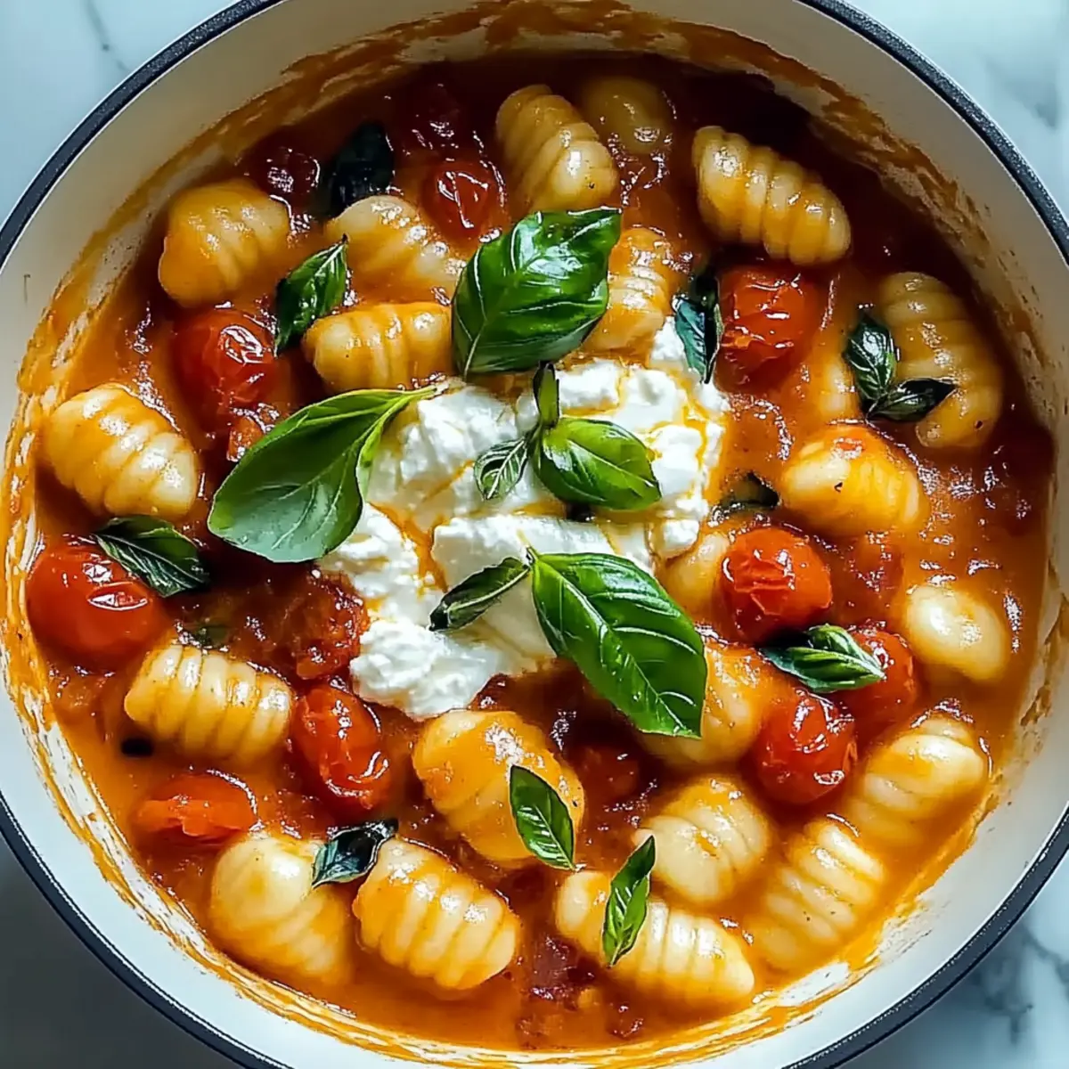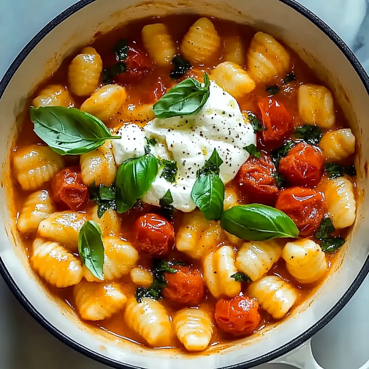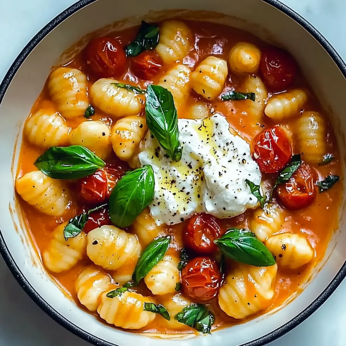 As I stirred the vibrant sauce bubbling on the stove, the comforting scent of roasted cherry tomatoes and garlic danced around the kitchen, instantly transforming my home into a cozy Italian escape. This 30-minute creamy tomato gnocchi with burrata is not just any weeknight meal; it’s a delightful fusion of easy preparation and rich flavor that brings joy to the table. Perfect for a quick dinner after a long day or an impressive dish for friends, this vegetarian recipe is incredibly customizable. Whether you want to add a kick of heat or throw in some seasonal veggies, it’s your canvas to play with! Are you ready to embrace warm, creamy goodness in a matter of minutes? Why is Tomato Gnocchi with Burrata a Must-Try? Creamy Comfort: This recipe offers a velvety texture that melts in your mouth, with burrata elevating every bite to heavenly levels of indulgence. Quick to Prepare: In just 30 minutes, you can have a gourmet meal on the table, perfect for busy weeknights. Endless Customization: Whether you prefer adding sautéed spinach or adjusting spice levels, this dish is completely adaptable to your palate. Crowd-Pleasing Appeal: Perfect for impressing guests or simply enjoying a cozy night in, this vegetarian dish will leave everyone asking for seconds. Fresh Ingredients: Utilizing ripe cherry tomatoes and aromatic garlic not only boosts flavor but encourages a healthy dining experience. Let your taste buds explore this delicious dish, and if you love quick and satisfying meals, you might also enjoy Cherry Tomato Pasta and Turkey Pasta with Peas. Tomato Gnocchi with Burrata Ingredients For the Sauce Extra-virgin olive oil – Adds richness and flavor; substitute with any light cooking oil. Garlic cloves (6-8) – Provides aromatic flavor; use minced garlic if fresh isn’t available. Cherry tomatoes (2 pints) – Adds freshness and sweetness; can substitute with canned diced tomatoes if fresh aren’t handy. Red pepper flakes (1/2 tsp, optional) – Provides a hint of heat; omit for a milder dish. Kosher salt (1 tsp) – Enhances overall flavor; switch to table salt with slight adjustments as it’s more potent. Freshly cracked black pepper (1/2 tsp) – Delivers spice and depth; pre-ground black pepper can be used in a pinch. Heavy cream (1/2 cup) – Makes the sauce rich and creamy; replace with half-and-half or non-dairy cream for lighter options. For the Gnocchi Potato gnocchi (2 packages, 16 oz each) – The heart of the dish; gluten-free gnocchi is available for dietary needs. For the Topping Fresh burrata cheese (2 balls, 4 oz each) – Adds creaminess and luxurious texture; substitute with mozzarella if preferred. Fresh basil leaves (1/2 cup, sliced or torn) – Provides freshness and brightness; dried basil can be used in a pinch. Step‑by‑Step Instructions for Creamy Tomato Gnocchi with Burrata Step 1: Boil Water Begin by bringing a large pot of salted water to a rolling boil, which should take about 8-10 minutes. Ensure the water is generously salted to season the gnocchi properly. You’ll know it’s ready when the surface is bubbling vigorously, perfect for cooking the gnocchi and creating a delightful meal. Step 2: Sauté Garlic While the water is heating, heat a tablespoon of extra-virgin olive oil in a skillet over medium-low heat. Add 6-8 minced garlic cloves, stirring them for about 2 minutes until they become fragrant and golden. Be careful not to burn the garlic, as it can turn bitter, and let the savory aroma fill your kitchen. Step 3: Cook Tomatoes Increase the skillet’s heat to medium and add 2 pints of halved cherry tomatoes. Stir occasionally for about 10-12 minutes, allowing the tomatoes to soften and release their juices, creating a flavorful sauce. Look for the tomatoes to burst and become succulent while blending with the garlic. Step 4: Season & Add Cream Once the tomatoes have softened, season them with half a teaspoon of red pepper flakes, 1 teaspoon of kosher salt, and freshly cracked black pepper to taste. Lower the heat to medium-low and stir in half a cup of heavy cream, simmering for an additional minute until the mixture is well combined and creamy. Step 5: Cook Gnocchi Add the potato gnocchi to the boiling water, cooking them until they float and are al dente, which should take about 2-3 minutes. Reserve half a cup of the cooking water, as this starchy liquid will help thicken your creamy tomato sauce. Drain the gnocchi well to ensure they’re ready for the final blend. Step 6: Combine Toss the drained gnocchi with the creamy tomato sauce in the skillet, mixing gently to coat each piece. Gradually add the reserved cooking water until the sauce reaches your desired consistency, tossing for about 2 minutes. The gnocchi should be perfectly enveloped in the rich, velvety sauce. Step 7: Add Basil Stir in half a cup of sliced or torn fresh basil leaves into the gnocchi and sauce mixture. This will impart a lovely freshness to the creamy tomato gnocchi with burrata. Reserve some basil for a beautiful garnish when serving, enhancing both presentation and flavor. Step 8: Serve To serve, spoon the creamy tomato gnocchi into bowls and top each serving with generous pieces of fresh burrata cheese. Garnish with the reserved basil leaves for a pop of color and flavor. Enjoy this comforting dish immediately to experience the delightful combination of creaminess and freshness at its best. Expert Tips for Tomato Gnocchi with Burrata Watch the Garlic: Avoid burning by cooking it on medium-low heat; burnt garlic can make your sauce bitter. Timing is Key: Cook gnocchi according to package instructions to ensure they are al dente; overcooked gnocchi can become mushy. Adjust Consistency: Gradually add reserved pasta water to the sauce until it reaches your desired creaminess without becoming too thin. Fresh Ingredients: Use fresh basil and ripe cherry tomatoes for optimal flavor; canned tomatoes can be a last-minute backup. Serving Temperature: Serve immediate