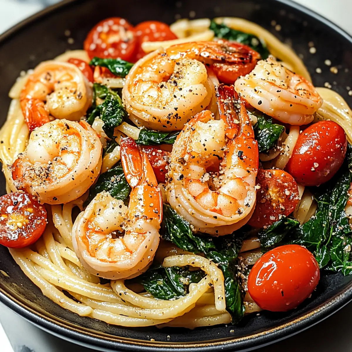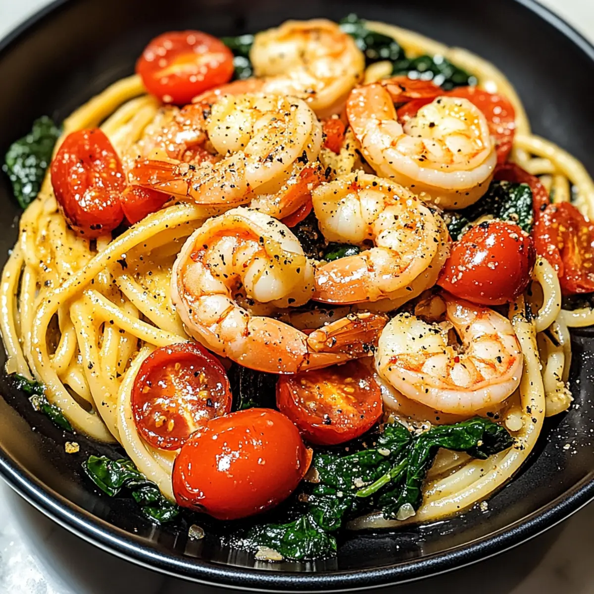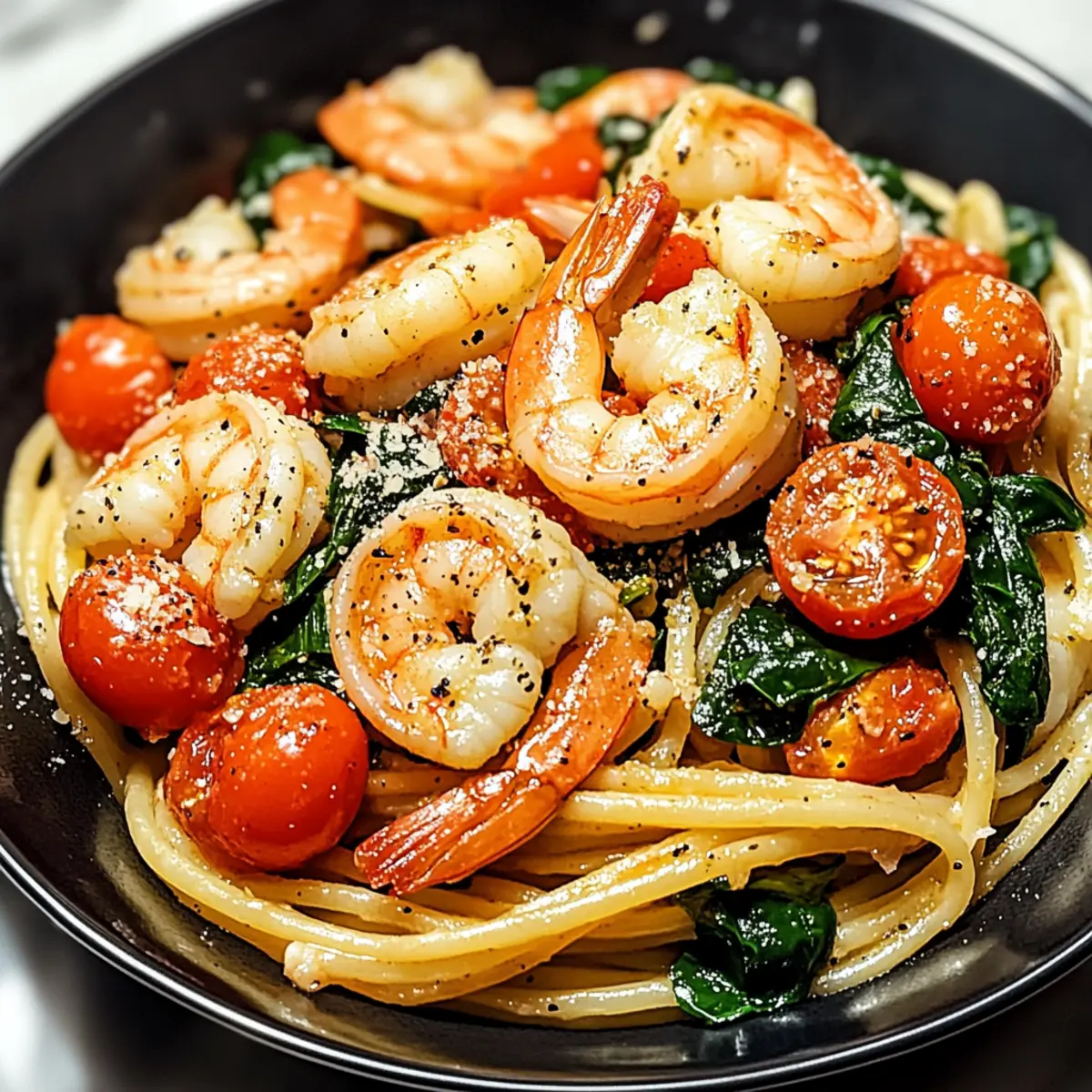 “Can you believe how quickly a weeknight dinner can go from mundane to marvelous?” I asked my friend as we savored the last bites of my Tomato Spinach Shrimp Pasta. This Mediterranean-inspired gem is not only a vibrant feast for the eyes but also a comforting hug for the soul, combining juicy shrimp, fresh spinach, and plump tomatoes, all kissed by a fragrant garlic olive oil sauce. The best part? It takes just minutes to prepare, making it the perfect solution for busy evenings, yet it’s special enough to impress guests! With its rich protein content and nutrient-dense ingredients, this dish is a celebration of healthy eating without sacrificing flavor. Curious how this quick weeknight meal could become your new favorite? Keep reading to unlock the secrets to this culinary delight! Why is this dish so appealing? Quick and Easy: Whip up this dish in just 30 minutes, making weeknight dinners a breeze! Healthy Ingredients: Packed with lean protein and nutrient-rich vegetables, this pasta is guilt-free indulgence. Mediterranean Flavor: The combination of garlic, olive oil, and fresh herbs brings a taste of the Mediterranean right to your table. Versatile Options: Feel free to mix in seasonal veggies or even substitute shrimp for chicken or tofu as seen in my Chicken Fajita Pasta recipe. Impressive Presentation: Vibrant colors and fresh ingredients make this a showstopper for dinner parties and family gatherings. Elevate your meals with this delightful Tomato Spinach Shrimp Pasta! Tomato Spinach Shrimp Pasta Ingredients • Dive into the making of this delicious dish! For the Pasta Pasta – Choose spaghetti or linguine for the best texture; whole grain or gluten-free options work well too. For the Shrimp Shrimp – Fresh or frozen, they are the star here, bringing a sweet seafood flavor; cooked chicken or tofu makes a great alternative. For the Vegetables Spinach – Adds a burst of freshness and vitamins; fresh spinach is ideal, but thawed frozen spinach can substitute in a pinch. Tomatoes – Opt for juicy cherry tomatoes for sweetness and acidity, or canned diced tomatoes if you’re short on time. Garlic – Essential for that warm, aromatic depth; fresh garlic provides the best flavor, though pre-minced can work in a hurry. For the Sauce Olive Oil – Extra virgin gives it a rich taste, forming the foundation of the sauce; essential for sautéing! For the Topping Parmesan Cheese (optional) – Adds a delightful umami kick to your dish; feel free to swap with pecorino or nutritional yeast for a vegetarian option. Your next delicious dish, Tomato Spinach Shrimp Pasta, is just an ingredient away! Let’s get cooking! Step‑by‑Step Instructions for Tomato Spinach Shrimp Pasta Step 1: Cook the Pasta Start by bringing a large pot of salted water to a rolling boil. Add your spaghetti or linguine and cook according to package instructions until al dente, usually about 8-10 minutes. As the pasta cooks, keep an eye on it, stirring occasionally to prevent sticking. Once done, drain the pasta in a colander and set it aside, allowing any excess water to evaporate. Step 2: Sauté the Shrimp In a large skillet, heat 2 tablespoons of extra virgin olive oil over medium heat. Once the oil shimmers, add 2-3 cloves of minced garlic and sauté for about 1 minute, until fragrant and lightly golden. Next, add the shrimp to the skillet, cooking them for 2-3 minutes, or until they turn pink and opaque. Be sure to stir them occasionally to ensure even cooking. Step 3: Add the Spinach After the shrimp are perfectly cooked, add in a generous handful of fresh spinach to the skillet. Stir and cook for around 1-2 minutes, until the spinach is wilted and vibrant bright green. The combination of the garlic olive oil and shrimp will start to create a rich, savory aroma, making your kitchen feel inviting. Step 4: Combine Ingredients Now it’s time to bring everything together! Toss in the drained pasta and halved cherry tomatoes to the skillet. Gently mix to combine all the ingredients thoroughly, allowing the warmth of the pasta to heat the tomatoes through for about 2 minutes. Keep tossing until everything is evenly coated in the garlic-infused olive oil. Step 5: Serve Once everything is heated through, remove the skillet from heat. For an extra touch of flavor, sprinkle with freshly grated Parmesan cheese, if desired. Serve your Tomato Spinach Shrimp Pasta warm and consider pairing it with crusty bread to soak up the delicious olive oil sauce. Each plate should evoke a Mediterranean delight! Make Ahead Options These Tomato Spinach Shrimp Pasta make-ahead tips are perfect for busy weeknights! You can prepare the pasta and sauté the shrimp (without the spinach and tomatoes) up to 24 hours in advance. Simply cook the pasta until al dente, drain it, and coat it lightly with olive oil to prevent sticking. Store the shrimp separately in an airtight container in the refrigerator. On the day you plan to serve, quickly sauté the garlic, add the prepped shrimp to warm through, then stir in the spinach and halved tomatoes for a few minutes. Finish by tossing in the pasta, and you’ll enjoy a fresh, delicious meal that saves you time and effort! Expert Tips for Tomato Spinach Shrimp Pasta Don’t Overcook Shrimp: Always cook shrimp until they are just pink and opaque; overcooking can lead to a rubbery texture. Perfect Pasta Texture: Aim for al dente pasta—slightly firm to the bite—so it holds up well against the sauce in this Tomato Spinach Shrimp Pasta. Fresh is Best: Use fresh garlic and spinach for maximum flavor. If using frozen spinach, ensure it’s thoroughly thawed and drained to avoid excess moisture. Timing Matters: Sauté garlic until golden brown before adding shrimp to enhance the flavor profile without burning it. Herb Variations: Experiment with fresh herbs like basil or parsley as garnish to elevate the dish further while adding a beautiful pop of color. Flavor Boost: For extra depth, consider ad