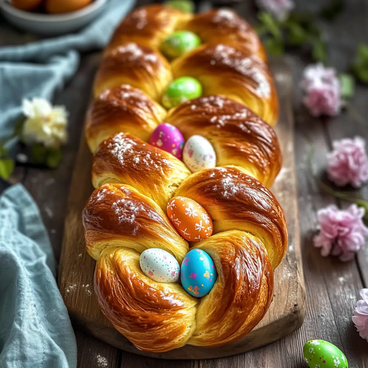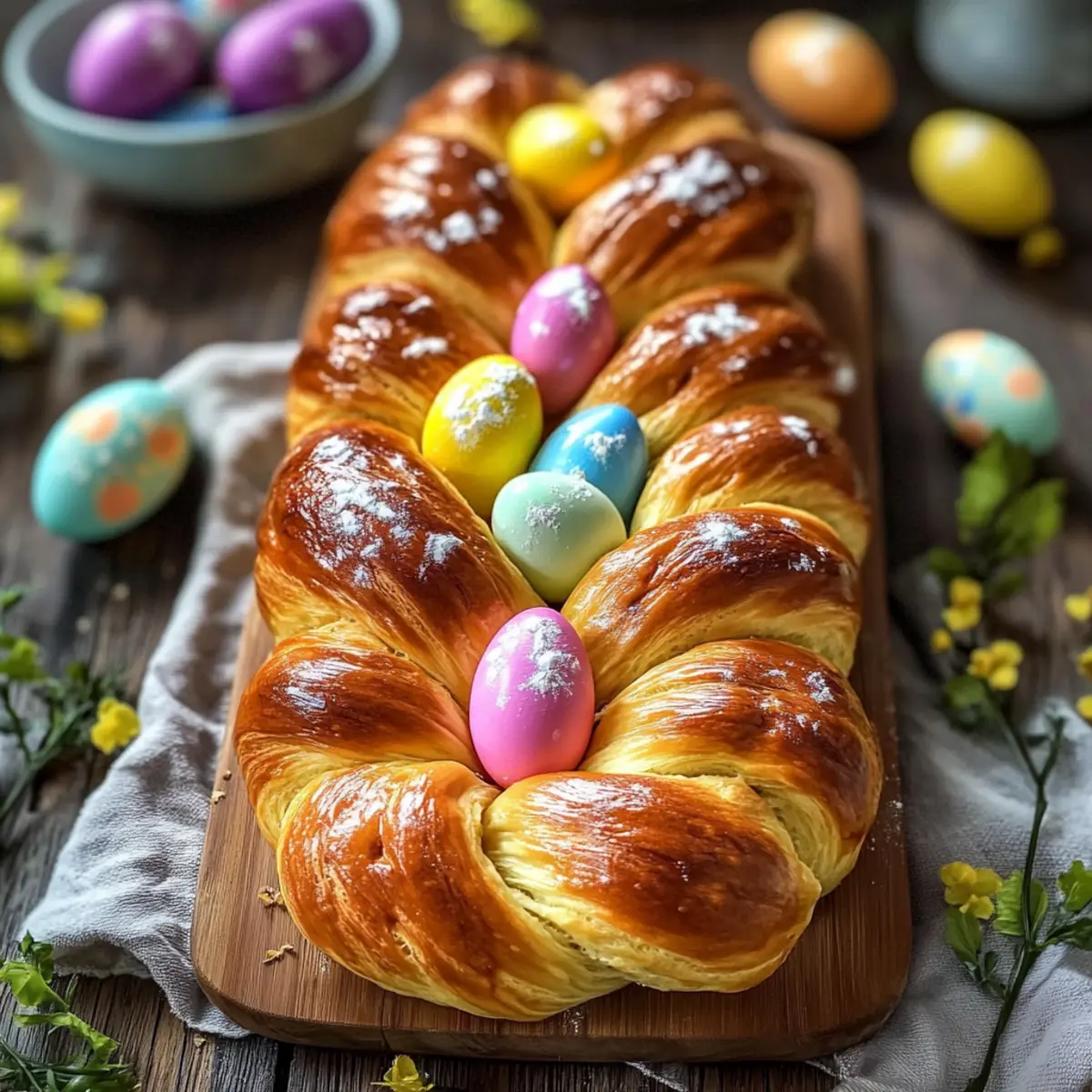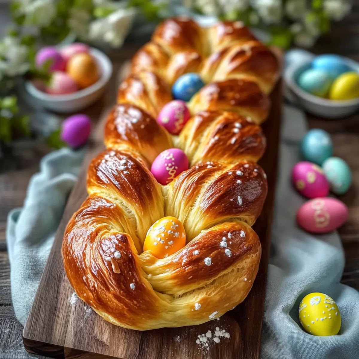As I rummaged through my grandmother’s recipe box, I stumbled upon a worn-out card with a heartwarming scrawl that read “Traditional Italian Easter Bread.” The mere mention of this delightful treat conjures memories of joyful family gatherings, vibrant spring celebrations, and the tantalizing aroma of freshly baked bread wafting through the house. This Sweet Easter Bread, also affectionately known as Easter Egg Bread, isn’t just a feast for the palate; it serves as a stunning centerpiece adorned with colorful dyed eggs, making it perfect for any holiday table. What I love most about this recipe is its quick prep time and the way it effortlessly bridges generations, connecting us to our cultural roots and cherished traditions. Are you ready to bring a taste of Italy into your kitchen this Easter season? Why is Easter Bread So Special? Sweet, Nostalgic Connection: This Traditional Italian Easter Bread transports you back to joyful holiday gatherings, evoking warm memories with every bite. Visual Delight: With colorful eggs nestled in its braided structure, it becomes the star of your holiday table. Easy Preparation: Enjoy a straightforward process that makes baking accessible for everyone, regardless of skill. Versatile Treat: Perfect for breakfast, snacks, or as a lovely addition to any Easter brunch, it pleases any palate. For those who relish Italian flavors, try my Italian Meatballs Savory or Italian Stuffed Meatloaf for more delicious recipes to celebrate! Traditional Italian Easter Bread Ingredients • Discover the perfect ingredients for your sweet Easter celebration! For the Dough Flour – essential for structure; use all-purpose or bread flour for the best results. Sugar – enhances sweetness and browning; substitute with honey for a unique flavor. Eggs – add moisture and richness, symbolizing new beginnings during Easter. Butter – provides a delightful richness, promoting a fluffy texture. Warm Milk – activates yeast; almond milk makes a great dairy-free alternative. Yeast – the key leavening agent; ensure it’s fresh for optimum rise. Citrus Zest (optional) – enhances flavor and aroma; try using lemon or orange zest for a refreshing taste. For Decoration Dyed Eggs – traditionally pressed into the dough; they symbolize fertility and renewal, adding a beautiful visual touch. Dive into the delightful experience of making Traditional Italian Easter Bread, a true celebration of spring and renewal that will fill your home with warmth and joy! Step‑by‑Step Instructions for Traditional Italian Easter Bread Step 1: Dough Preparation Begin by combining 1 cup of warm milk with 2 teaspoons of active dry yeast in a bowl. Let the mixture sit for about 5–10 minutes until it becomes frothy, indicating the yeast is active. In a large mixing bowl, whisk together 4 cups of flour, ½ cup of sugar, 3 eggs, and ½ cup of softened butter. Gradually add the activated yeast mixture and optional citrus zest, mixing until a soft dough forms. Step 2: Kneading Transfer the dough to a lightly floured surface and knead for 8–10 minutes, until it’s smooth and elastic. To check for doneness, perform the windowpane test: stretch a small piece of dough; if it doesn’t tear and you can see light through it, it’s ready. This step is crucial for achieving the delightful texture of your Traditional Italian Easter Bread. Step 3: First Rise Place the kneaded dough into a greased bowl and cover it with a damp cloth or plastic wrap. Set it in a warm, draft-free location to rise for about 1.5 to 2 hours, or until it doubles in size. After this time, the dough should feel light and airy, with a puffy appearance, signifying that the yeast has done its work. Step 4: Shaping Once the dough has risen, gently punch it down to release air bubbles. Divide the dough into three equal pieces and roll each piece into long ropes, about 16–18 inches in length. Braid the three ropes together, tucking the ends under slightly to secure the shape of your Traditional Italian Easter Bread. This braided formation will create a beautiful loaf that’s perfect for Easter celebrations. Step 5: Final Touch Transfer the braided loaf to a baking sheet lined with parchment paper. Carefully press dyed, hard-boiled eggs into the dough at intervals—this is both decorative and symbolic, adding vibrant color to your Traditional Italian Easter Bread. Ensure the eggs are nestled securely for added stability during baking. Step 6: Baking Preheat your oven to 350°F (175°C). While it preheats, let the shaped loaf rise for another 30 minutes covered with a clean kitchen towel. Once ready, brush the top of the loaf with an egg wash made from beaten egg and a splash of water for a golden finish. Bake the loaf in the preheated oven for 25–30 minutes, until it is golden brown and sounds hollow when tapped. Step 7: Cooling Remove the freshly baked Traditional Italian Easter Bread from the oven and let it cool on a wire rack. Allow the bread to cool completely before slicing — this ensures a fluffy texture and preserves the beautiful braided shape. Enjoy the delightful aroma in your kitchen as you prepare to share this festive treat with family and friends. Traditional Italian Easter Bread Variations Feel free to get creative and customize this delightful bread with these variations that bring new flavors and textures to life! Whole Wheat: Substitute all-purpose flour with whole wheat flour for a nuttier taste and additional fiber. Honey Sweetened: Replace sugar with honey for a distinct sweetness and rich flavor profile. Citrus Infusion: Experiment with different zests like lime or grapefruit for a refreshing twist that brightens every bite. Vegan Option: Swap butter with coconut oil and use flax eggs (1 tablespoon flaxseed meal mixed with 2.5 tablespoons water) for a delightful vegan version. Nut Addition: Fold in some chopped nuts like almonds or pistachios for added crunch and a nice textural contrast. Dried Fruit: 