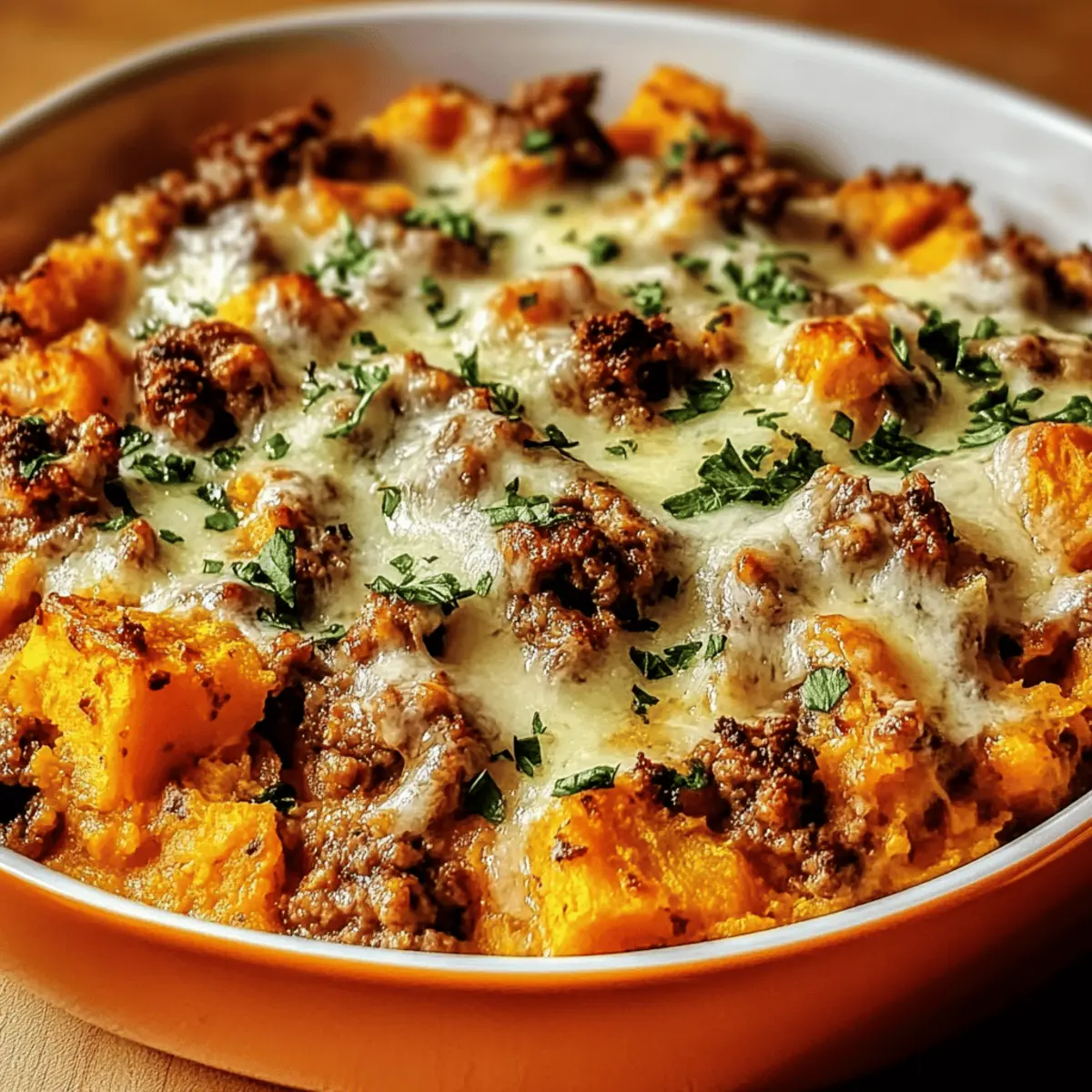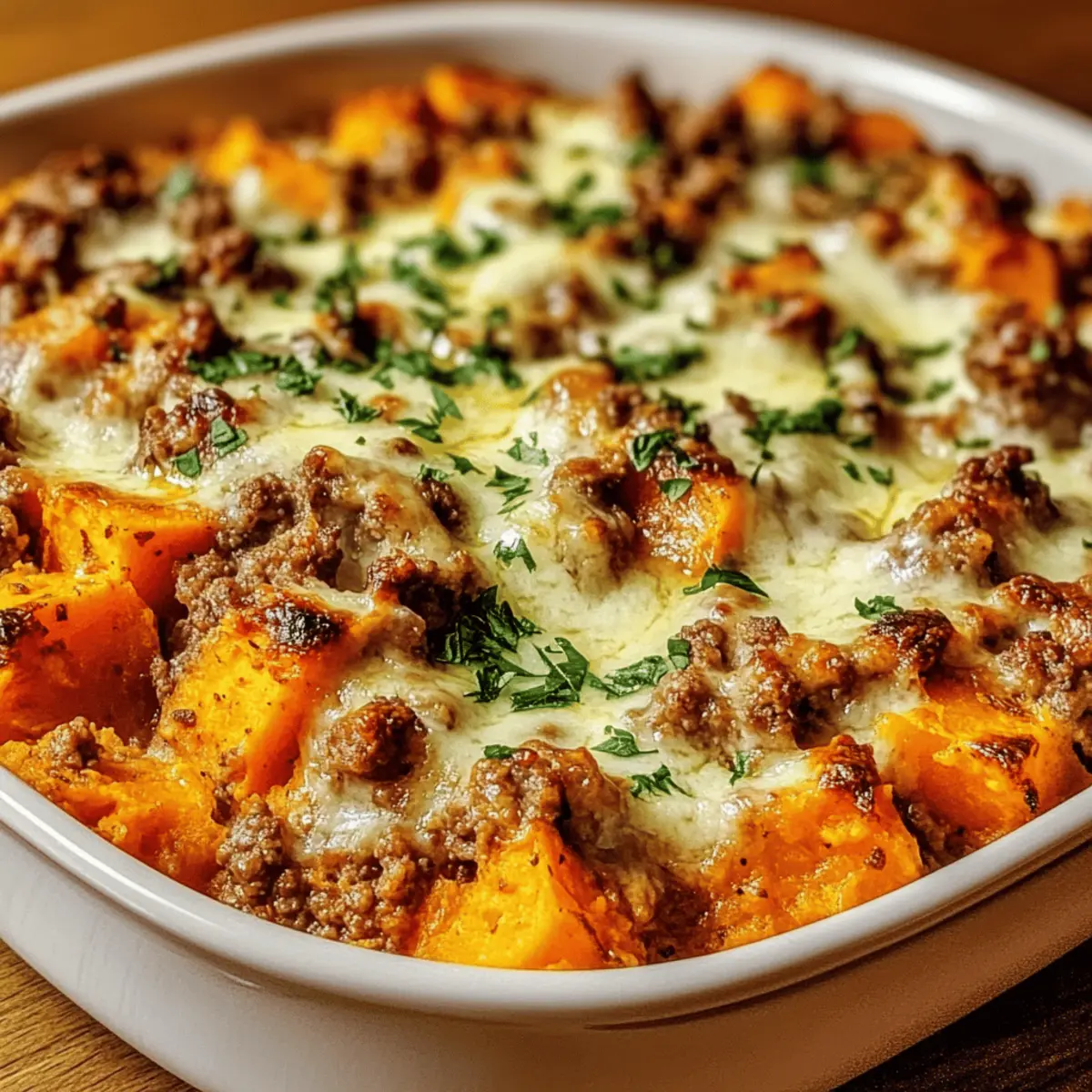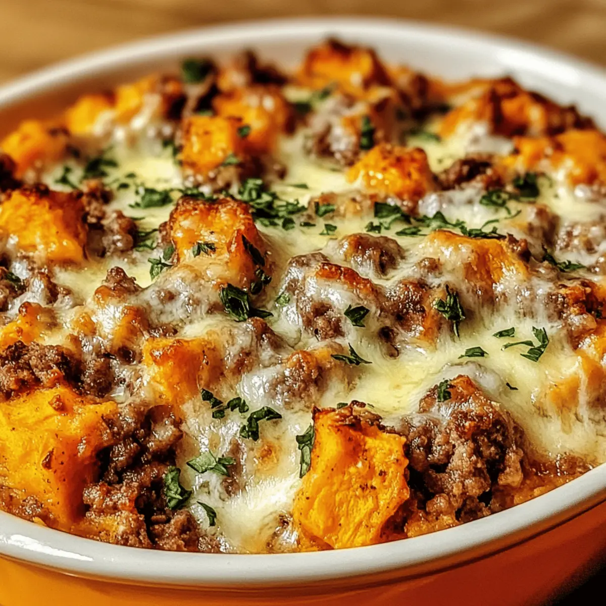 As I stirred the bubbling mixture on the stovetop, the savory aroma of my Turkey Sweet Potato Bake filled the kitchen, transforming it into a cozy haven. This dish combines the warmth of seasoned ground turkey with the natural sweetness of creamy mashed sweet potatoes, creating a delightful harmony that’ll take you to your happy place. Not only is this recipe perfect for a satisfying family dinner, but it’s also gluten-free and a meal prep dream—making weeknight cooking a breeze! Each spoonful offers a comforting blend of flavors and textures, topped with a bubbly, golden layer of cheese that promises to please even the pickiest of eaters. Ready to bring a bit of heart to your table? Let’s dive into this heartwarming dish that’s sure to be loved by many. Why Is This Bake So Special? Comforting, heartwarming flavors unite in this Turkey Sweet Potato Bake, making it the ultimate cozy dish for any occasion. Gluten-free and versatile, it allows for easy substitutions, whether you’re craving chicken or beef instead of turkey. Meal prep friendly, whip up this delightful casserole ahead of time for effortless weeknight dinners. Tantalizing textures of creamy sweet potatoes and gooey cheese will leave your taste buds dancing, perfect for satisfying even the pickiest eaters. And for a complete meal, consider pairing it with a fresh side salad or some flavorful steamed veggies, just like I do with my Ground Turkey Zucchini! Turkey Sweet Potato Bake Ingredients A delightful blend awaits you! For the Turkey Mix • Ground Turkey – Provides protein and a savory flavor base; feel free to substitute with ground chicken or beef for variation. • Onion – Enhances flavor through sautéing, adding depth to the dish. • Garlic – Provides aromatic flavor that complements the savory elements. • Ground Cumin – Adds warm, earthy notes that enhance the overall taste. • Smoked Paprika – Infuses a subtle smokiness to boost flavor complexity. • Salt & Black Pepper – Essential seasonings for balancing flavors. • Chicken Broth – Keeps the mixture juicy and prevents drying during baking. For the Sweet Potato Layer • Sweet Potatoes – Adds natural sweetness and creaminess; mashed to create a comforting texture; frozen sweet potatoes can be used if thawed and drained. • Olive Oil – Used for sautéing onion and garlic, contributing richness. For the Topping • Shredded Cheese (Cheddar or Mozzarella) – Offers a gooey, melty topping that enhances flavor; mixing in Parmesan can add delightful depth. • Fresh Parsley – Used as a garnish for color and a burst of freshness. Step‑by‑Step Instructions for Turkey Sweet Potato Bake Step 1: Preheat the Oven Begin by preheating your oven to 375°F (190°C). This step is crucial, as a well-preheated oven ensures that your Turkey Sweet Potato Bake cooks evenly and develops that glorious golden top. While the oven warms up, you can gather your ingredients and prepare for the next steps. Step 2: Sauté Vegetables In a medium skillet, heat a splash of olive oil over medium heat. Add finely chopped onion and minced garlic, stirring occasionally for about 3-4 minutes, until fragrant and translucent. This aromatic base is essential for enhancing the flavors in your Turkey Sweet Potato Bake, creating a welcoming atmosphere in your kitchen. Step 3: Cook the Turkey Next, incorporate the ground turkey into the skillet with the sautéed onion and garlic. Cook for about 5-7 minutes, breaking the meat apart with a spatula, until it’s browned and no longer pink. This step locks in the savory goodness, ensuring each bite of your Turkey Sweet Potato Bake is packed with flavor. Step 4: Mix in Sweet Potatoes Now, add diced sweet potatoes, ground cumin, smoked paprika, salt, and black pepper to the turkey mixture. Pour in the chicken broth, stirring to combine. Bring this mixture to a gentle simmer, cover, and cook for 10 minutes, allowing the sweet potatoes to soften while absorbing those delicious spices. Step 5: Transfer to Baking Dish Carefully transfer the turkey and sweet potato mixture into a greased baking dish, spreading it out evenly. This is where your Turkey Sweet Potato Bake begins to take shape! The dish should be filled to about ¾ full, allowing enough space for the topping to bubble up and brown beautifully. Step 6: Add Cheese and Bake Sprinkle a generous layer of shredded cheese over the top of your mixture. Place the baking dish in the preheated oven and bake for approximately 20 minutes, or until the cheese is melted, bubbly, and golden brown. The visual cue of that tempting cheese topping will have everyone flocking to the table! Step 7: Cool and Garnish Once out of the oven, let the Turkey Sweet Potato Bake cool for about 5 minutes. This brief cooling period helps the dish set and makes serving easier. Before diving in, sprinkle fresh parsley on top for a pop of color and a hint of freshness that complements the rich flavors. Expert Tips for Turkey Sweet Potato Bake Taste as You Go: Always taste the turkey and sweet potato mixture before baking to ensure the seasonings are just right. Adjust to your preference! Perfectly Golden Top: For that deliciously crispy cheese layer, uncover the dish during the last 10 minutes of baking. This will add an irresistible crunch! Don’t Over-Mash: When making your sweet potatoes, avoid over-mashing to maintain a bit of texture. A creamy consistency is delicious, but some chunks add charm! Healthy Add-ins: Consider mixing in veggies like chopped bell peppers or spinach for a nutritious boost and added flavor. It’s an easy way to customize your Turkey Sweet Potato Bake! Make Ahead: This dish is great for meal prep! Consider preparing it a day in advance and refrigerating until ready to bake. Enjoy a home-cooked meal with ease! Make Ahead Options These Turkey Sweet Potato Bake preparations are a lifesaver for busy weeknights! You can prepare the turkey and sweet potato mixture up to 24 hours 