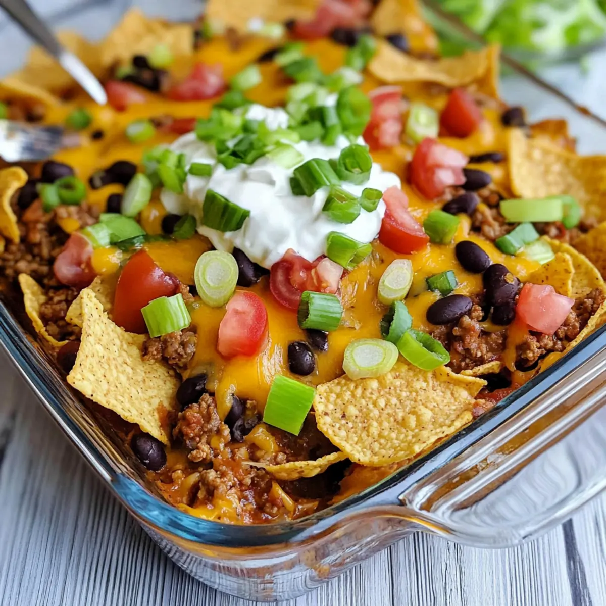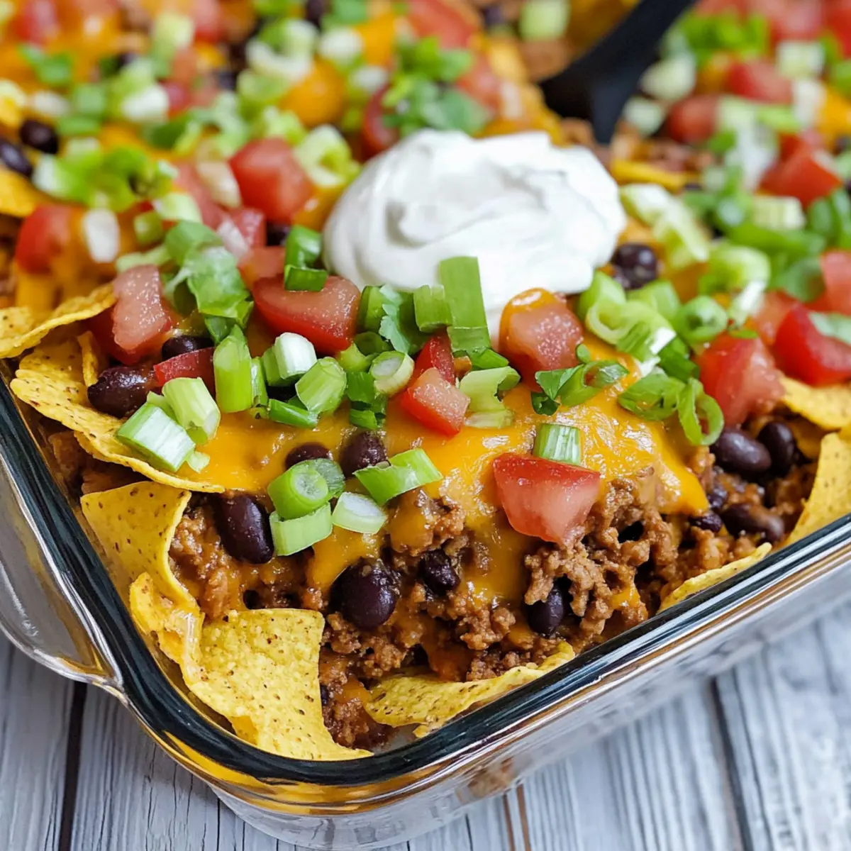 As I stirred the bubbling pot on my stove, the aroma of seasoned beef filled my kitchen, and it took me back to carefree summer days when walking tacos were the highlight of family barbecues. This Easy Walking Taco Casserole brings all those nostalgic flavors into a delicious, mess-free weeknight dinner that’s perfect for busy schedules. With layered Fritos, savory ground beef, and gooey cheese, it’s not only a crowd-pleaser but also flexible—meaning you can pile on the toppings just the way you like them! Plus, with minimal prep and one baking dish to clean, you’ll have more time to enjoy a hearty meal with your loved ones. So, are you ready to create an unforgettable family dinner that everyone will want to dive into? Why is this casserole a crowd-pleaser? Ease of Preparation: This Walking Taco Casserole requires minimal cooking skills, making it perfect for busy weeknights. Just layer and bake! Flavor Explosion: The combination of seasoned beef, creamy cheese, and crispy Fritos delivers a delightful taste that echoes cherished summer memories. Customization: With endless topping possibilities, you can tailor each portion to suit every family member’s taste. Try adding guacamole or fresh jalapenos for a kick! Perfect for Leftovers: This dish refrigerates well, ensuring that deliciousness lasts for days, making meal prep a breeze. Family Bonding: Cooking together makes mealtime special. Assemble the casserole as a team, and watch everyone eagerly dig in! Walking Taco Casserole Ingredients For the Beef Mixture • Ground Beef – A hearty protein base. Opt for lean ground beef to reduce fat content, or try ground turkey for a lighter option. • Small Onion – Adds sweetness and flavor; chop finely for even mixing. • Taco Seasoning – Essential for authentic flavor; homemade spice blends or store-bought work perfectly! • Water – Activates the seasoning and keeps the beef moist and delicious. • Black Beans – Great source of fiber; you can substitute with pinto or kidney beans if desired. • Diced Tomatoes with Green Chiles – Introduces moisture and zest; feel free to use fresh tomatoes for a lighter taste. • Sour Cream – Enhances creaminess in the dish; Greek yogurt makes for a healthy swap. For the Layering • Fritos Corn Chips – Create the crunchy base; Doritos can offer a unique twist in flavor! • Mexican-Style Shredded Cheese – Adds richness and gooey goodness; Monterey Jack or cheddar provide tasty alternatives. For the Toppings • Green Onions – Sprinkle for fresh flavor and brightness! • Guacamole – A creamy and delicious topping that’s a family favorite. • Salsa – Adds tang and texture; choose your preferred heat level! • Jalapenos – Throw in for an extra kick, if you’re a spice lover! Enjoy crafting your Walking Taco Casserole with these simple ingredients! Step‑by‑Step Instructions for Walking Taco Casserole Step 1: Preheat and Prepare Begin by preheating your oven to 350°F (175°C). While the oven warms up, grab a 13×9-inch baking dish and lightly coat it with nonstick spray. This will ensure your Walking Taco Casserole releases easily once it’s cooked, making for effortless serving and cleanup. Step 2: Brown the Beef In a large skillet over medium-high heat, add 1 pound of ground beef, breaking it apart with a spatula. Brown the beef for about 5-7 minutes until it’s nearly cooked through, stirring occasionally. Next, add a finely chopped small onion and cook for an additional 3-4 minutes, or until the onion becomes tender and translucent, infusing your dish with delicious aroma. Step 3: Season the Mixture Once the beef and onion are perfectly cooked, sprinkle in your taco seasoning and pour in the water. Stir well to combine, allowing it to come to a gentle boil. Then, reduce the heat and mix in a can of black beans and a can of diced tomatoes with green chiles. Let this hearty mixture simmer for 8-10 minutes, thickening slightly and filling your kitchen with mouthwatering smells. Step 4: Layer the Casserole With the beef mixture ready, it’s time to assemble your Walking Taco Casserole. Start by creating a base layer of Fritos corn chips at the bottom of your prepared baking dish. Follow this with a cup of Mexican-style shredded cheese, then spoon the beef mixture evenly over the top. Finish by adding the remaining cheese, creating a gooey, cheesy top layer that dessert-like anticipation. Step 5: Bake to Perfection Cover your casserole with aluminum foil and place it in the preheated oven. Bake for 15 minutes, allowing the layers to fuse and flavors to meld. After this initial bake, carefully remove the foil and bake for an additional 5 minutes, or until the cheese is beautifully bubbly and lightly golden, signaling that your Walking Taco Casserole is ready to delight. Step 6: Add Toppings and Serve Once you’ve removed the casserole from the oven, let it sit for a few minutes to set. Then, top with extra Fritos and a variety of toppings like green onions, guacamole, sour cream, or salsa according to your family’s preferences. Serve this delightful Walking Taco Casserole warm, and watch your loved ones dig in with enthusiasm! Make Ahead Options This Walking Taco Casserole is a fantastic choice for those busy weeks when meal prep is essential! You can prepare the beef mixture up to 3 days in advance; just cook it as directed, let it cool, and refrigerate in an airtight container to maintain its freshness. The casserole can also be fully assembled and refrigerated for up to 24 hours before baking. Just be sure to keep your toppings separate until you’re ready to serve to ensure they stay crisp. When you’re ready to bake, heat your oven to 350°F (175°C) and pop the casserole in straight from the fridge, adding an extra 5-10 minutes to the bake time for perfect, bubbly cheese. With these easy make-ahead tips, enjoy a delicious homemade meal with minimal last-minute effort! Expert Tips for Walking Taco Cass