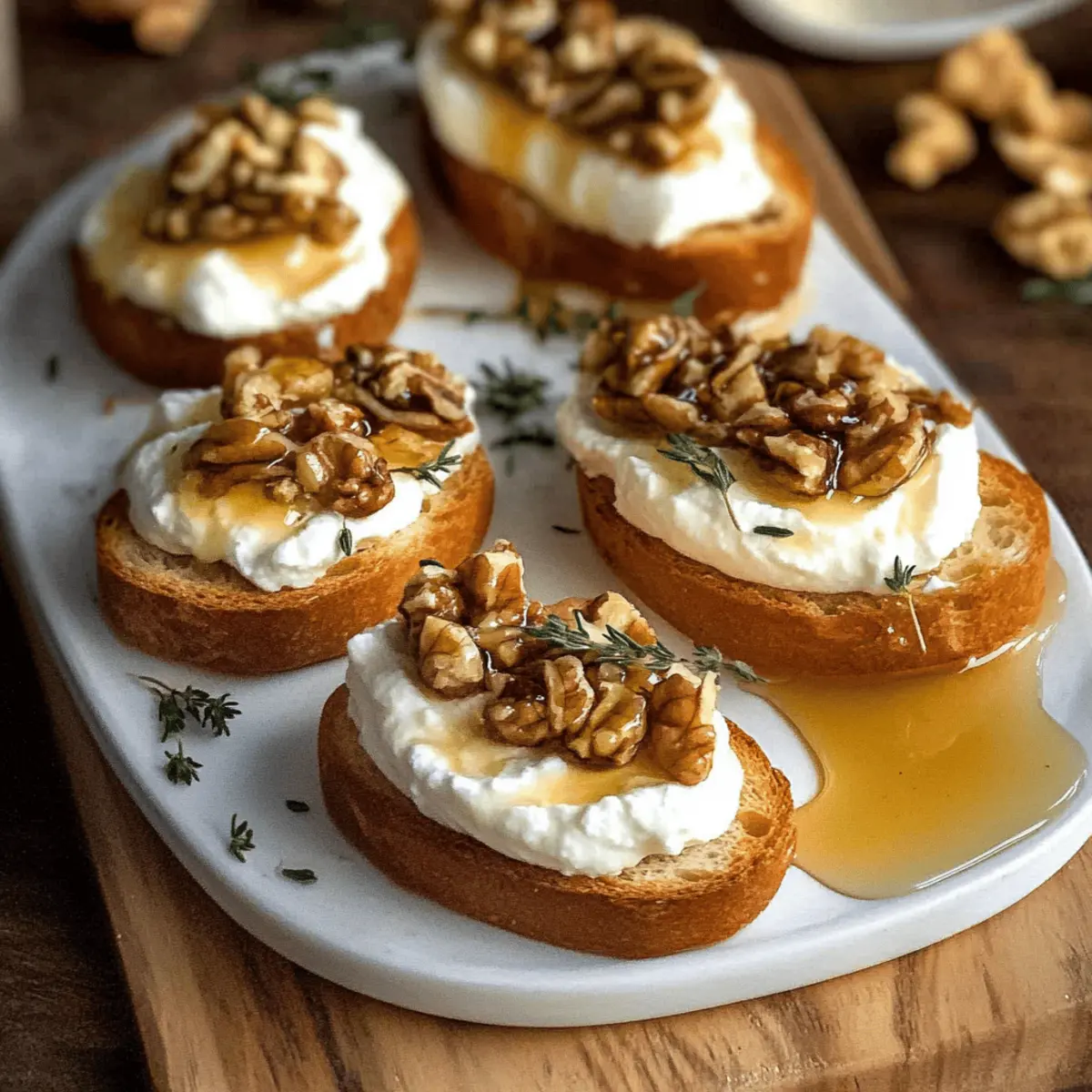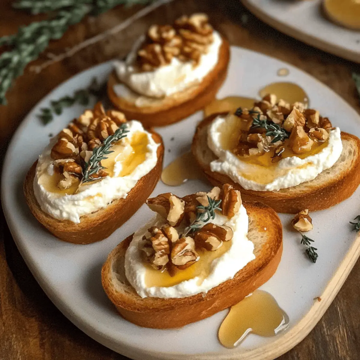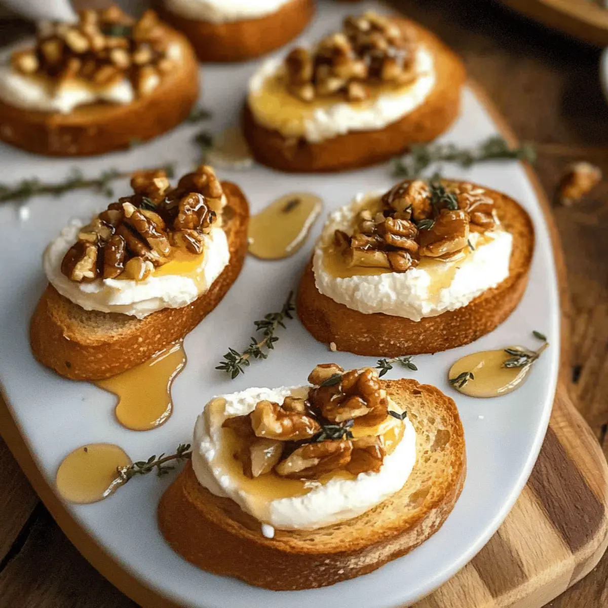 Sinking my teeth into a warm, crunchy crostini topped with airy, whipped ricotta is like a little taste of heaven. This Whipped Ricotta Crostini with Walnuts & Salted Honey marries the richness of creamy cheese with the satisfying crunch of toasted bread, creating a sophisticated yet simple appetizer that’s perfect for any gathering. Not only is this recipe a joy to prepare—taking mere minutes to bring to life—but it also dazzles at parties, impressing guests with its delightful combination of flavors and textures. Easy to customize, whether you add fresh herbs or swap in your favorite nuts, this crostini is a delightful get-together essential. Are you ready to elevate your next snack experience? Why Will You Love This Crostini? Simplicity at Its Best: This recipe is incredibly easy to whip up, requiring just a few minutes and minimal cooking skills—perfect for those last-minute gatherings! Savory-Sweet Delight: The creamy ricotta meets crunchy walnuts and a drizzle of honey, creating a flavor harmony that keeps your taste buds dancing. Versatile Creation: Feel free to customize! Swap walnuts for pecans or top with fresh figs for a personal touch or explore unique twists with Salted Caramel Chocolate for dessert-style appetizers. Party-Ready Appeal: Arranging these on a platter transforms any event into a chic affair, guaranteeing compliments from guests. Serve them alongside Cajun Honey Butter for unexpected flavor pairings. Nutrient-Packed Goodness: With wholesome ingredients like ricotta and nuts, each bite is not just delicious but also packed with healthy fats and protein, ensuring your guests feel satisfied! Whipped Ricotta Crostini Ingredients • Get ready to create pure bliss! For the Whipped Ricotta Whole Milk Ricotta – The star ingredient that delivers that creamy texture; consider making homemade ricotta for an extra special touch. Lemon Zest – Adds a bright kick to the ricotta; feel free to adjust based on your preference for zing. Fine Kosher Salt – Elevates the flavors; remember to reduce the quantity if you opt for table salt. For the Crostini Baguette or Focaccia – These breads form the crunchy base; slice thinly to achieve that perfect toast. Olive Oil – Brushing this on the bread before toasting enhances flavor and helps achieve a golden color. For Toppings Chopped Walnuts – Brings in a lovely crunch and rich nuttiness; pecans or almonds are great substitutes if desired. Honey – The sweet drizzle that ties everything together; local varieties can make a significant flavor difference. Fresh Thyme – Infuses a delightful herbal note; swap for basil or parsley if you prefer a different vibe. Flaky Finishing Salt – Adds a delightful crunch; feel free to use this as an optional garnish for a finishing touch. Get your ingredients ready, and let the culinary magic of Whipped Ricotta Crostini with Walnuts & Salted Honey begin! Step‑by‑Step Instructions for Whipped Ricotta Crostini with Walnuts & Salted Honey Step 1: Preheat the Oven Begin by preheating your oven to 450°F (232°C). This high temperature will ensure that your crostini gets perfectly crisp and golden. Meanwhile, gather your baking sheet and parchment paper, which will serve as the base for toasting your bread to perfection. Step 2: Prepare the Whipped Ricotta In a food processor, blend the whole milk ricotta, lemon zest, and fine kosher salt until the mixture is creamy and smooth. This process should take about 1-2 minutes, achieving a luscious consistency. Once ready, transfer the whipped ricotta into a piping bag or an airtight container and refrigerate it while you prepare the crostini. Step 3: Slice and Toast the Bread Take your baguette or focaccia and slice it into thin pieces, approximately 1/2 inch thick. Arrange the slices on your baking sheet, then brush each side generously with olive oil. Toast them in the preheated oven for 5-7 minutes, flipping halfway through, until they are golden brown and crisp. Keep an eye on them to avoid over-browning! Step 4: Toast the Walnuts While the bread is toasting, heat a dry skillet over medium heat. Add the chopped walnuts and toast them for about 5 minutes, stirring frequently. You’ll know they’re done when they become fragrant and golden. Remove them from the heat and set aside to cool, ensuring a delightful crunch for your crostini. Step 5: Assemble the Crostini Once the crostini and walnuts are cool, it’s time to assemble your delicious Whipped Ricotta Crostini. Pipe or spread a generous layer of the whipped ricotta onto each toasted slice of bread. Top with a sprinkle of toasted walnuts and fresh thyme, creating a beautiful and vibrant presentation. Step 6: Drizzle with Honey Finish your creation by drizzling a touch of honey over each crostini, letting it cascade gracefully over the ricotta and walnuts. If you like an extra touch of flavor, add a sprinkle of flaky finishing salt to enhance the taste and elevate your culinary masterpiece. Step 7: Serve and Enjoy These Whipped Ricotta Crostini with Walnuts & Salted Honey are best served immediately while the crostini are still warm and crunchy. Present them on a beautiful platter, and indulge in the joyful experience of sharing these delightful bites with your family and friends! Whipped Ricotta Crostini Variations Feel free to get creative and put your own spin on these delightful crostini for a truly unique appetizer experience. Nut-Free: Omit walnuts and replace them with roasted chickpeas for a crunchy texture and plant-based protein boost. Herb Swap: Try fresh basil or parsley instead of thyme for an aromatic twist that brightens each bite. These fresh herbs can also complement the honey beautifully. Spicy Kick: Add a pinch of red pepper flakes to the whipped ricotta for a subtle heat that contrasts beautifully with the honey’s sweetness. Fruit-Filled Delight: Top your crostini with fresh figs or sliced pear alongside the walnuts for a sweet and savory balance that’s 