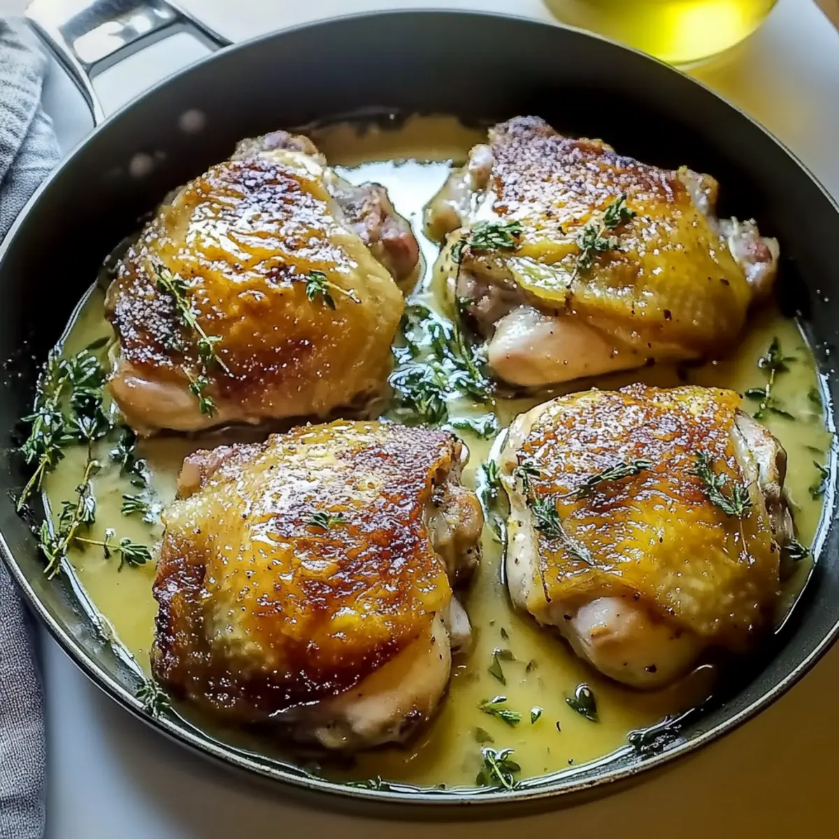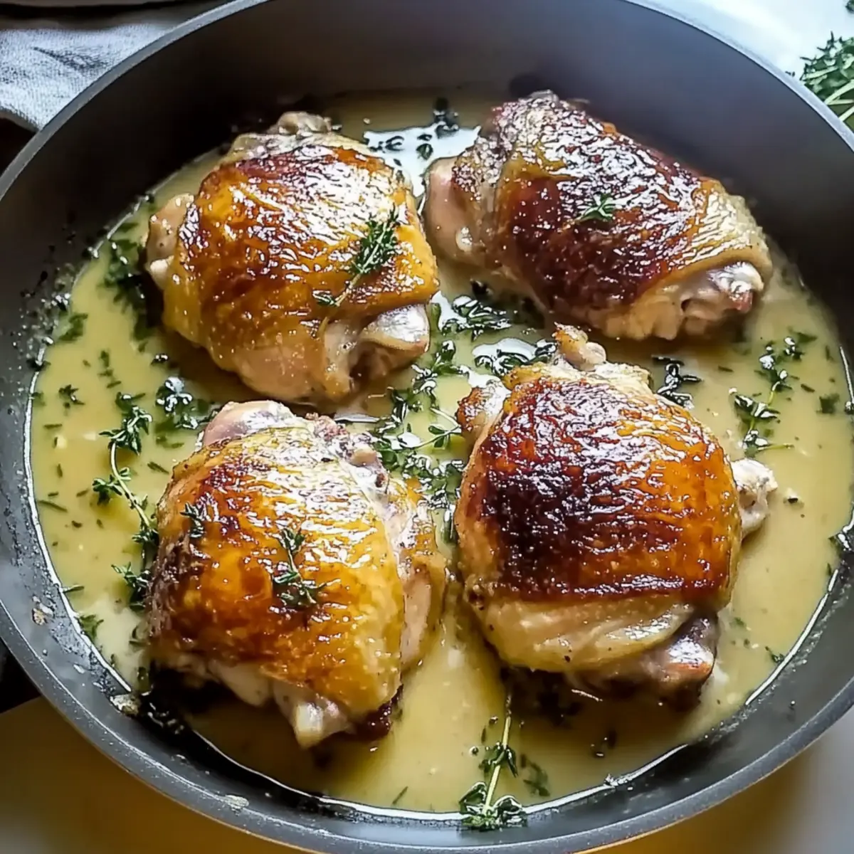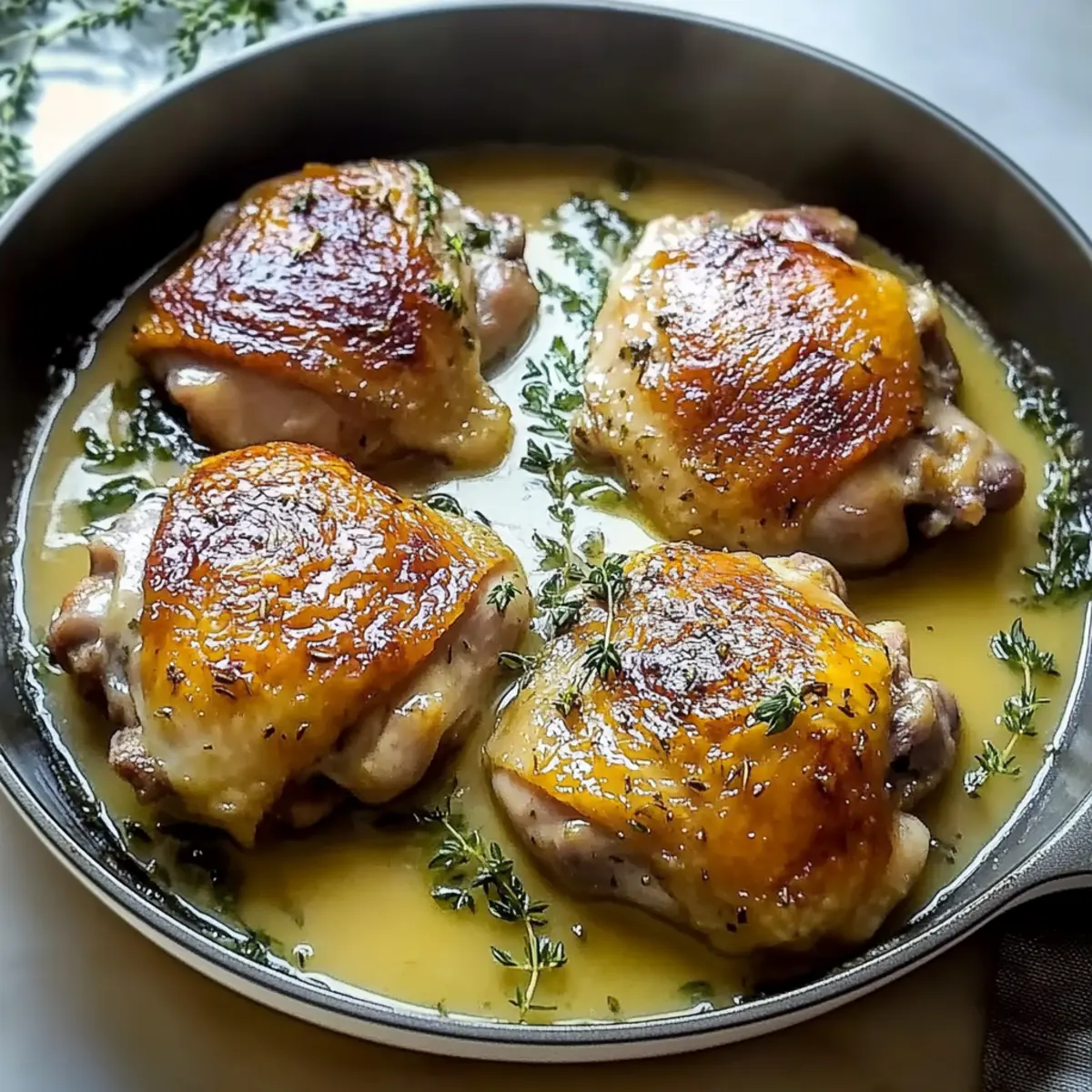 As I poured the white wine into the skillet, the rich aroma filled my kitchen, instantly taking me back to cozy dinners spent with family and friends. Today, I want to share a dish that has become a favorite in my home: Juicy One-Pan White Wine Chicken Thighs. The beauty of this recipe lies in its effortless elegance—it’s comfort food that brings a taste of restaurant-quality dining right to your table. With easy preparation and minimal cleanup, this dish allows you to focus on what truly matters: enjoying good food and great company. Whether you’re gathering loved ones for a special occasion or simply treating yourself on a weeknight, this one-pan wonder delivers juicy chicken bathed in a savory sauce that is simply irresistible. Curious about how to create this delightful experience in your own kitchen? Let’s dive into the recipe! Why Are These Chicken Thighs So Special? Effortless Elegance: This one-pan recipe requires minimal effort, making it perfect for both busy weekdays and relaxed weekends. Rich, Aromatic Sauce: Infused with white wine, garlic, and fresh herbs, the sauce makes every bite a flavor explosion. Crowd-Pleasing Comfort: Whether for a cozy night in or a dinner party, this dish is sure to impress guests and family alike. Versatile Pairings: Pair it with crusty bread, rice, or even over a bed of greens for a comforting yet light meal. For additional flavor inspiration, check out my Cream Cheese Chicken or Garlic Parmesan Chicken. Perfectly Crispy Thighs: The bone-in, skin-on thighs yield juicy meat enveloped in a crispy golden skin that’s hard to resist. Make-Ahead Friendly: Prepare the sauce in advance for a quick dinner solution, allowing you to enjoy effortless entertaining! White Wine Chicken Thighs Ingredients Note: Gather these ingredients to create your savory White Wine Chicken Thighs. For the Chicken • Chicken Thighs – Bone-in, skin-on for juiciness and rich flavor. • Olive Oil – Ideal for searing; helps achieve that golden brown, crispy skin. • Unsalted Butter – Adds a layer of richness to the sauce for a delightful flavor. • Salt – Essential for seasoning; adjust it to your palate. • Freshly Ground Black Pepper – A must to reinforce the dish’s overall seasoning; adjust to taste. For the Sauce • Yellow Onion – Fundamental flavor base that adds depth to the sauce. • Garlic – Fresh cloves provide aromatic oils; be careful not to overcook them. • Dry White Wine – Choose a drinkable variety like Sauvignon Blanc for added depth in flavor. • Chicken Broth – Helps create a flavorful liquid for the sauce; opt for low-sodium for better control. • Fresh Thyme Leaves – Adds a delightful herbal note; fresh is best for maximum flavor. • Bay Leaf – Imparts an aromatic flavor throughout the dish. • Heavy Cream – Optional for creaminess; can be omitted for a lighter version. Enjoy crafting this wonderful comfort dish that transforms your kitchen into a cozy culinary retreat! Step‑by‑Step Instructions for White Wine Chicken Thighs Step 1: Preheat and Prepare Begin by preheating your oven to 375°F (190°C). While it heats, pat your bone-in, skin-on chicken thighs dry with paper towels, ensuring they are moisture-free for that coveted crispy skin. Next, generously season both sides with salt and freshly ground black pepper, creating a flavorful base for your dish. Step 2: Sear the Chicken In an oven-safe skillet, heat 2 tablespoons of olive oil over medium-high heat. Once the oil shimmers, carefully add the chicken thighs skin-side down and sear for 6-8 minutes until the skin turns a rich, golden brown. Flip the chicken and cook for an additional 2-3 minutes before transferring the thighs to a plate, allowing them to rest. Step 3: Sauté the Onion Reduce the heat to medium, and add 2 tablespoons of unsalted butter to the same skillet. As the butter melts, toss in the chopped yellow onion, stirring frequently for 4-5 minutes, or until the onion becomes translucent and tender. The aromatics will start filling your kitchen, setting the stage for the savory white wine chicken thighs. Step 4: Add the Garlic Next, incorporate 4 minced garlic cloves into the skillet, sautéing them for about 30 seconds until they release their fragrant oils. Stir constantly to avoid burning the garlic, as it can turn bitter quickly. This will enhance the depth of flavor in your white wine chicken thighs. Step 5: Deglaze the Skillet Pour in 1 cup of dry white wine, using a wooden spoon to scrape up any flavorful brown bits left at the bottom of the pan. Allow the mixture to simmer for approximately 3-5 minutes, or until the wine reduces by half, creating a robust sauce that beautifully complements the chicken. Step 6: Simmer the Sauce To your reduced wine mixture, add 1 cup of chicken broth, a few sprigs of fresh thyme, and 1 bay leaf. Bring the sauce to a gentle simmer, mixing well to combine the flavors. This rich sauce will become the tasty backdrop for your juicy chicken thighs. Step 7: Return the Chicken Carefully return the chicken thighs to the skillet, ensuring they sit skin-side up in the simmering sauce. Transfer the skillet to your preheated oven and bake for 20-25 minutes, or until the internal temperature of the chicken reaches 165°F (74°C). The skin should be crispy, and the meat tender and juicy. Step 8: Finish and Serve Once cooked, remove the skillet from the oven and discard the bay leaf. Allow the chicken to rest for about 5 minutes to lock in moisture. For added creaminess, consider stirring in a splash of heavy cream into the sauce before serving. Enjoy your mouthwatering white wine chicken thighs with crusty bread or over rice to soak up that delicious sauce. What to Serve with Juicy One-Pan White Wine Chicken Thighs Experience the joy of creating a full, comforting meal that perfectly complements your succulent chicken thighs. Creamy Mashed Potatoes: The silky texture of mashed potatoes balances the rich sauce, maki