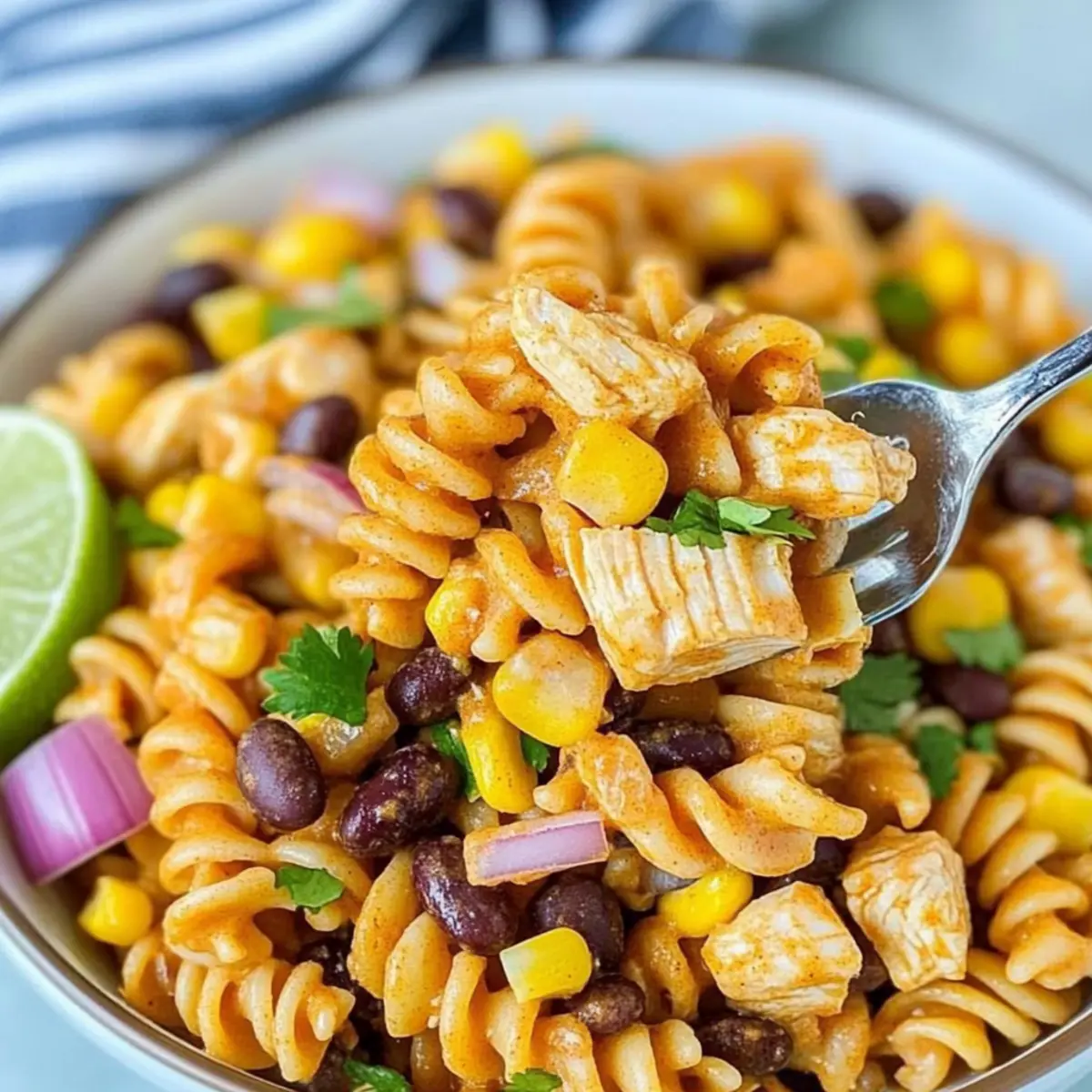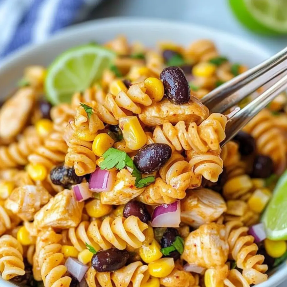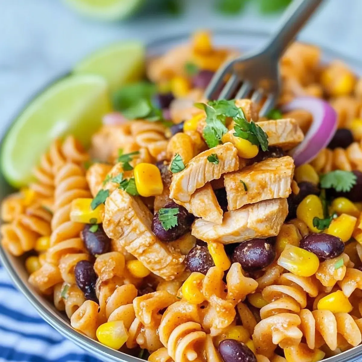 As I stood in my kitchen, the zest of lime wafting through the air, I couldn’t help but feel excited about the vibrant Zesty Chicken Enchilada Pasta Salad I was whipping up. This dish is a delightful fusion, marrying the hearty essence of enchiladas with the refreshing qualities of pasta salad, making it a hit for summer gatherings and family dinners alike. Not only is it incredibly quick to prepare, but it’s also infinitely customizable—perfect for accommodating different taste preferences. With creamy dressing and a tangy kick from the lime, this salad is sure to become a weeknight favorite. Whether you’re looking to impress at a potluck or simply want a satisfying meal prepped for the week ahead, you’ll find this recipe a total game-changer. Curious about the best ways to make it your own? Let’s dive into the recipe! Why You’ll Love This Zesty Salad Customizable Delight: This Zesty Chicken Enchilada Pasta Salad can easily be tailored to your liking. Swap chicken for grilled shrimp or tofu to mix things up, or play with your choice of pasta! Family-Friendly Fun: Perfect for kids and adults alike, this dish encourages everyone to dig in, especially when they help with the prep. Quick Prep Time: Ready in under 30 minutes, it’s ideal for busy weeknights or last-minute get-togethers. Meal Prep Hero: Pack it for lunches or make it ahead for dinner; it stays fresh in the fridge for days. Pair it with Grilled Chicken Broccoli for a delicious week of meals! Flavor Explosion: Experience a satisfying blend of creamy dressing and zesty lime that delivers a refreshing punch with every bite. Zesty Chicken Enchilada Pasta Salad Ingredients For the Salad Chicken Breasts – Main protein source; ensure cooked to 165°F for safety. Pasta (16 oz) – Base of the salad; rotini or elbow noodles work wonderfully. Black Beans – Adds fiber and texture; use canned, drained, and rinsed. Yellow Corn – Sweetness and crunch; canned or frozen works great. Red Onion – For a crunchy bite; substitute with green onions for a milder flavor. Jalapeño – Adds heat; feel free to omit for a milder version or amp it up for spice lovers. Chopped Olives (optional) – Provides a briny flavor; leave out if not preferred. Cilantro – Fresh garnish that brightens the dish; parsley can be used if you prefer. For the Dressing Red Enchilada Sauce – The flavorful base; homemade or store-bought is perfect. Sour Cream – Creamy addition; Greek yogurt works for a healthier twist. Taco Seasoning – Adds spice and complexity; consider a homemade blend for customization. Lime Juice – Brings brightness and zing; adjust to taste for personal preference. Cooking Oil (Olive Oil) – For sautéing chicken; any neutral oil can be used instead. This Zesty Chicken Enchilada Pasta Salad is not just a meal; it’s a delightful blend of flavors ready to cater to your cravings! Step‑by‑Step Instructions for Zesty Chicken Enchilada Pasta Salad Step 1: Prepare the Chicken Start by patting dry 1 pound of chicken breasts with paper towels to remove excess moisture. Coat the chicken evenly with taco seasoning, ensuring full coverage for maximum flavor. In a large skillet over medium-high heat, add 2 tablespoons of olive oil. Once the oil shimmers, place the chicken in the skillet and cook for about 5-7 minutes on each side or until it reaches an internal temperature of 165°F. Step 2: Chop the Cooked Chicken Once the chicken is fully cooked, remove it from the skillet and place it on a cutting board. Allow it to cool for a few minutes until safe to handle. Using a sharp knife, chop the chicken into bite-sized cubes, ensuring an even texture throughout the Zesty Chicken Enchilada Pasta Salad. Set the cubed chicken aside for the next step. Step 3: Whisk the Dressing Ingredients In a large mixing bowl, combine 1 cup of red enchilada sauce, ½ cup of sour cream, and the juice of 1 lime. Whisk these ingredients together until the mixture is smooth and creamy. Taste the dressing and adjust the lime juice according to your preference, adding more for a zippier kick. This flavorful dressing will provide the perfect base for your salad. Step 4: Cook the Pasta In a large pot, bring salted water to a boil. Add 16 oz of your preferred pasta, such as rotini or elbow noodles, and cook according to the package instructions until al dente, usually about 8-10 minutes. Once cooked, drain the pasta in a colander and rinse under cold water to stop further cooking. This step helps keep the pasta from getting mushy in your Zesty Chicken Enchilada Pasta Salad. Step 5: Combine All Ingredients In the bowl with the dressing, add the chopped chicken, the cooked pasta, 1 can of drained and rinsed black beans, and 1 cup of sweet yellow corn. Dice half of a red onion and the desired amount of jalapeño (remember to adjust based on spice preference), then toss them in as well. If you opt for chopped olives, include them here too, and gently mix until everything is evenly coated in the tangy enchilada dressing. Step 6: Chill Before Serving Transfer the mixed salad into an airtight container or cover the mixing bowl with plastic wrap. Refrigerate for at least one hour to allow the flavors to meld together beautifully. This chilling period not only enhances the taste of your Zesty Chicken Enchilada Pasta Salad but also improves its refreshing quality, making it perfect for serving on a hot day. Step 7: Garnish and Enjoy Before serving, chop a handful of fresh cilantro and sprinkle it over the top of the salad for a burst of freshness. Toss gently to incorporate, if desired. Serve the Zesty Chicken Enchilada Pasta Salad chilled, making it an ideal dish for family gatherings, potlucks, or as a delightful lunch option! How to Store and Freeze Zesty Chicken Enchilada Pasta Salad Fridge: Store in an airtight container for up to 3-5 days. This way, your Zesty Chicken Enchilada Pasta Salad stays fresh and flavorful for quick lunches and dinners. Freezer: While 
